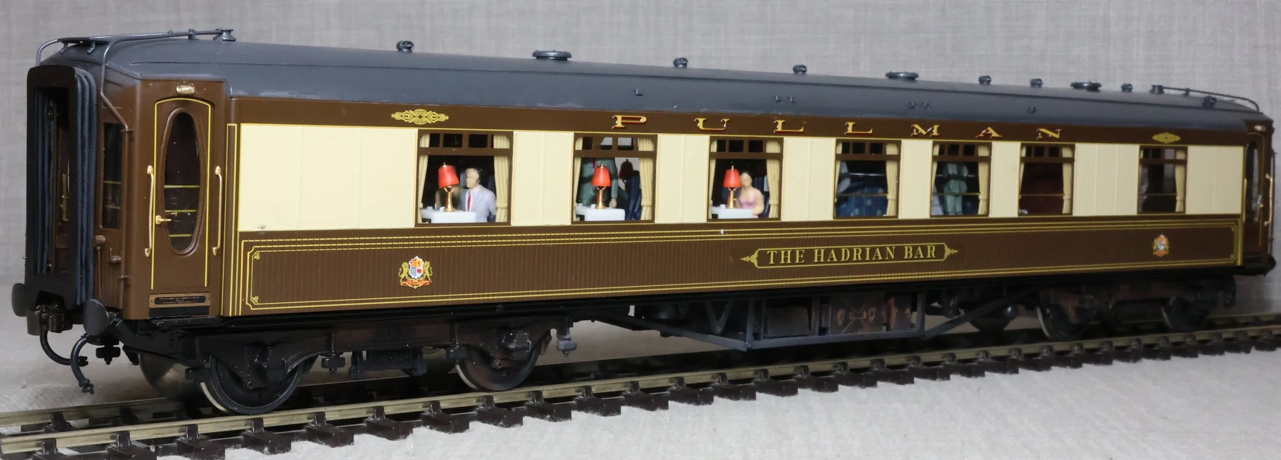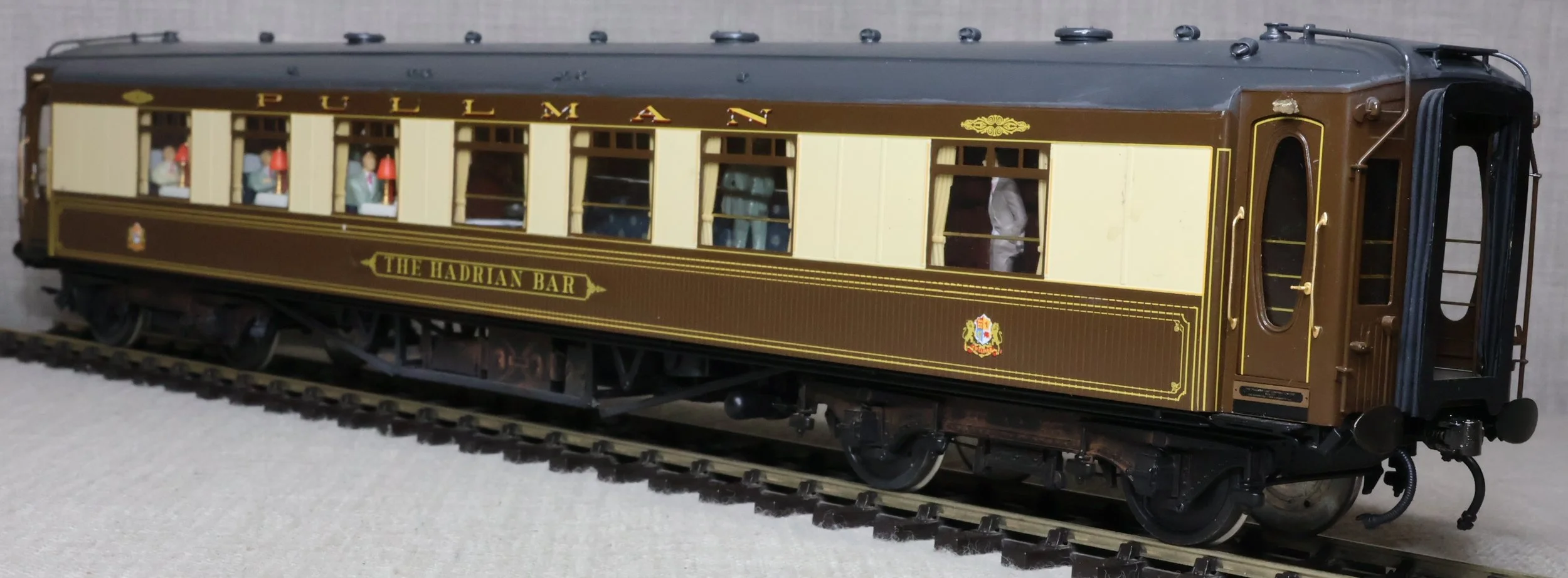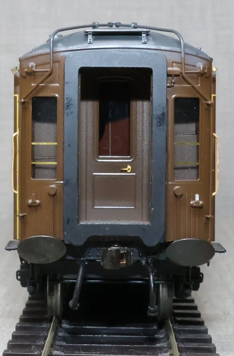 CDS136. Pullman ‘K’ Type Bar Car 'The Hadrian Bar'. With matchboard sides and in post-war livery with grey roof and with lightly weathered underframe. This is a detailed brass model produced in Korea by F.C. Models for Golden Age Models. Fitted with working interior lighting, highly detailed interior and underframe, opening doors and glass windows. It also has roller bearing axles fitted for smooth running. Additionally with passengers fitted. This is a used model with some modifications. The grey roof has been badly repainted at some time, and the electrics for the lighting have been modified. The battery box has been removed and the lighting works on direct pickup from the track (with what looks to be a 'stay alive' circuit). The model is supplied in a Golden Age box but not the original one for this coach. The prototype was converted in 1948 from Car No. 59 (built 1925) and entered service on the Tees-Tyne Pullman. It also ran on other East Coast services so would probably have been used on 'The Queen of Scots' and 'The Yorkshire Pullman'. 'The Hadrian Bar' also ran on 'The Master Cutler' service between King's Cross and Sheffield between 1958 and 1960. In 1961 it moved to the Southern Region, was repainted in green livery, and was used as a Buffet Car on Southampton Ocean Liner services. RESERVED.