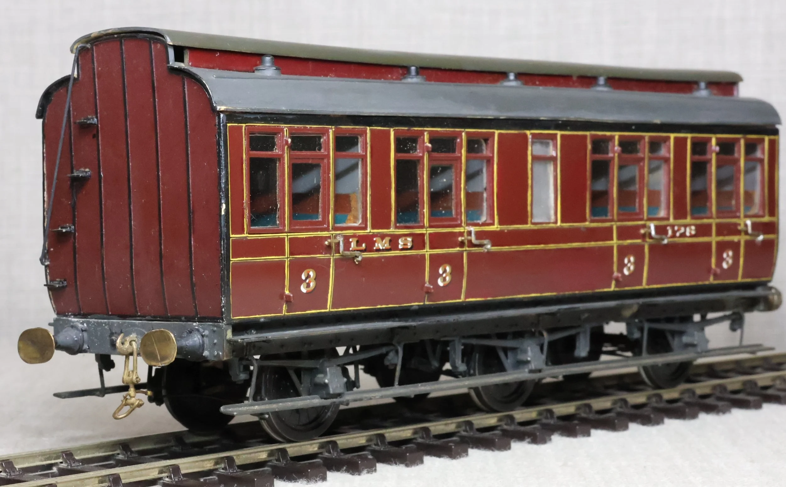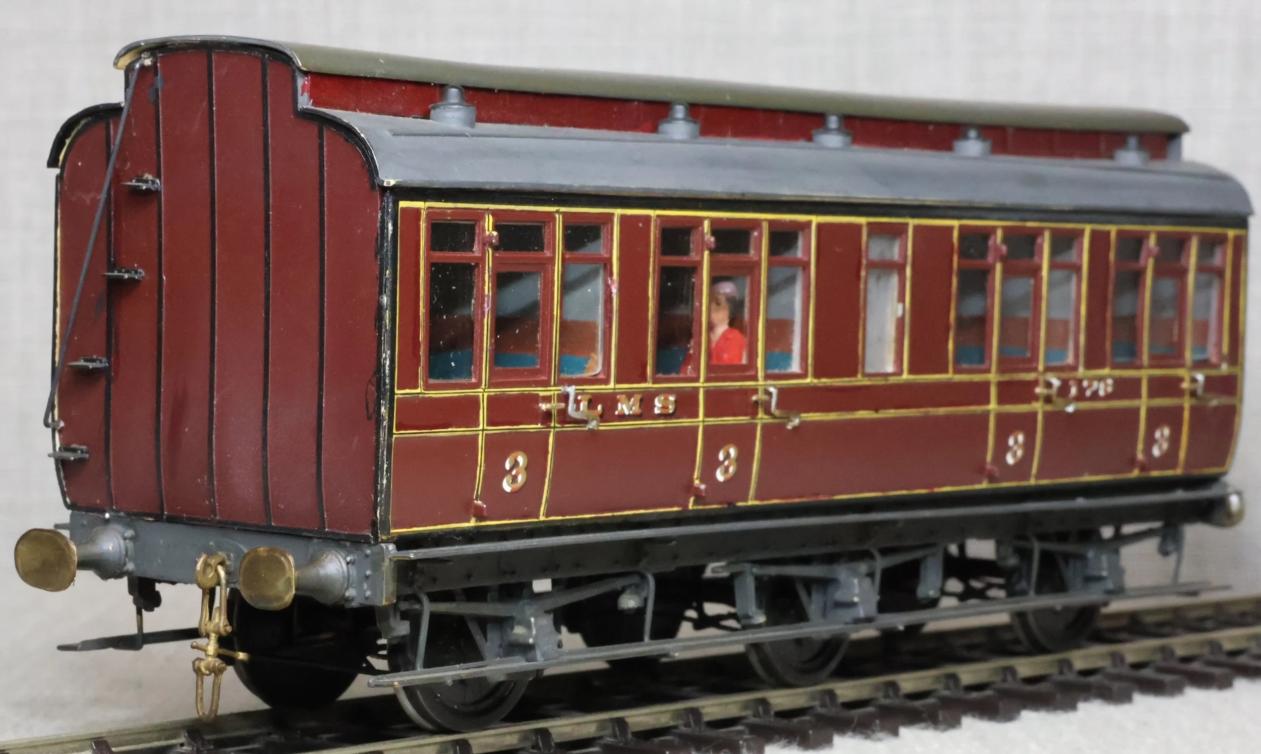 CMF18. LMS ex- Midland Railway 31ft 6-wheel Lavatory Non-Corridor All Third Coach No. 178. In LMS crimson lake livery. This is kitbuilt probably from a largely brass kit and painted to an amateur standard. With compensated axles and with 2 passengers fitted. This is a used model. £95.