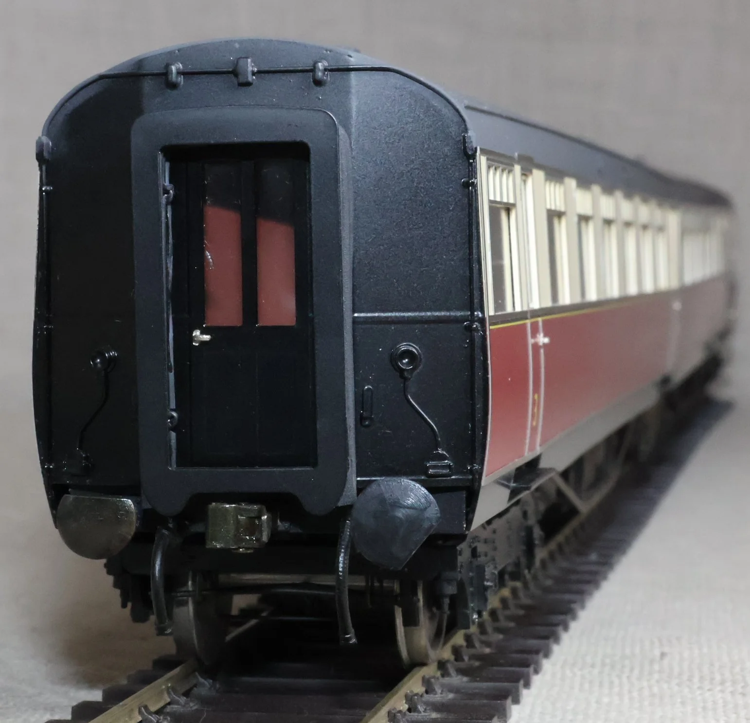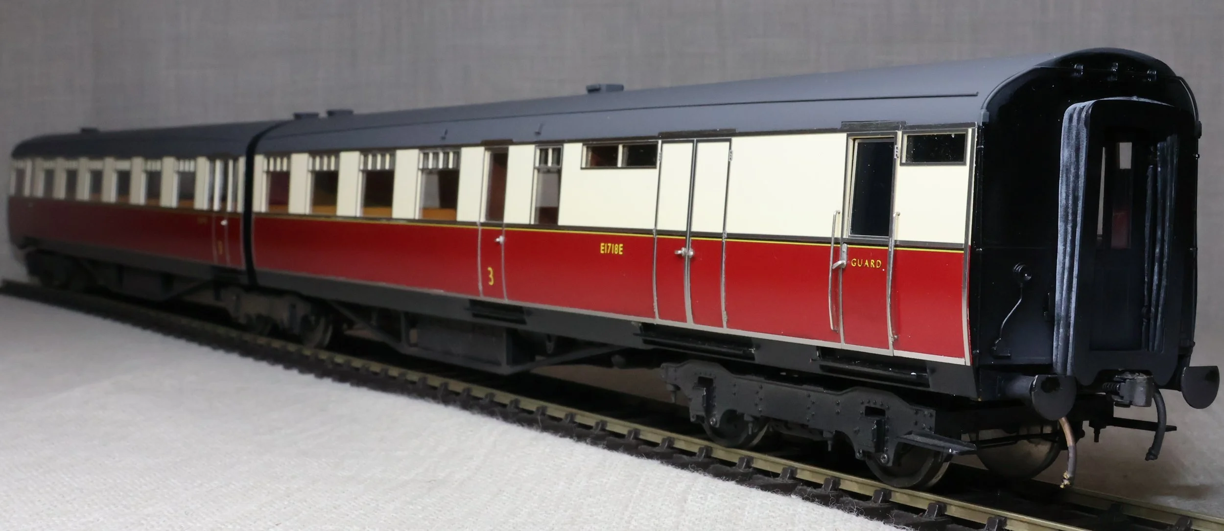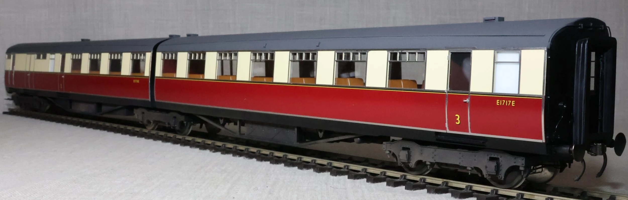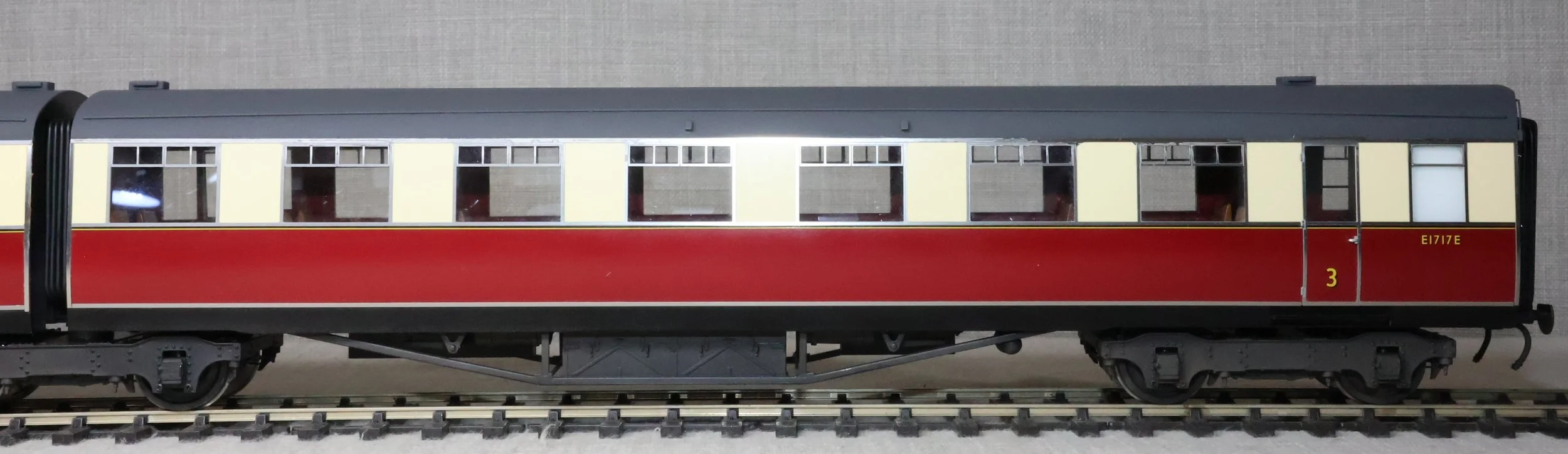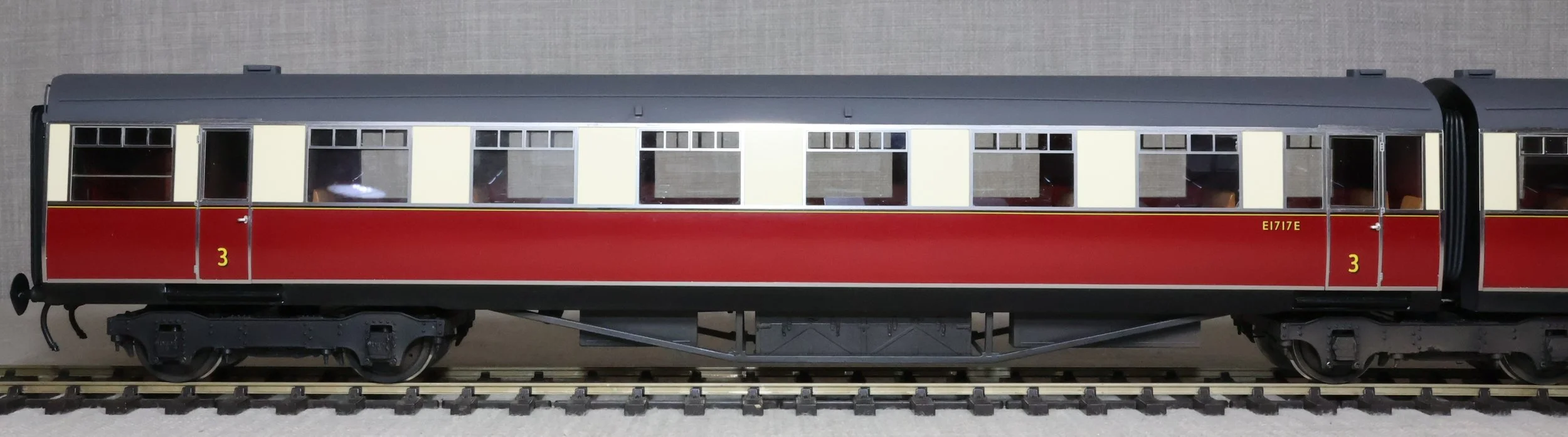 CQL48. BR ex-LNER Pair of Gresley Articulated Twin-set Corridor Coaches ex- 'Coronation' Set. In BR crimson and cream livery and comprising (1) Third Open No. E1717E together with (2) Brake/Open Third No. E1718E both to to Diagram D231 (Doncaster, 1937). These are by Golden Age Models and are fitted with roller bearing axles, detailed interiors and Kadee-style couplings. They have had some use and note that (1) Although having interior lighting the electrical plunger pickups collecting current from the wheels have been removed. (2) The roofs have been repainted. (3) The underframes are lightly weathered. (4) There is fading of the cream paintwork on one side of each coach. They are supplied in the correct original 2-coach Golden Age box. The ‘Coronation’ sets ran between Kings Cross and Edinburgh Waverley and the service was inaugurated in July 1937, running up to the war with a streamlined Observation Car added in summer. The coaches were put in store for the duration of the war then returned in BR days from 1948 as general service stock but most notably being used in the 1950's 'Flyimg Scotsman' set. SOLD.