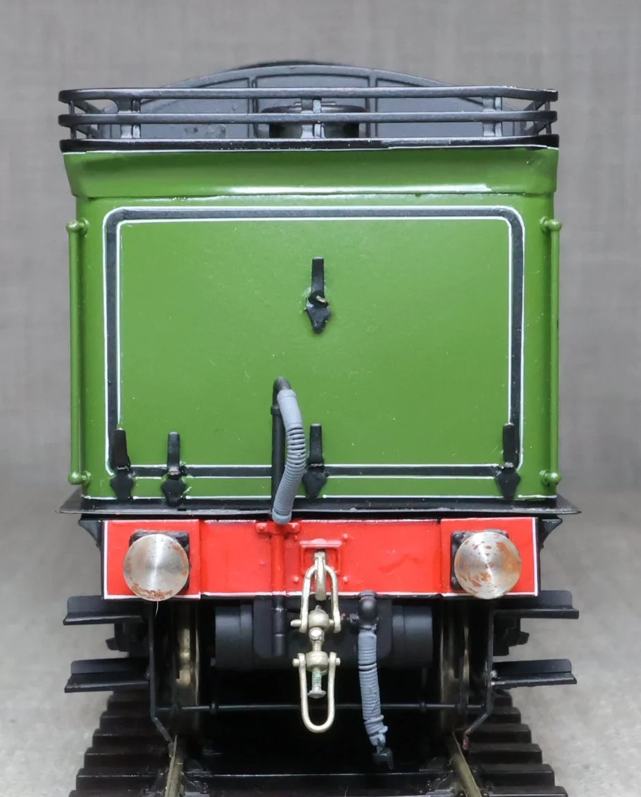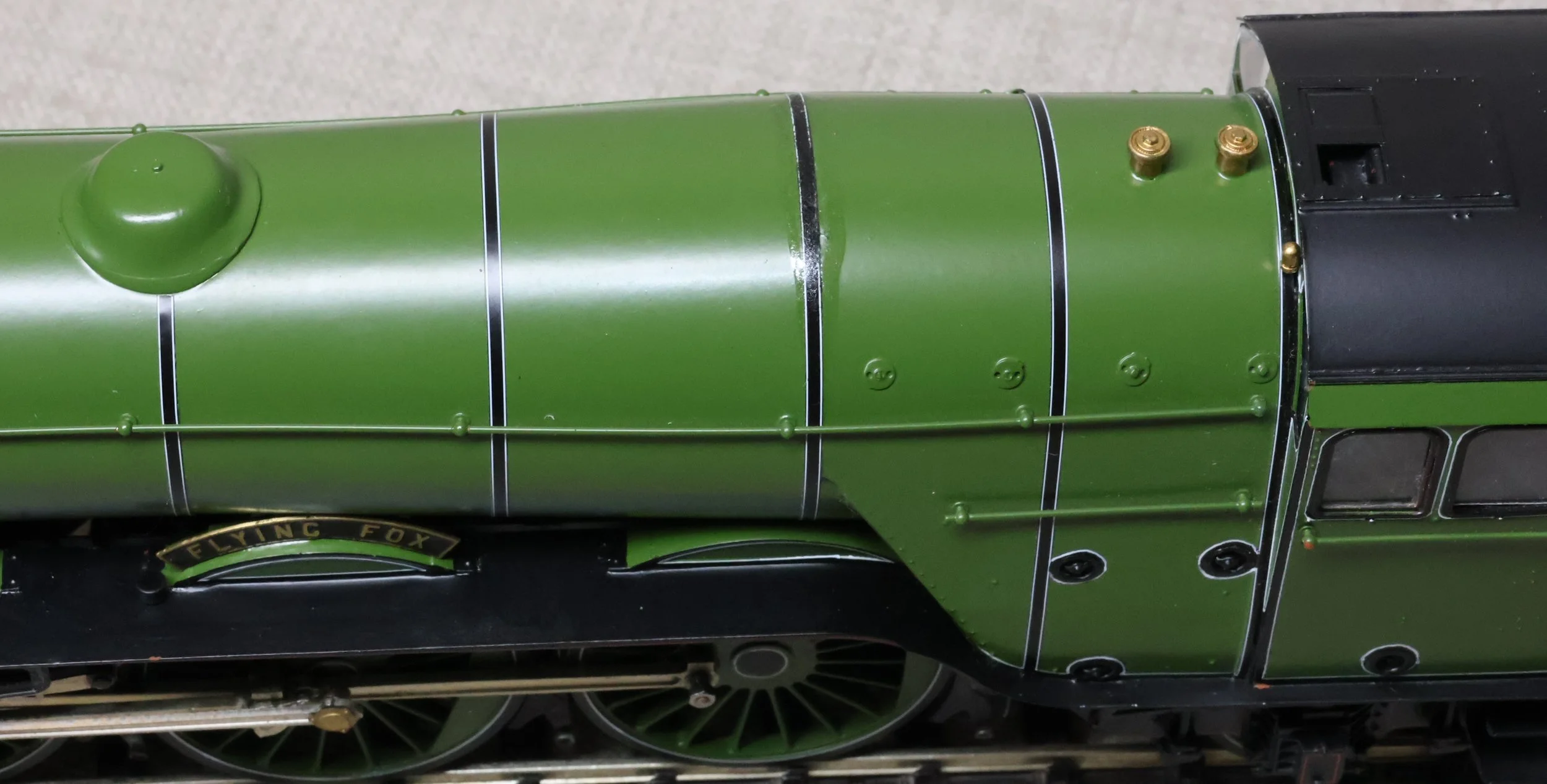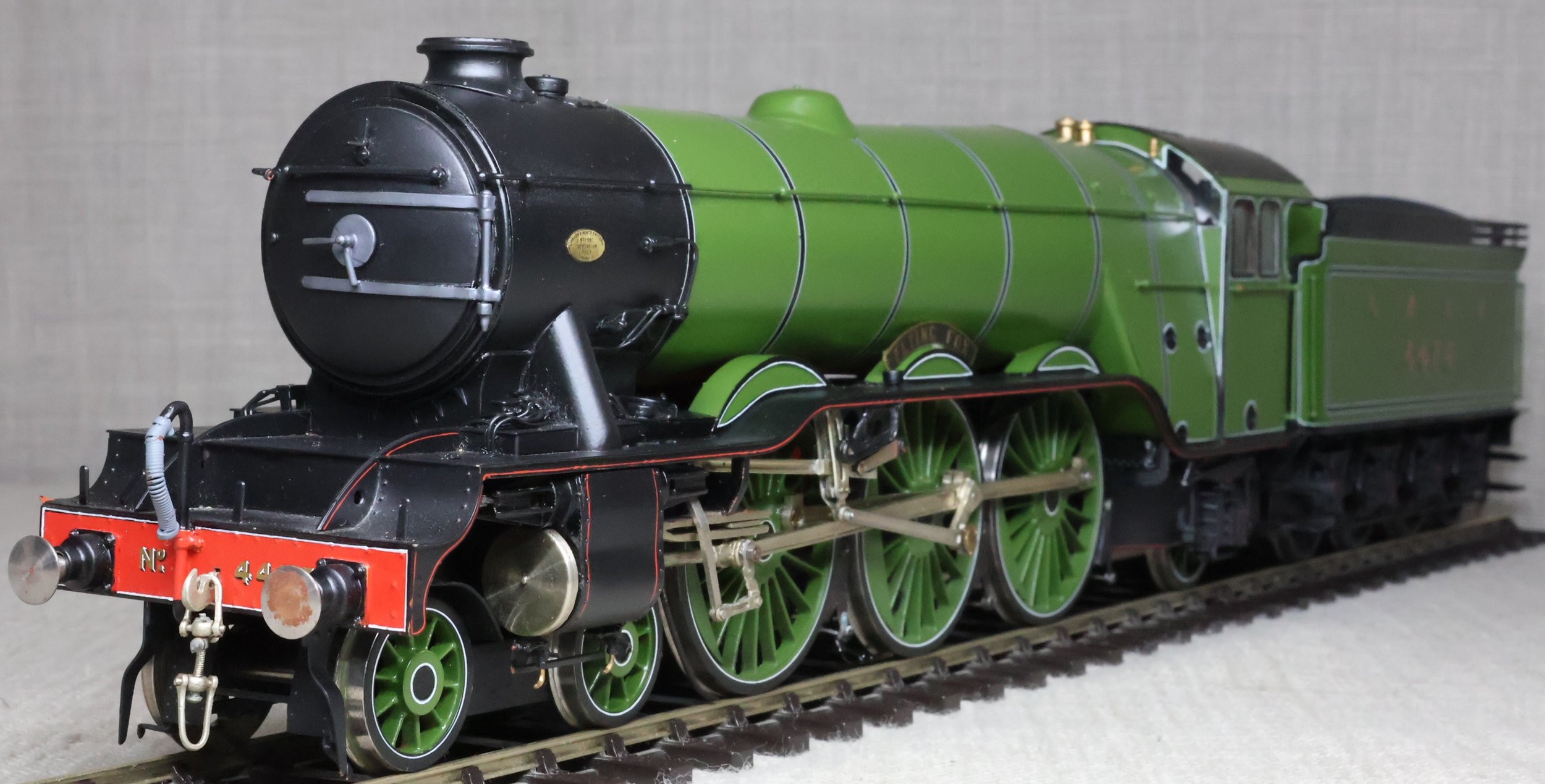 LEJ59. LNER Gresley Class A1 Pacific 4-6-2 Loco & Tender No. 4475 'Flying Fox'. Paired with a GNR-type coal rail tender and in early LNER lined apple green livery. This is kitbuilt, possibly from a Martin Finney kit, and painted by Larry Goddard (signed on the underside). Fitted with Alan Harris (AGH) turned steel wheels, a multi-stage gearbox, American pickup system, compensation on the loco and tender, and with excellent cab detail. Although built circa 2002 it appears to have had little use but note that one piece of boiler lining paintwork has been repaired (see photo). Also the motor is wired positive to negative so 'forward' on the controller is 'reverse' and vice versa. The prototype was into service from Doncaster Works in April 1923 so one of the very first locos completed under LNER ownership. It was rebuilt as an A3 in March 1947 having been renumbered to No. 106 in the LNER 1946 renumbering scheme, later becoming BR No. 60106. It was withdrawn from New England (Peterborough) in December 1964 having achieved the greatest mileage of all the Gresley Pacifics at almost 2.6 million miles. RESERVED.