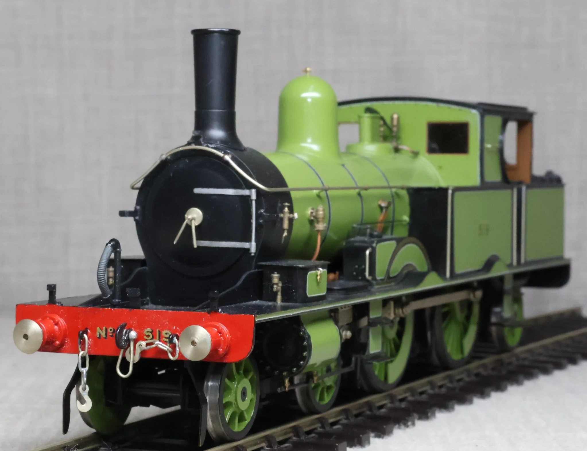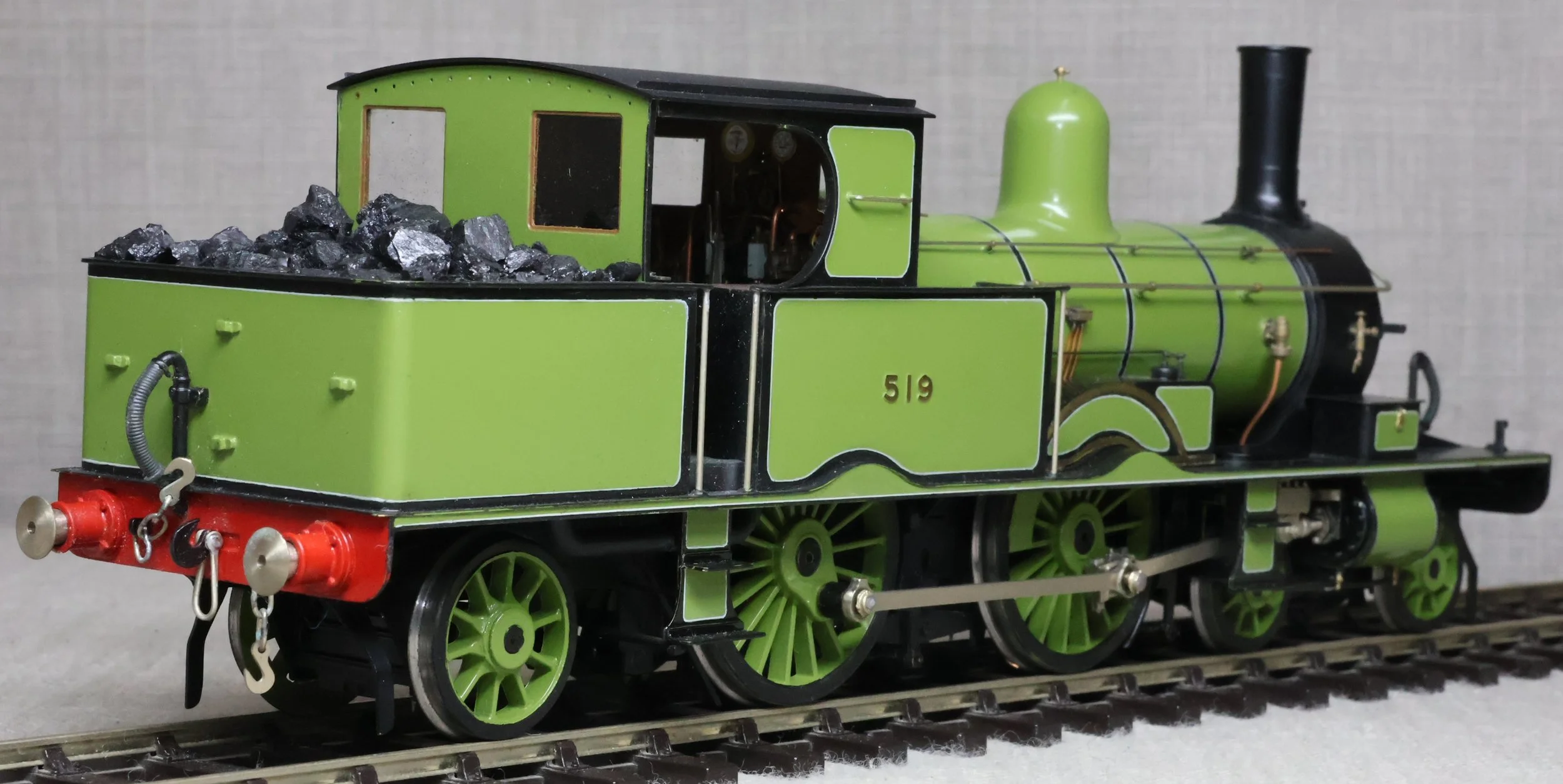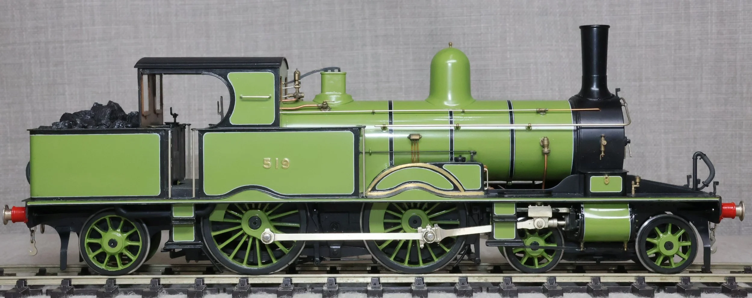 LMD04. London & South Western Railway Adams '0415' Class 4-4-2 Radial Tank No. 519. In LSWR lined green livery. This is from a Martin Finney brass kit professionally built and painted by Chris Wesson to a very high standard. Fitted with a Portescap motor/gearbox, working inside motion, Slaters wheels, compensation on the driving axles, removable cab roof, and with excellent cab detail. It has had very light use as a display model. There are a couple of issues, firstly that of the four electrical pickups on the driving wheels only three are working. The method of pickup is as follows. There are 2 traditional wiper pickups on one side of the loco. On the opposite side the Slaters wheels have been 'shorted out' by soldering a thin copper strip between the rim and the hub, meaning that the wheels are live to the chassis and acting as electrical pickups themselves - it is one of these 'shorted' wheels that is not giving electrical connectivity (possibly due to a 'dry' joint). However the loco is running fine on 3 pickups. The other slight problem is that the motor/gearbox is a touch noisy. The prototype was into service from Dubs & Co. (Glasgow) in 1885 and was withdrawn by the Southern Railway in 1926 as SR No. 0519. £1595.