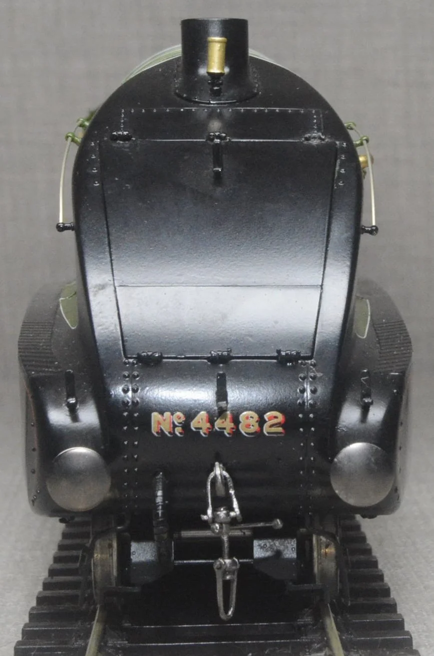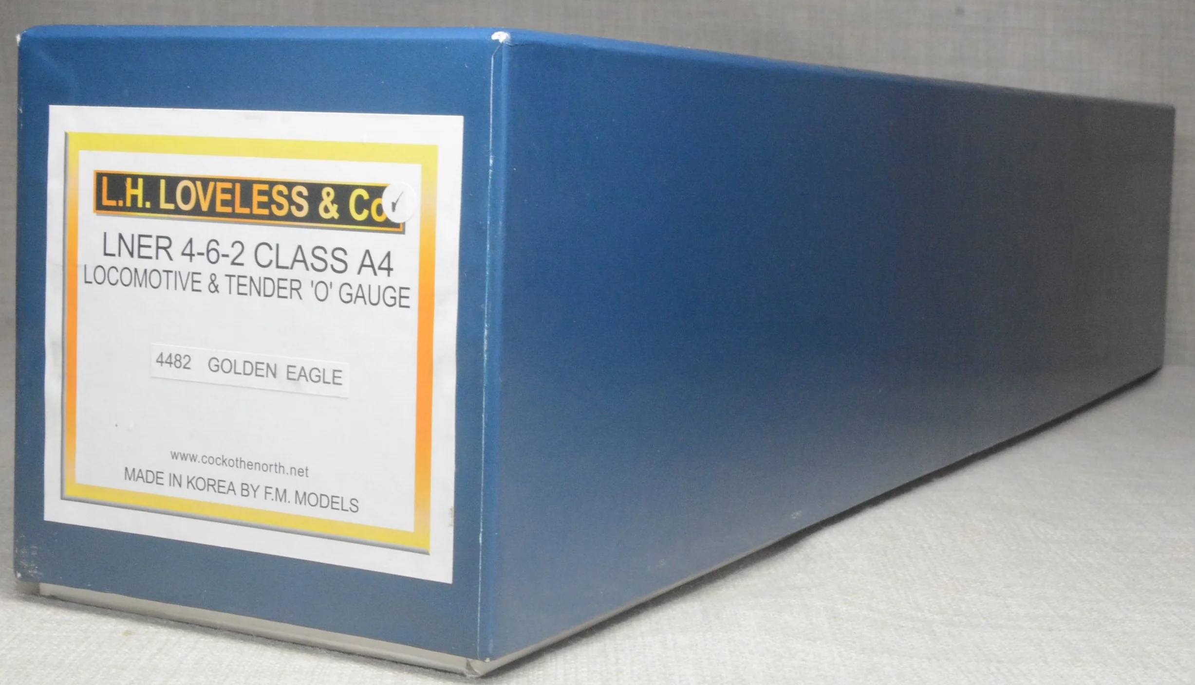 LQL22. LNER Gresley Class A4 Pacific 4-6-2 & Tender No. 4482 'Golden Eagle'. Fully valanced, paired with a corridor tender, with single chimney, and in LNER pre-war 1936/37 lined apple green livery. This is a brass model by F. M. Models of Korea for L. H. Loveless and is fitted with their usual refinements including working inside motion, compensated chassis on loco and tender, opening smokebox door, multi-stage gearbox, and with excellent cab detail. The model is lightly used and is supplied in its original inner and outer boxes. It has a screw coupling on the loco with a drop-down Kadee type coupling on the tender (in the drop-down position there is also a traditional hook exposed). This is a DC model. The prototype was into service from Doncaster Works to Kings Cross in December 1936 as LNER No. 4482 becoming No. 23 in the LNER 1946 renumbering scheme thence BR No. 60023. It was withdrawn from Aberdeen Ferryhill in October 1964 having had its last few months in service on the Aberdeen - Glasgow 3 hour expresses. The original green livery was chosen to go with the LNER express stock then in varnished teak. However the green was short lived and it was soon replaced by the more familar garter blue. PRICE REDUCTION TO £1995.