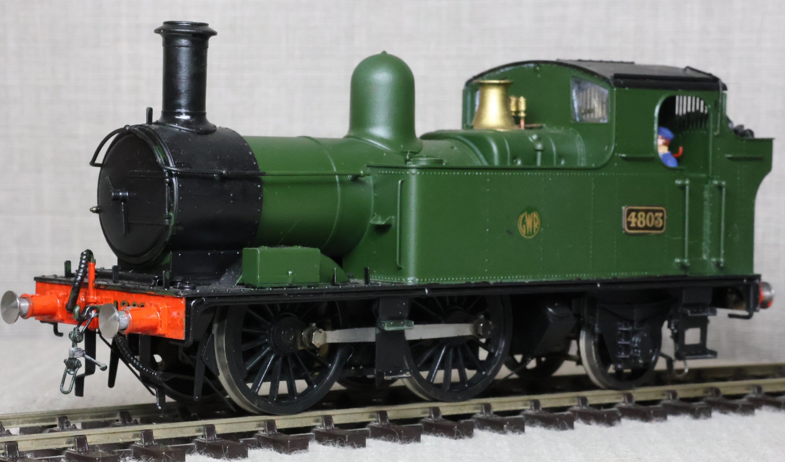 LRP11. GWR Collett Class '14xx' 0-4-2 Tank Loco No. 4803. In GWR plain green livery with shirtbutton crest as used circa 1934 - 1942. This is a brass model by Sancheng for Tower Brass with excellent cab detail and crew. The model has had medium use and is supplied in a plain box. The prototype was into service from Swindon Works in September 1932 as No. 4803, renumbered by the GWR to No. 1403 in October 1946. It spent almost all its life at Weymouth Radipole apart from 2 spells at Swindon and was withdrawn from Weymouth in November 1957. £250.