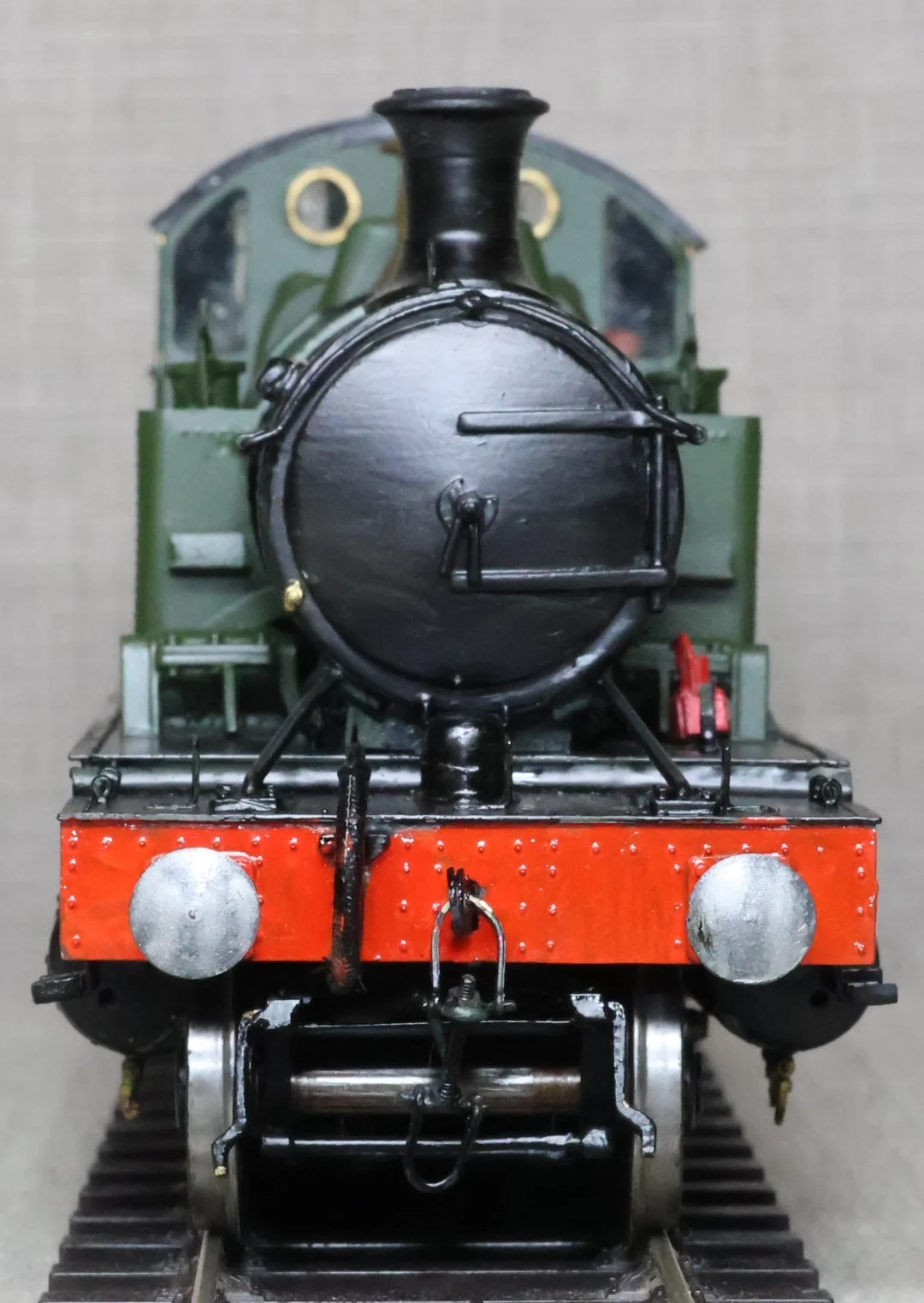 LRP19. GWR Churchward 'Small Prairie' 2-6-2 Tank Loco No. 4549. In plain GWR green livery with shirtbutton emblem as used circa 1934 to 1942. This is kitbuilt in brass to a good amateur standard and fitted with a Mashima motor, multi-stage gearbox, Slaters wheels, and with very good cab detail and crew. The model has had light to medium use. The prototype was into service from Swindon Works in May 1915 and was withdrawn from Penzance in December 1961 having spent its last 2 years in the West Country (previously on the Cambrian at Machynlleth). £250.