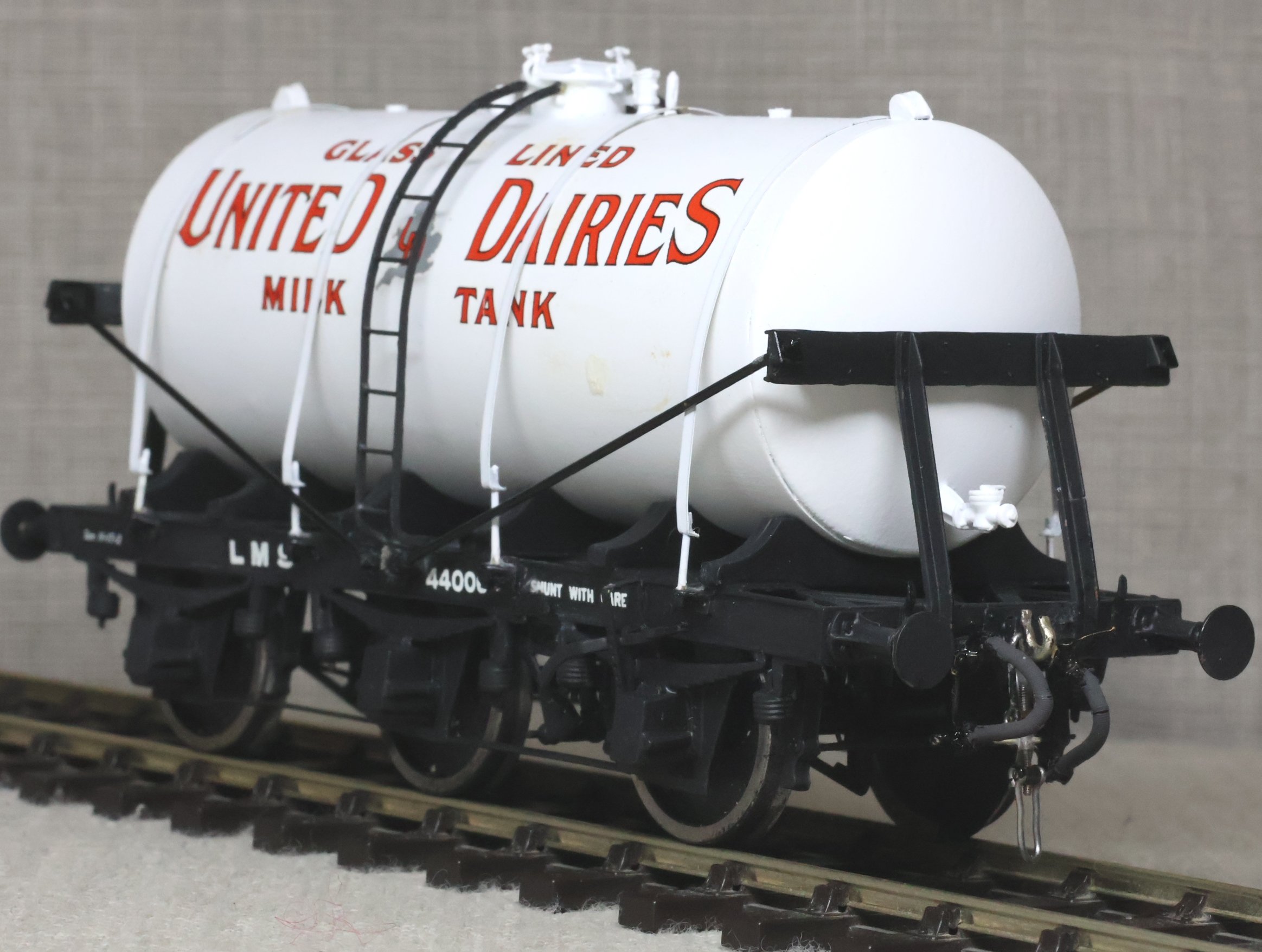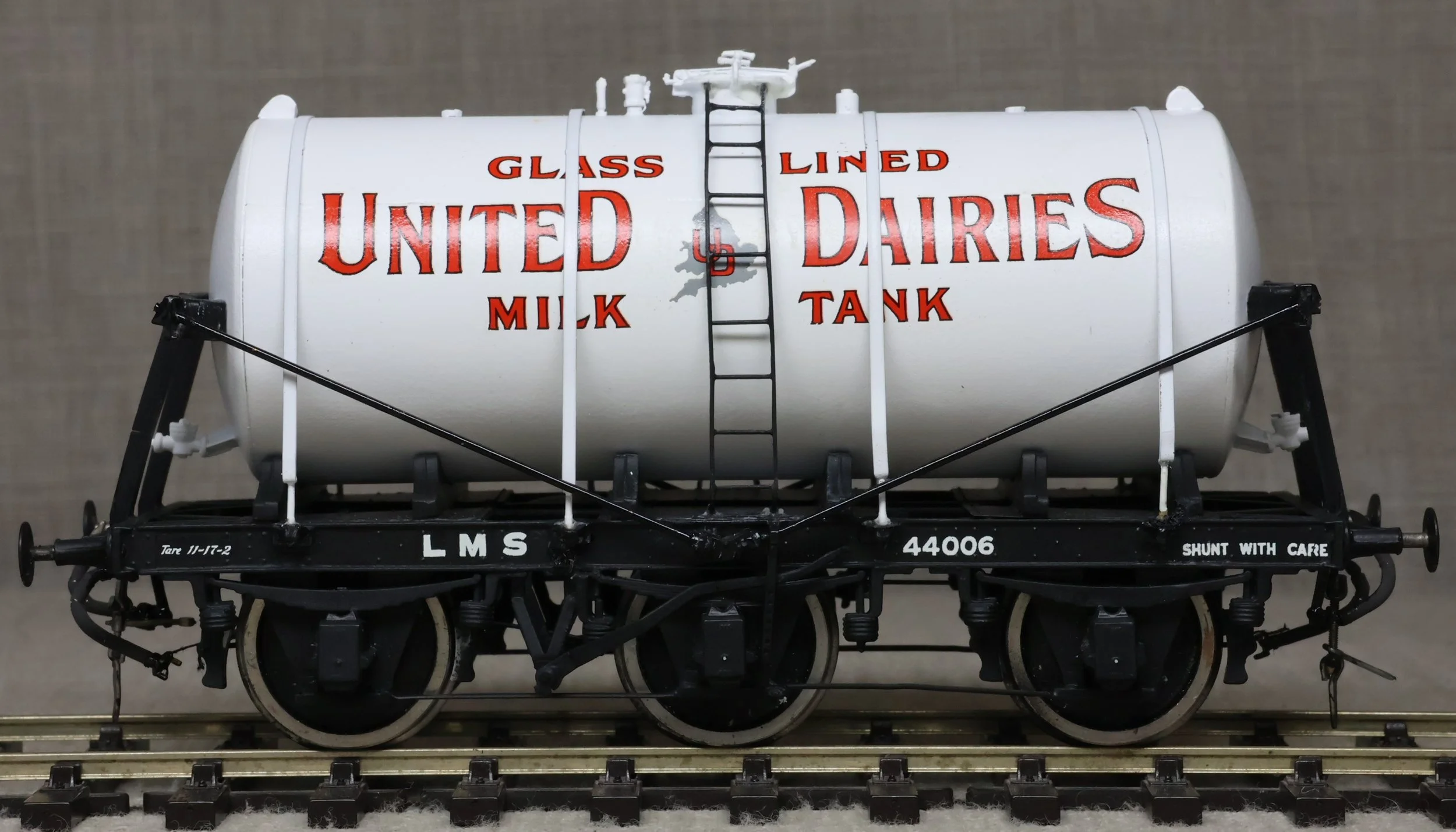 WRP09. LMS 6-wheel Milk Tanker Wagon No. 44006 'United Dairies'. Commercially produced probably by Dapol. Lightly used. £40.
