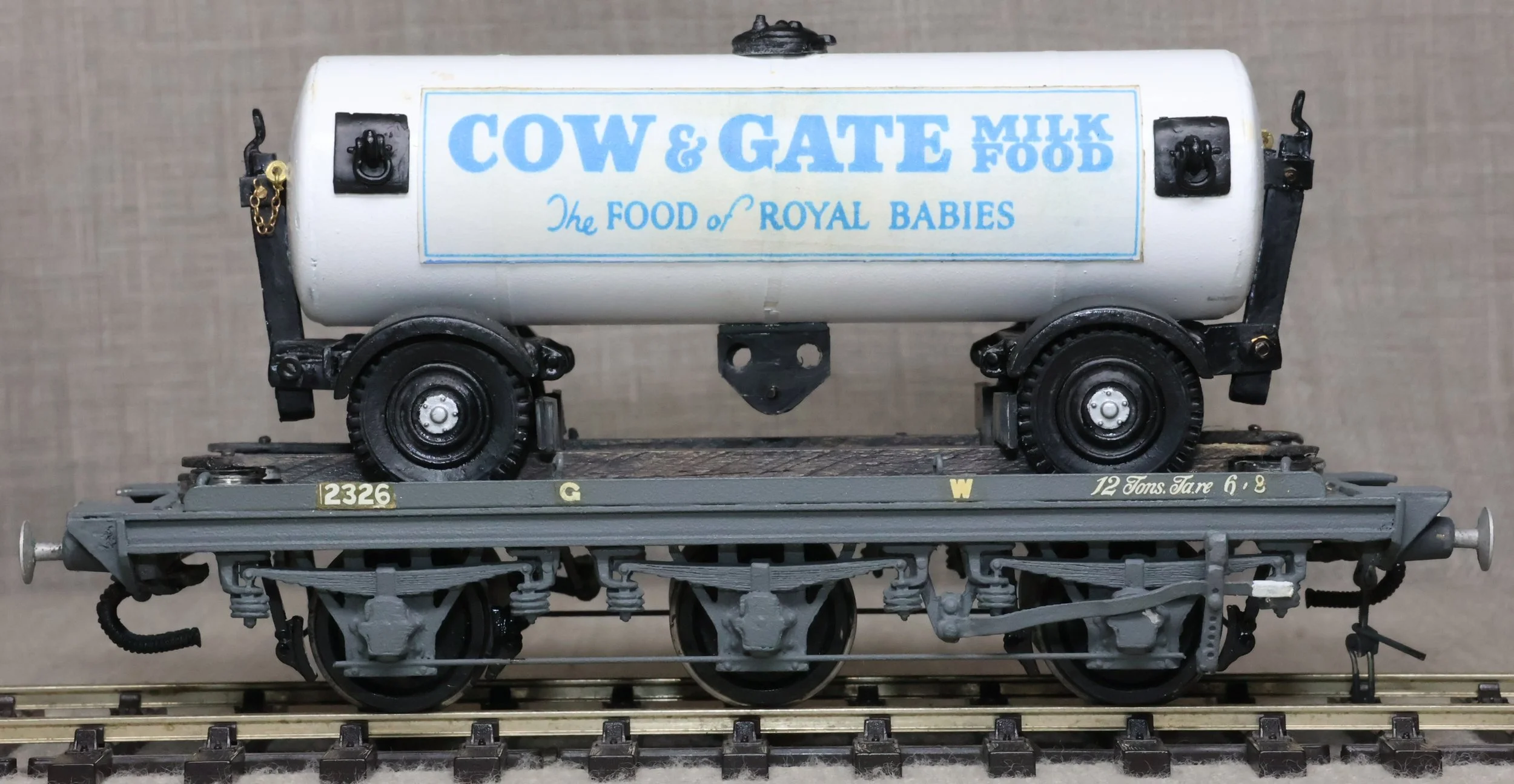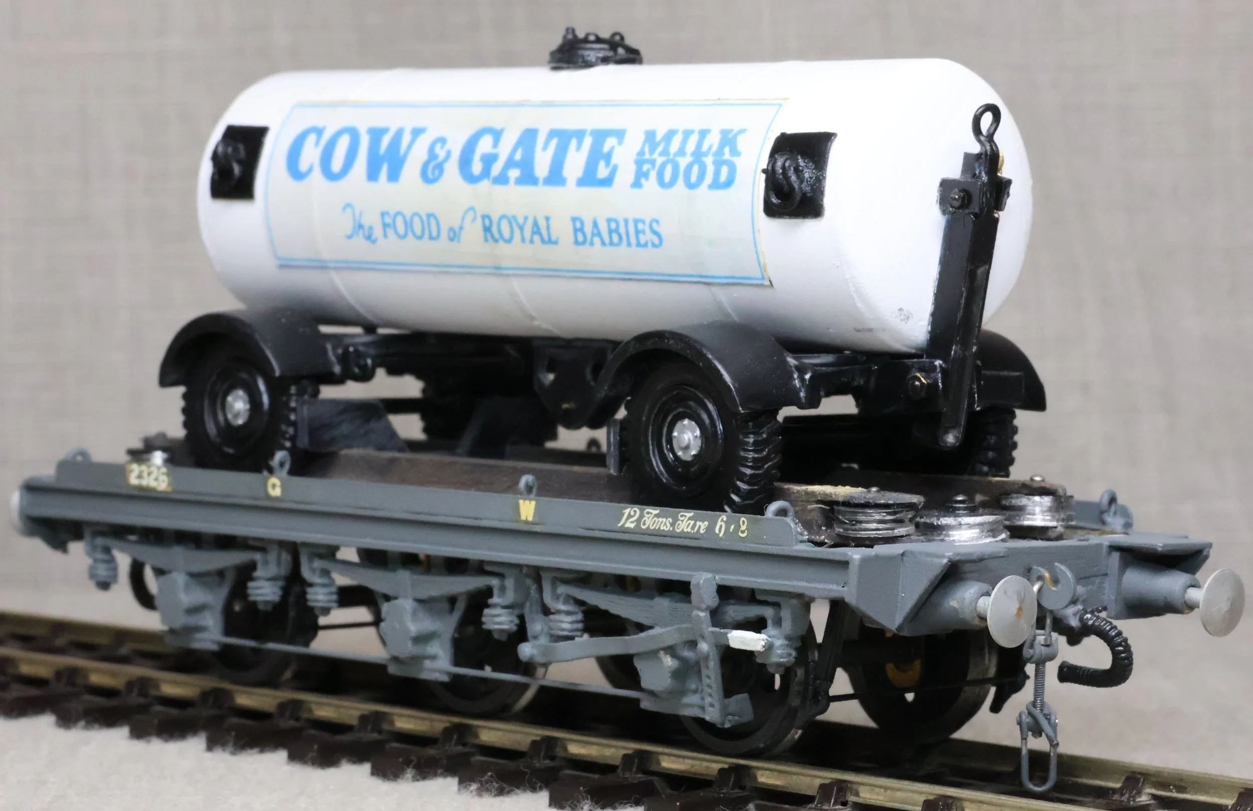 WRP12. GWR 12 Ton 6-wheel Road/Rail Wagon No. 2326. This is a substantial model from a brass and whitemetal kit with a detachable Cow & Gate Milk Road Tanker. Lightly used with part of one screw coupling missing. £50.