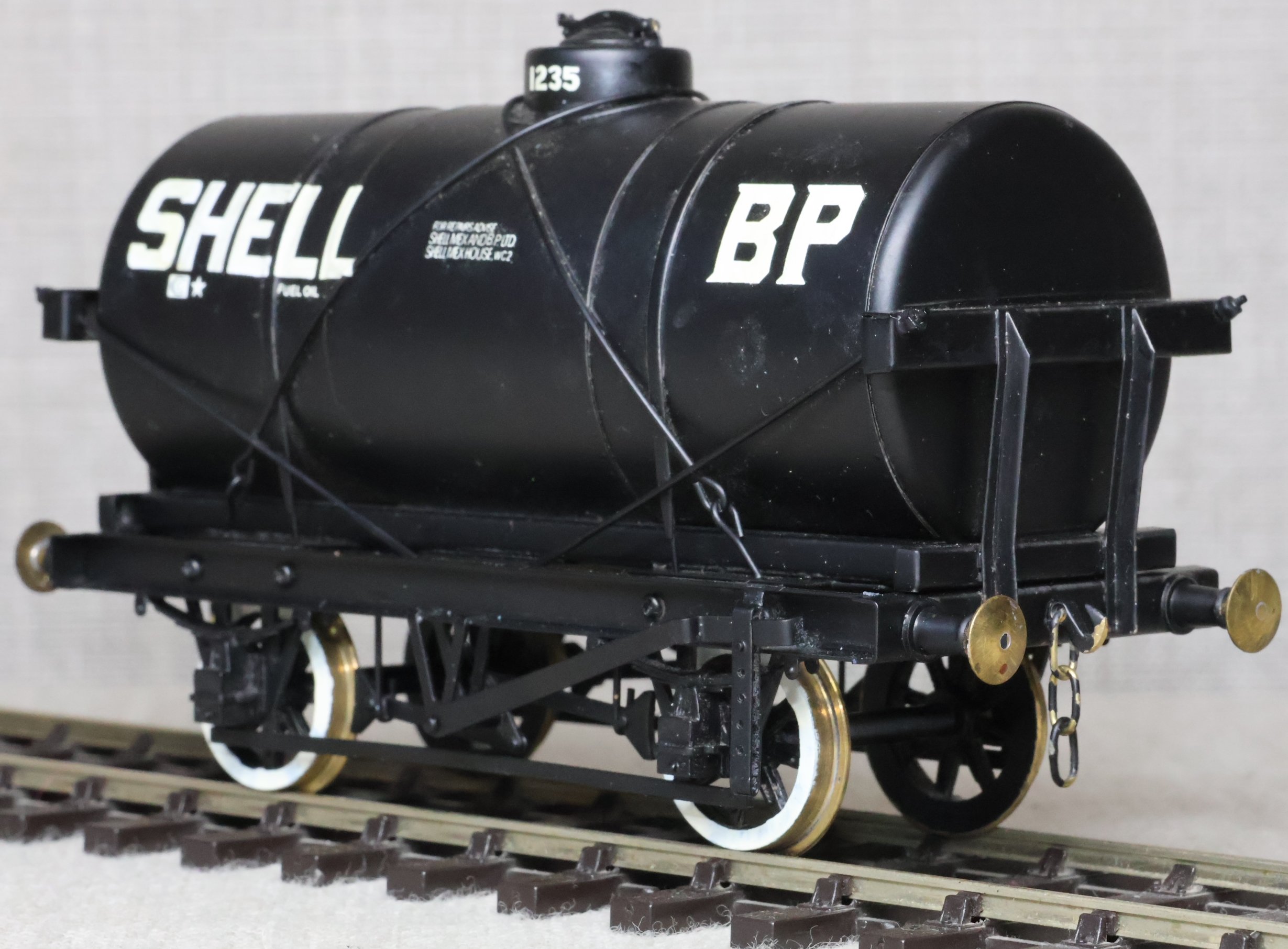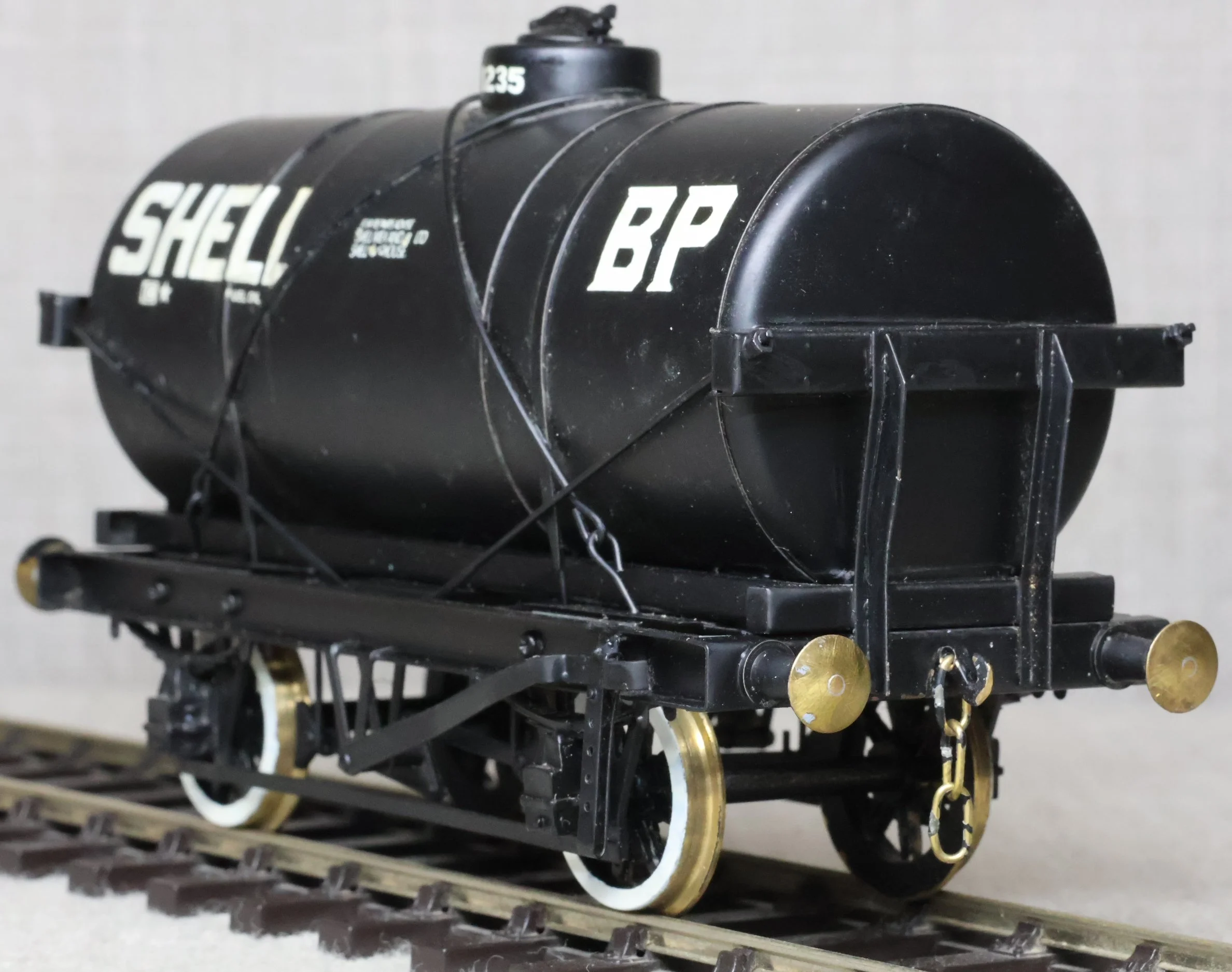 WRP14. Private Owner 4-wheel Oil Tanker Wagon No. 1235 'Shell/BP'. A brass model by Bachmann Brass. Lightly used. £40.