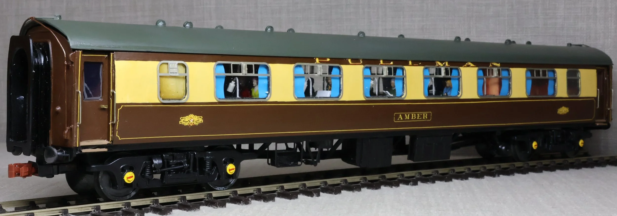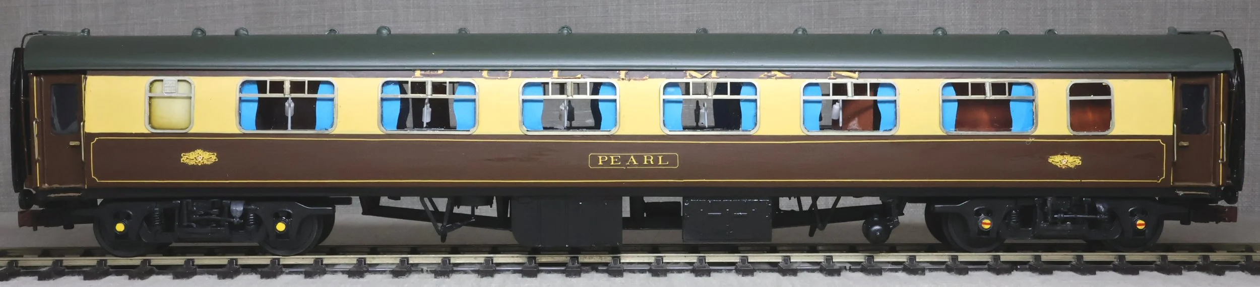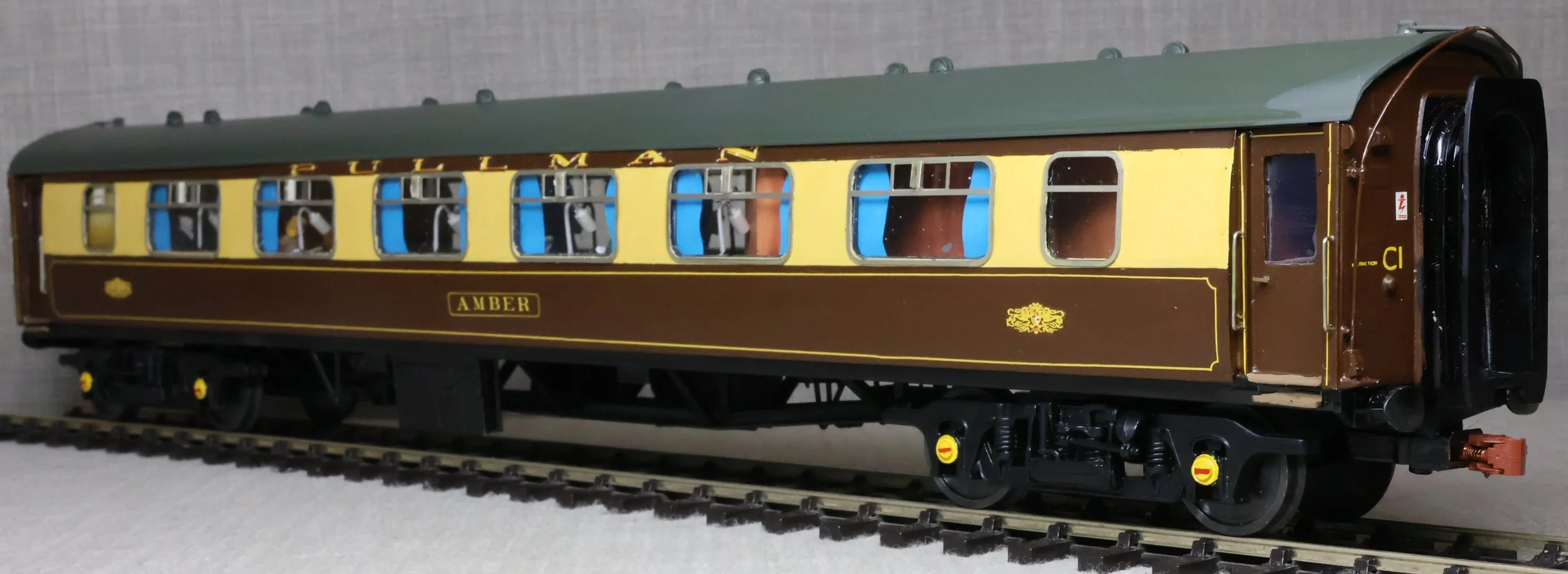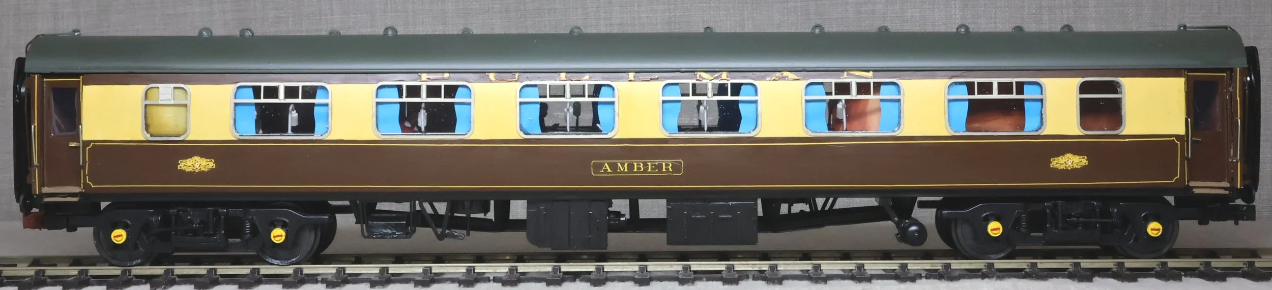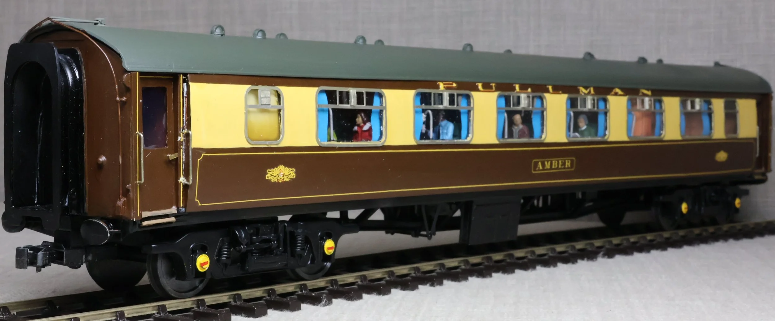 CDS141. BR Metropolitan Cammell Set of 4 BR Mk1 Pullman Coaches. In Pullman Carriage Company Umber and Cream livery. Comprising (1) First Class Parlour Car 'Pearl'. (2) First Class Parlour Car 'Amber'. (3) Second Class Kitchen/Dining Car 'Car No. 346'. (4) Second Class Parlour Car 'Car No. 352'. These are from Easybuild kits, of moulded ABS plastic construction, with full interior details and with passengers fitted. They are painted to a good amateur standard. They have Kadee couplings fitted to the buffer beams and have Easybuild bogies fitted. The models have had medium use with some paint touch-ups on the grey roofs. Metro-Cammell built 44 Mk1 Pullman Cars in 1960/1961 (21 First Class, 22 Second Class, 1 Bar Car) replacing many earlier vehicles. However they built no further brake vehicles so the original 1928 series of brake vehicles continued in service. The BR Mk1 Pullmans were primarily used for East Coast services and many remained in service until circa 1978 with 26 of the 44 vehicles having been preserved (The final 'Yorkshire Pullman' ran on 5th May 1978). Of this set, 'Pearl' and 'Amber' have been preserved but rebuilt as sleeping cars. 'Car No. 352' is preserved but renamed as 'Amethyst'. £695 for the Set of Four Coaches.