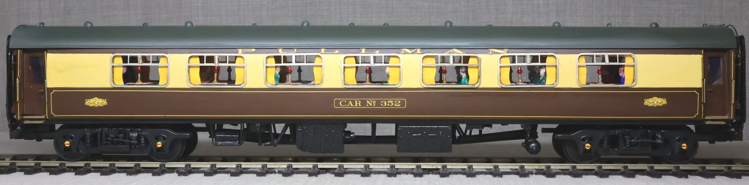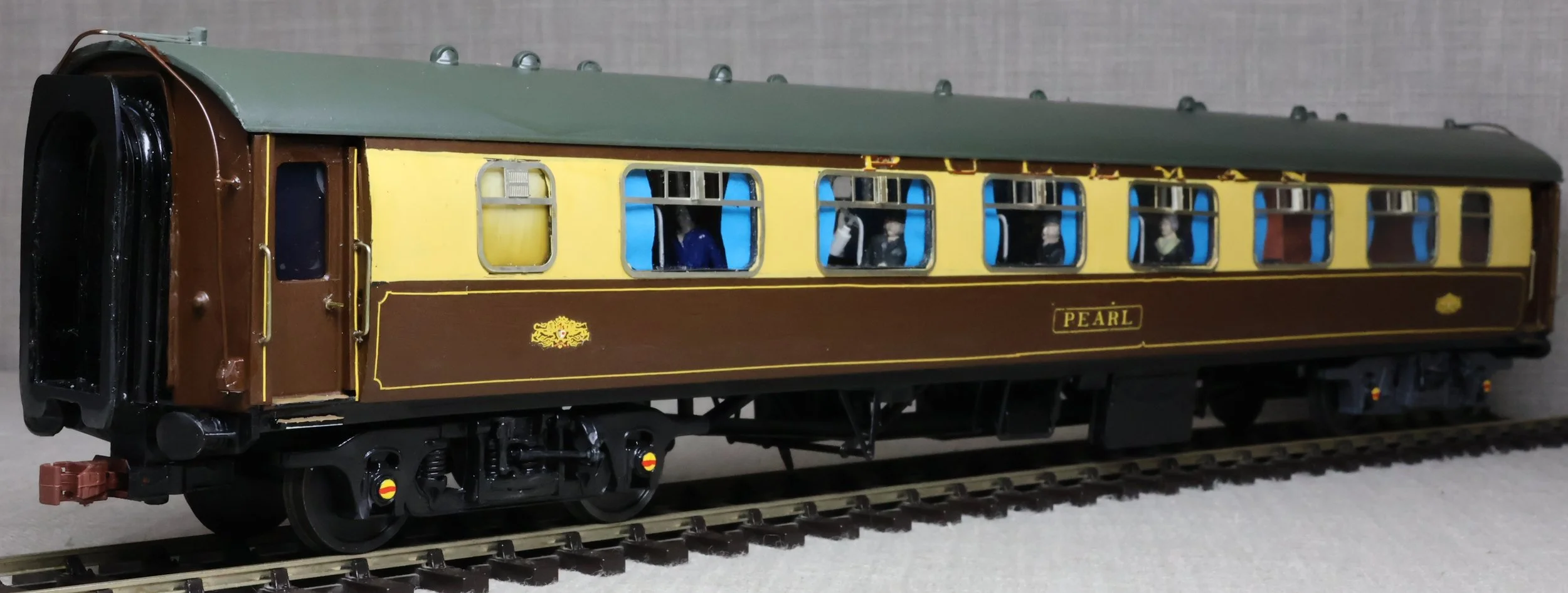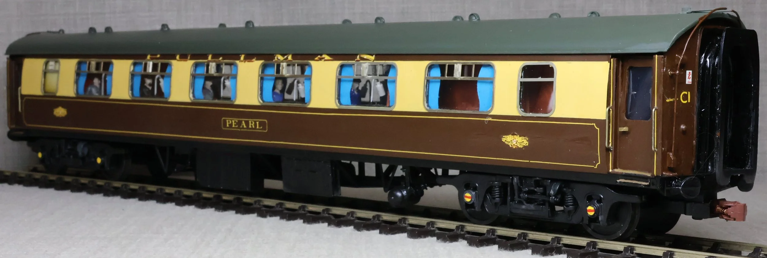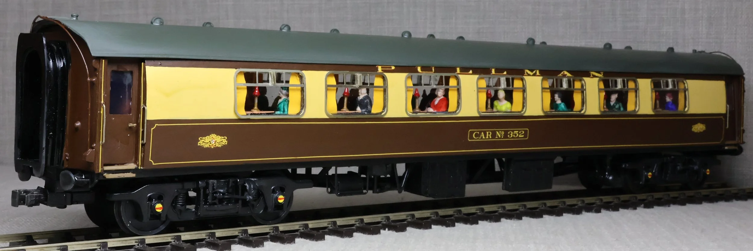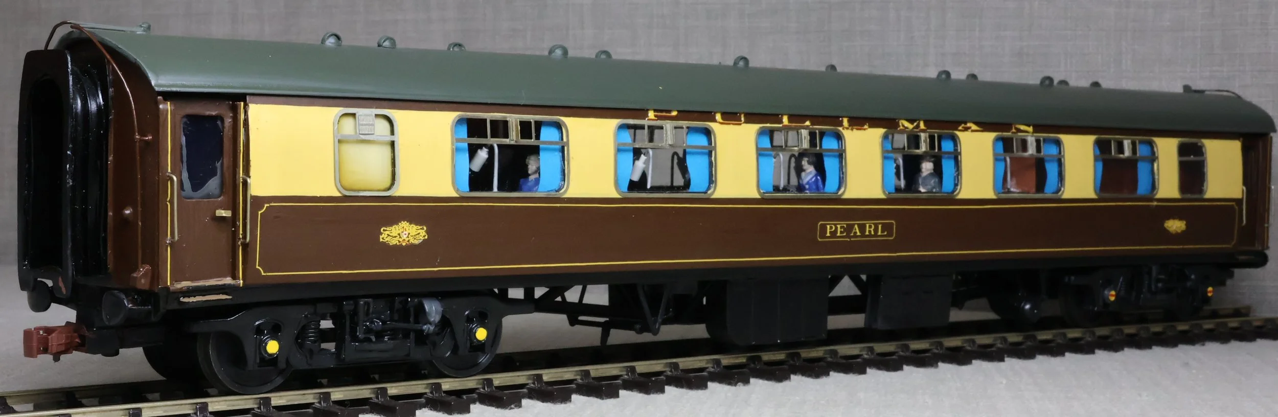 CDS141. BR Metropolitan Cammell Set of 4 BR Mk1 Pullman Coaches. In Pullman Carriage Company Umber and Cream livery. Comprising (1) First Class Parlour Car 'Pearl'. (2) First Class Parlour Car 'Amber'. (3) Second Class Kitchen/Dining Car 'Car No. 346'. (4) Second Class Parlour Car 'Car No. 352'. These are from Easybuild kits, of moulded ABS plastic construction, with full interior details and with passengers fitted. They are painted to a good amateur standard. They have Kadee couplings fitted to the buffer beams and have Easybuild bogies fitted. The models have had medium use with some paint touch-ups on the grey roofs. Metro-Cammell built 44 Mk1 Pullman Cars in 1960/1961 (21 First Class, 22 Second Class, 1 Bar Car) replacing many earlier vehicles. However they built no further brake vehicles so the original 1928 series of brake vehicles continued in service. The BR Mk1 Pullmans were primarily used for East Coast services and many remained in service until circa 1978 with 26 of the 44 vehicles having been preserved (The final 'Yorkshire Pullman' ran on 5th May 1978). Of this set, 'Pearl' and 'Amber' have been preserved but rebuilt as sleeping cars. 'Car No. 352' is preserved but renamed as 'Amethyst'. £695 for the Set of Four Coaches.
