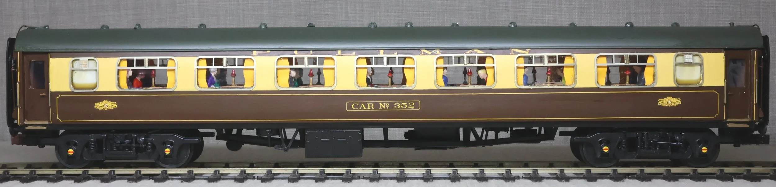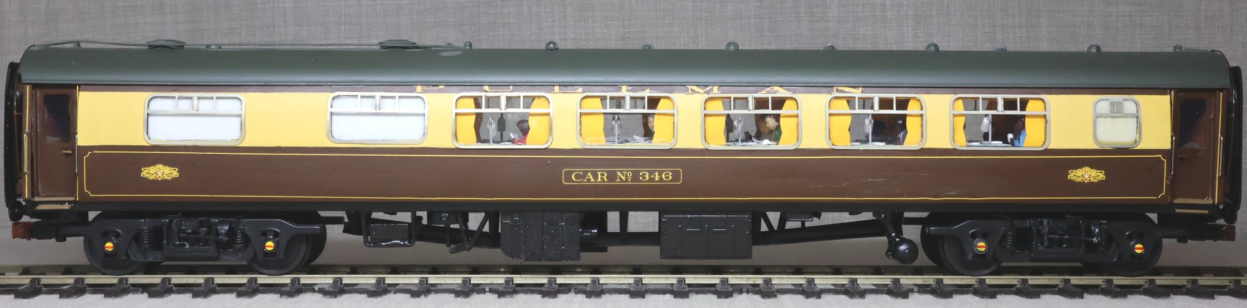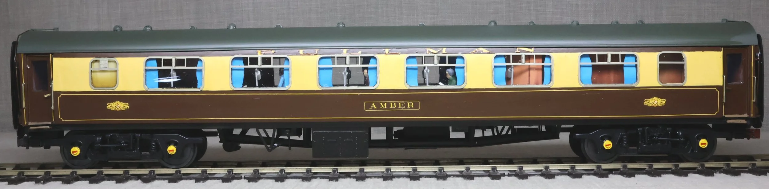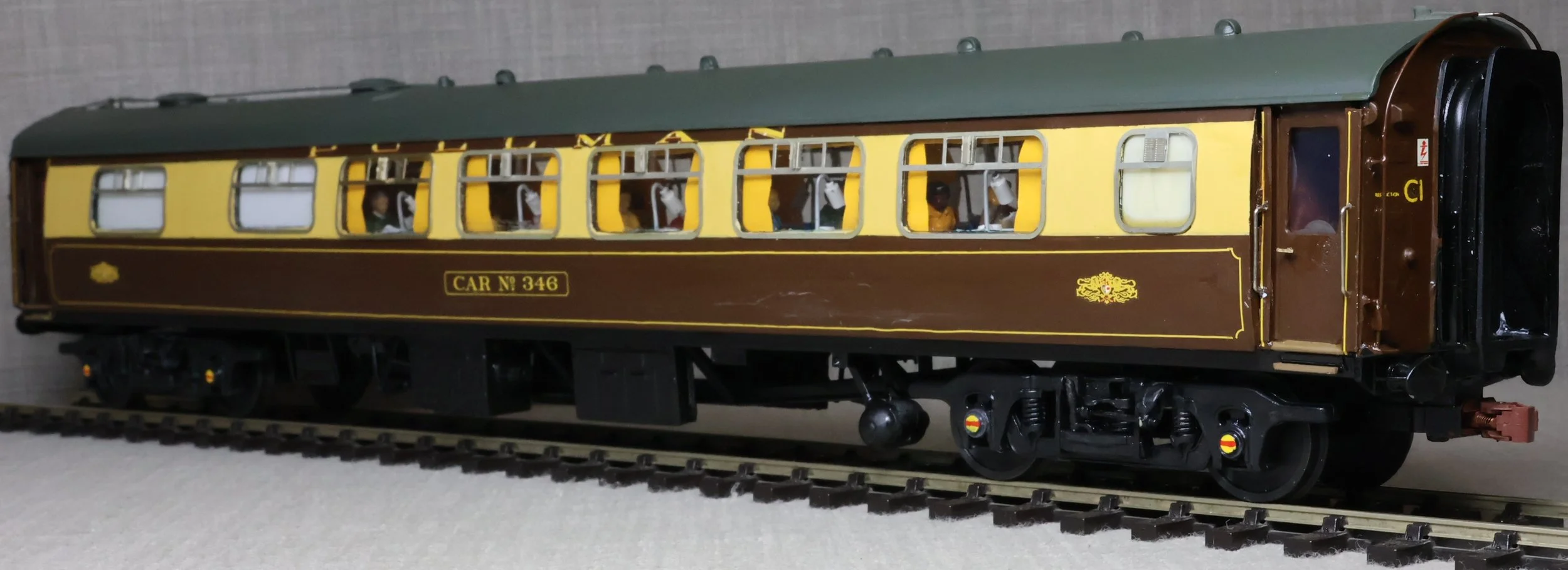 CDS141. BR Metropolitan Cammell Set of 4 BR Mk1 Pullman Coaches. In Pullman Carriage Company Umber and Cream livery. Comprising (1) First Class Parlour Car 'Pearl'. (2) First Class Parlour Car 'Amber'. (3) Second Class Kitchen/Dining Car 'Car No. 346'. (4) Second Class Parlour Car 'Car No. 352'. These are from Easybuild kits, of moulded ABS plastic construction, with full interior details and with passengers fitted. They are painted to a good amateur standard. They have Kadee couplings fitted to the buffer beams and have Easybuild bogies fitted. The models have had medium use with some paint touch-ups on the grey roofs. Metro-Cammell built 44 Mk1 Pullman Cars in 1960/1961 (21 First Class, 22 Second Class, 1 Bar Car) replacing many earlier vehicles. However they built no further brake vehicles so the original 1928 series of brake vehicles continued in service. The BR Mk1 Pullmans were primarily used for East Coast services and many remained in service until circa 1978 with 26 of the 44 vehicles having been preserved (The final 'Yorkshire Pullman' ran on 5th May 1978). Of this set, 'Pearl' and 'Amber' have been preserved but rebuilt as sleeping cars. 'Car No. 352' is preserved but renamed as 'Amethyst'. £695 for the Set of Four Coaches.