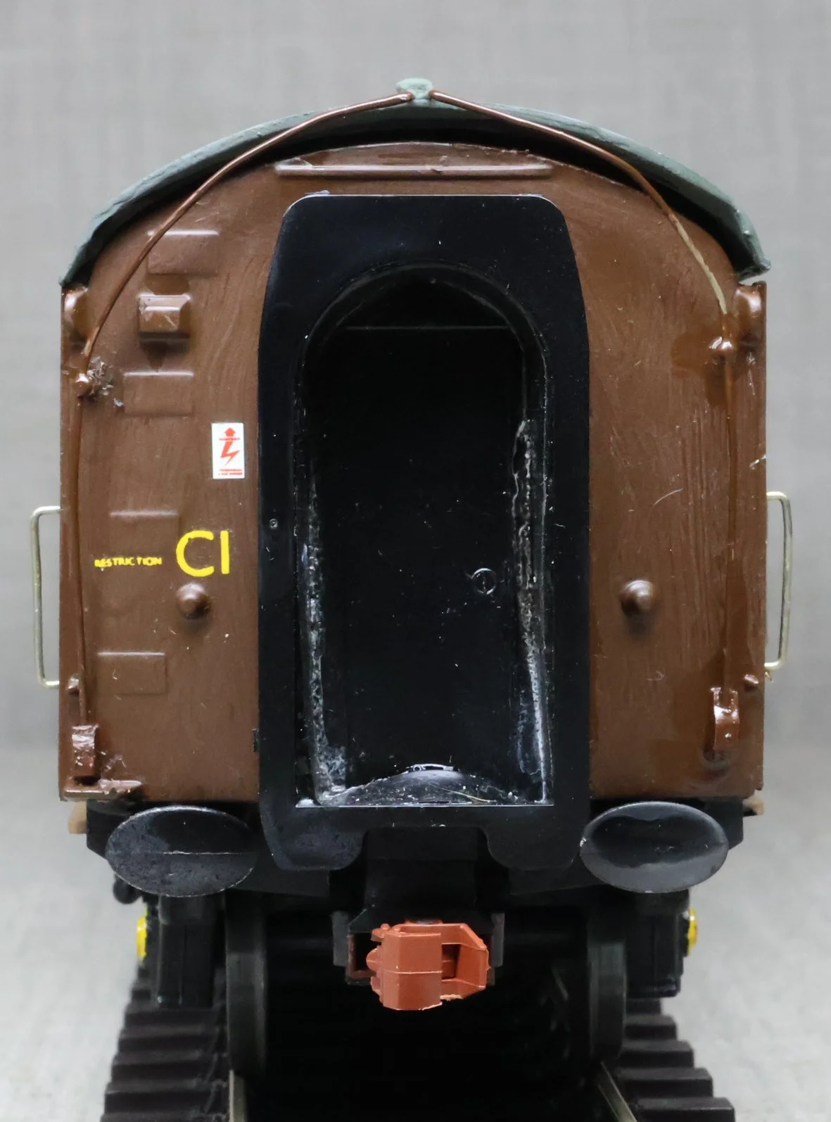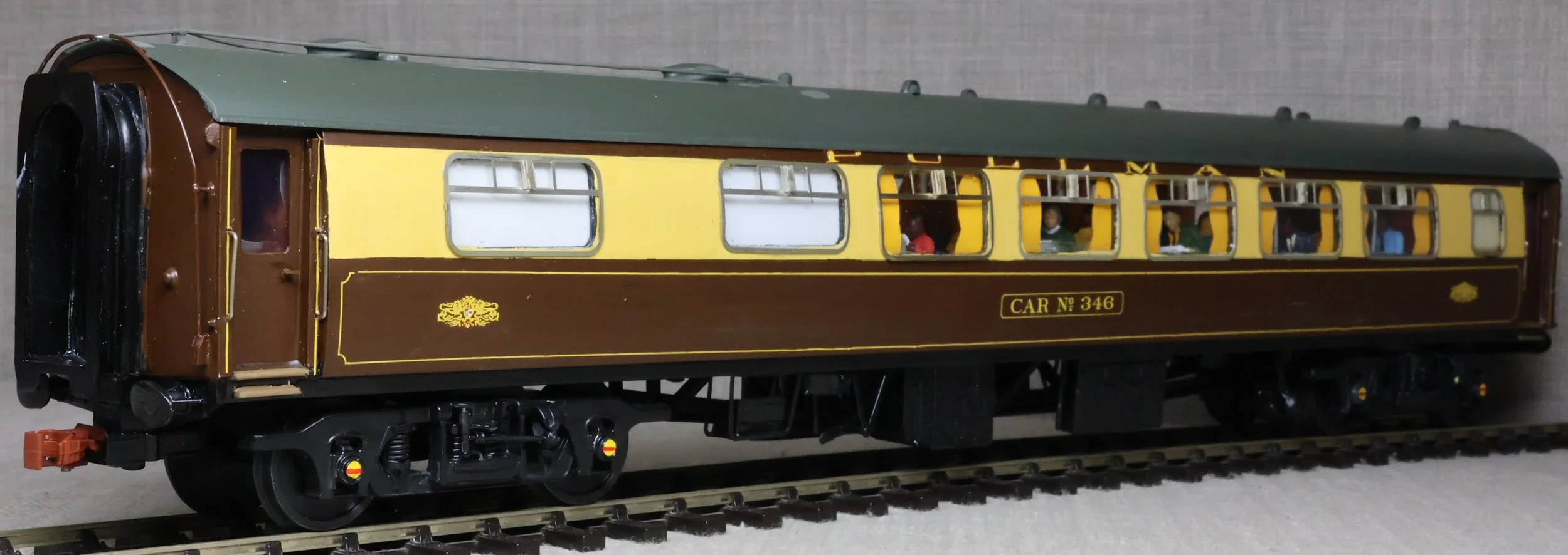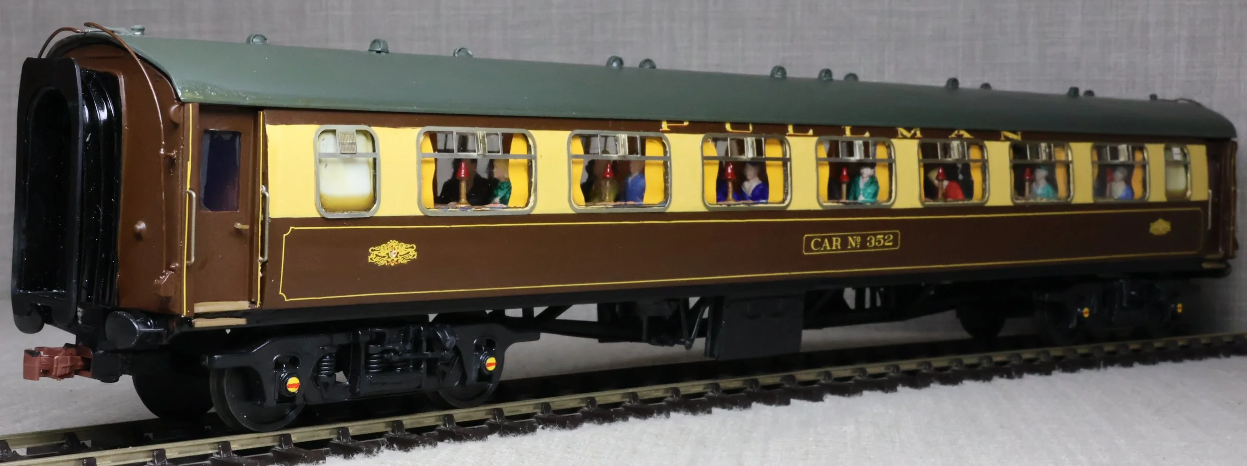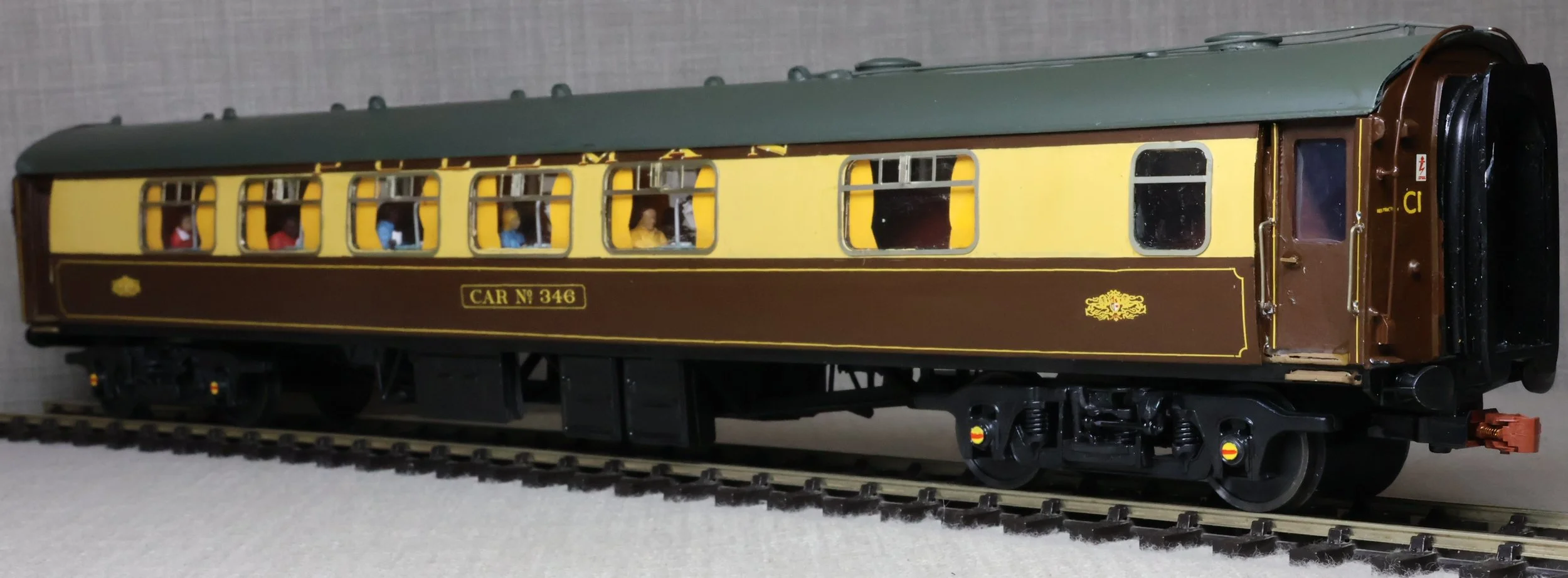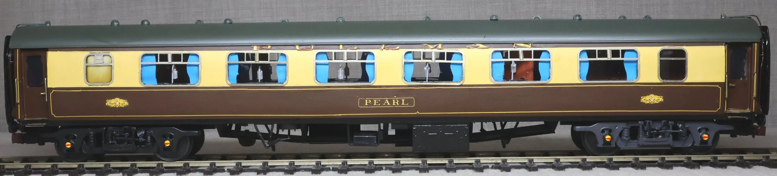 CDS141. BR Metropolitan Cammell Set of 4 BR Mk1 Pullman Coaches. In Pullman Carriage Company Umber and Cream livery. Comprising (1) First Class Parlour Car 'Pearl'. (2) First Class Parlour Car 'Amber'. (3) Second Class Kitchen/Dining Car 'Car No. 346'. (4) Second Class Parlour Car 'Car No. 352'. These are from Easybuild kits, of moulded ABS plastic construction, with full interior details and with passengers fitted. They are painted to a good amateur standard. They have Kadee couplings fitted to the buffer beams and have Easybuild bogies fitted. The models have had medium use with some paint touch-ups on the grey roofs. Metro-Cammell built 44 Mk1 Pullman Cars in 1960/1961 (21 First Class, 22 Second Class, 1 Bar Car) replacing many earlier vehicles. However they built no further brake vehicles so the original 1928 series of brake vehicles continued in service. The BR Mk1 Pullmans were primarily used for East Coast services and many remained in service until circa 1978 with 26 of the 44 vehicles having been preserved (The final 'Yorkshire Pullman' ran on 5th May 1978). Of this set, 'Pearl' and 'Amber' have been preserved but rebuilt as sleeping cars. 'Car No. 352' is preserved but renamed as 'Amethyst'. £695 for the Set of Four Coaches.