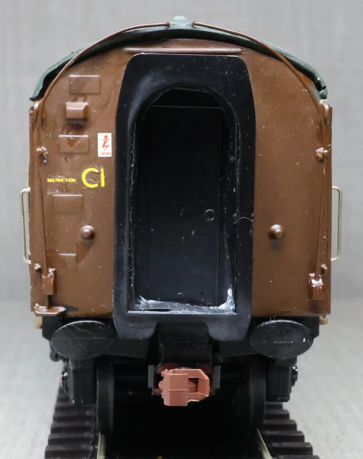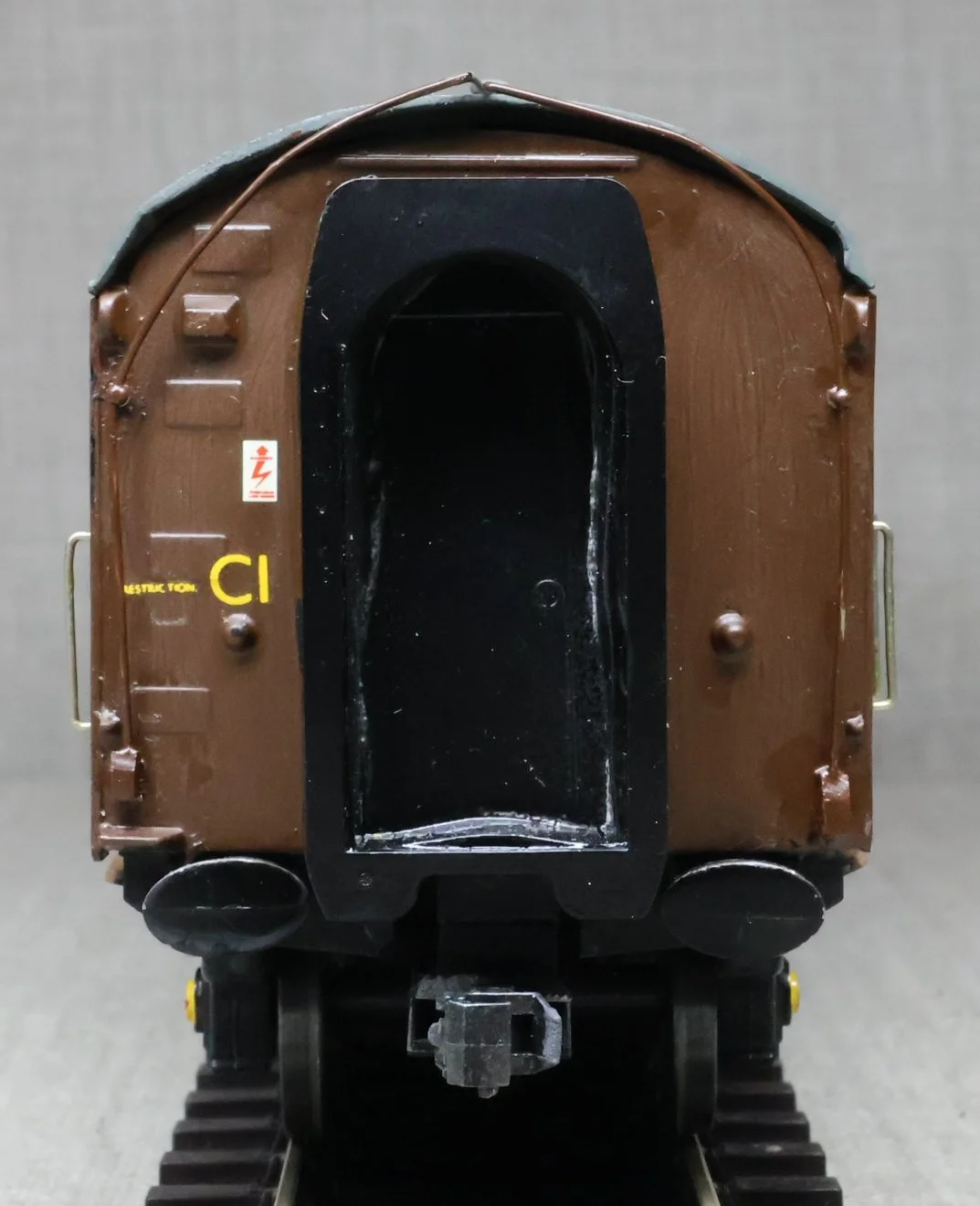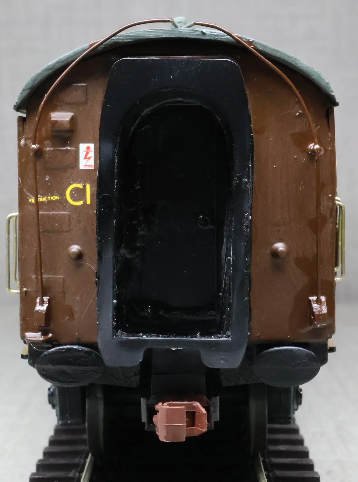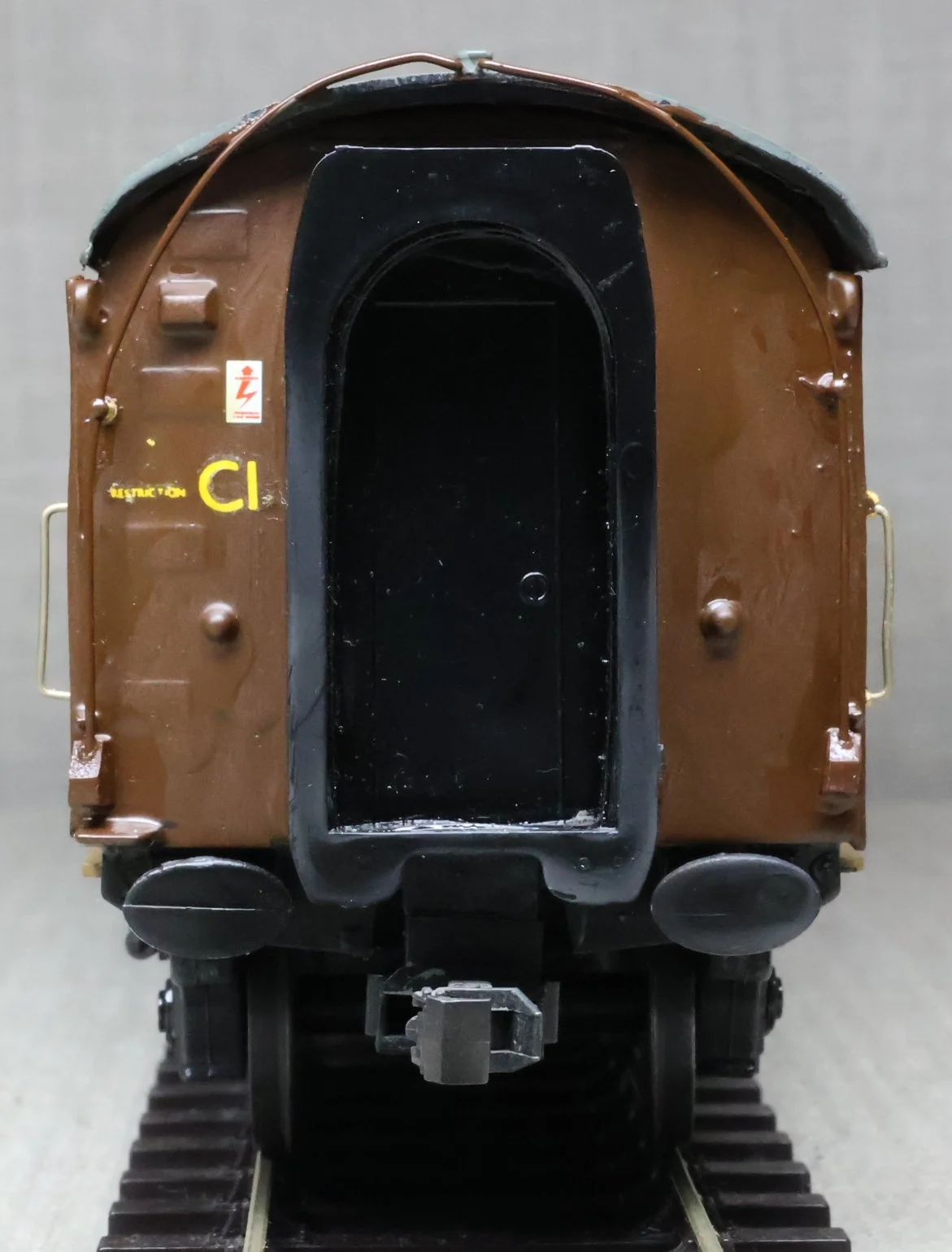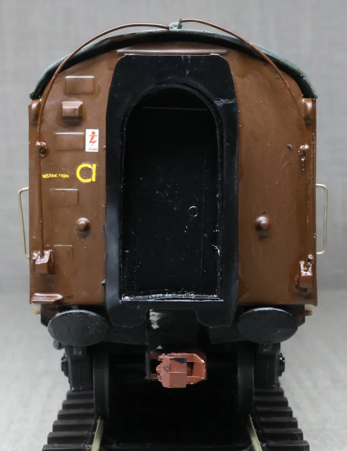 CDS141. BR Metropolitan Cammell Set of 4 BR Mk1 Pullman Coaches. In Pullman Carriage Company Umber and Cream livery. Comprising (1) First Class Parlour Car 'Pearl'. (2) First Class Parlour Car 'Amber'. (3) Second Class Kitchen/Dining Car 'Car No. 346'. (4) Second Class Parlour Car 'Car No. 352'. These are from Easybuild kits, of moulded ABS plastic construction, with full interior details and with passengers fitted. They are painted to a good amateur standard. They have Kadee couplings fitted to the buffer beams and have Easybuild bogies fitted. The models have had medium use with some paint touch-ups on the grey roofs. Metro-Cammell built 44 Mk1 Pullman Cars in 1960/1961 (21 First Class, 22 Second Class, 1 Bar Car) replacing many earlier vehicles. However they built no further brake vehicles so the original 1928 series of brake vehicles continued in service. The BR Mk1 Pullmans were primarily used for East Coast services and many remained in service until circa 1978 with 26 of the 44 vehicles having been preserved (The final 'Yorkshire Pullman' ran on 5th May 1978). Of this set, 'Pearl' and 'Amber' have been preserved but rebuilt as sleeping cars. 'Car No. 352' is preserved but renamed as 'Amethyst'. £695 for the Set of Four Coaches.