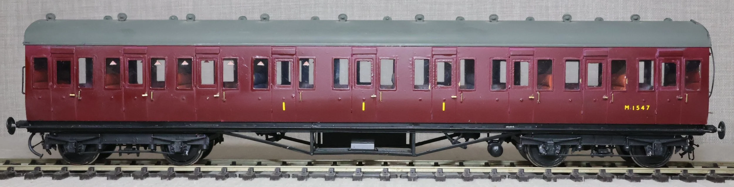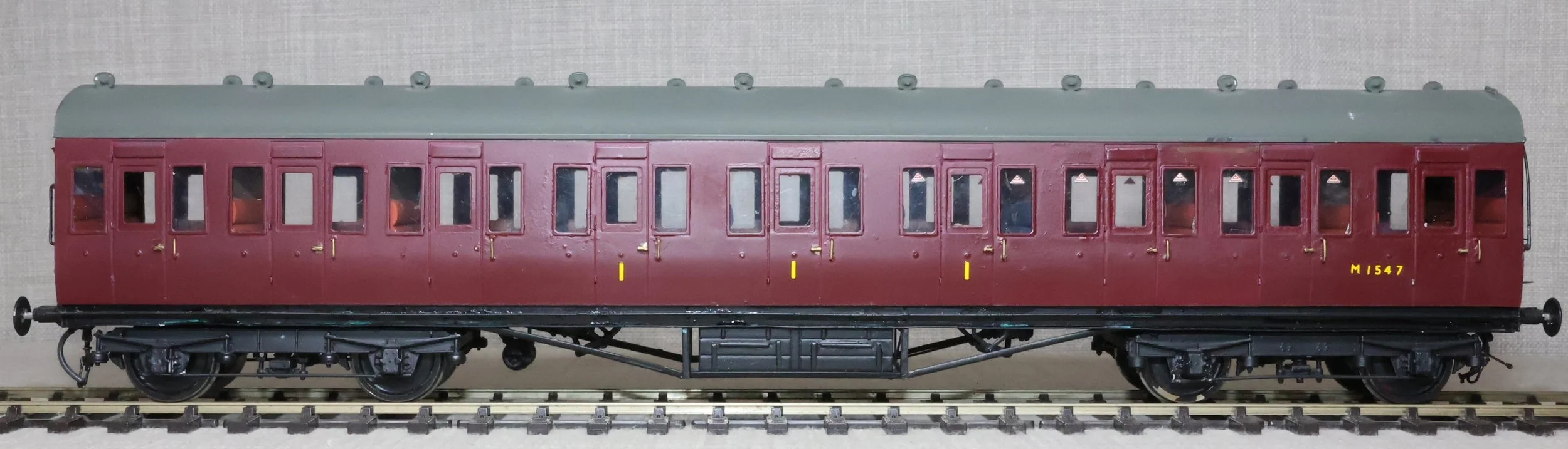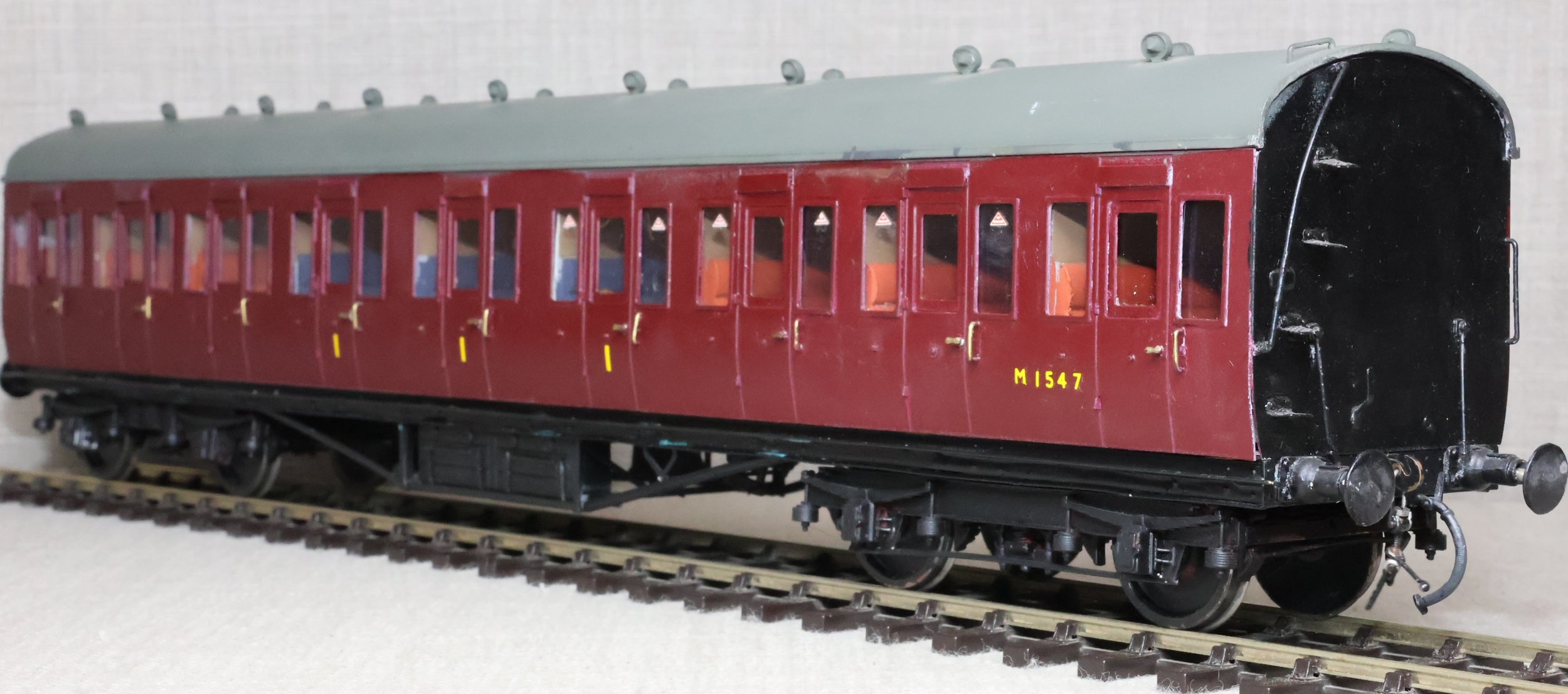 CJMA22. BR ex-LMS Stanier 57ft Suburban Non-Corridor Composite Coach No. M1547. In BR maroon livery, from a Sidelines brass kit. To LMS Diagram D1701 (Derby/Wolverton 1925 - 1927) or D1734 (Wolverton 1930 - 1932) but with an untraced running number. The model is lightly used. £125.