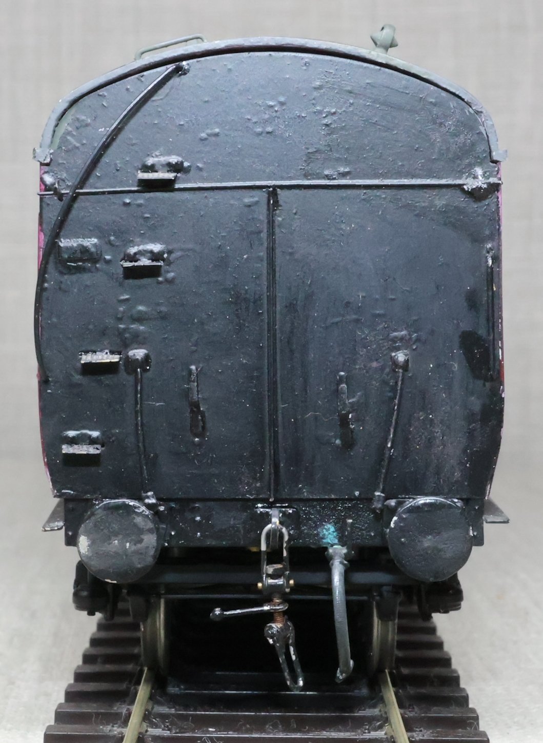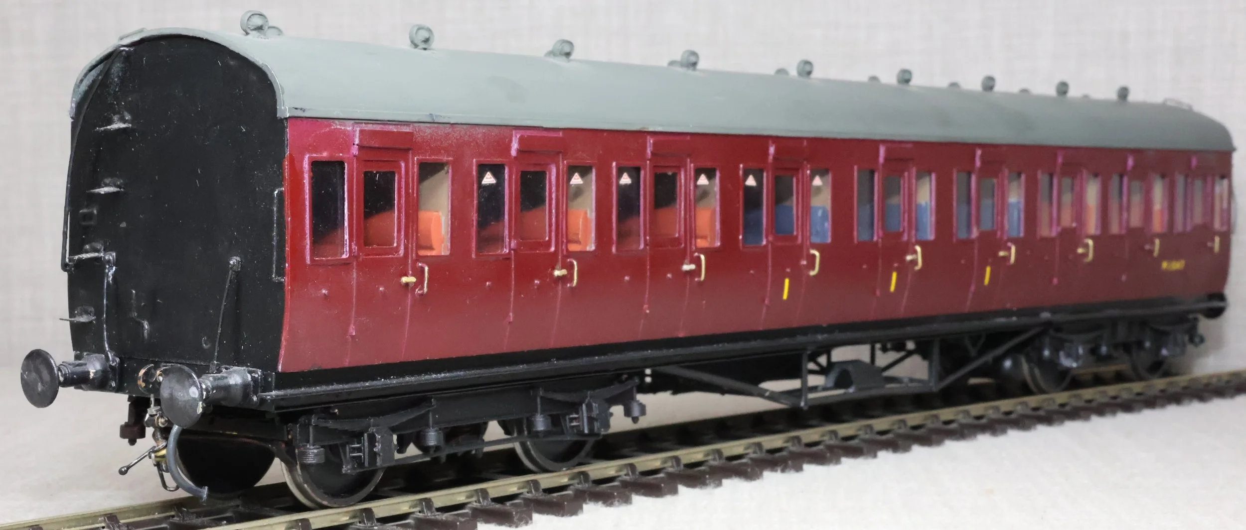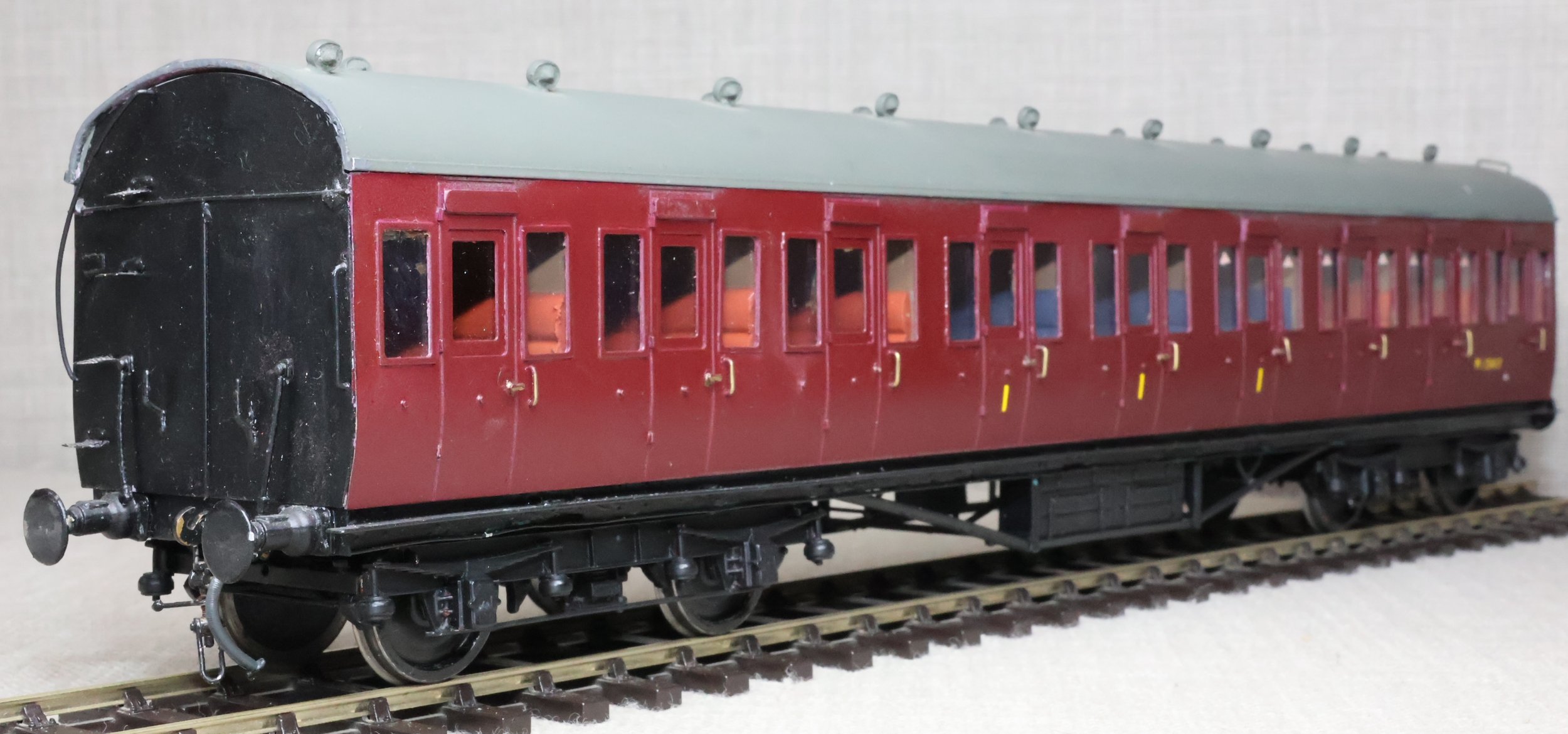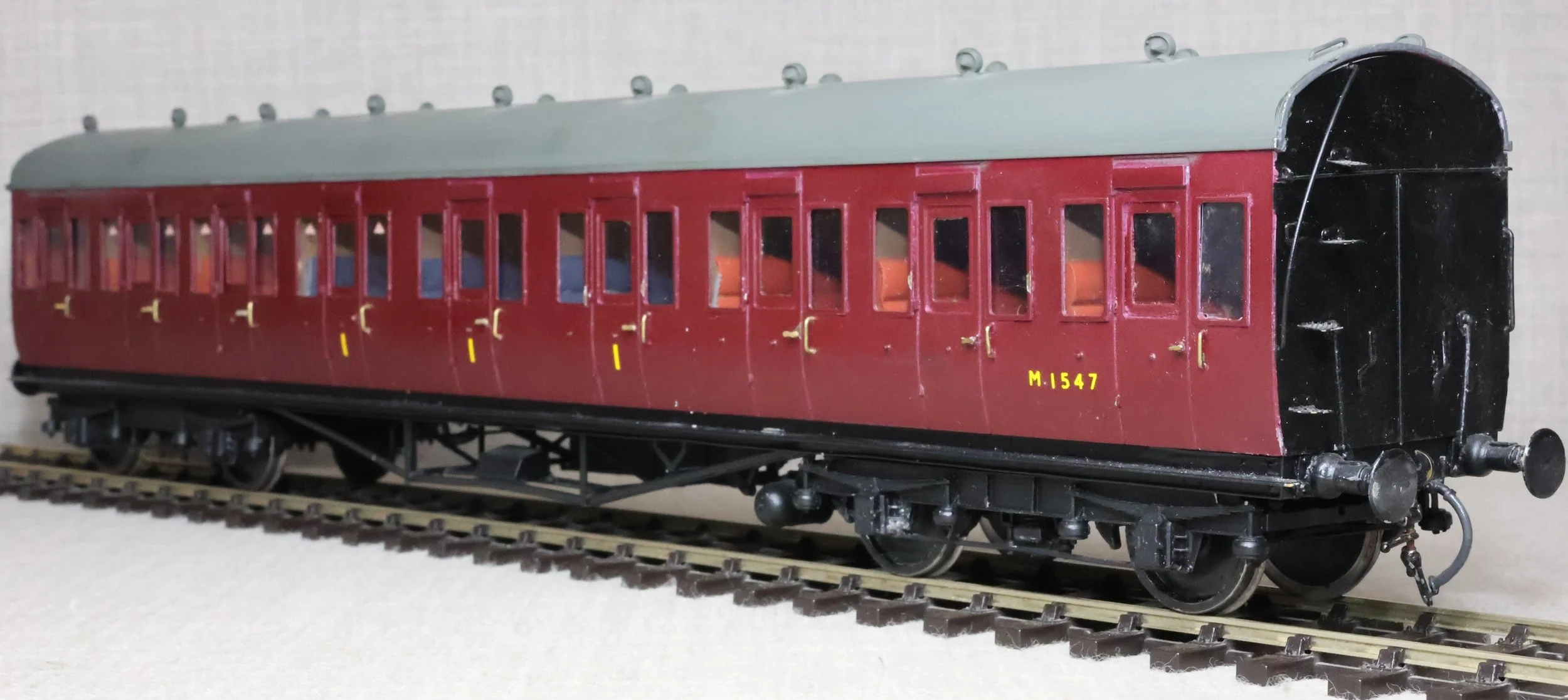 CJMA22. BR ex-LMS Stanier 57ft Suburban Non-Corridor Composite Coach No. M1547. In BR maroon livery, from a Sidelines brass kit. To LMS Diagram D1701 (Derby/Wolverton 1925 - 1927) or D1734 (Wolverton 1930 - 1932) but with an untraced running number. The model is lightly used. £125.