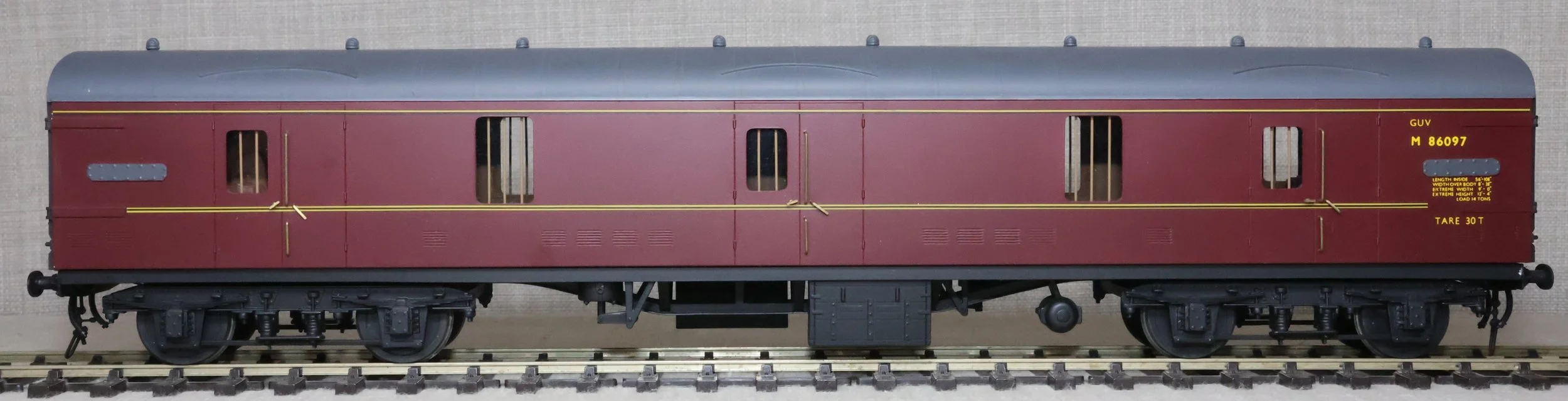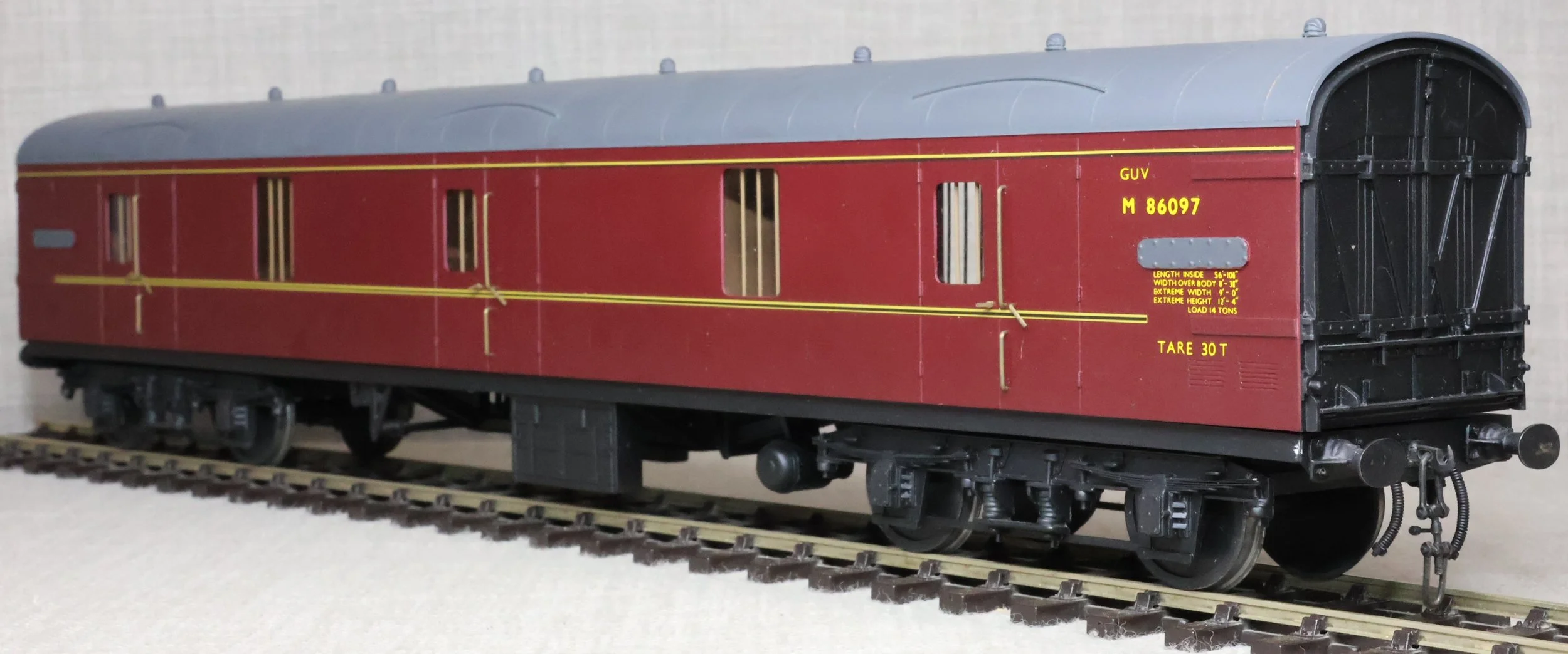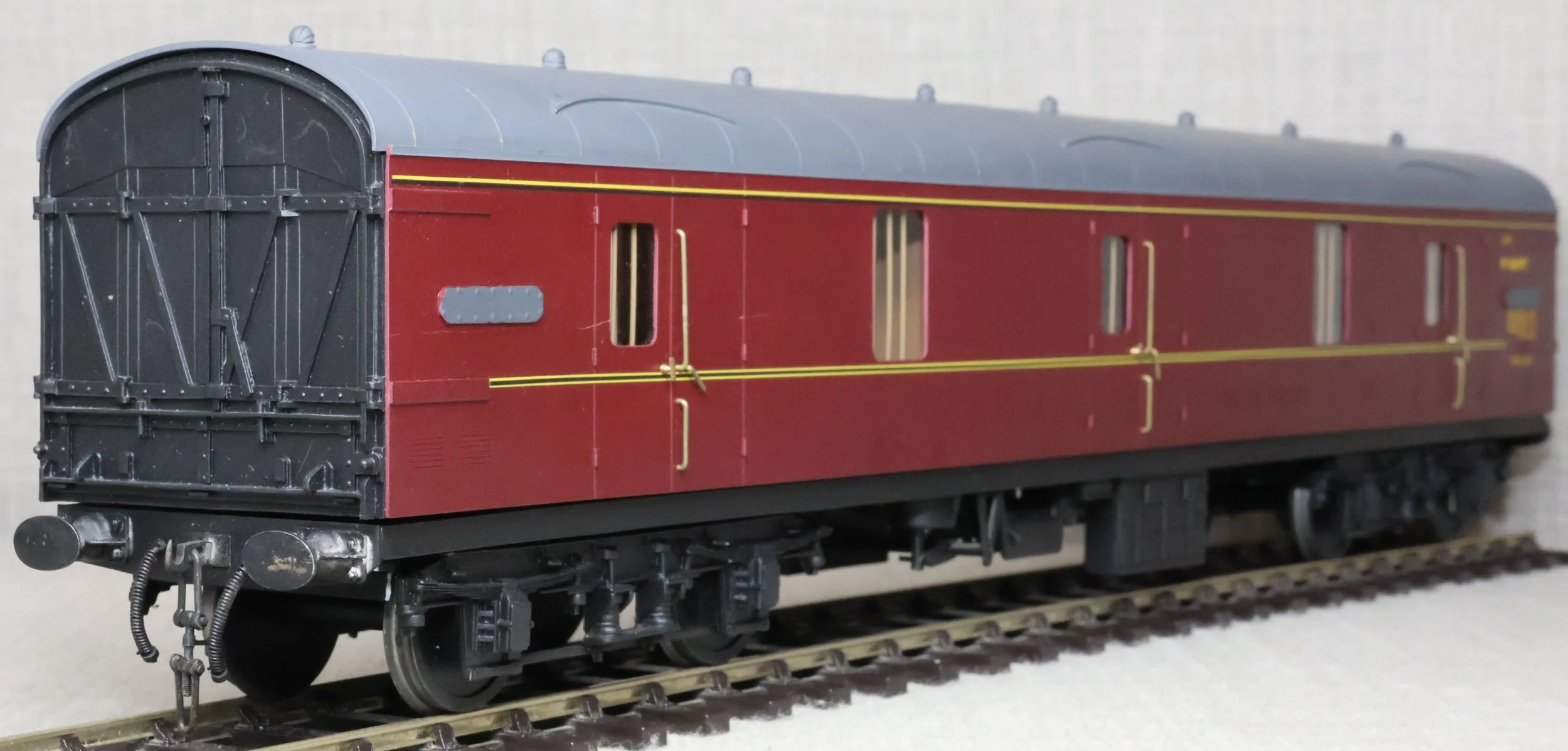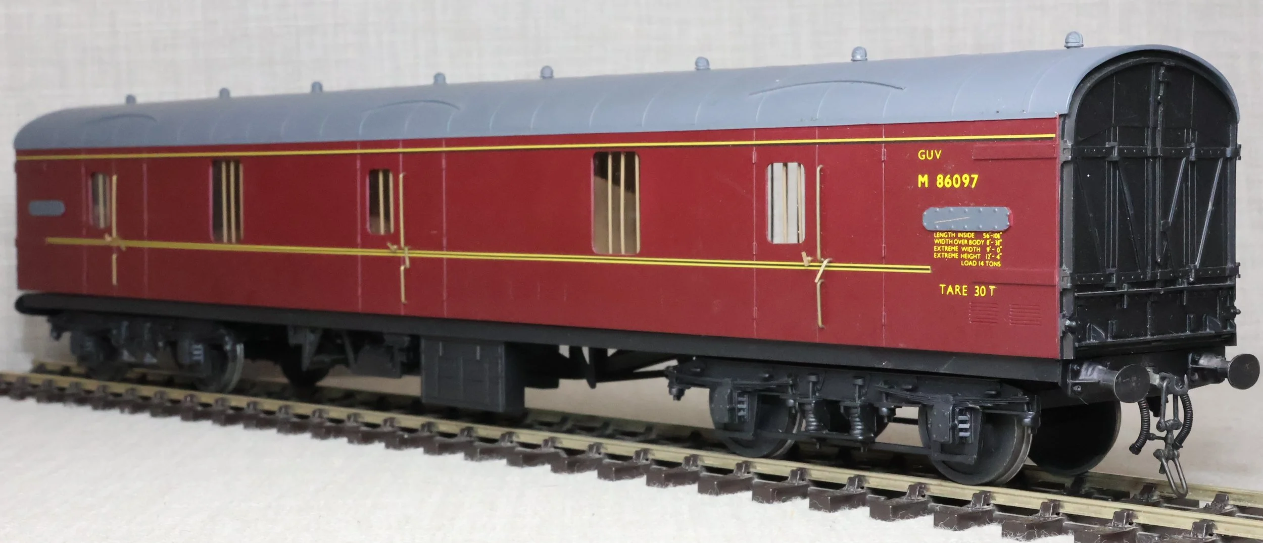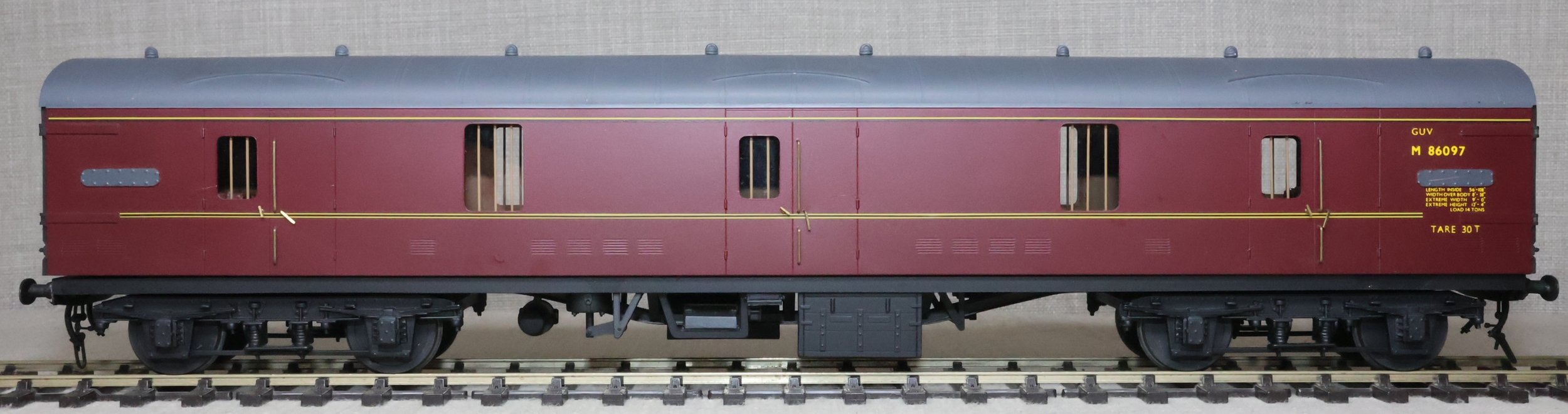 CJMA26. BR Mk1 Bogie Non-Corridor General Utility Vehicle (GUV) No. M86097. In BR maroon livery, by Peter Cowling. Fitted with screw couplings. The model is lightly used and is supplied in a plain box. £150.