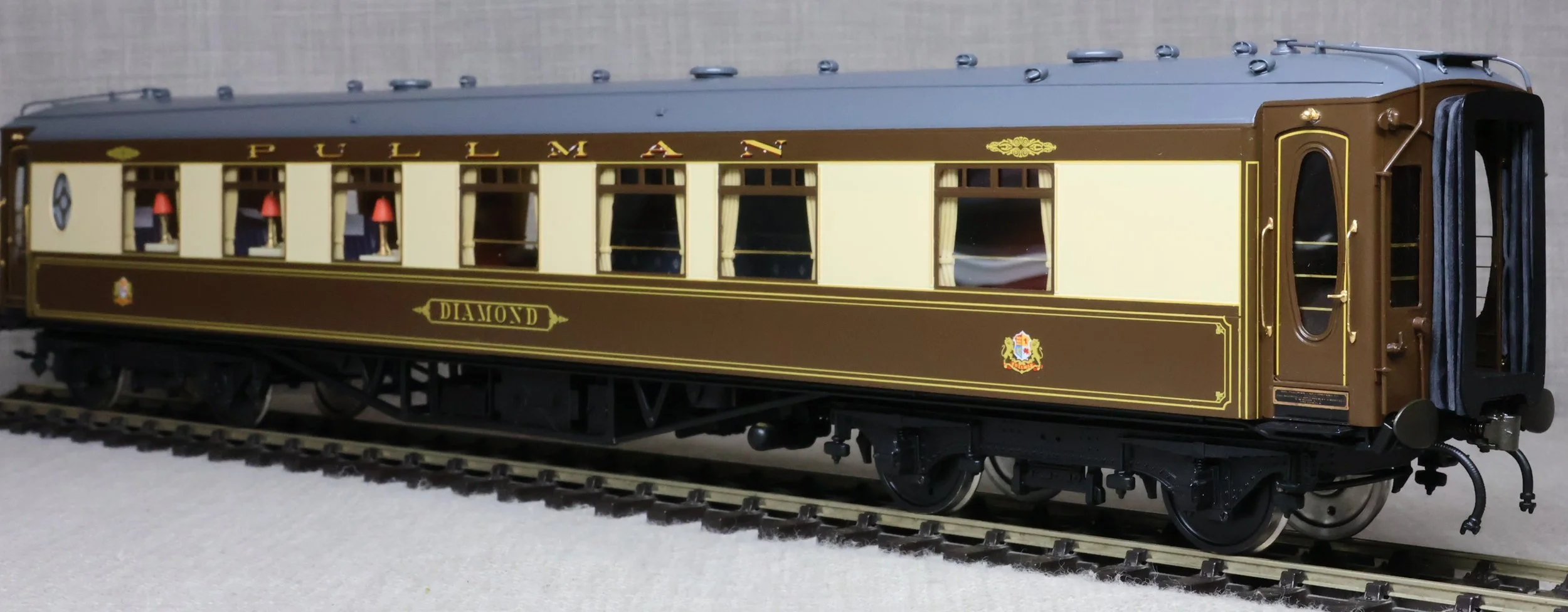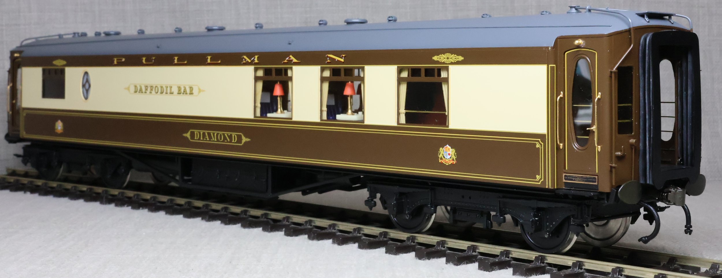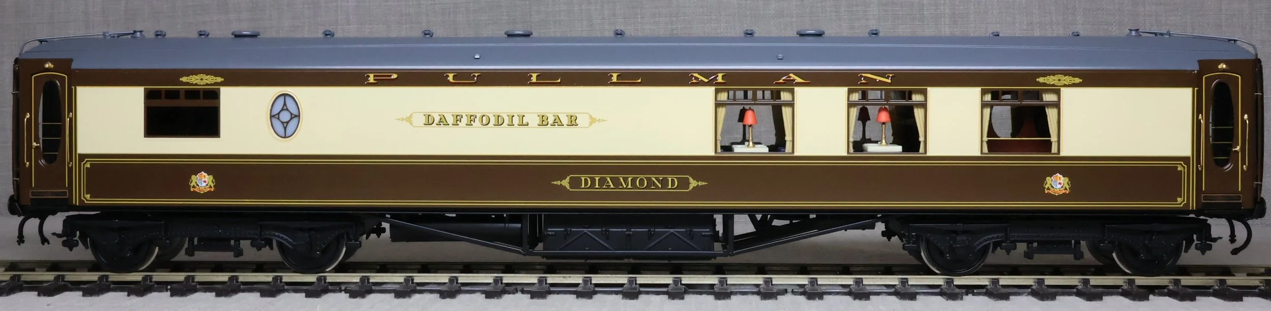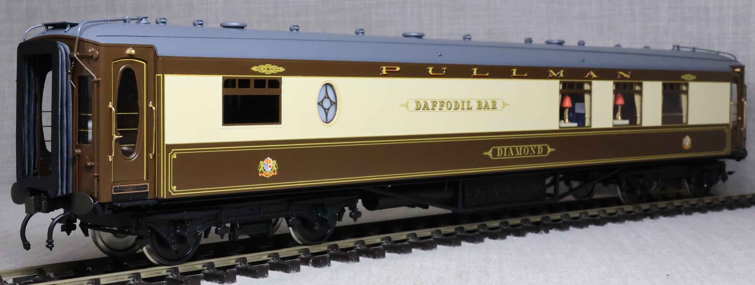 CPB01. BR Pullman First Class Bar Car 'Diamond/The Daffodil Bar'. In Pullman livery with grey roof as running post-war. By F.C. Models of Korea for Golden Age Models. These highly detailed models were factory built in brass and have been unavailable for some time. Fitted with interior lighting, opening doors and glass windows. The model is from the first series of Pullman cars produced by Golden Age, is supplied in its original box, and has been very lightly used. This coach was originally constructed as 'Octavia' in 1924/25 as a Kitchen car, built by Birmingham Railway Carriage & Wagon Co. It did not enter service in the UK and in the autumn of 1925 the car was relocated to Italy and became CIWL No. 2997 (Later CIWL No. 57). On return to the United Kingdom it was renamed 'Diamond' and then went through many conversions and name changes (including 'The Trianon Bar') during its life. In 1946 it became 'The New Century Bar' for service on 'The Golden Arrow' and ran as such before being renamed as 'Diamond - The Daffodil Bar' in 1955 for service on 'The South Wales Pullman'. It is not one of the many survivors. The name 'Octavia' was also carried by a later Standard 'K' Type Pullman car built circa 1926/27. £350.