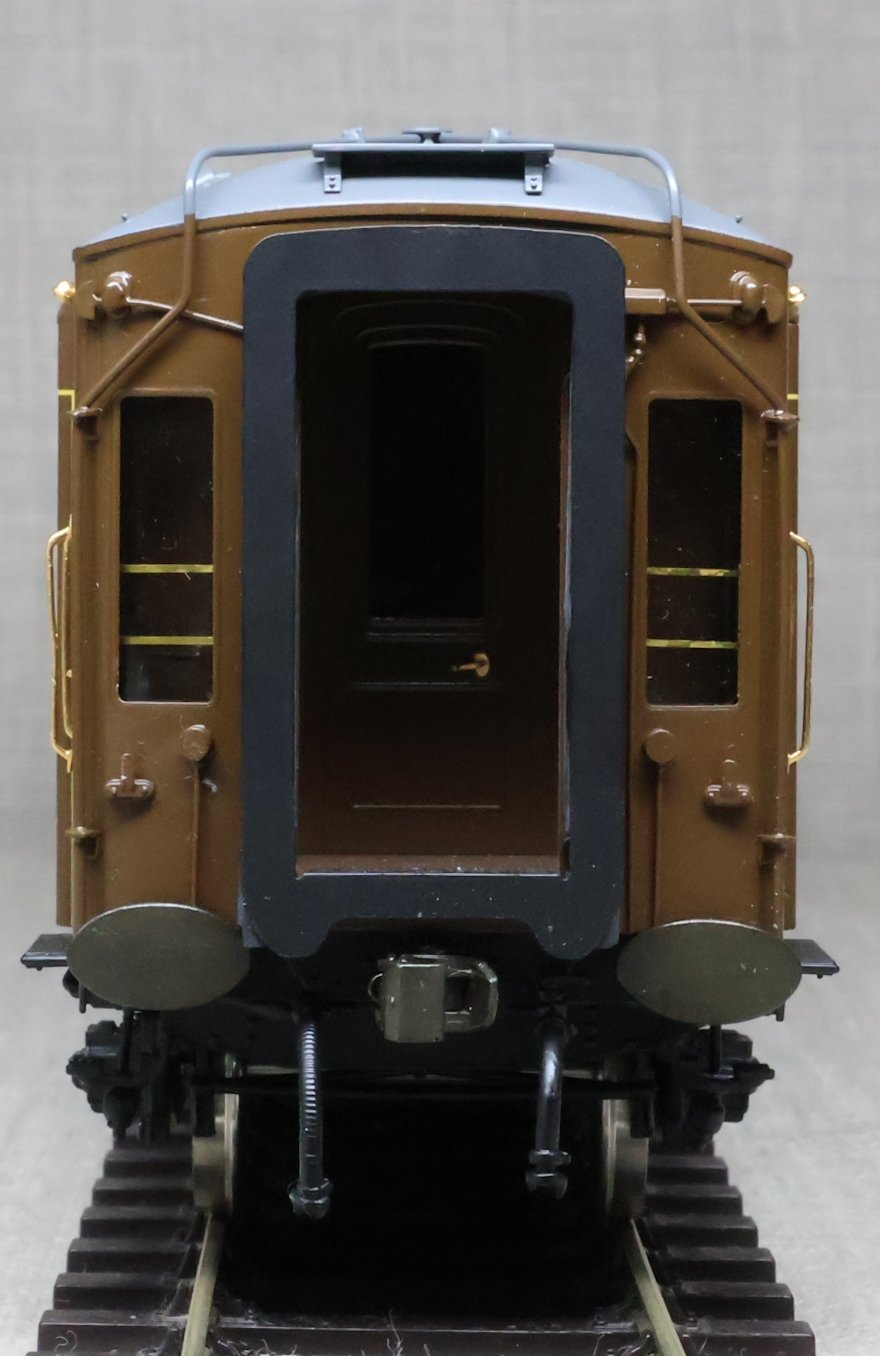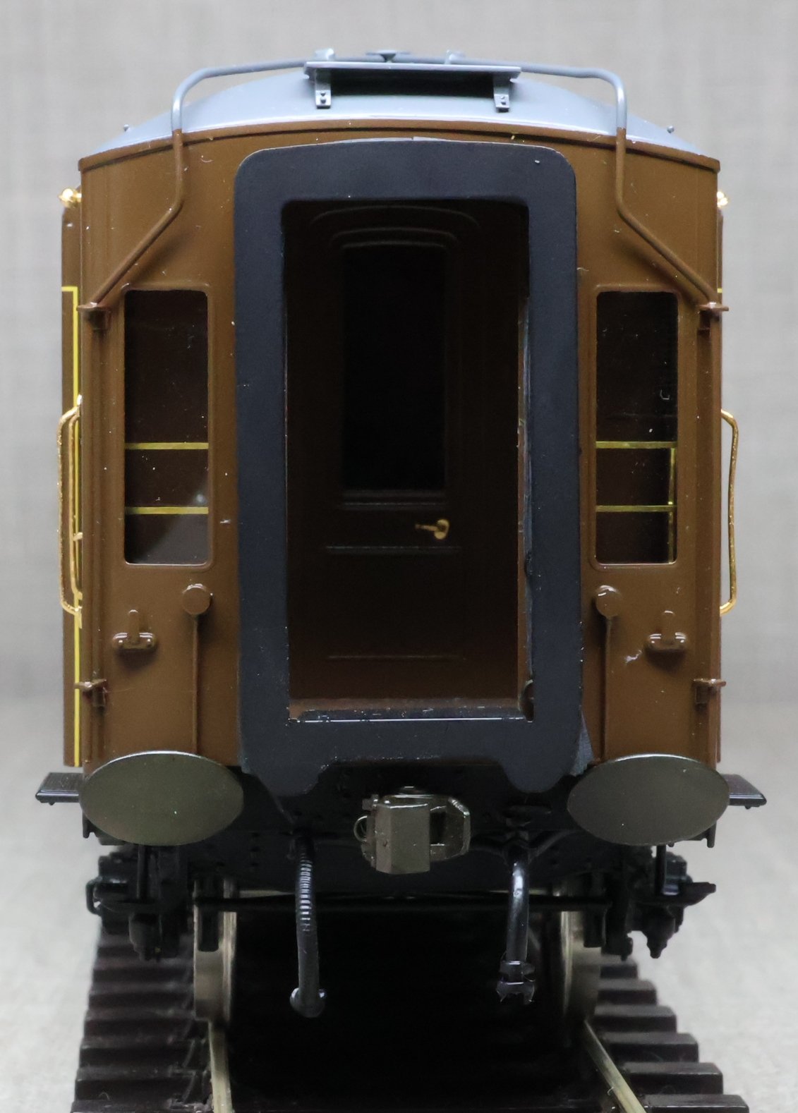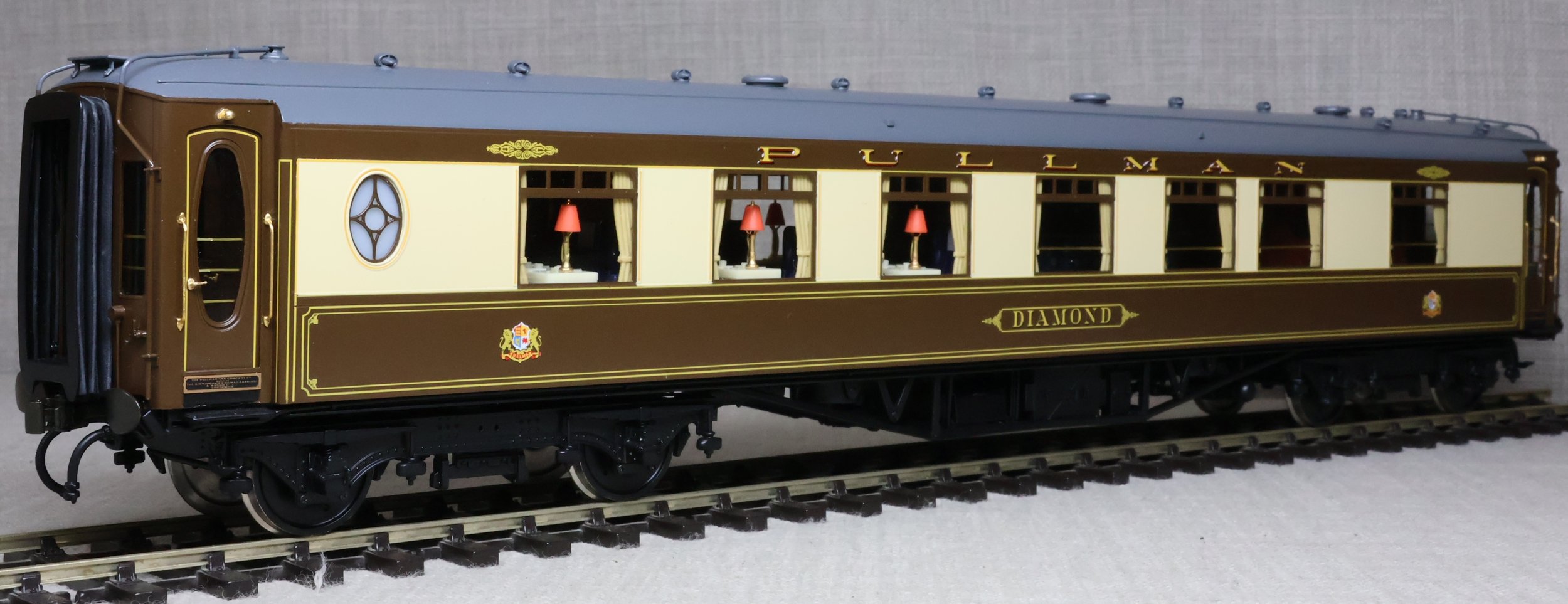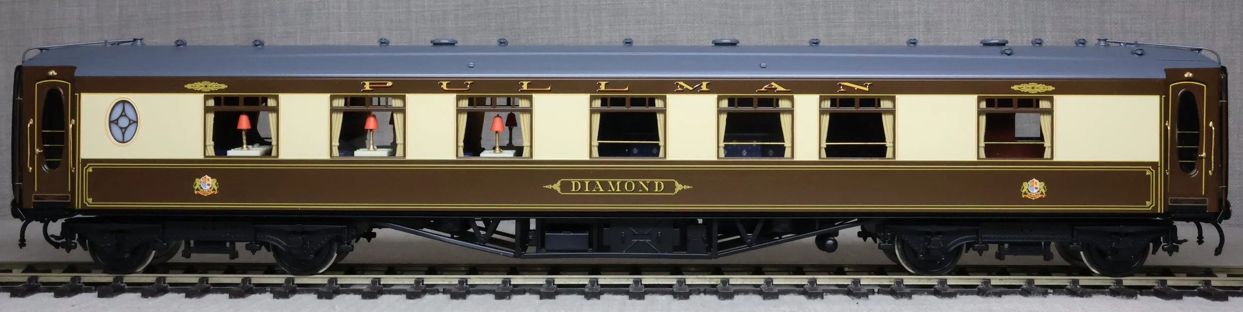 CPB01. BR Pullman First Class Bar Car 'Diamond/The Daffodil Bar'. In Pullman livery with grey roof as running post-war. By F.C. Models of Korea for Golden Age Models. These highly detailed models were factory built in brass and have been unavailable for some time. Fitted with interior lighting, opening doors and glass windows. The model is from the first series of Pullman cars produced by Golden Age, is supplied in its original box, and has been very lightly used. This coach was originally constructed as 'Octavia' in 1924/25 as a Kitchen car, built by Birmingham Railway Carriage & Wagon Co. It did not enter service in the UK and in the autumn of 1925 the car was relocated to Italy and became CIWL No. 2997 (Later CIWL No. 57). On return to the United Kingdom it was renamed 'Diamond' and then went through many conversions and name changes (including 'The Trianon Bar') during its life. In 1946 it became 'The New Century Bar' for service on 'The Golden Arrow' and ran as such before being renamed as 'Diamond - The Daffodil Bar' in 1955 for service on 'The South Wales Pullman'. It is not one of the many survivors. The name 'Octavia' was also carried by a later Standard 'K' Type Pullman car built circa 1926/27. £350.