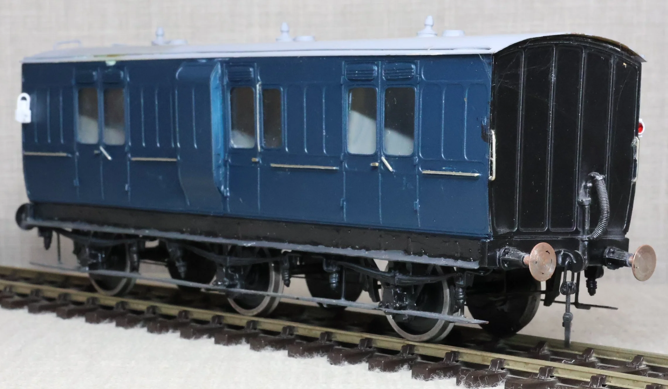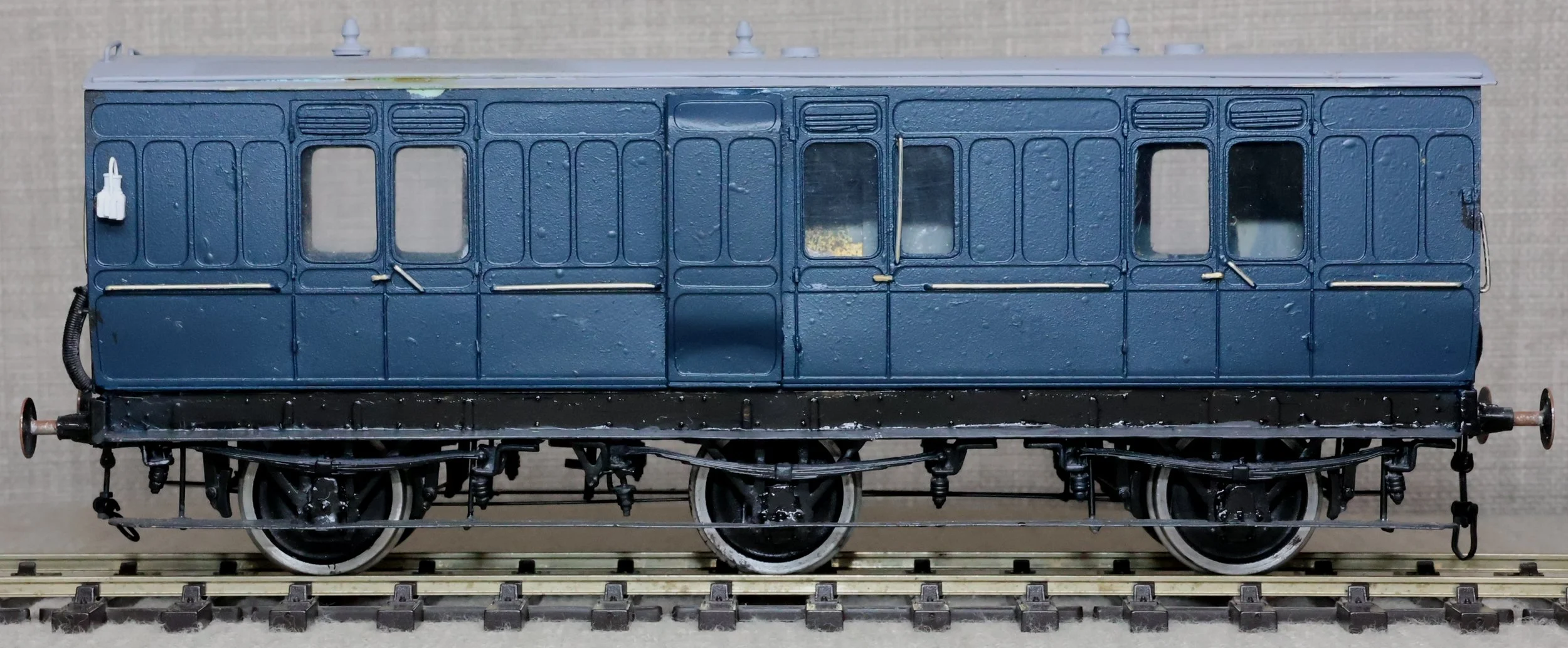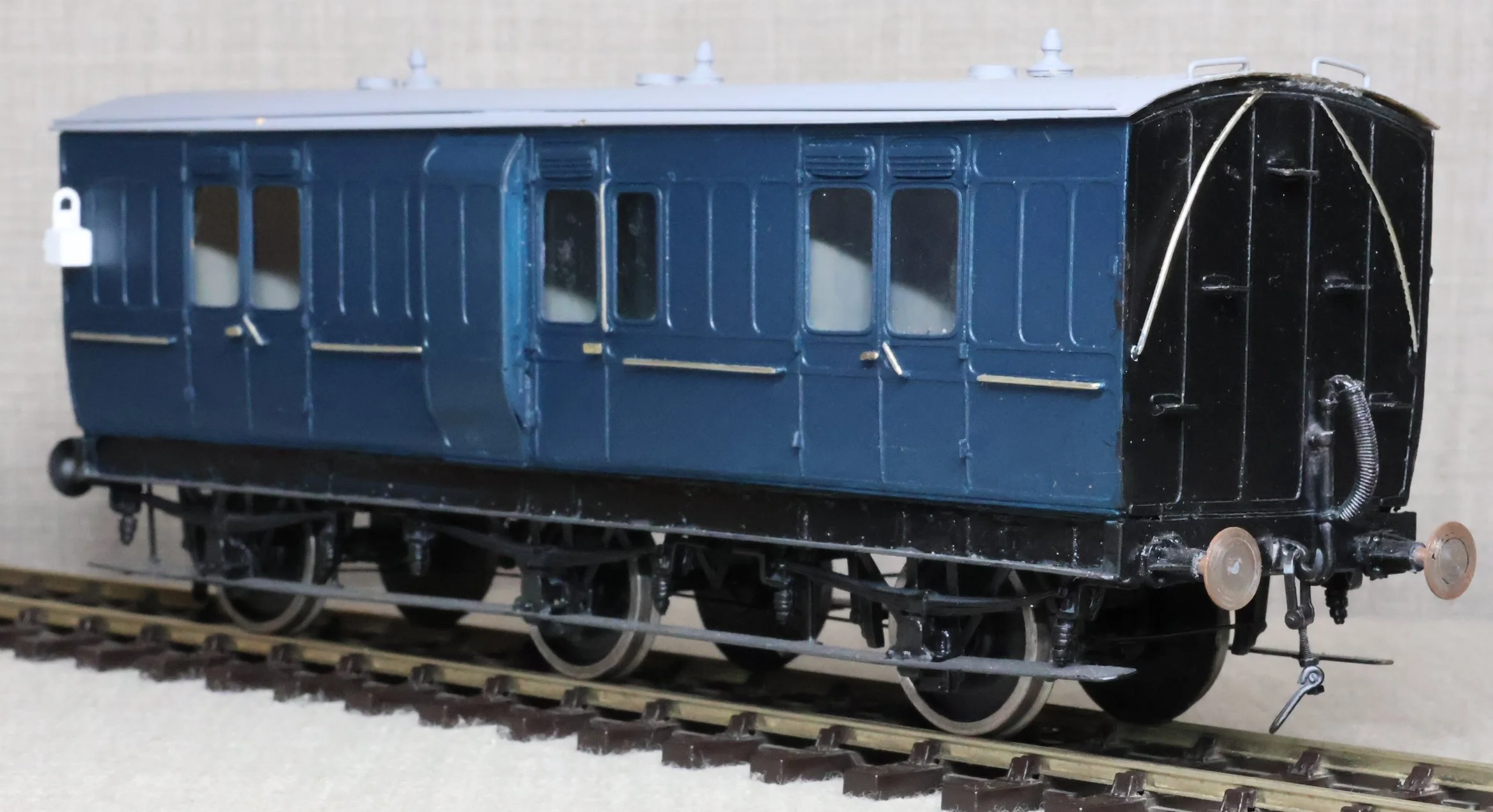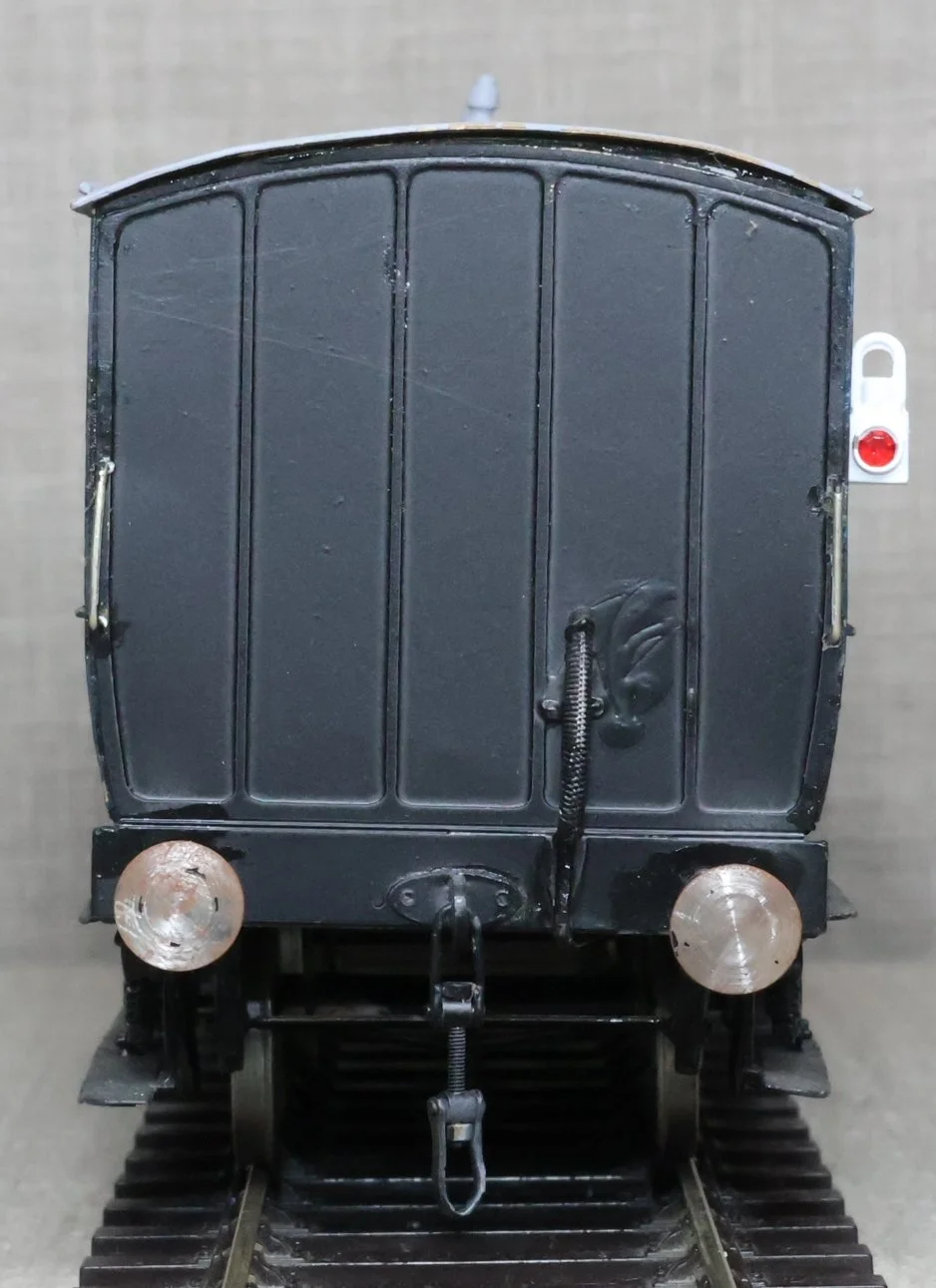 CRP20. GWR (probably) 6-wheel Full Brake/Luggage Van, Un-numbered. This is in Somerset & Dorset Railway blue livery without insignia but looks to be to a GWR prototype. This is from a brass kit and has had medium use. RESERVED.