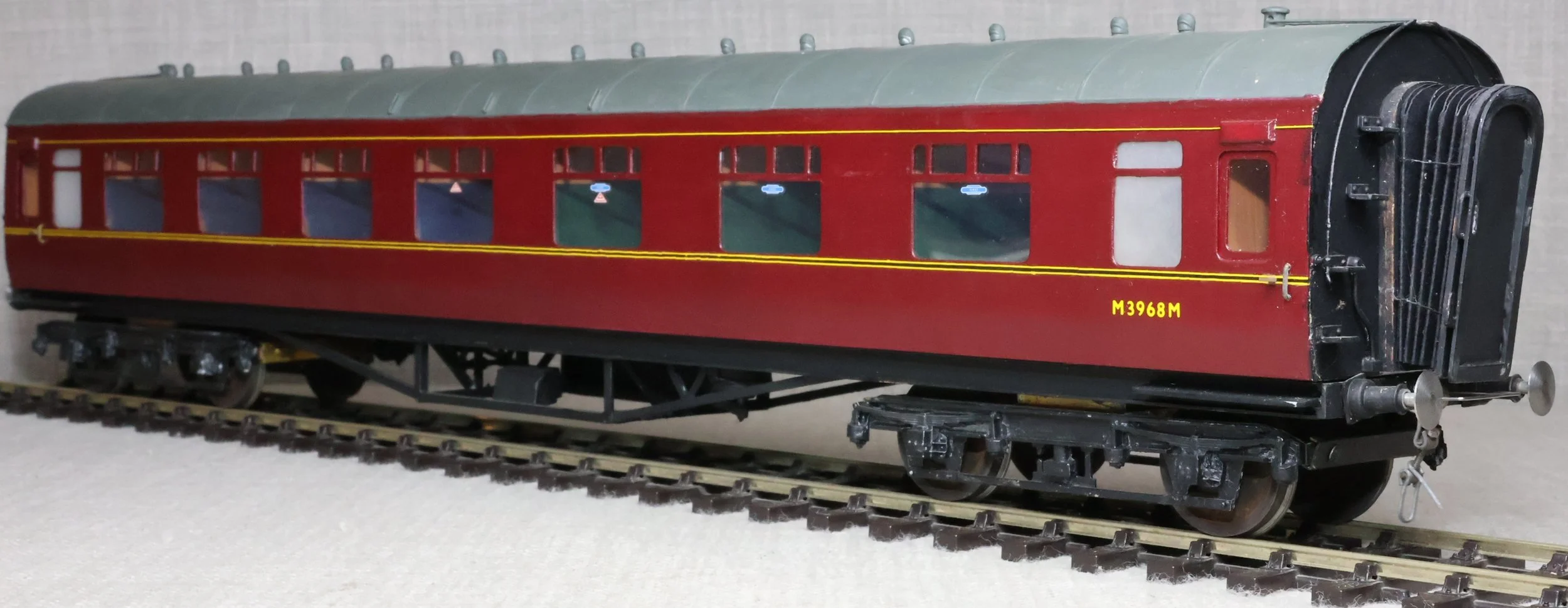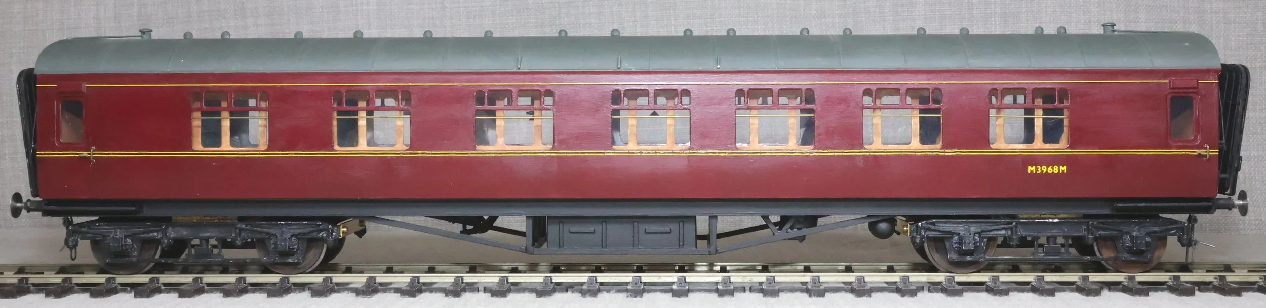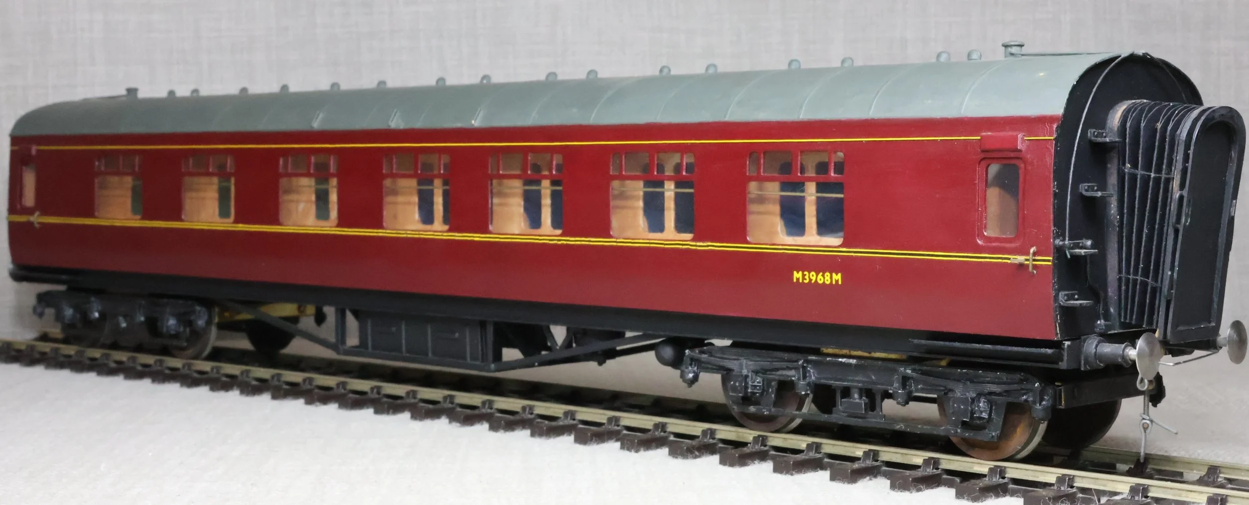 CSKD20. BR ex-LMS Stanier 60ft Corridor Composite No. M3968M. In BR Maroon livery. From a Westdale or similar metal kit running on Wayoh brass and whitemetal bogies with steel wheels fitted. This is a used model. The prototype was to LMS Diagram D1925 (Derby, 1935/36). £95.