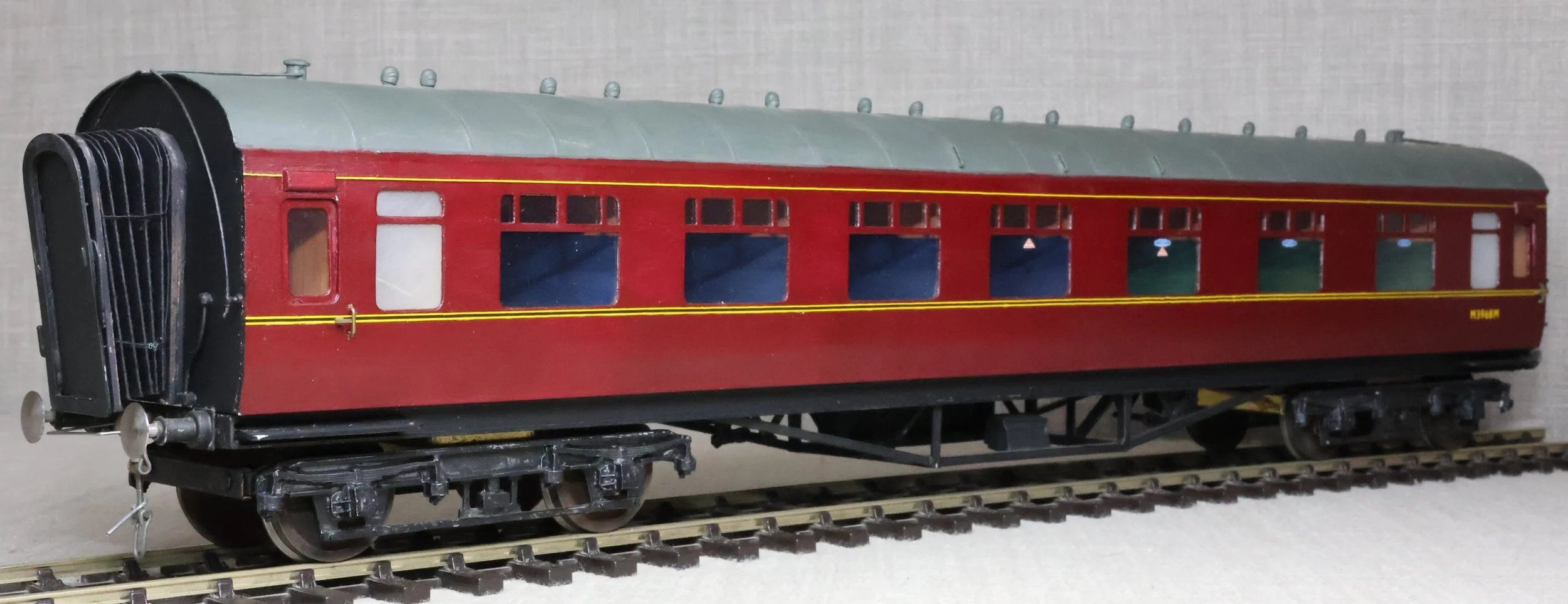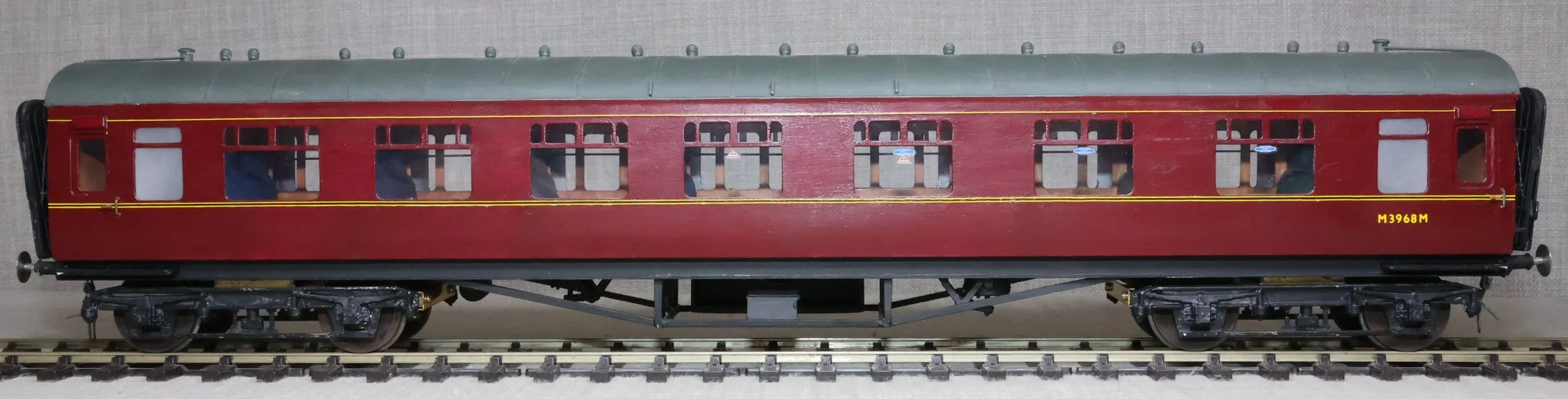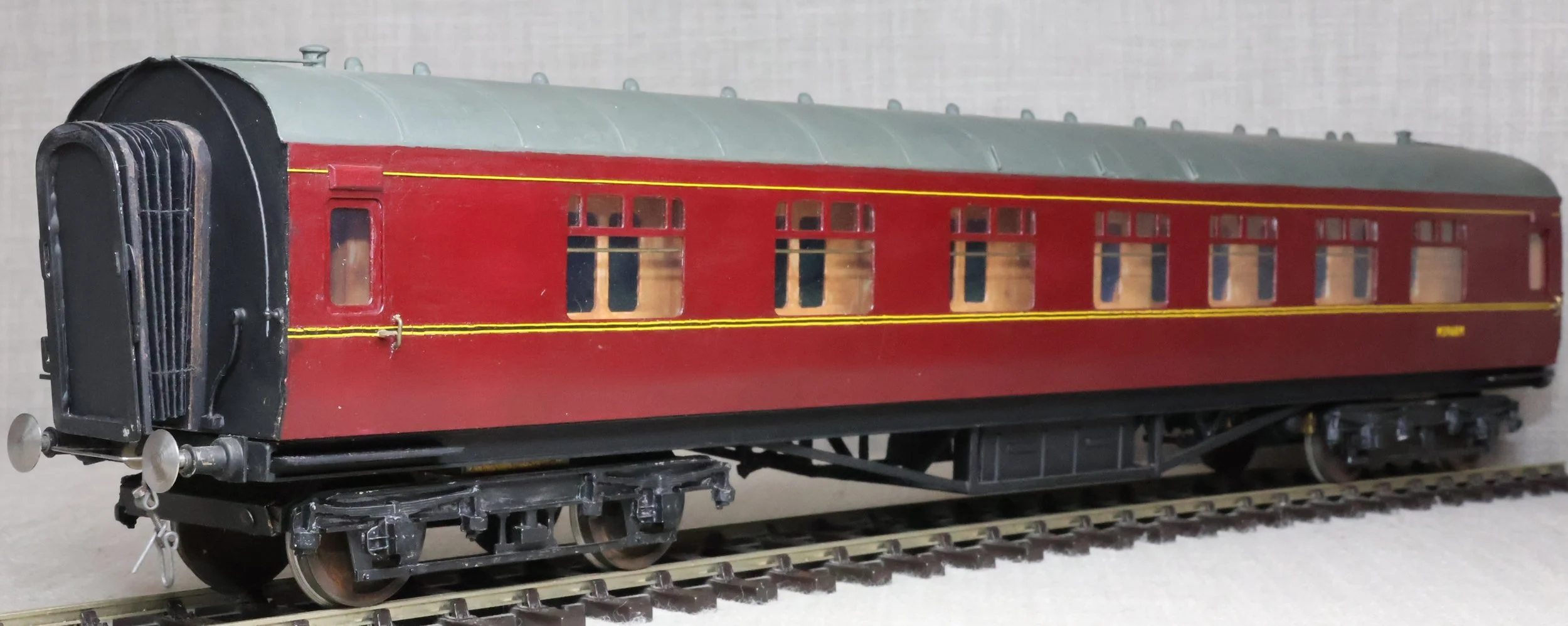 CSKD20. BR ex-LMS Stanier 60ft Corridor Composite No. M3968M. In BR Maroon livery. From a Westdale or similar metal kit running on Wayoh brass and whitemetal bogies with steel wheels fitted. This is a used model. The prototype was to LMS Diagram D1925 (Derby, 1935/36). £95.