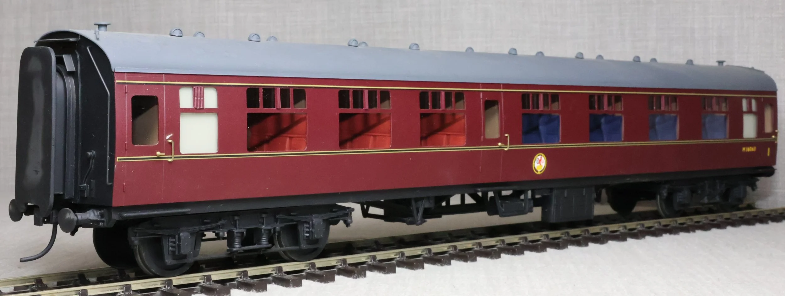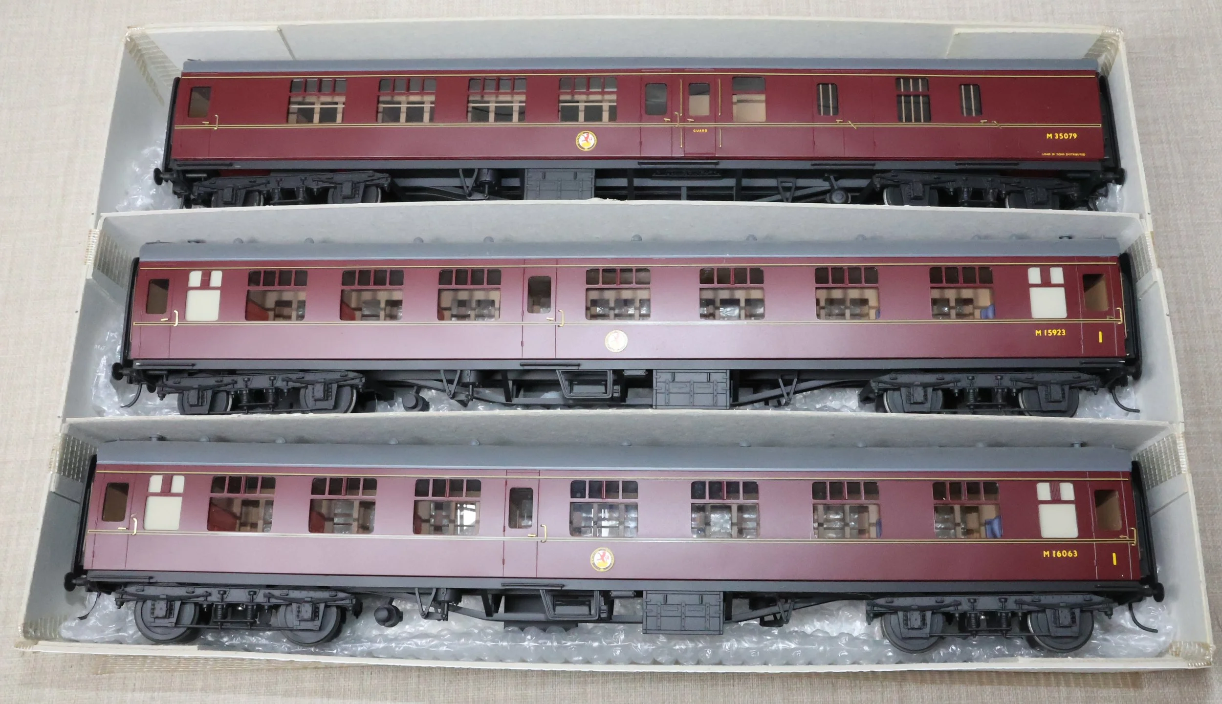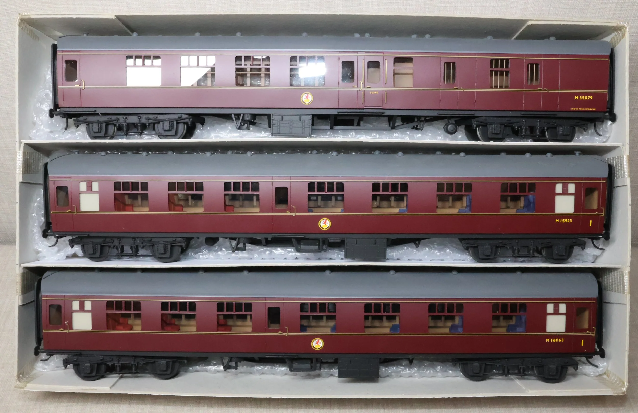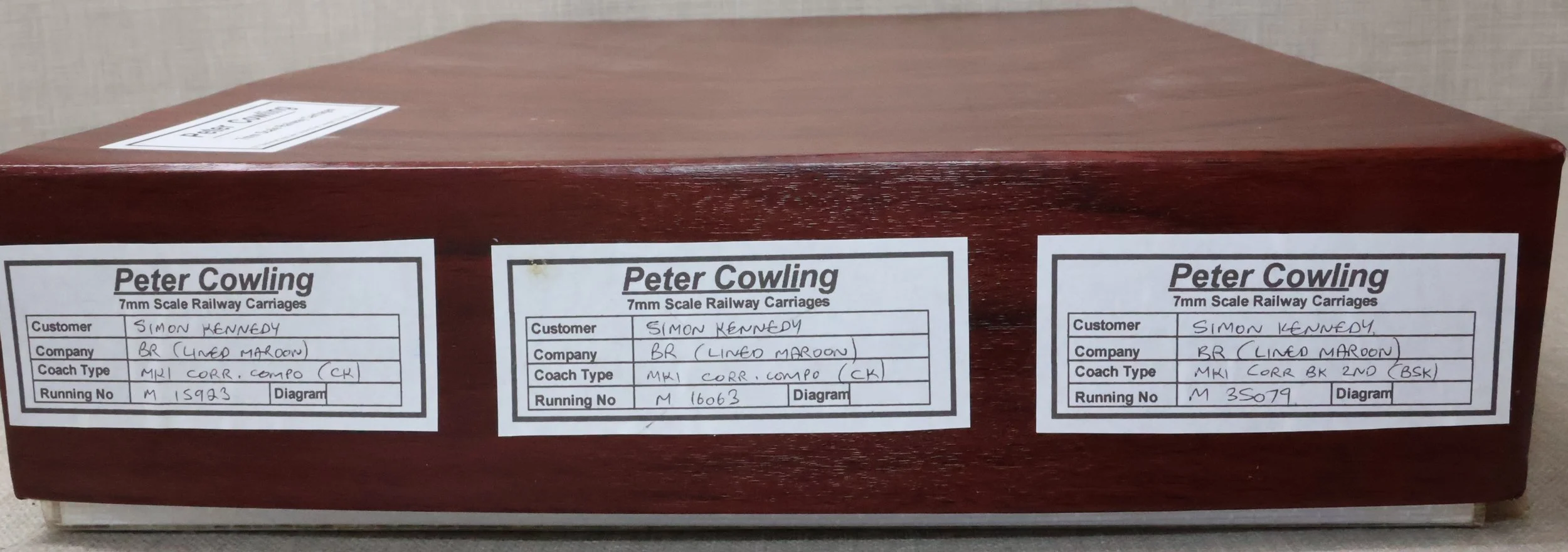 CSKD27. Set of Three BR Mk1 Corridor Coaches in BR Maroon Livery by Peter Cowling. Comprising (1) Corridor Composite (CK) No. M15923 to Diagram 126 (Wolverton, 1955). (2) Corridor Composite (CK) No. M16063 to Diagram 126 (Metropolitan Cammell, 1957). (3) Corridor Brake Second (BSK) No. M35079 to Diagram 181 (Gloucester Railway Carriage & Wagon Co, 1957). These are supplied in their original Peter Cowling box and have Kadee couplings fitted on the buffer beams. The models are lightly used. £450 for the Set of Three Coaches.