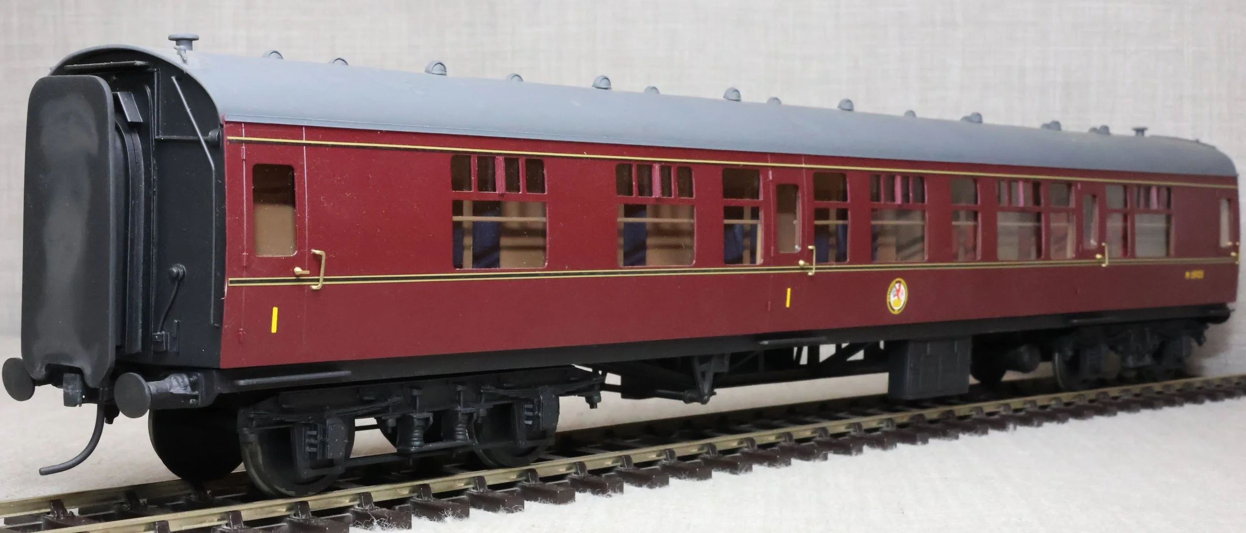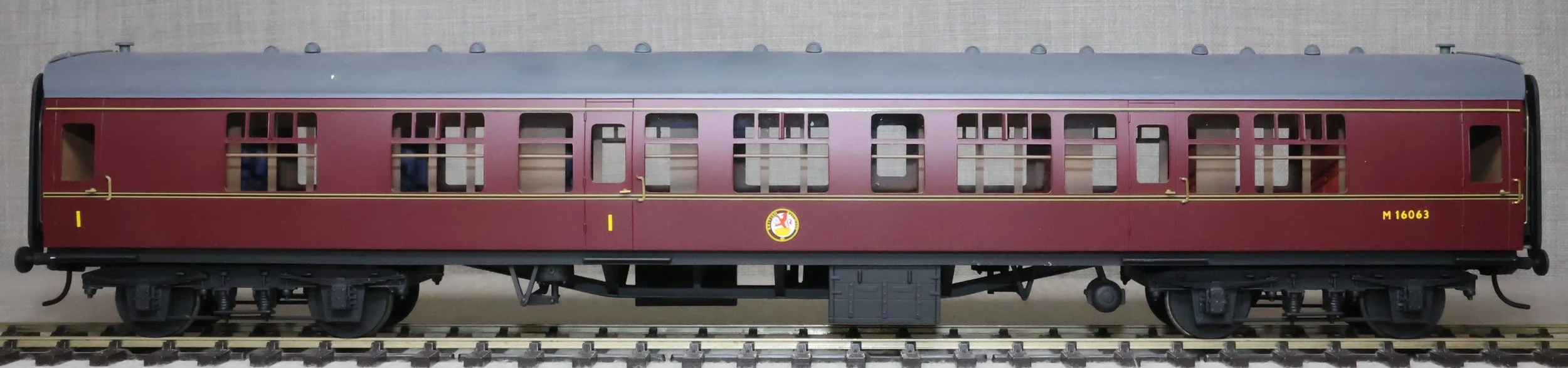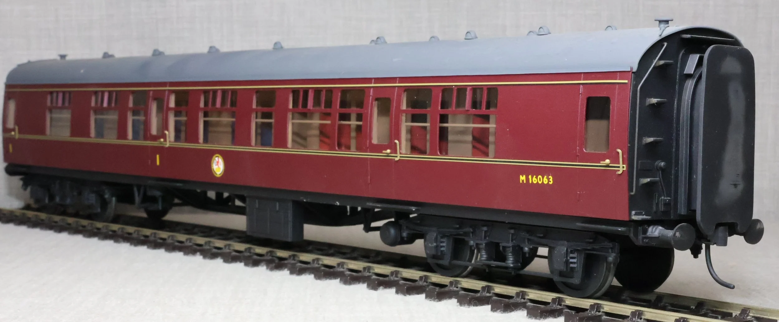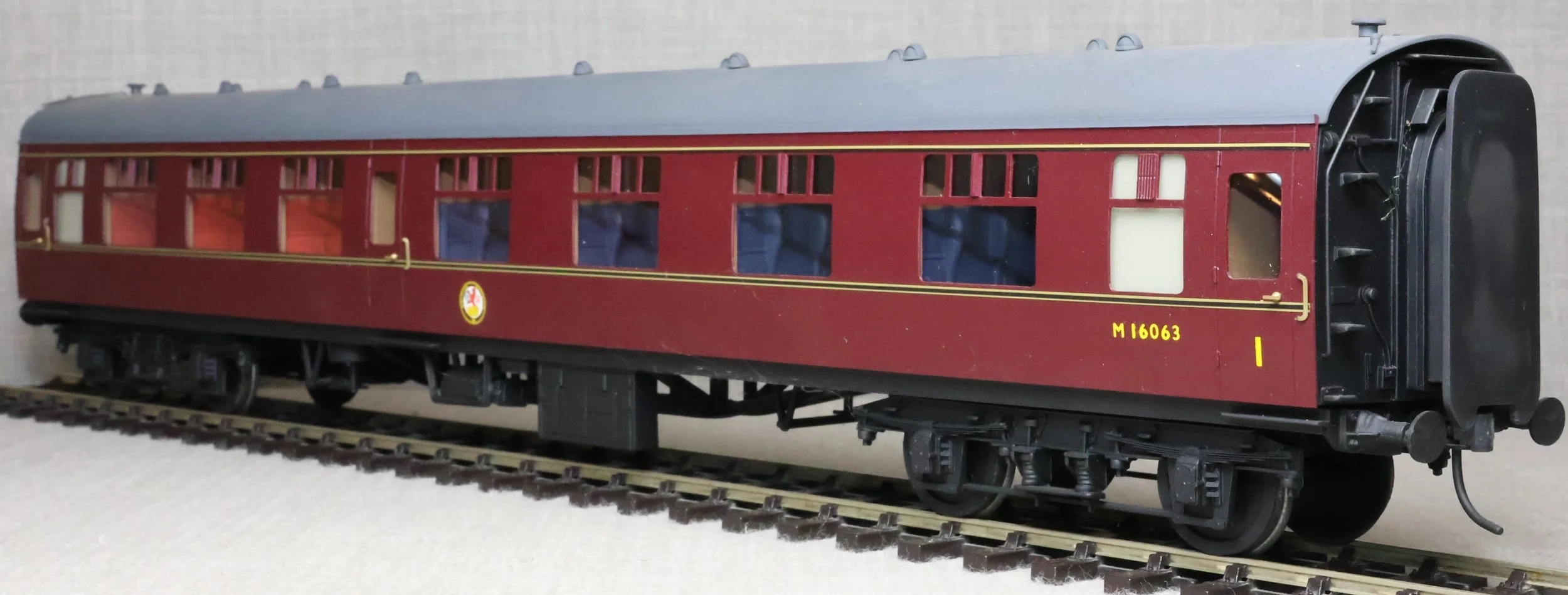 CSKD27. Set of Three BR Mk1 Corridor Coaches in BR Maroon Livery by Peter Cowling. Comprising (1) Corridor Composite (CK) No. M15923 to Diagram 126 (Wolverton, 1955). (2) Corridor Composite (CK) No. M16063 to Diagram 126 (Metropolitan Cammell, 1957). (3) Corridor Brake Second (BSK) No. M35079 to Diagram 181 (Gloucester Railway Carriage & Wagon Co, 1957). These are supplied in their original Peter Cowling box and have Kadee couplings fitted on the buffer beams. The models are lightly used. £450 for the Set of Three Coaches.