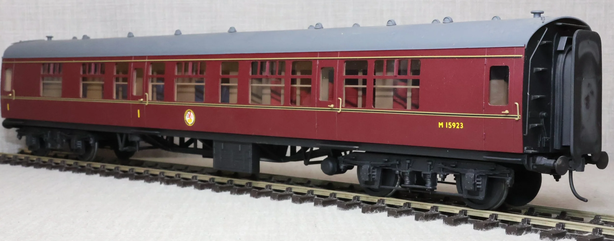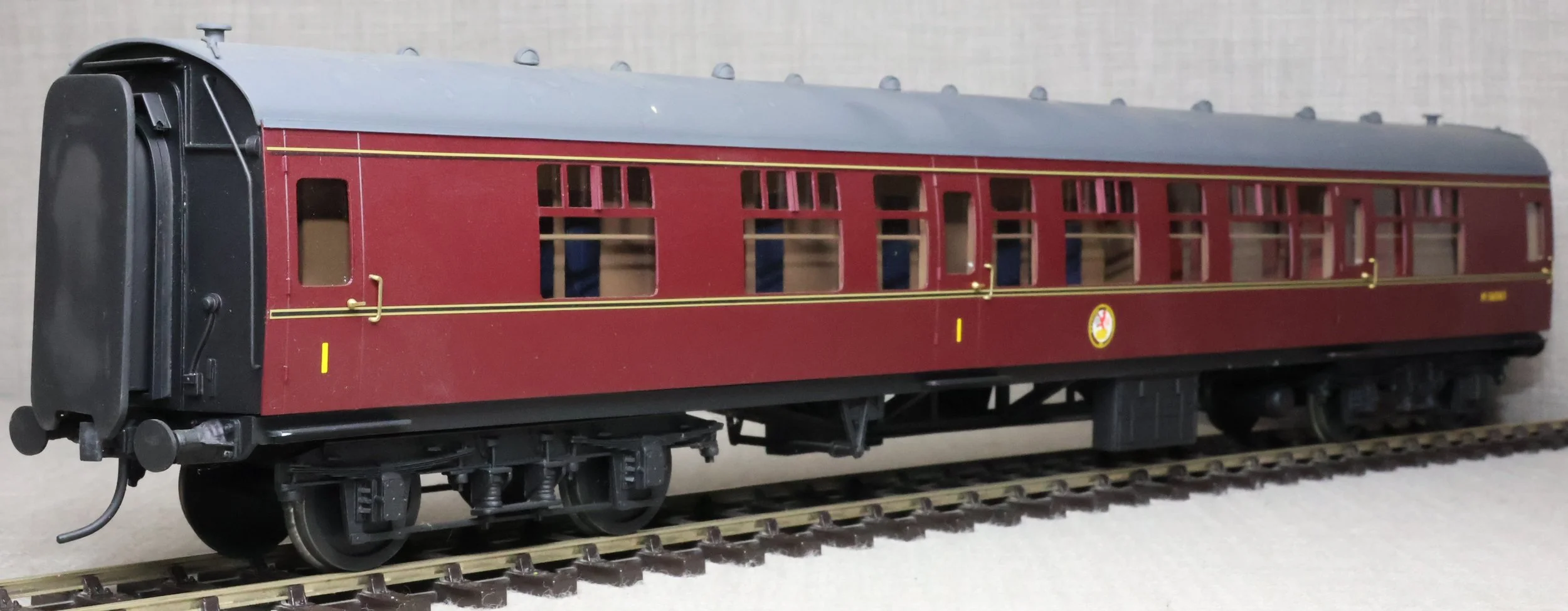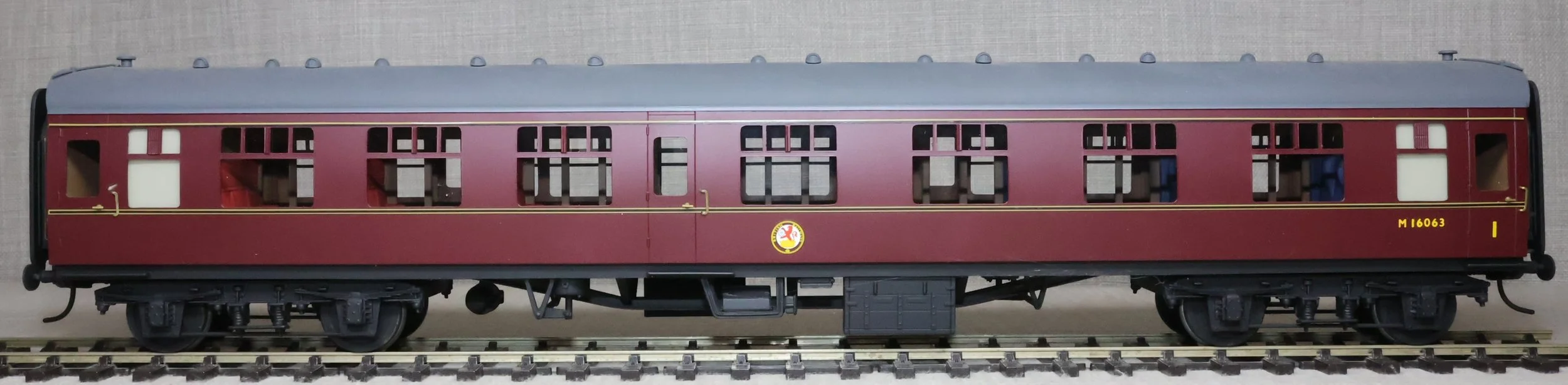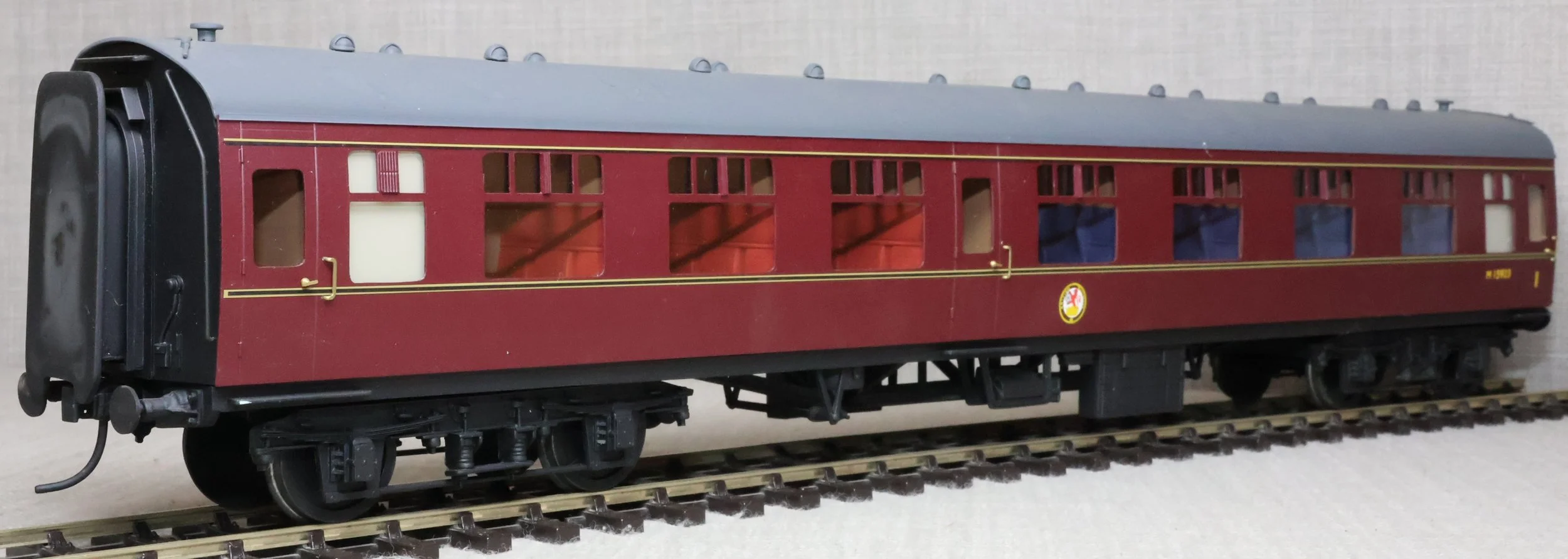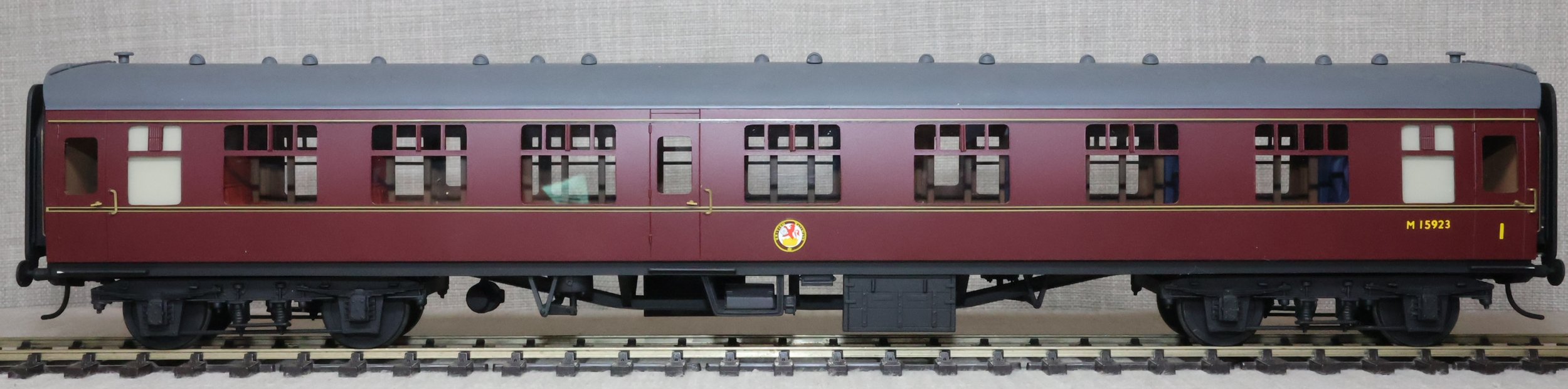 CSKD27. Set of Three BR Mk1 Corridor Coaches in BR Maroon Livery by Peter Cowling. Comprising (1) Corridor Composite (CK) No. M15923 to Diagram 126 (Wolverton, 1955). (2) Corridor Composite (CK) No. M16063 to Diagram 126 (Metropolitan Cammell, 1957). (3) Corridor Brake Second (BSK) No. M35079 to Diagram 181 (Gloucester Railway Carriage & Wagon Co, 1957). These are supplied in their original Peter Cowling box and have Kadee couplings fitted on the buffer beams. The models are lightly used. £450 for the Set of Three Coaches.