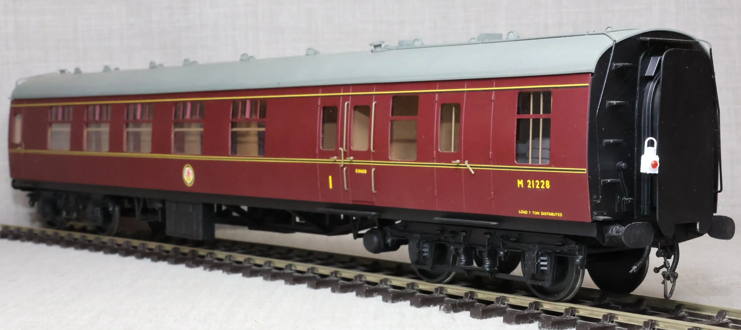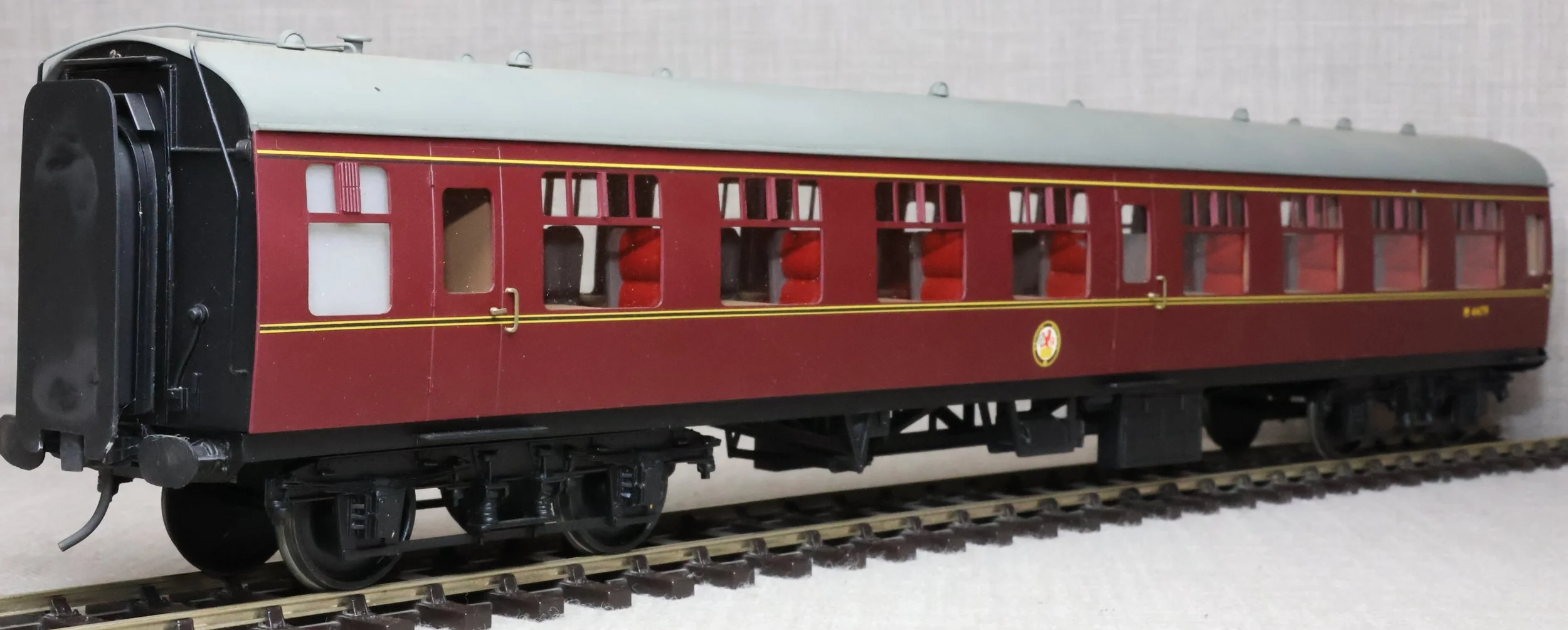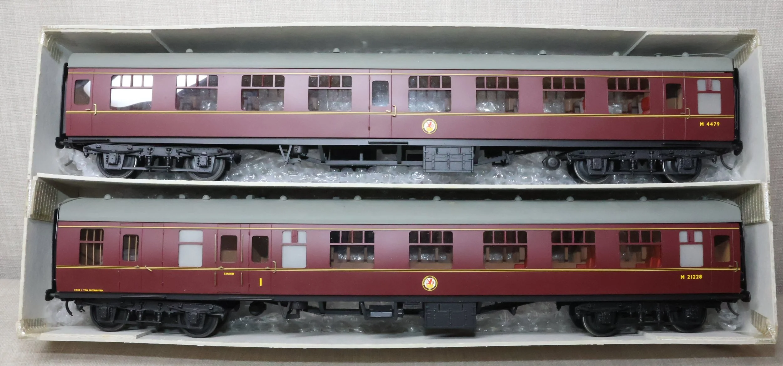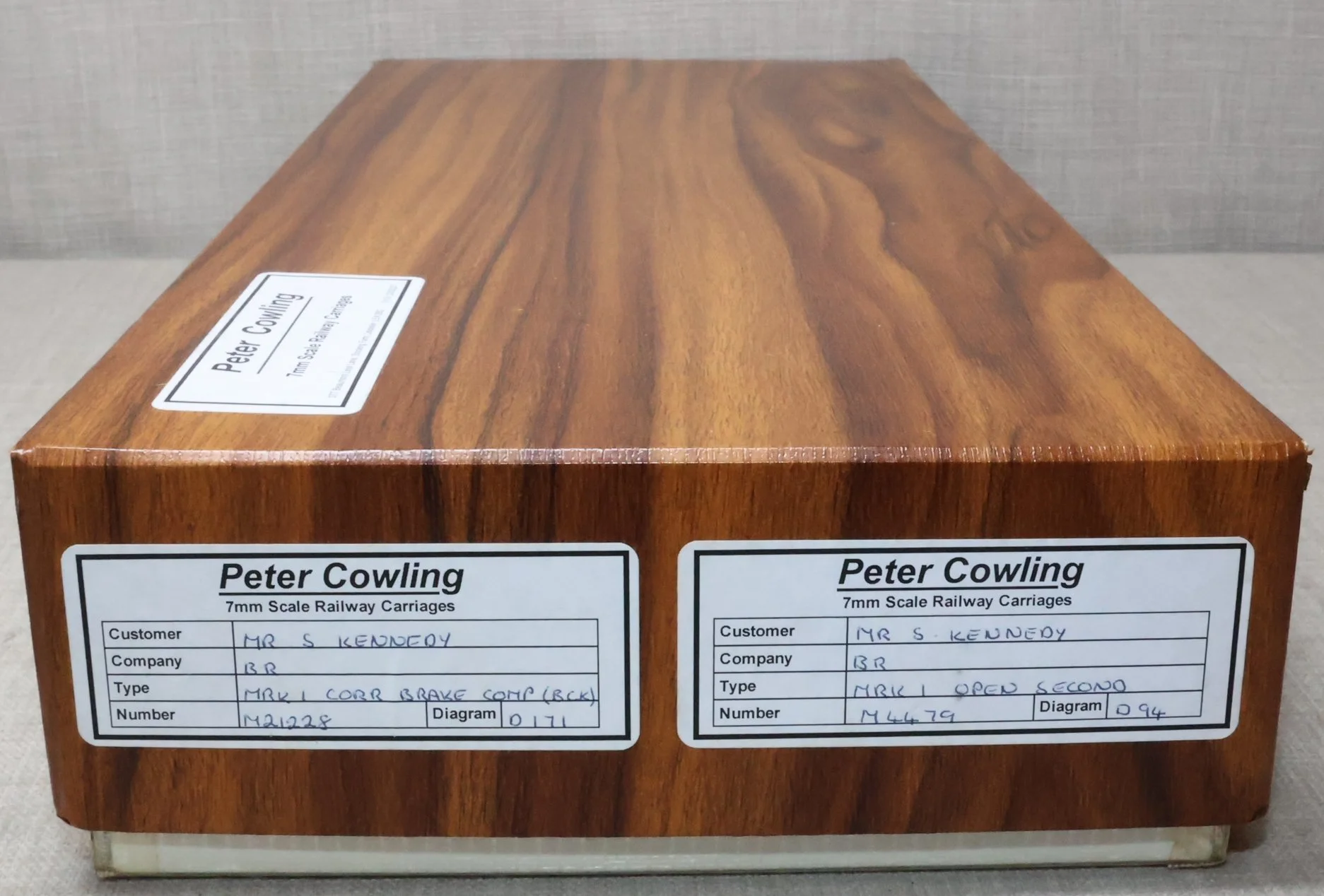 CSKD28. Pair of BR Mk1 Corridor Coaches in BR Maroon Livery by Peter Cowling. Comprising (1) Corridor Open Second No. M4479 to Diagram 94 (Birmingham Railway Carriage & Wagon Works, 1957). (2) Corridor Brake Composite No. M21228 to Diagram 171 (Charles Roberts & Co, 1959). These are supplied in their original Peter Cowling box and have Kadee couplings fitted on the buffer beams. The have had medium use and require bogie springs to be fitted. Coach M21228 has a small part loose inside. £250 for the Pair of Coaches.