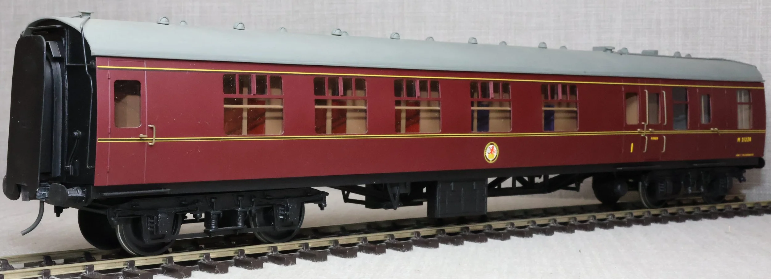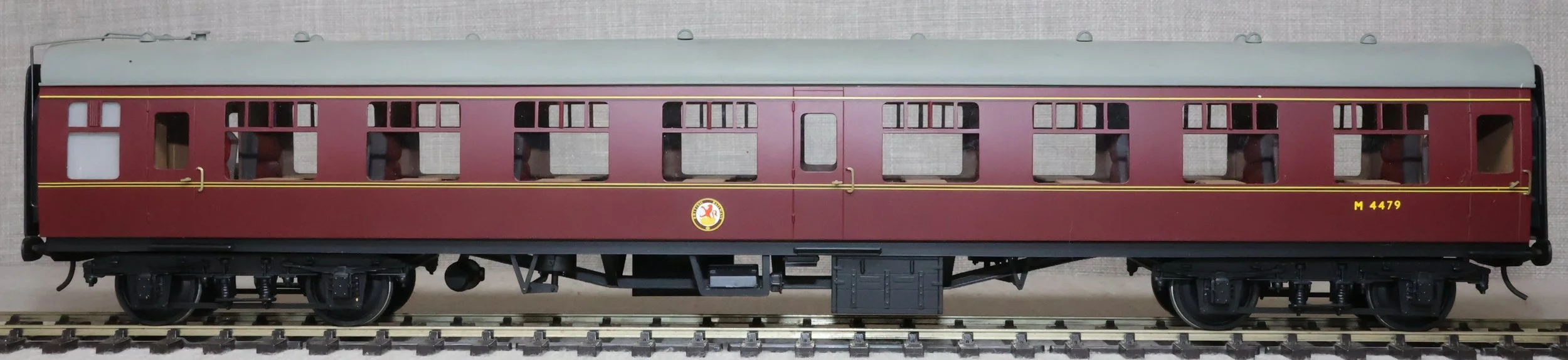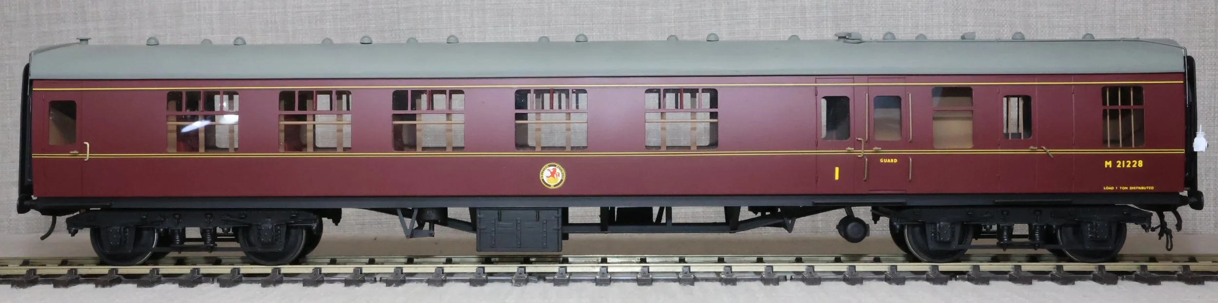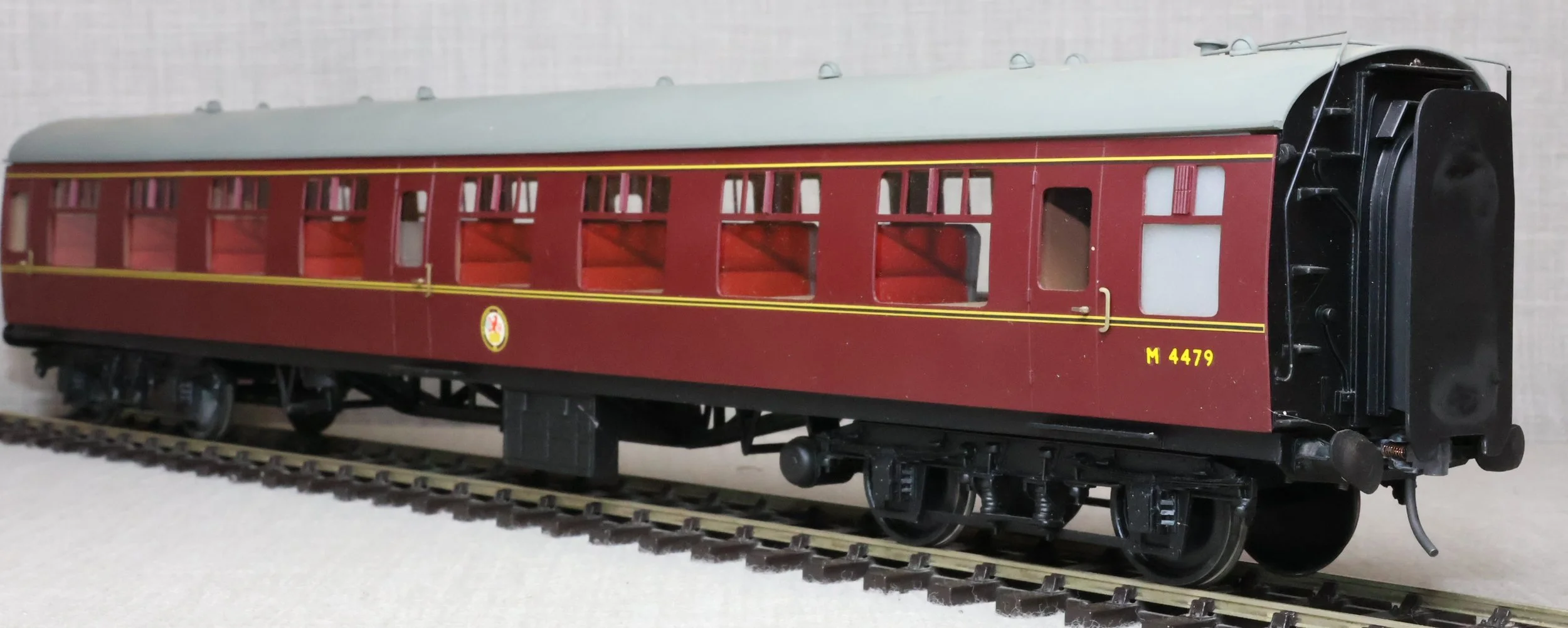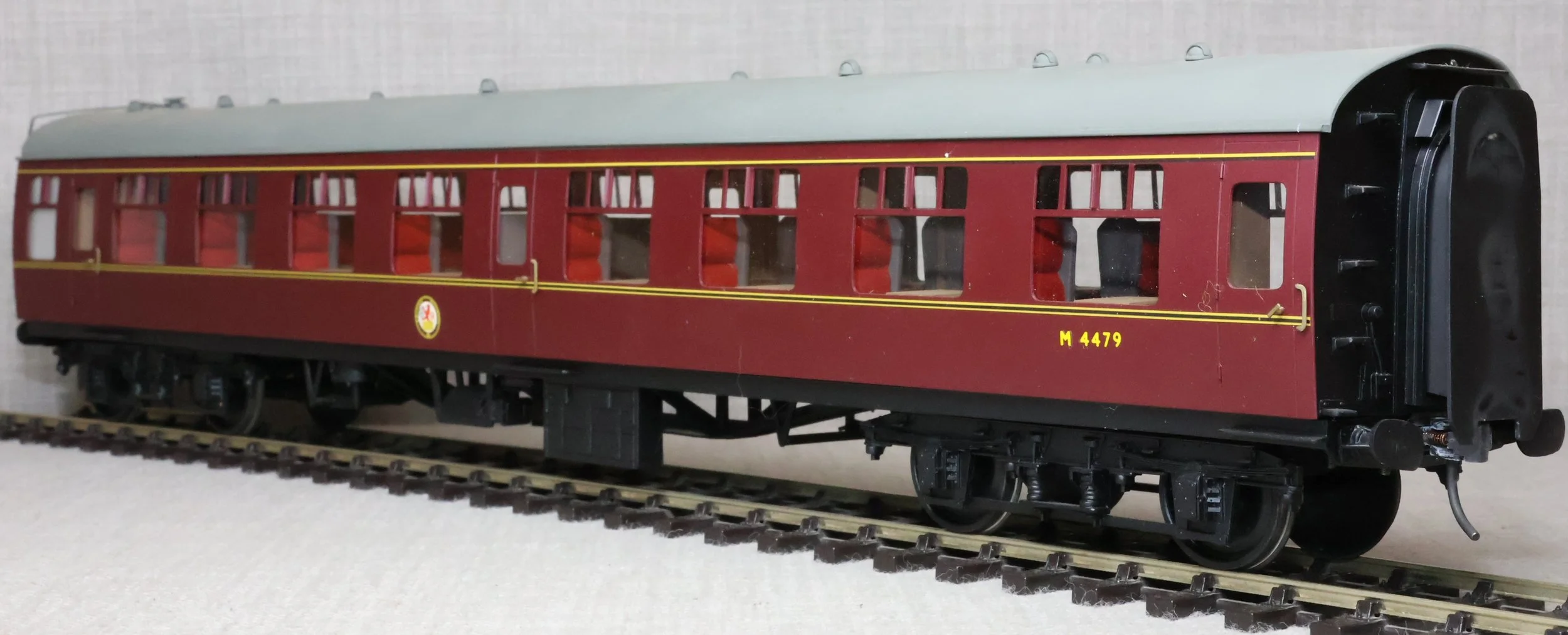 CSKD28. Pair of BR Mk1 Corridor Coaches in BR Maroon Livery by Peter Cowling. Comprising (1) Corridor Open Second No. M4479 to Diagram 94 (Birmingham Railway Carriage & Wagon Works, 1957). (2) Corridor Brake Composite No. M21228 to Diagram 171 (Charles Roberts & Co, 1959). These are supplied in their original Peter Cowling box and have Kadee couplings fitted on the buffer beams. The have had medium use and require bogie springs to be fitted. Coach M21228 has a small part loose inside. £250 for the Pair of Coaches.