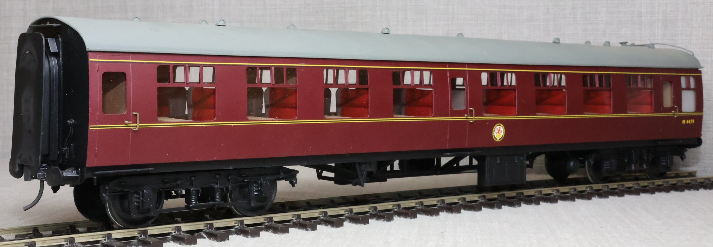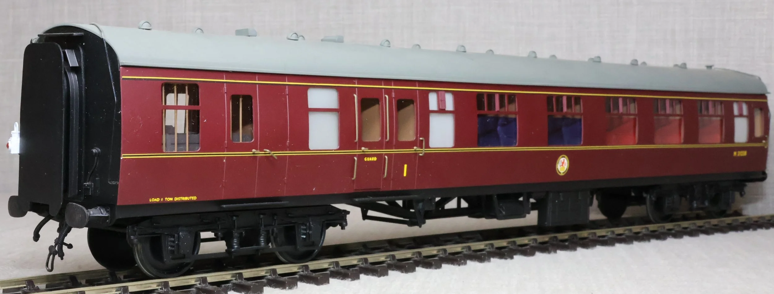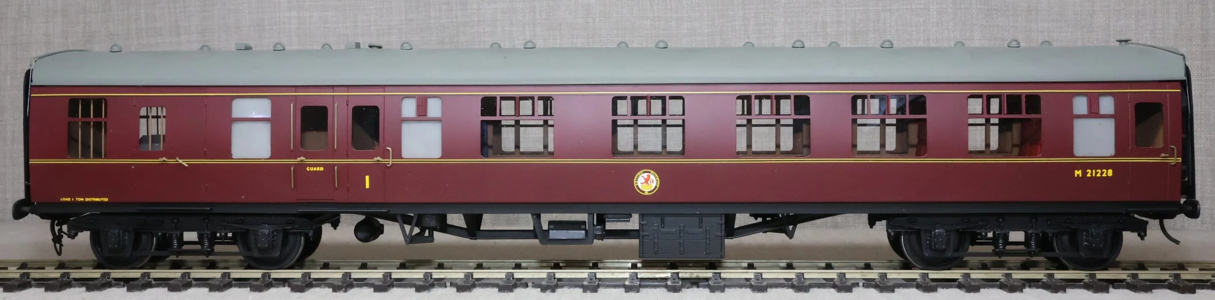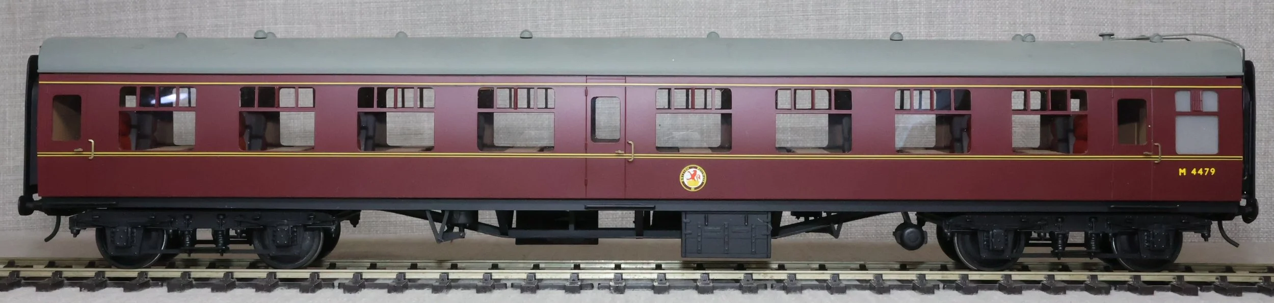 CSKD28. Pair of BR Mk1 Corridor Coaches in BR Maroon Livery by Peter Cowling. Comprising (1) Corridor Open Second No. M4479 to Diagram 94 (Birmingham Railway Carriage & Wagon Works, 1957). (2) Corridor Brake Composite No. M21228 to Diagram 171 (Charles Roberts & Co, 1959). These are supplied in their original Peter Cowling box and have Kadee couplings fitted on the buffer beams. The have had medium use and require bogie springs to be fitted. Coach M21228 has a small part loose inside. £250 for the Pair of Coaches.