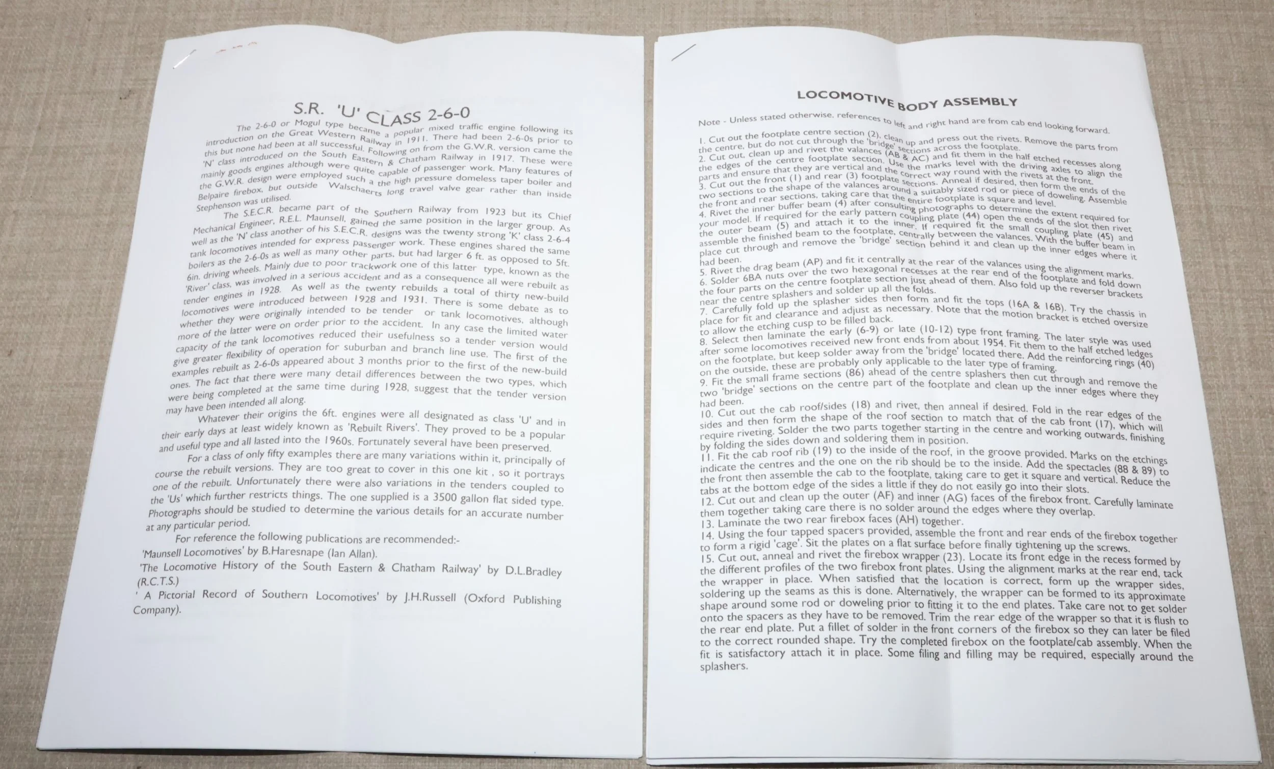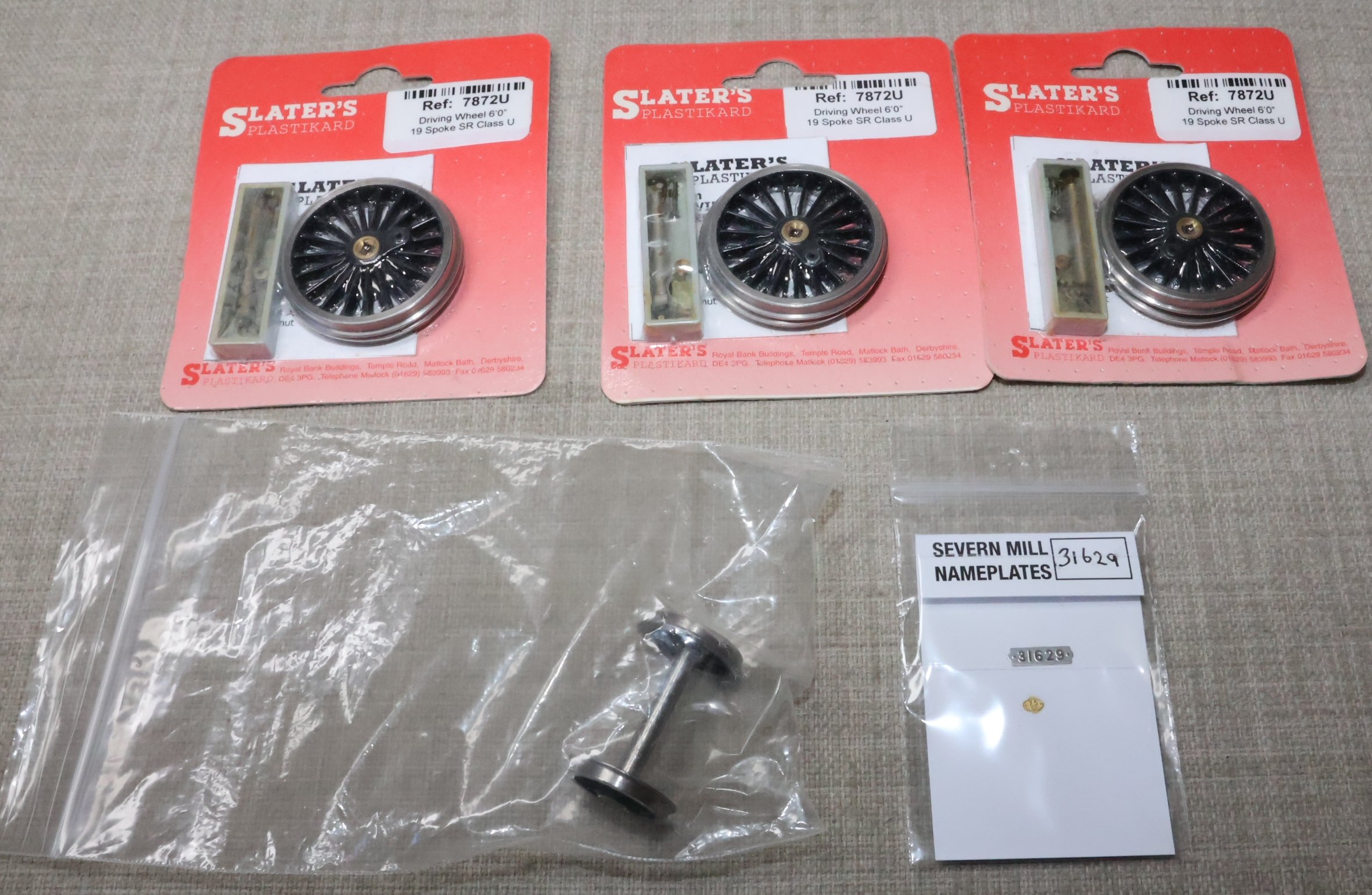 KRS04. David Andrews Kit for a SR/BR 'U' Class 'Mogul' 2-6-0 and 3500G Tender. With instructions, Slaters bogie wheels and driving wheels, and Severn Mill numberplates for No. 31629 with shedplate 75C. No tender wheels, motor or gearbox. As a pre-owned kit I am unable to give a guarantee of completeness and the contents have not been checked. £500.