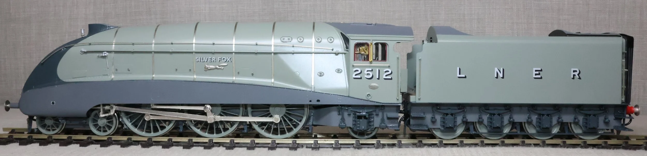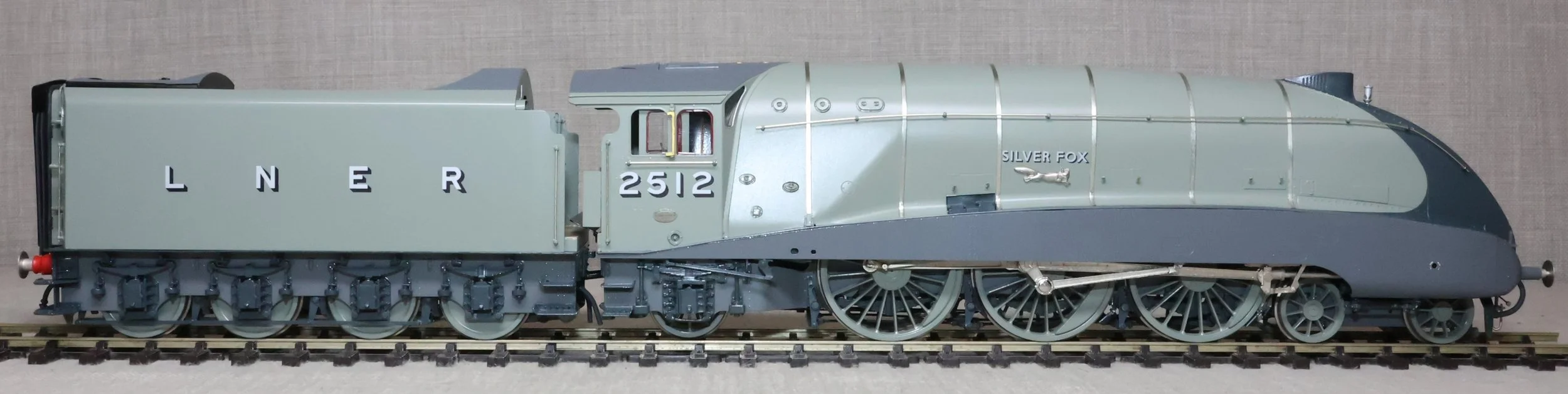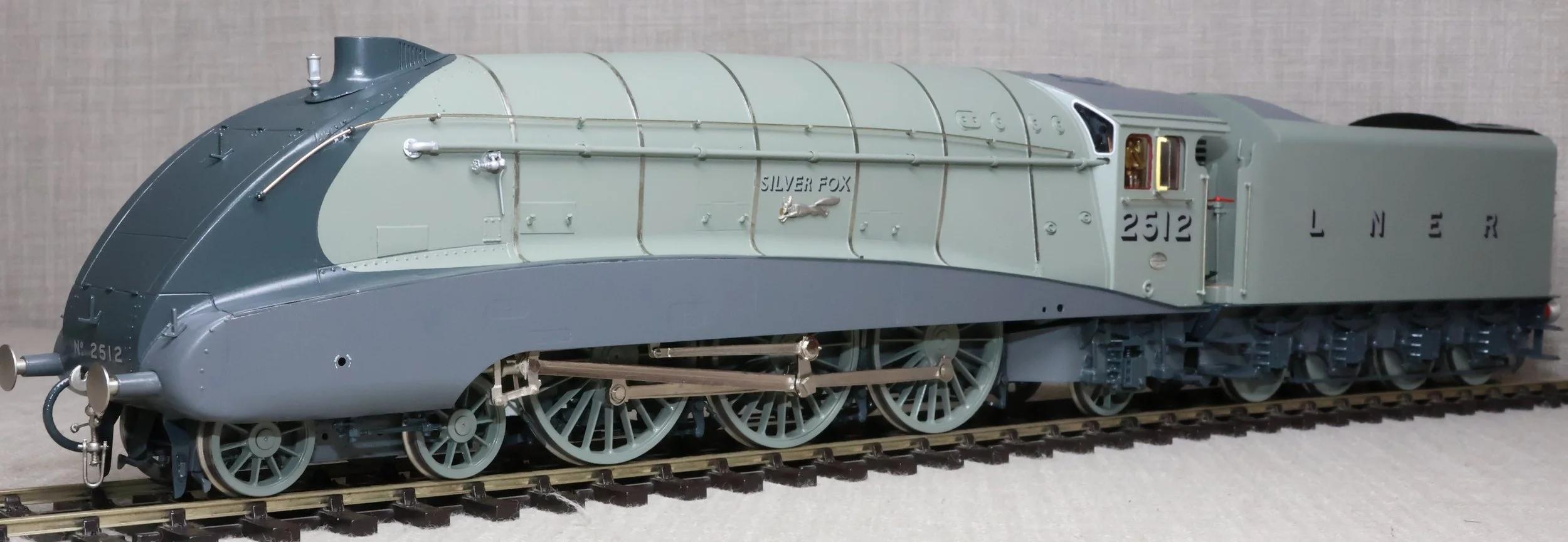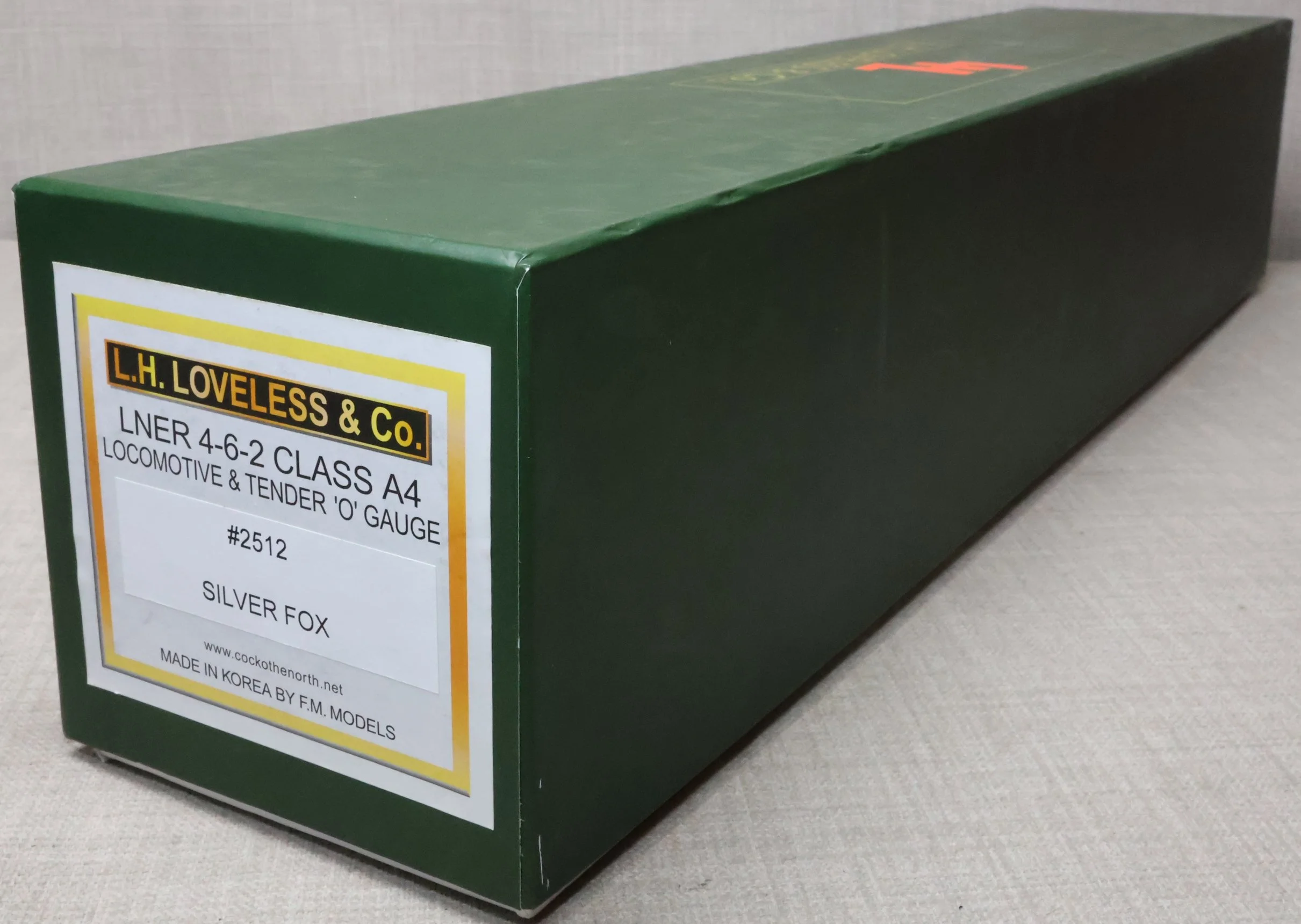 LGD06. LNER Gresley Class A4 Pacific 4-6-2 and Tender No. 2512 ‘Silver Fox’. Paired with a corridor tender and in the two-tone grey streamlined livery used from 1937 to 1942. This is a brass model by F.M. Models of Korea for L.H. Loveless and is fitted with all their usual refinements including working inside motion, opening smokebox door, and superb cab detail. This is a DC model which has been very lightly used as a display model and is supplied in its original inner and outer boxes with unused accessories. The prototype was into service from Doncaster Works to Kings Cross in December 1935 as one of the initial four A4’s for the LNER's new ‘Silver Jubilee’ service. It was renumbered to No. 17 in the LNER 1946 renumbering scheme thence becoming BR No. 60017. It was withdrawn from New England (Peterborough) in October 1963 having been a Kings Cross loco for almost all of its life. £2250.