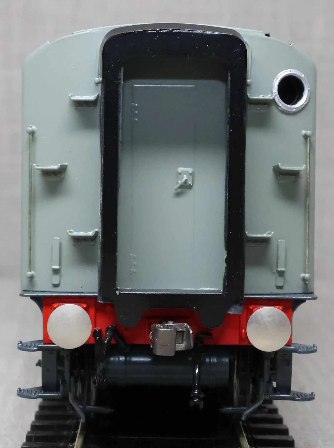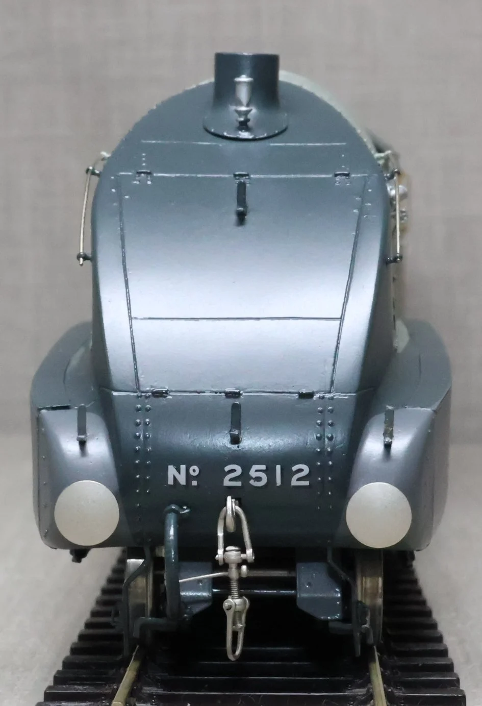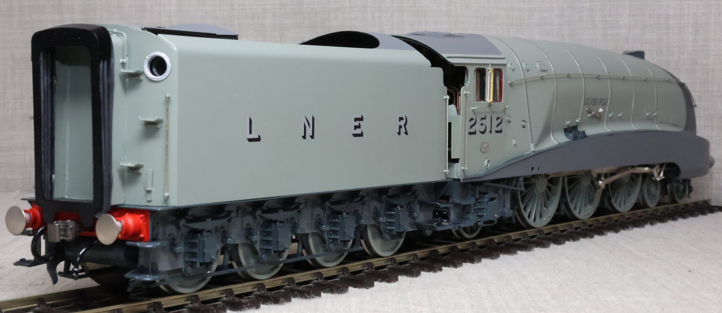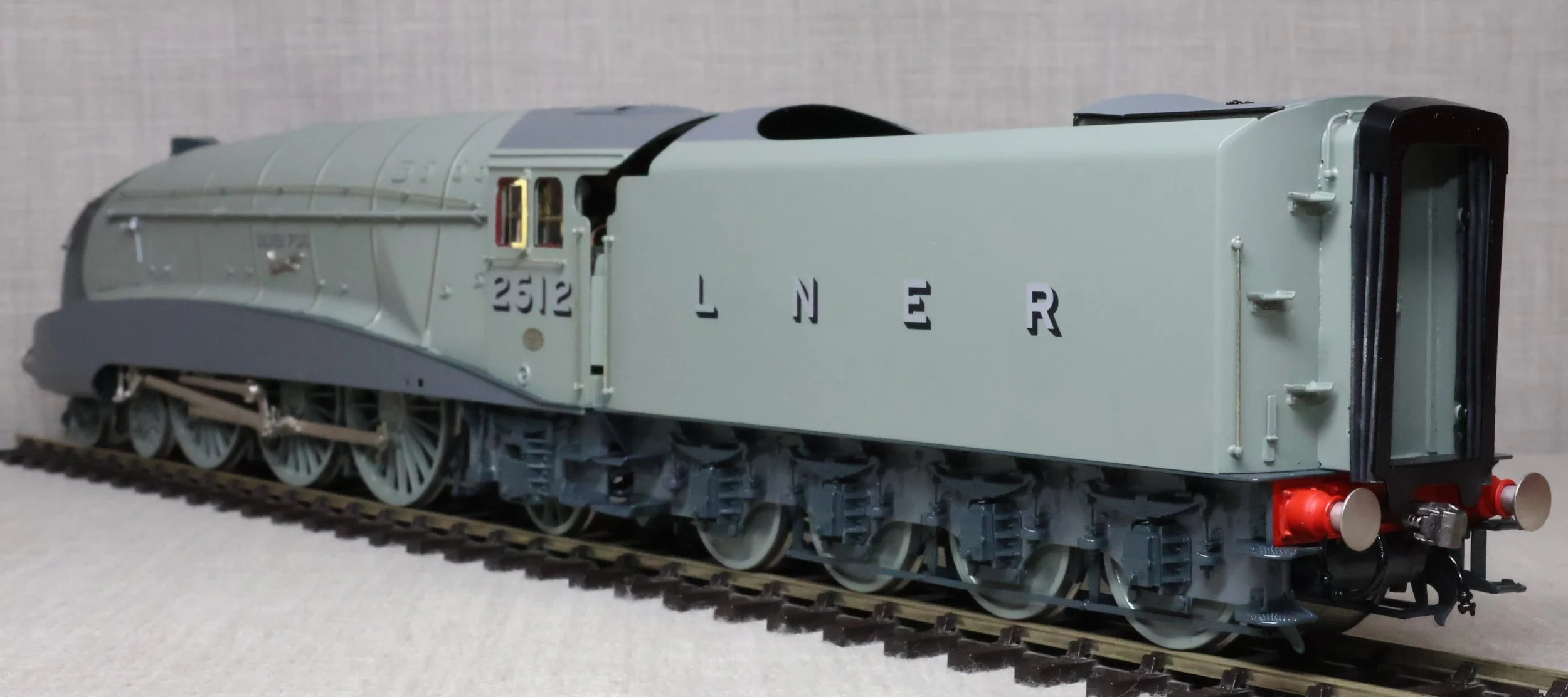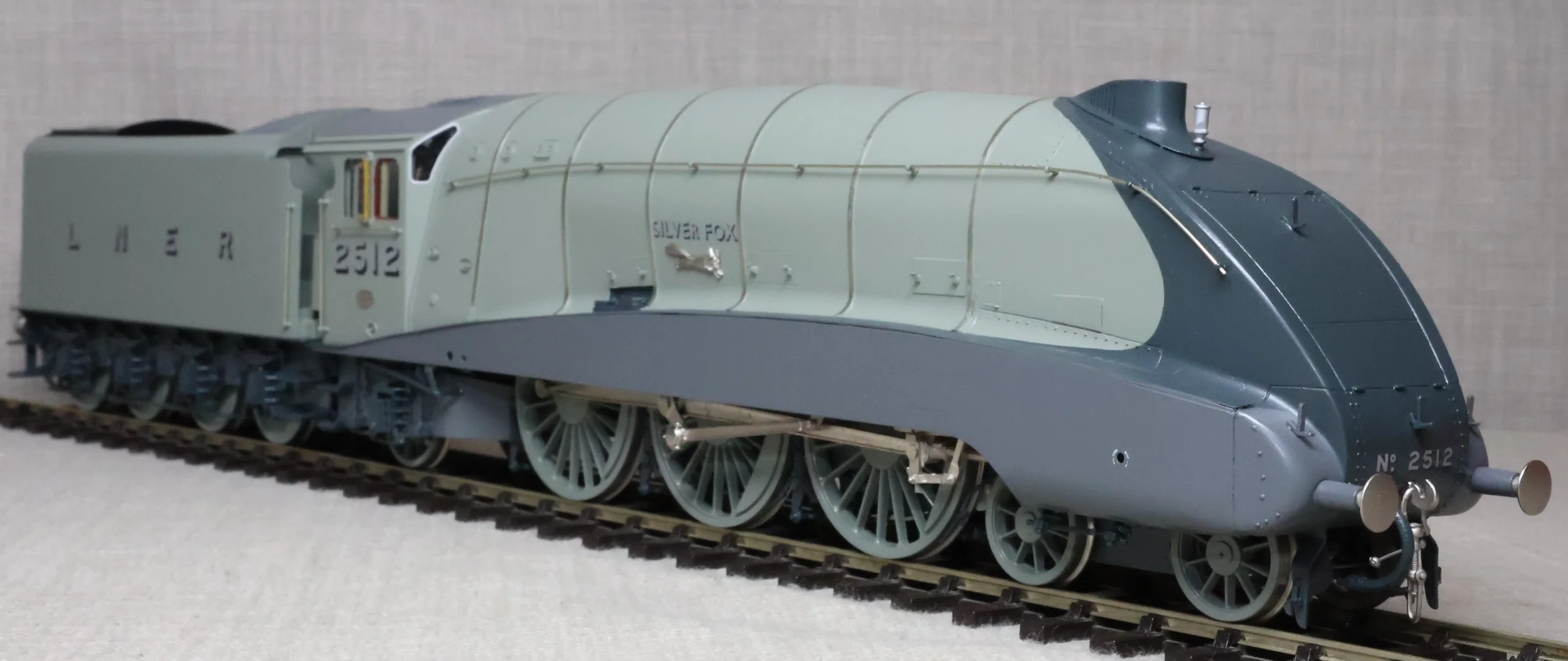 LGD06. LNER Gresley Class A4 Pacific 4-6-2 and Tender No. 2512 ‘Silver Fox’. Paired with a corridor tender and in the two-tone grey streamlined livery used from 1937 to 1942. This is a brass model by F.M. Models of Korea for L.H. Loveless and is fitted with all their usual refinements including working inside motion, opening smokebox door, and superb cab detail. This is a DC model which has been very lightly used as a display model and is supplied in its original inner and outer boxes with unused accessories. The prototype was into service from Doncaster Works to Kings Cross in December 1935 as one of the initial four A4’s for the LNER's new ‘Silver Jubilee’ service. It was renumbered to No. 17 in the LNER 1946 renumbering scheme thence becoming BR No. 60017. It was withdrawn from New England (Peterborough) in October 1963 having been a Kings Cross loco for almost all of its life. £2250.