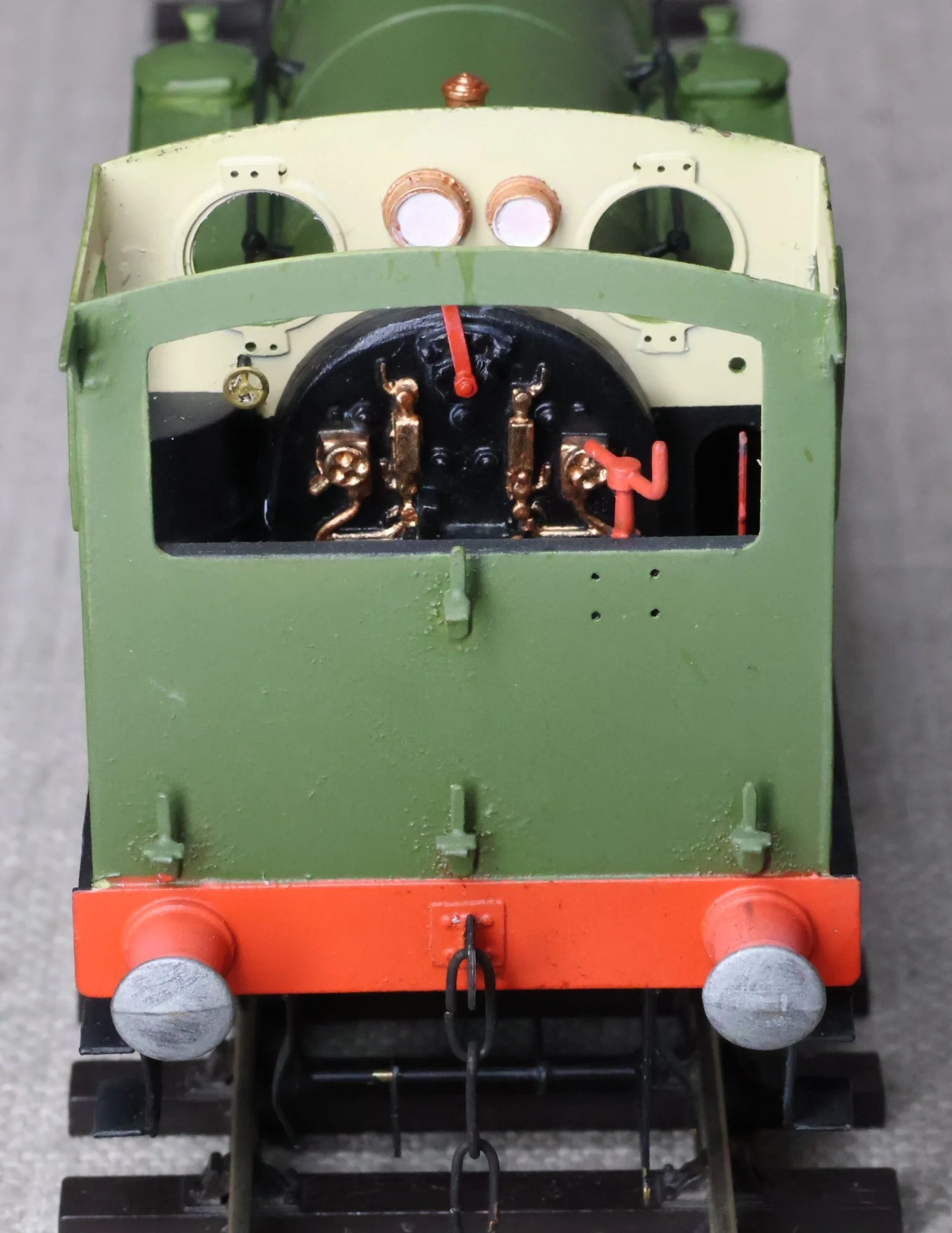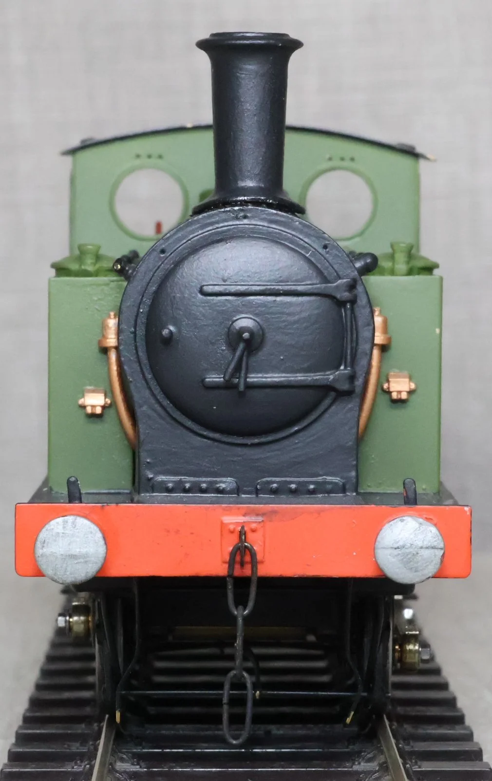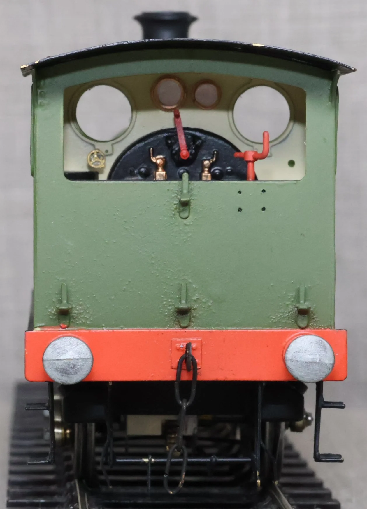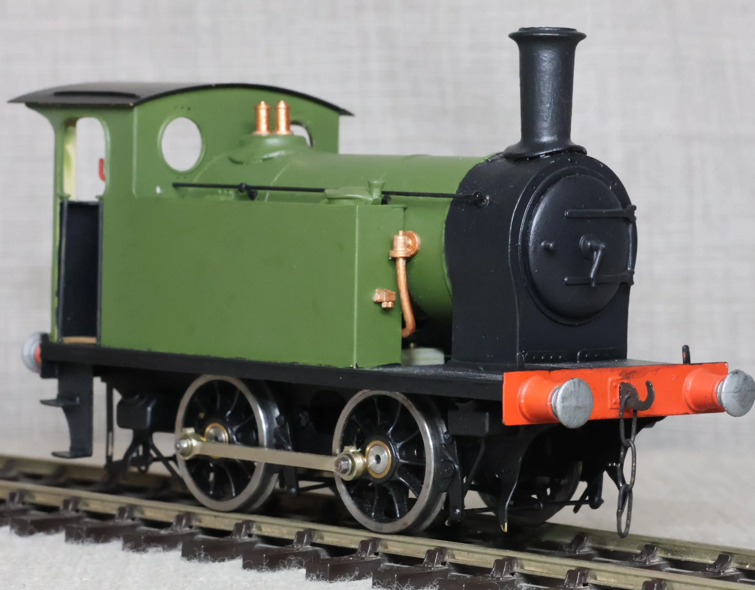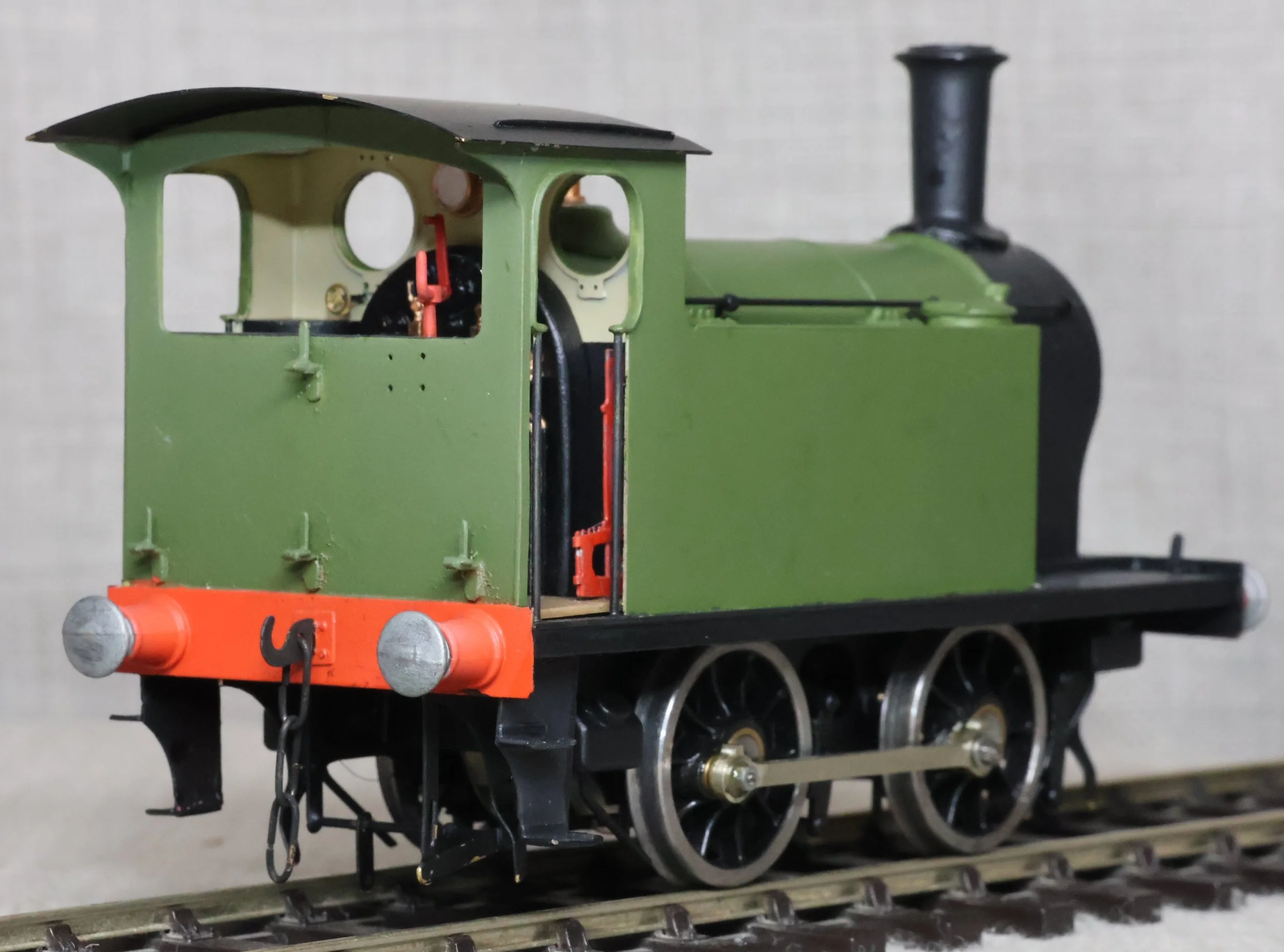 LJMA99. Unknown 0-4-0 Tank Loco, Un-numbered. A little similar in outline to a London & South Western Railway 0-4-0 Dock Shunter Class B4 but not the same (this model has inside cylinders, is lacking a dome, and has an overhanging cab rear). (Update from Luke - many thanks for the information - “I am pretty sure this is a NER Class H/LNER Y7 0-4-0”). This is from a brass kit and fitted with a single stage gearbox, probably Slaters wheels, and with very good cab detail. It has had medium use, the whistle is missing from the cab roof, and it is noisy in reverse but fine going forward. £150.