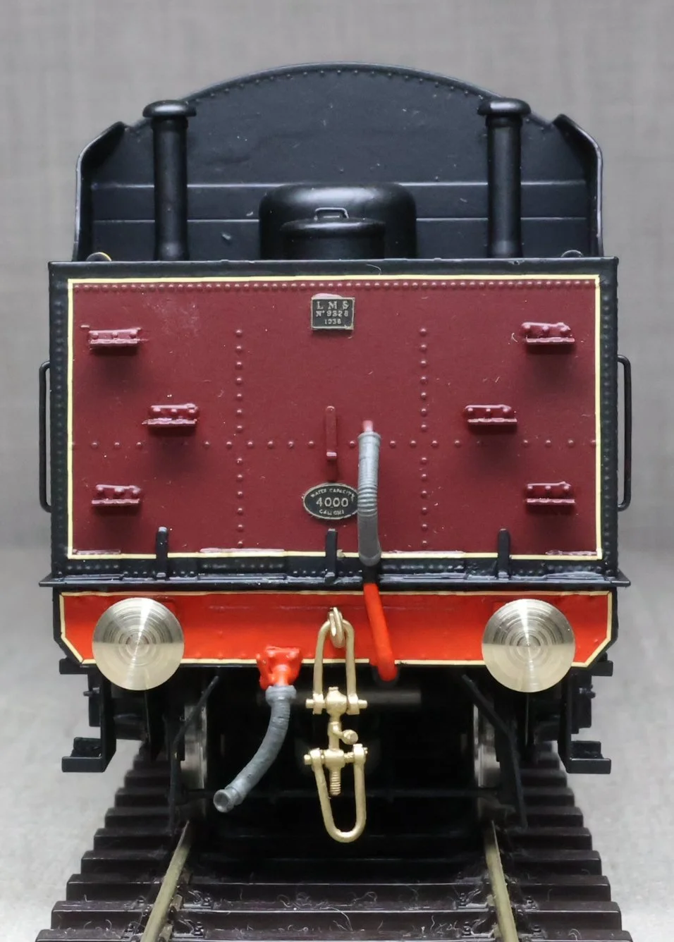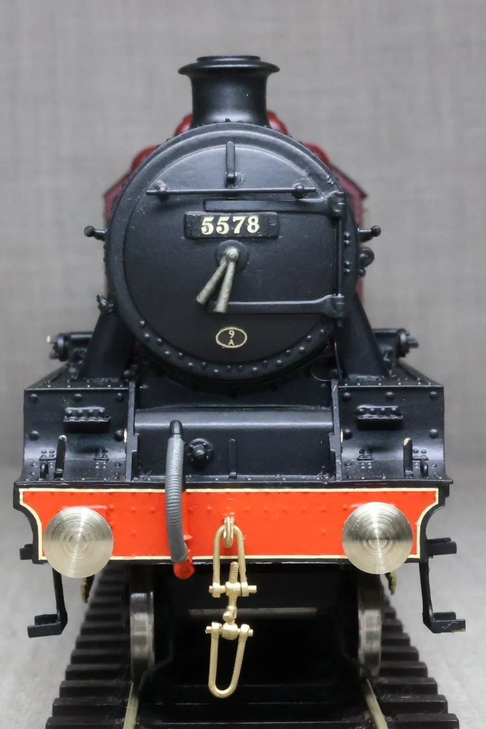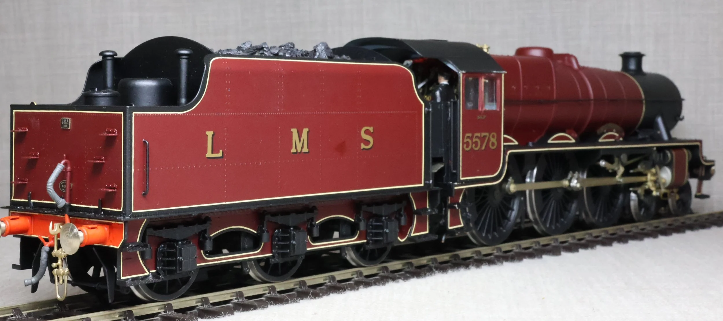 LKT02. LMS Stanier 'Jubilee' Class 4-6-0 and Tender No. 5578 'United Provinces'. In lined LMS maroon livery with shedplate 9A Longsight (Manchester). This is from a DJH Limited Edition whitemetal and brass kit built and painted by Peter Callon and fitted with a Portescap motor/gearbox, Slaters wheels, and with excellent cab detail and crew. The model is lightly used and is supplied in its original DJH box with build instructions. Note that the motor is wired postiive to negative so 'forward' on the controller is 'reverse' and vice versa. The prototype was into service from the North British Locomotive Company, Glasgow, in September 1934 as LMS No. 5578. It was at Carlisle Kingmoor by February 1936 and sometime between then and January 1948 it moved to Crewe North and probably had a spell at Longsight in-between. Its BR life as No. 45578 was at Longsight, Crewe North, Carlisle Upperby, Liverpool Edge Hill and its last allocation was Newton Heath (Manchester) where it spent just over 2 years up to withdrawal in May 1964. £850.