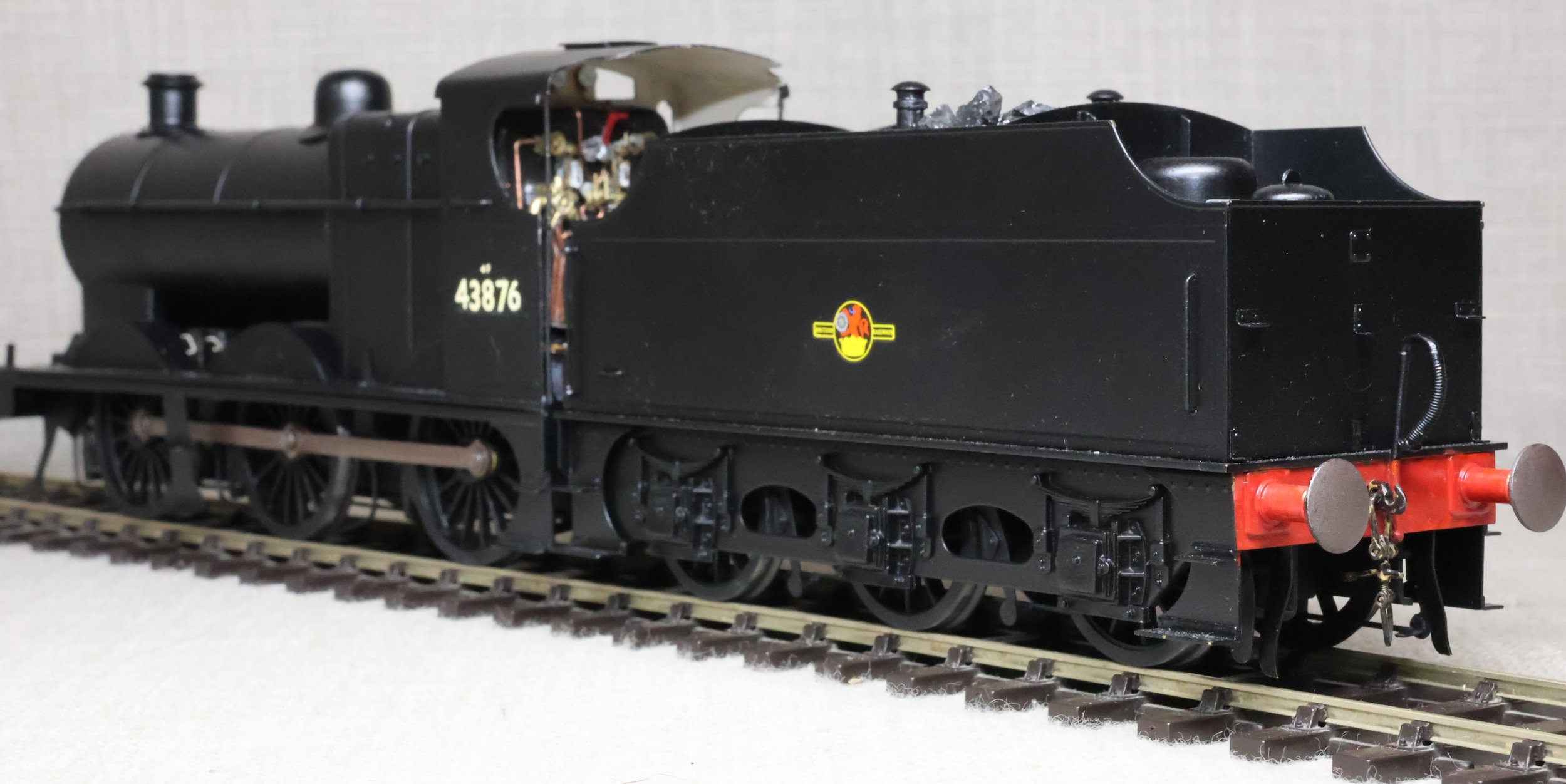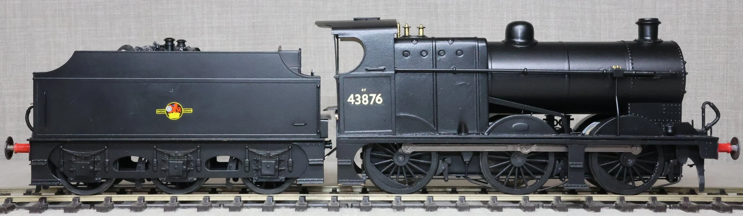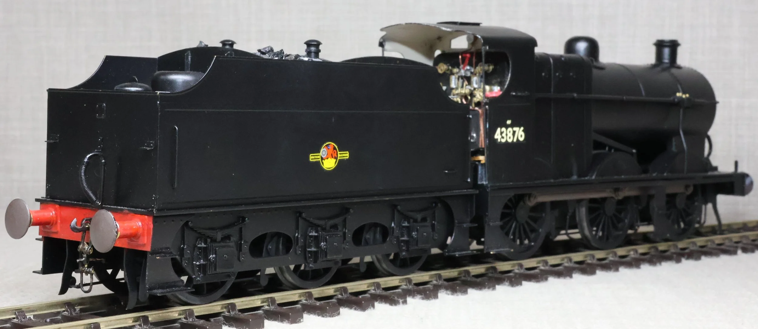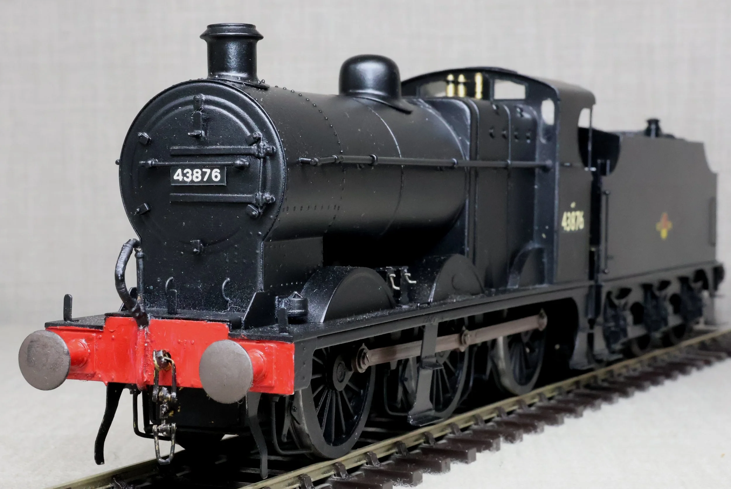 LJJ01. BR ex-LMS ex-Midland Railway Fowler '4F' 0-6-0 and Tender No. 43876. In plain BR black livery with late crest. This is by Sancheng for Bachmann Brass with many detailing improvements by John Jarvis including fitting of a Canon motor coupled to a multi-stage gearbox and with much improved cab detail. It has compensation (springing) on the leading 2 loco axles and the centre tender axle. The model is lightly used, is supplied in a plain box, and a full list of the improvements made will be included with the model. The prototype was into service from Derby Works during 1918. Its BR life was spent at Wellingborough (1948), Bedford (1949 - 1958), Cricklewood East (1958 - 1959) then Coalville from where it was withdrawn in December 1962. £650.