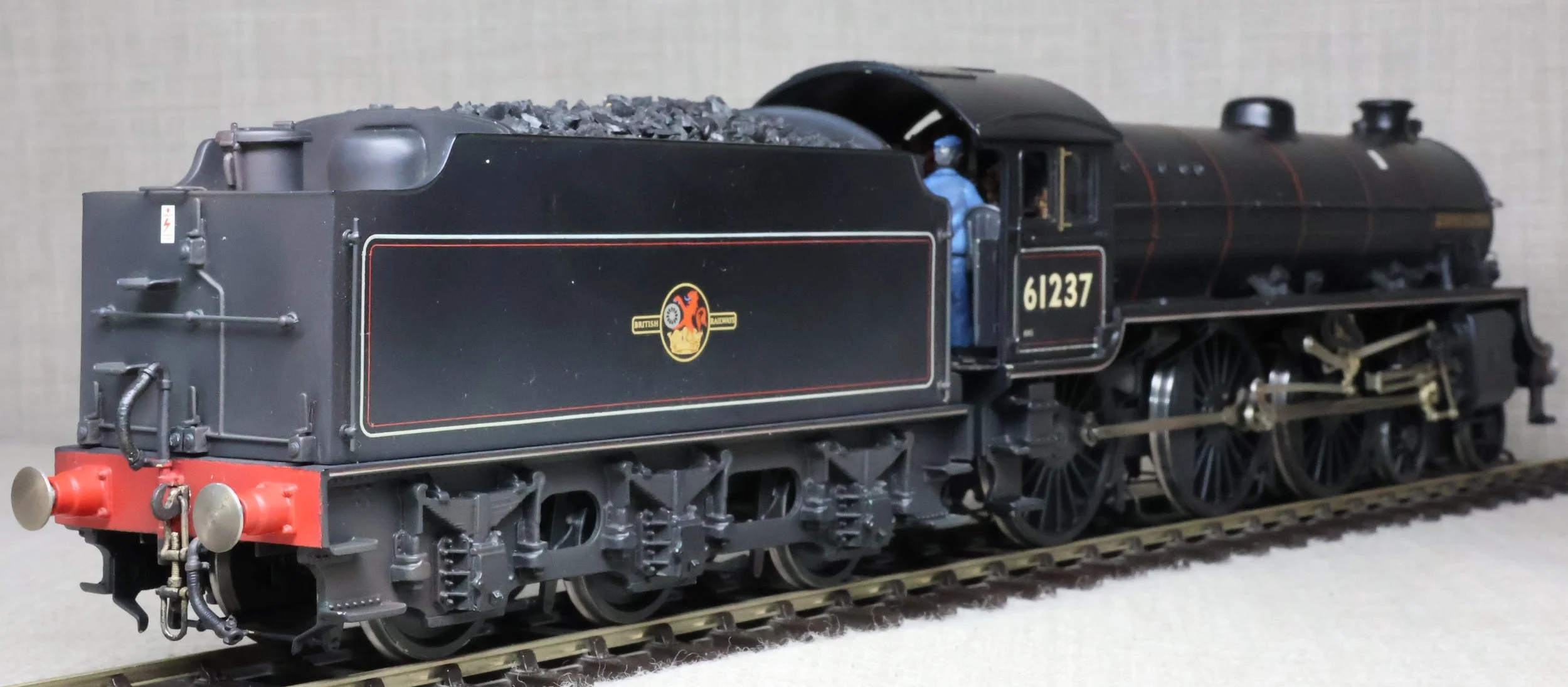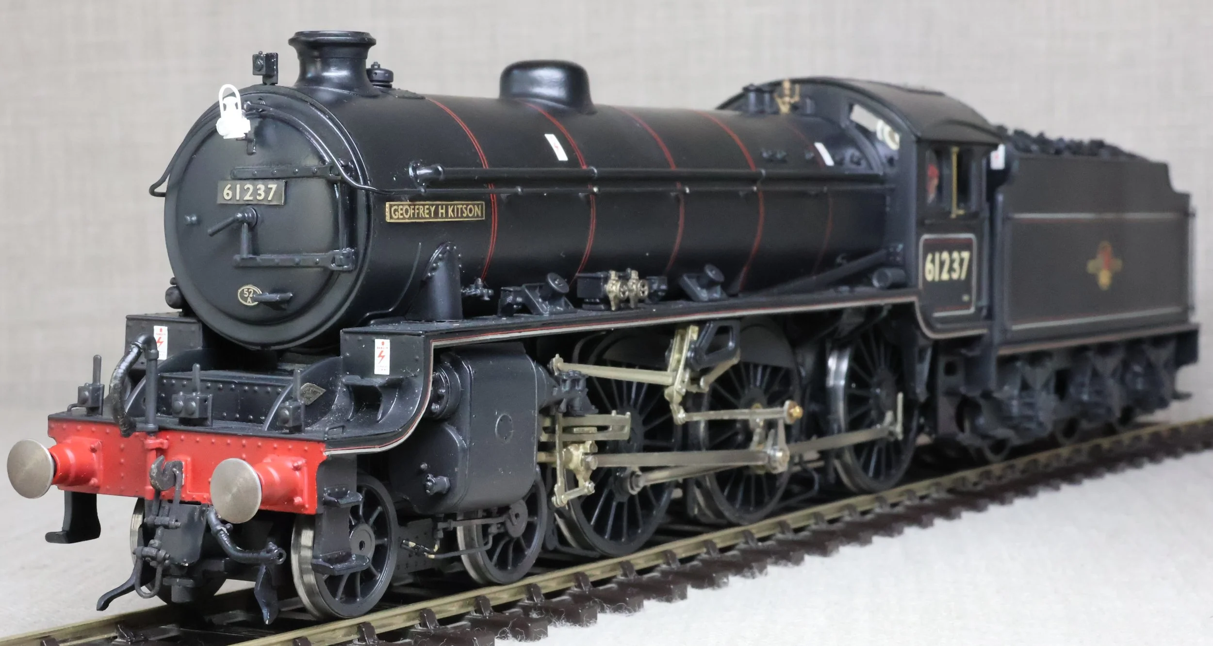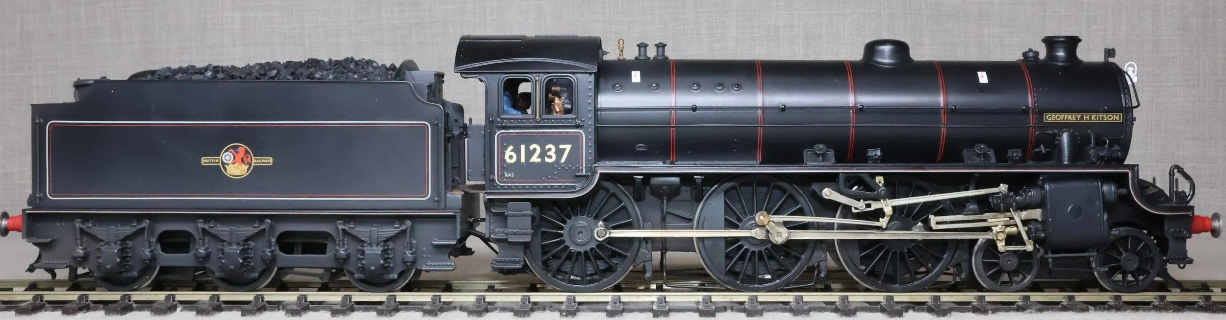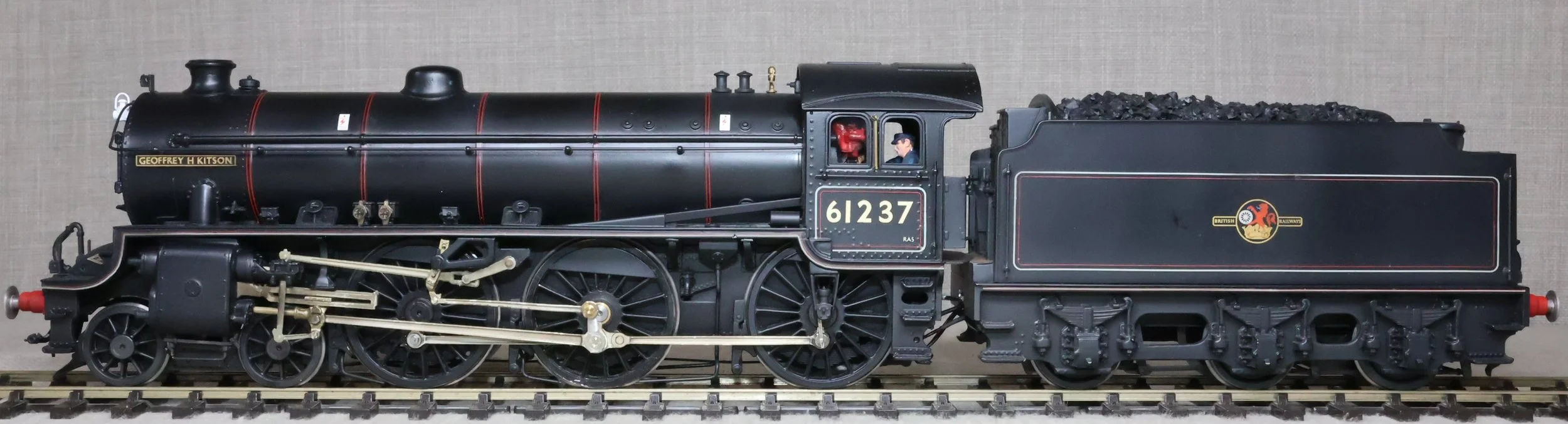 LMIB02. BR ex-LNER Thompson Class 'B1' 4-6-0 and Tender No. 61237 'Geoffrey H. Kitson'. In BR lined black with late crest and just a hint of weathering, AWS equipment fitted, electrification flashes, and shedplate 52A Gateshead. This is from a DJH whitemetal and brass kit, factory built by DJH, and fitted with their own motor and gearbox combination with Delrin final drive, Slaters wheels, and with excellent cab detail and crew. Additionally fitted with DCC and sound using a Zimo type MX699 decoder (address 1237). The model is lightly used and is supplied in its original DJH box with DJH and Zimo instructions. Please note that the loco and tender are currently hard wired together, and the cab window cinderguards require glazing. Due to the box length exceeding Royal Mail limits, shipping (UK and International) is by DHL only at cost price (or it can be sent via Royal Mail at a lower price in a plain box). The prototype was into service as LNER No. 1237 from North British Locomotive Company, Glasgow, in September 1947 to Neville Hill (Leeds). So it was just into service before nationalisation. It became BR No. 61237 and was withdrawn from Wakefield in December 1966 having spent time at Gateshead (and other North Eastern sheds) from 1961 to 1965. £1395.