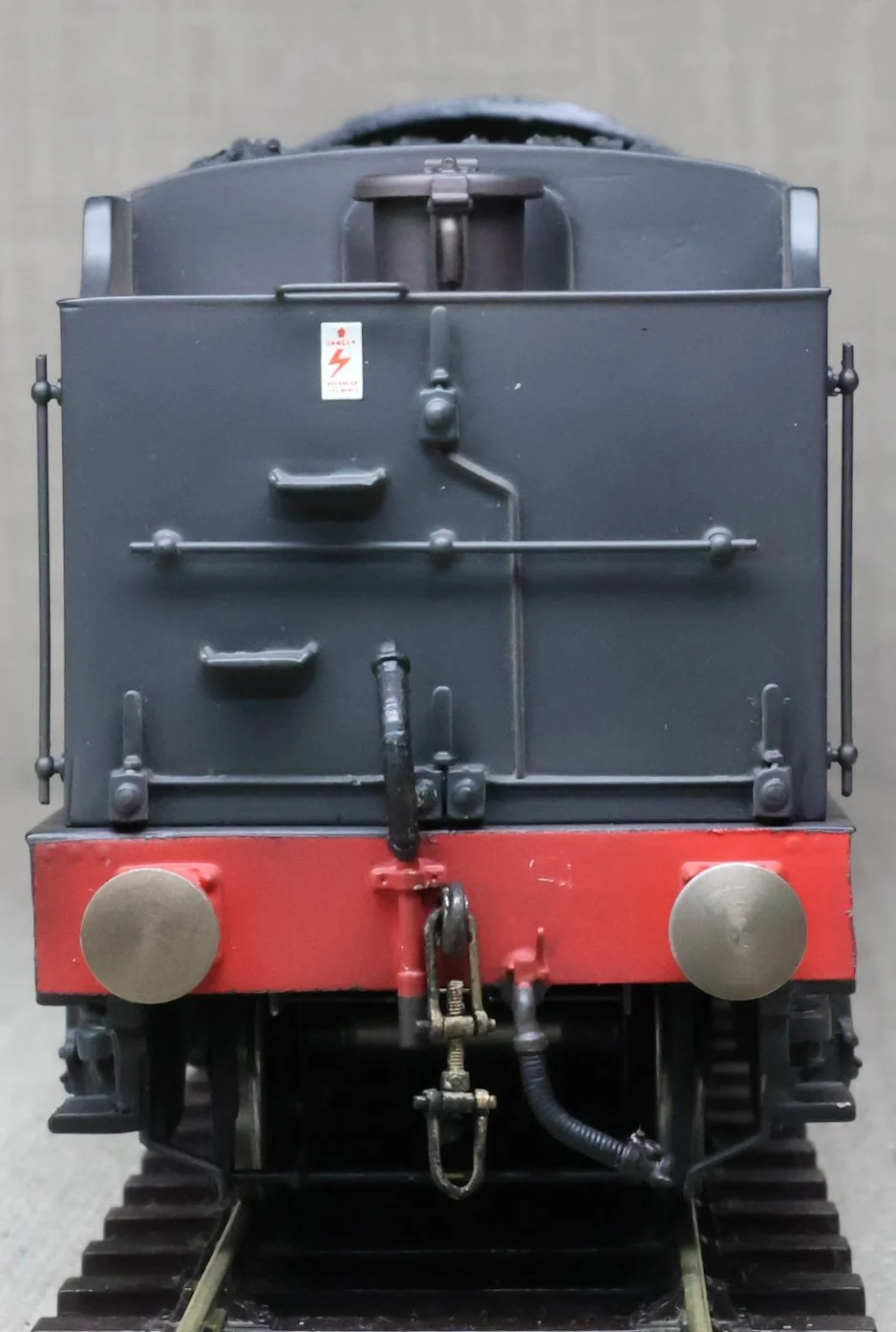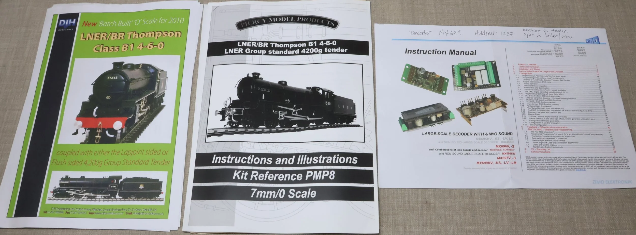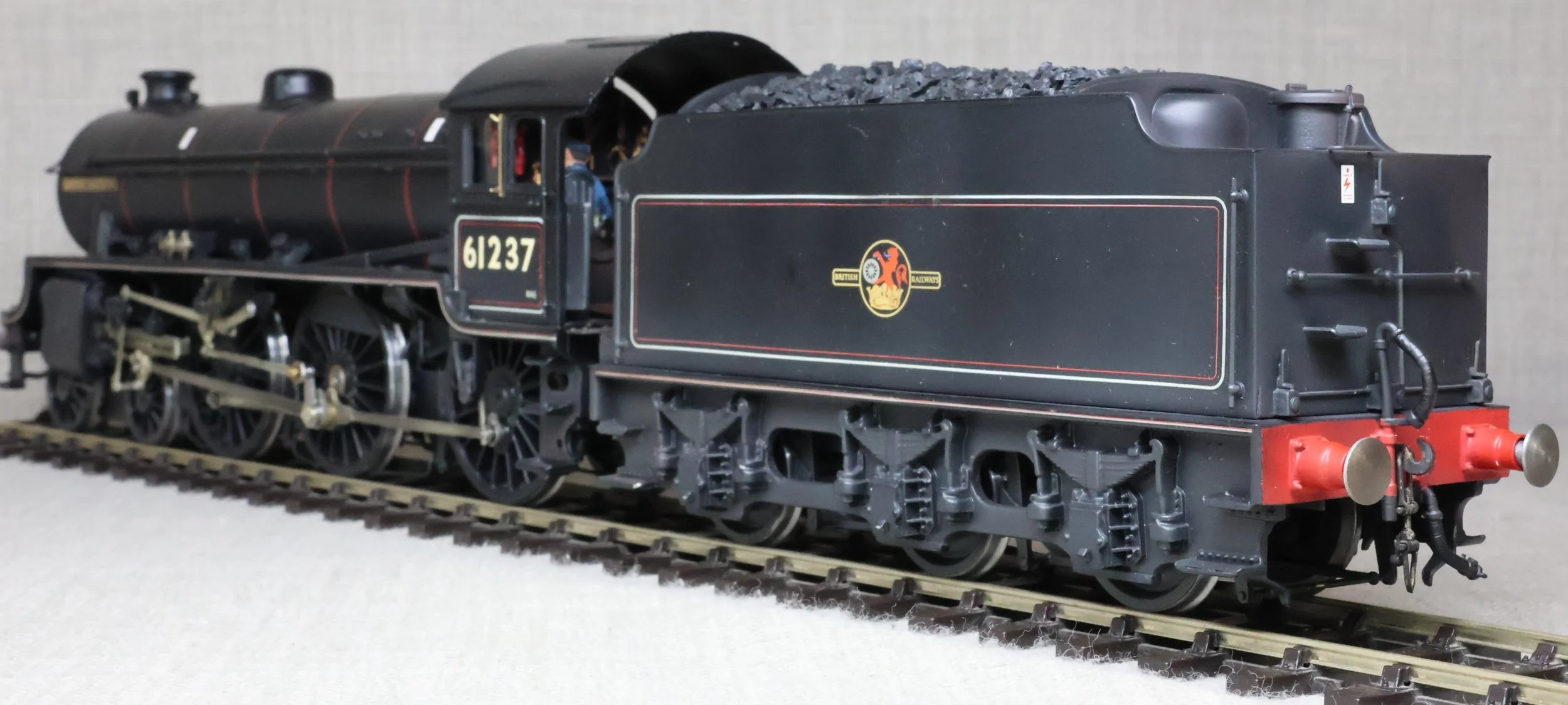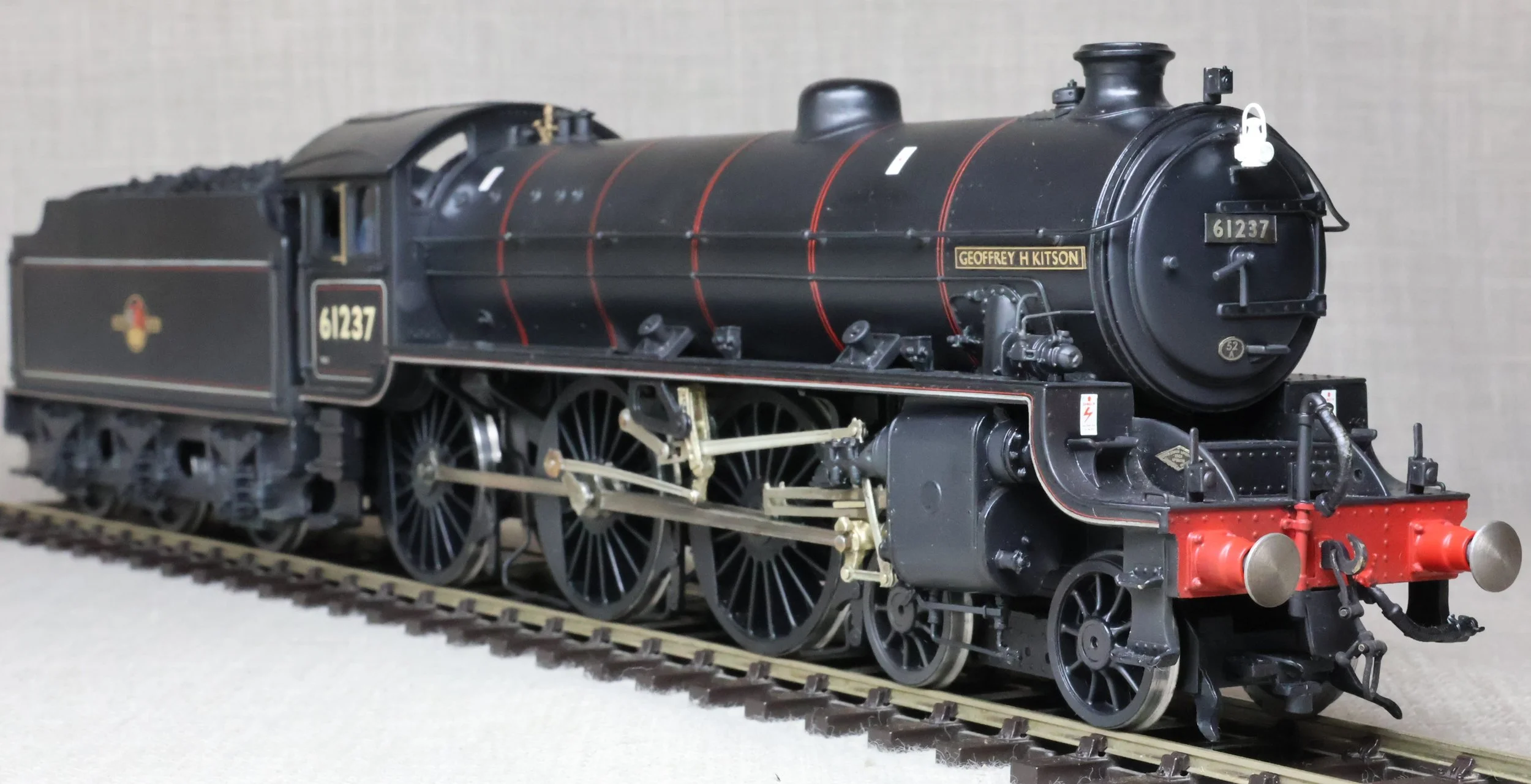 LMIB02. BR ex-LNER Thompson Class 'B1' 4-6-0 and Tender No. 61237 'Geoffrey H. Kitson'. In BR lined black with late crest and just a hint of weathering, AWS equipment fitted, electrification flashes, and shedplate 52A Gateshead. This is from a DJH whitemetal and brass kit, factory built by DJH, and fitted with their own motor and gearbox combination with Delrin final drive, Slaters wheels, and with excellent cab detail and crew. Additionally fitted with DCC and sound using a Zimo type MX699 decoder (address 1237). The model is lightly used and is supplied in its original DJH box with DJH and Zimo instructions. Please note that the loco and tender are currently hard wired together, and the cab window cinderguards require glazing. Due to the box length exceeding Royal Mail limits, shipping (UK and International) is by DHL only at cost price (or it can be sent via Royal Mail at a lower price in a plain box). The prototype was into service as LNER No. 1237 from North British Locomotive Company, Glasgow, in September 1947 to Neville Hill (Leeds). So it was just into service before nationalisation. It became BR No. 61237 and was withdrawn from Wakefield in December 1966 having spent time at Gateshead (and other North Eastern sheds) from 1961 to 1965. £1395.