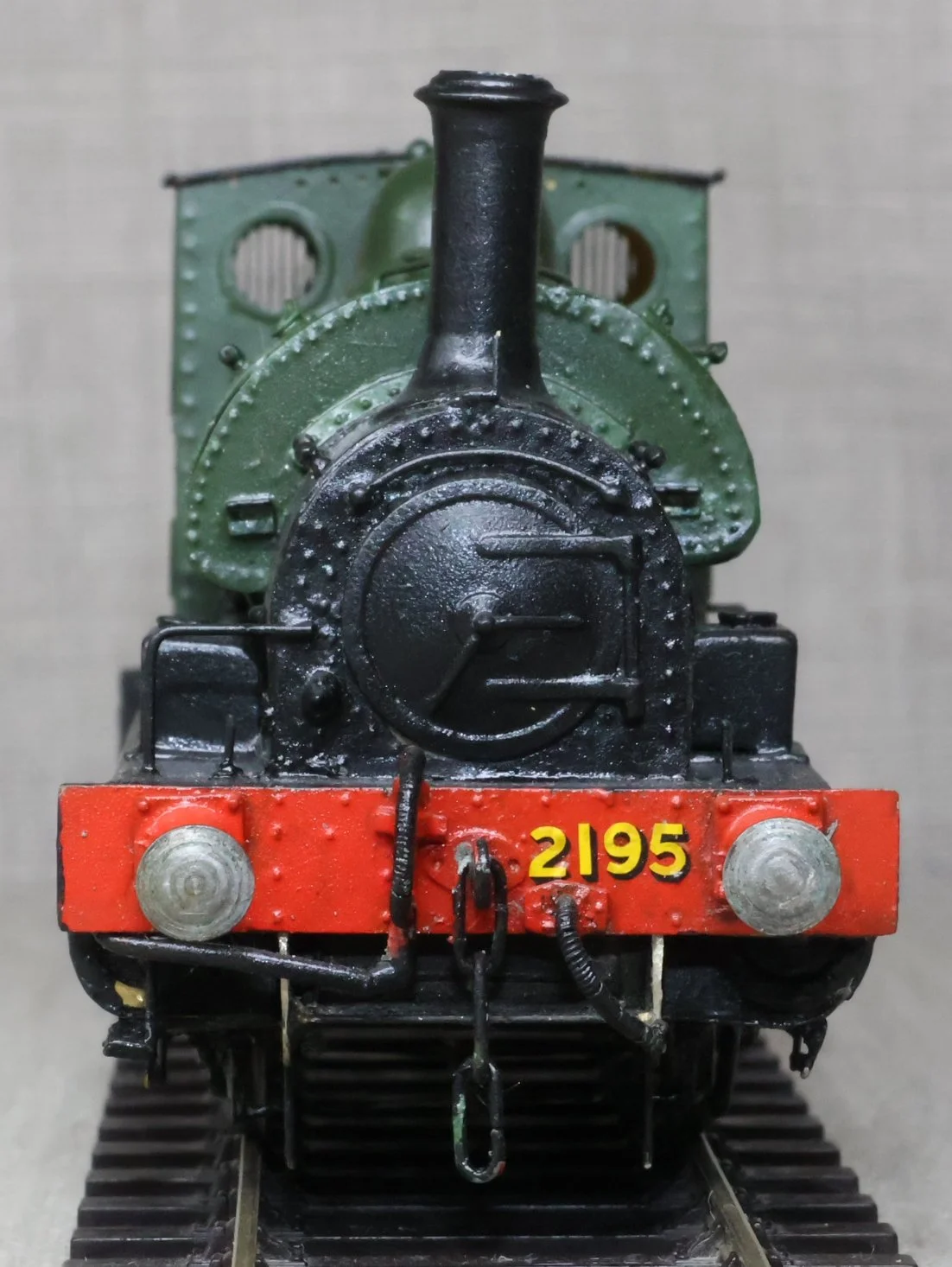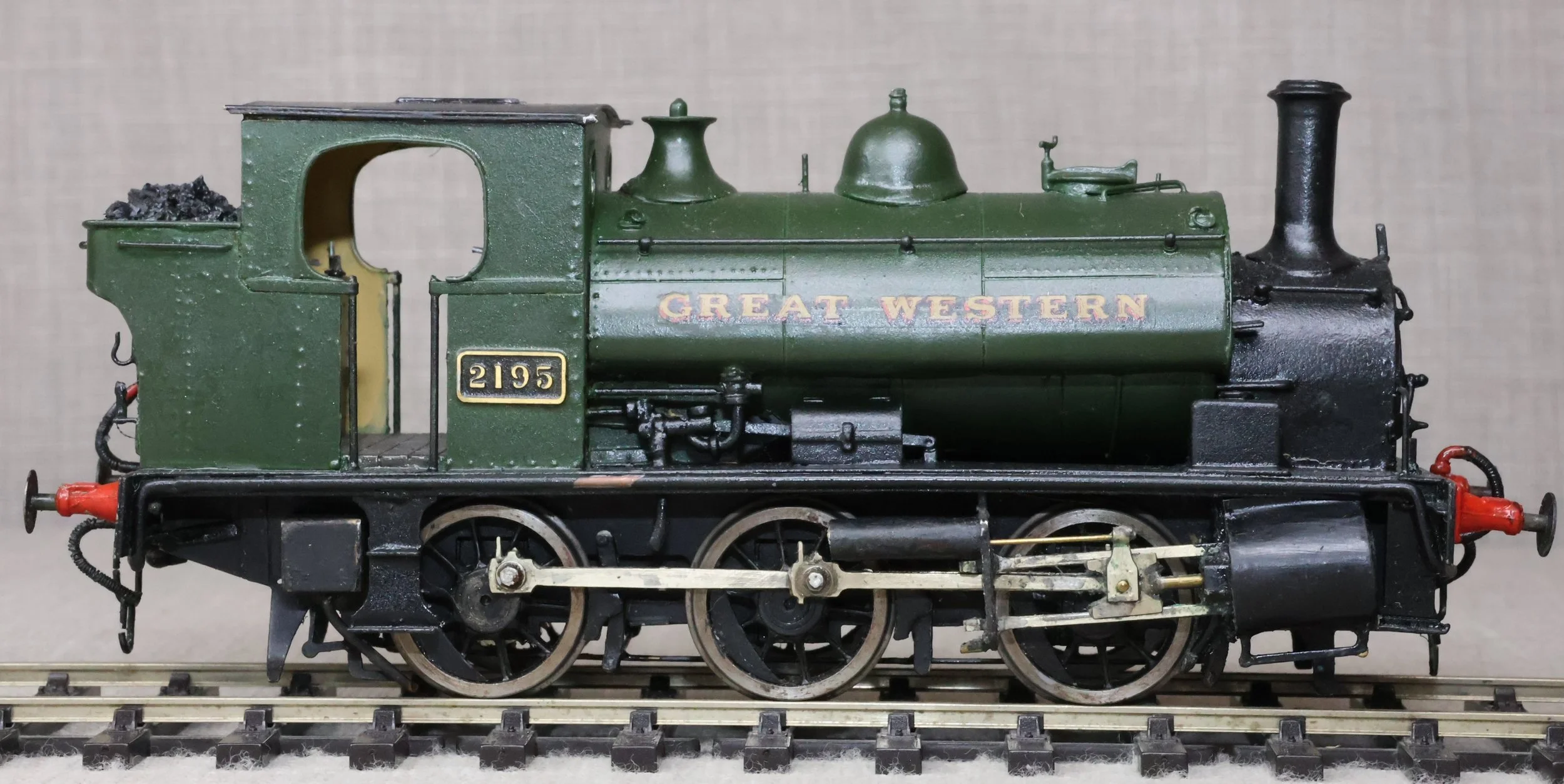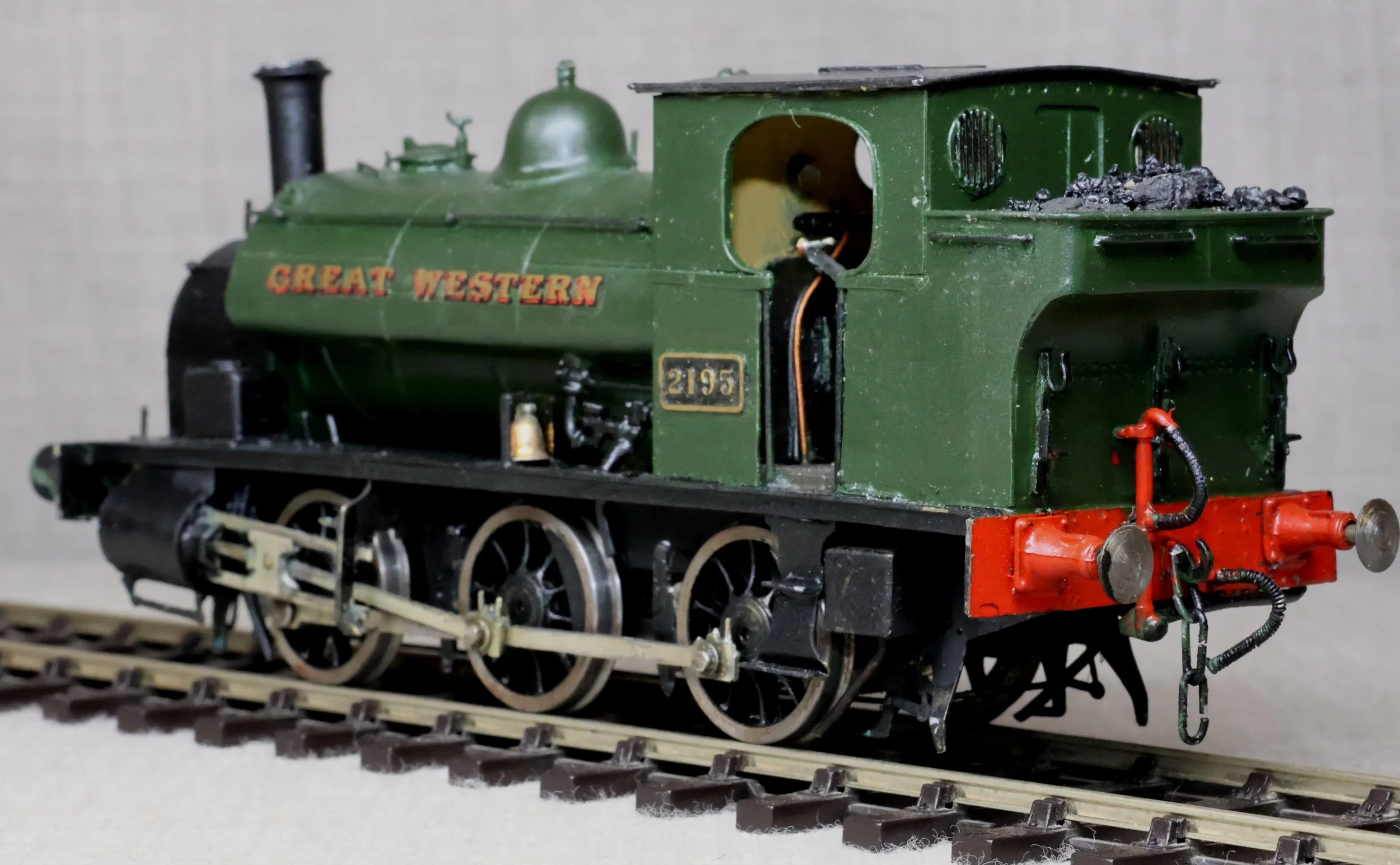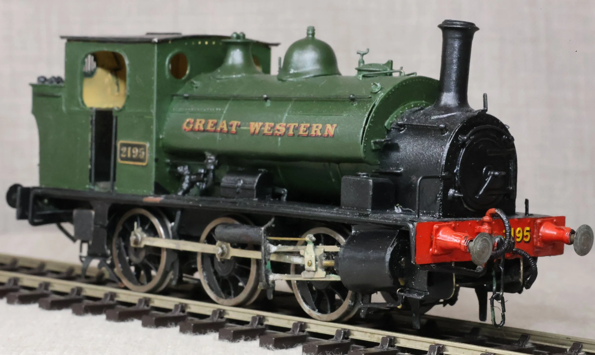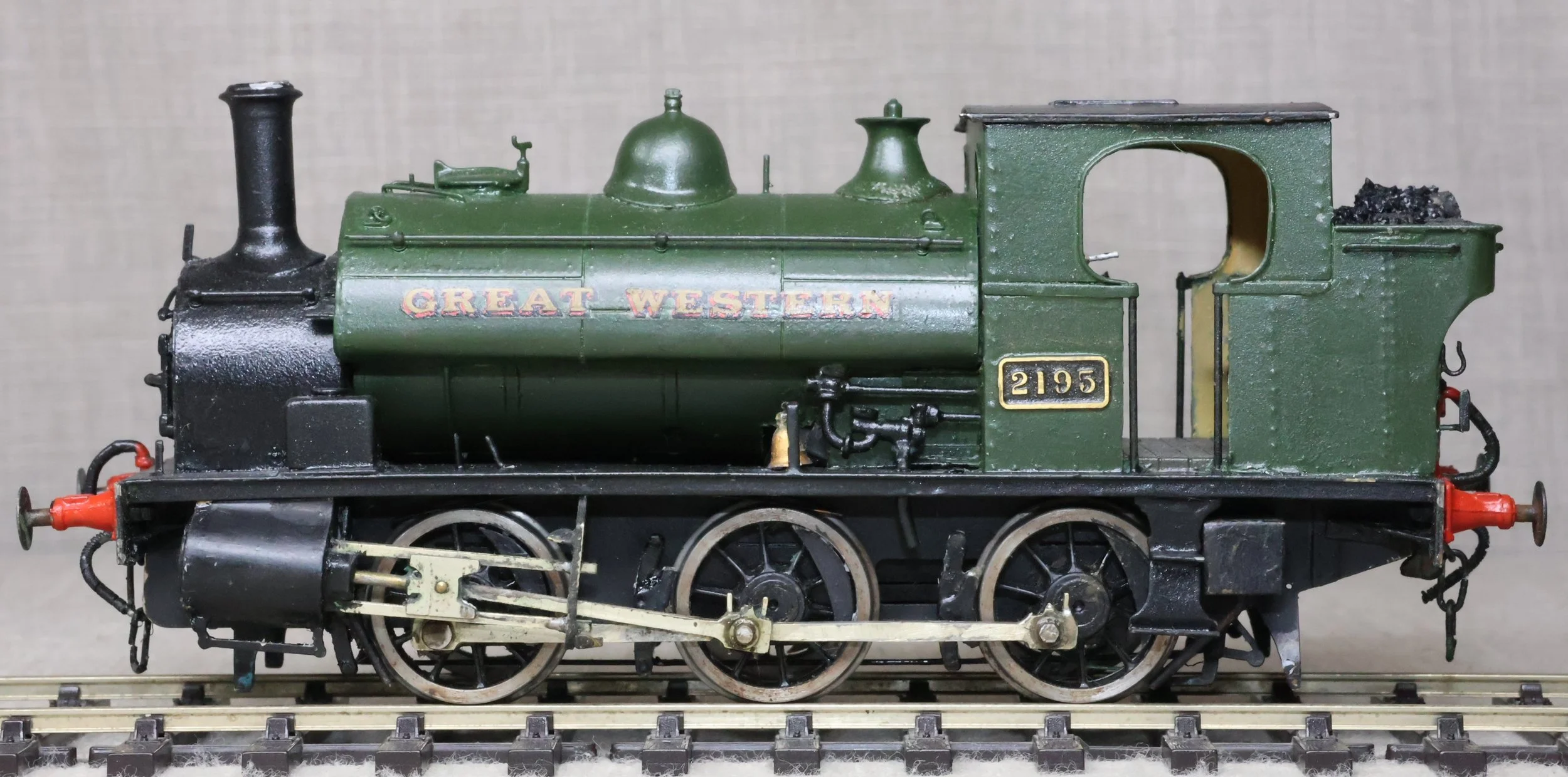LRG38. GWR ex- Burry Port Avonside 0-6-0 Saddle Tank No. 2195 as a RESTORATION PROJECT. In plain GWR green with 'Great Western' in gold shaded red. This is kitbuilt in brass and fitted with a Mashima motor, single stage gearbox, Slaters wheels and good cab detail. It has had medium use. The issues with the locos are as follows (1) Although it runs OK one of the driving wheels is intermittently shorting on a brake block fitted tight behind one of the front cylinders. (2) The chimney needs straightening. The prototype was into service from the Avonside Engine Company to the Burry Port & Gwendraeth Valley Light Railway in April 1905 as No. 5 'Cwm Mawr'. The railway became part of the GWR in 1922 and the loco became GWR No. 2195 although the name was retained until 1929. It was withdrawn from Swindon in 1953. £125 as a RESTORATION PROJECT.