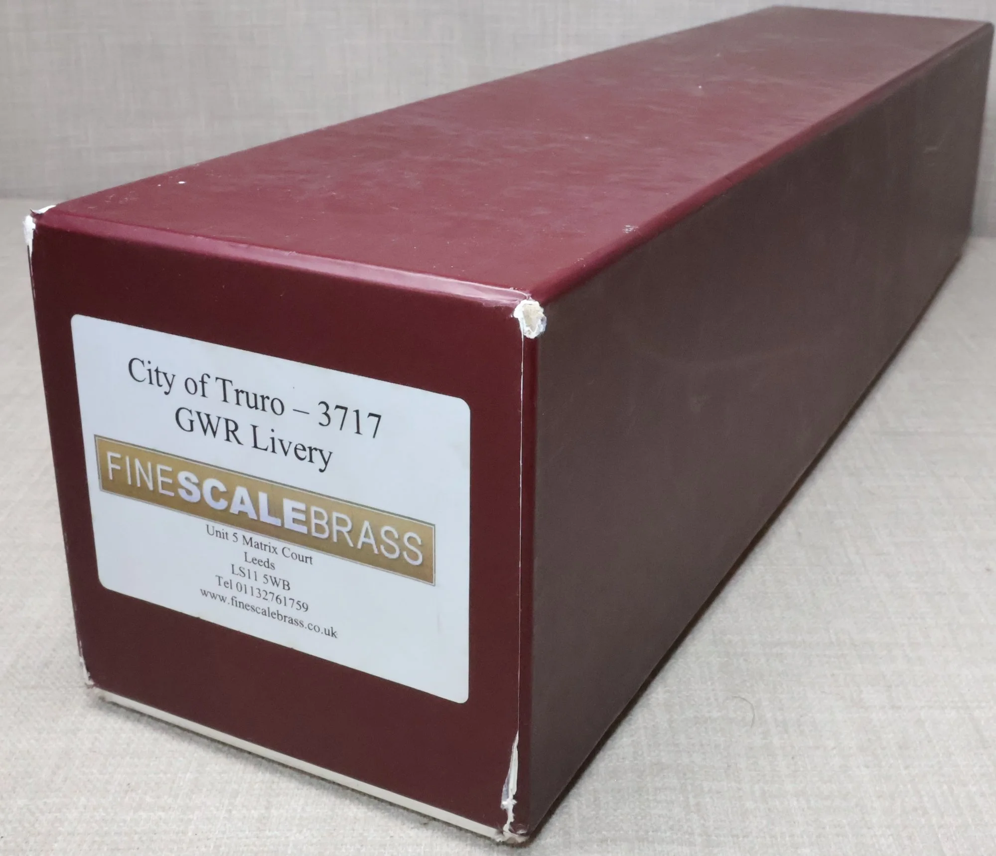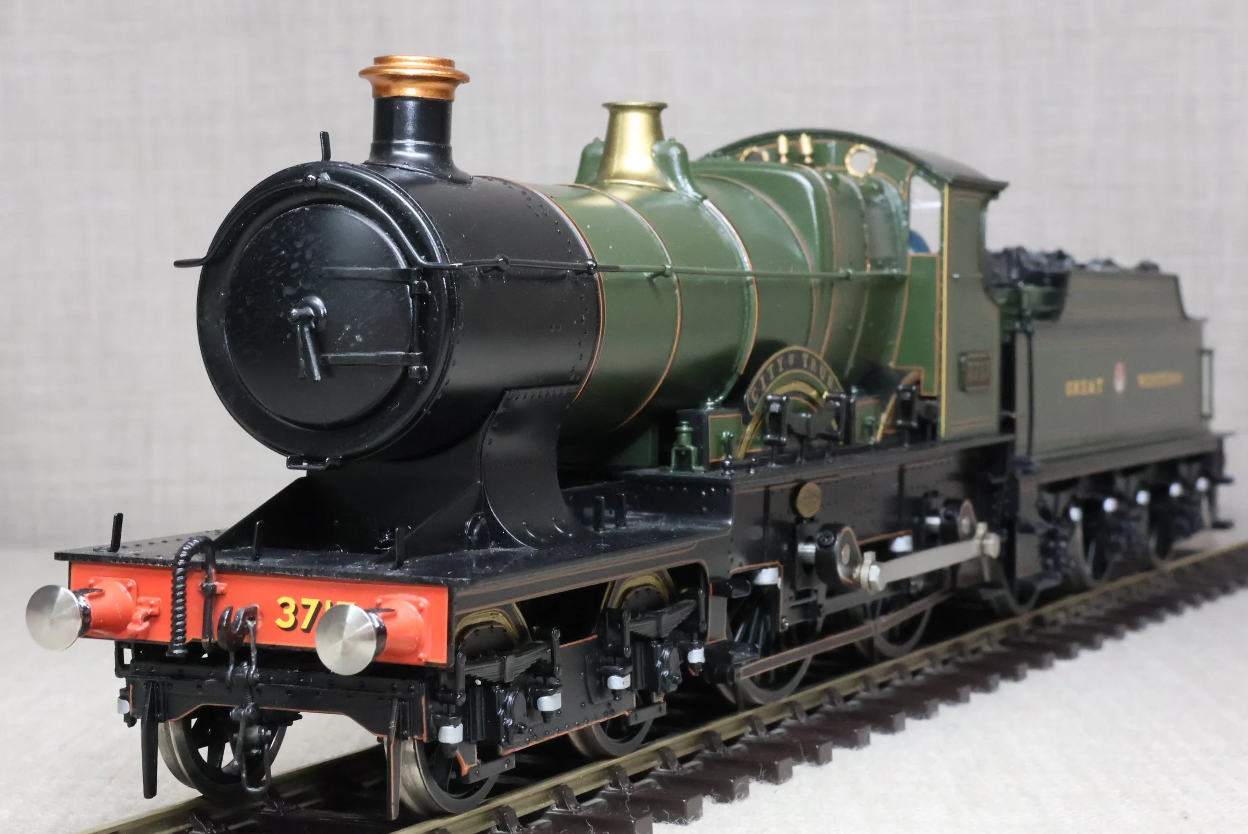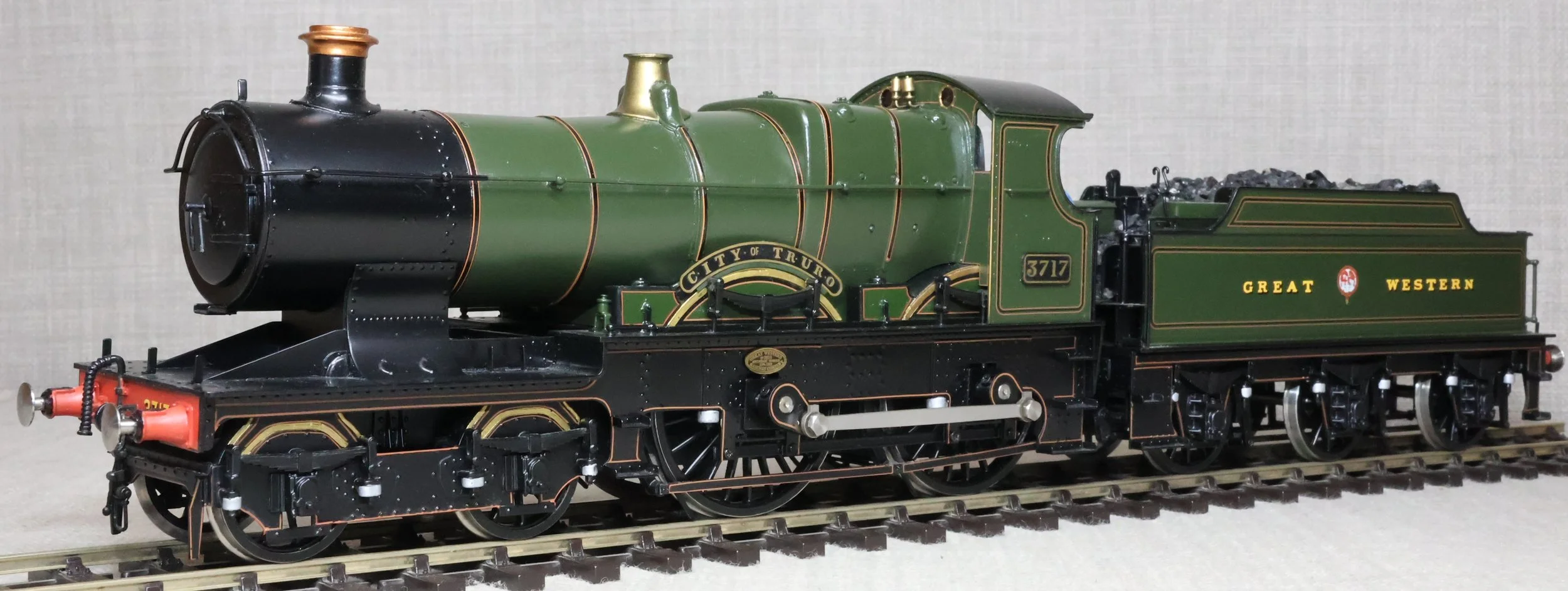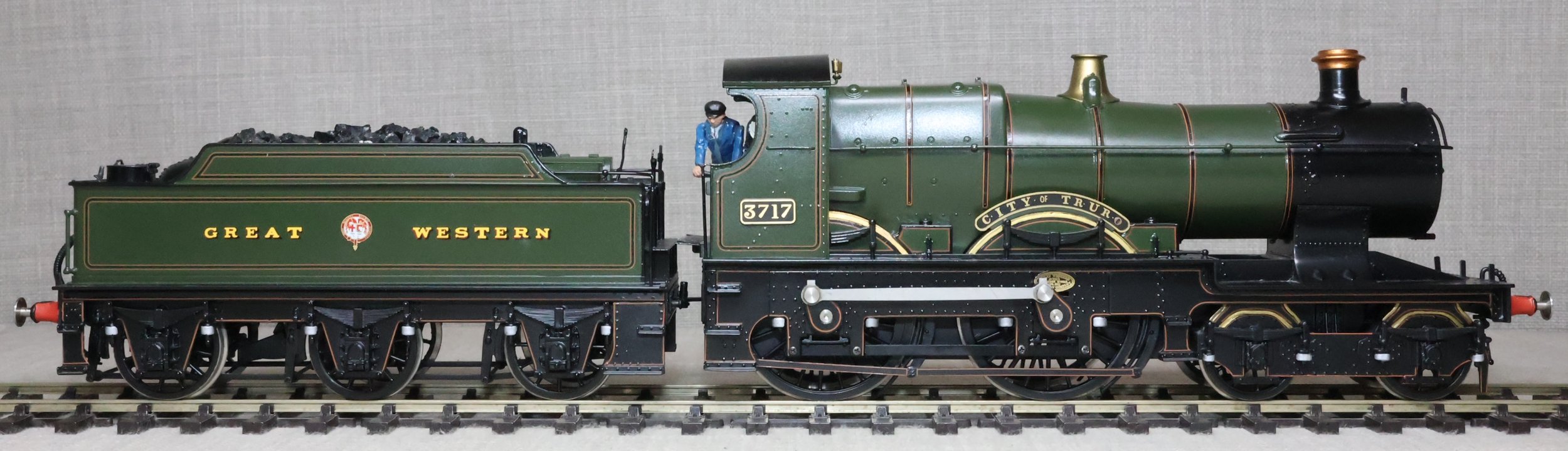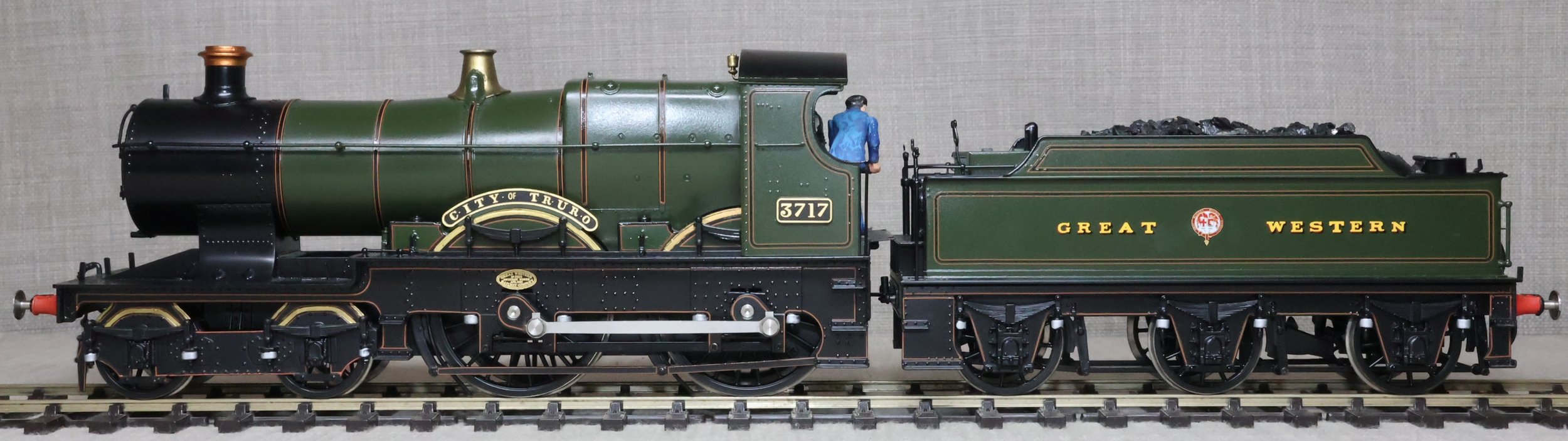 LRGL01. GWR Churchward 'City' Class 4-4-0 and Tender No. 3717 'City of Truro'. In GWR lined green with garter crest as running from just prior to World War 1 with black frames. This is a brass model by Sancheng for Finescale Brass and is fitted with working inside motion, compensation on the leading driving axle and all tender axles, and with excellent cab detail. Crew and coal have been added. The model is lightly used and is supplied in its original inner and outer boxes. This is one of the final 'City' models produced by Sancheng and the type of box (produced for the final batch of models) is an indication that the paintwork is a factory finish done in Korea. The prototype to Churchward’s design entered service as No. 3440 from Swindon Works in 1903. It was renumbered to No. 3717 in 1912 and was retired for preservation in 1931, thus having a far greater life in preservation than it did in service. SOLD.