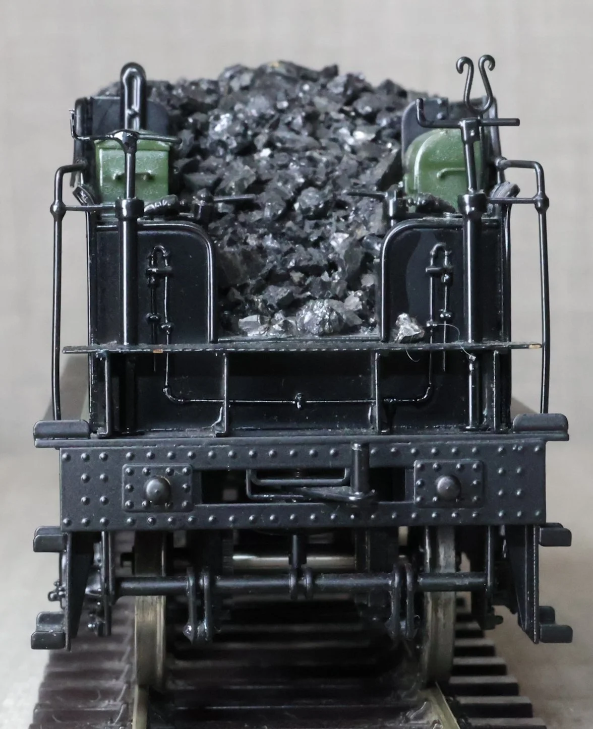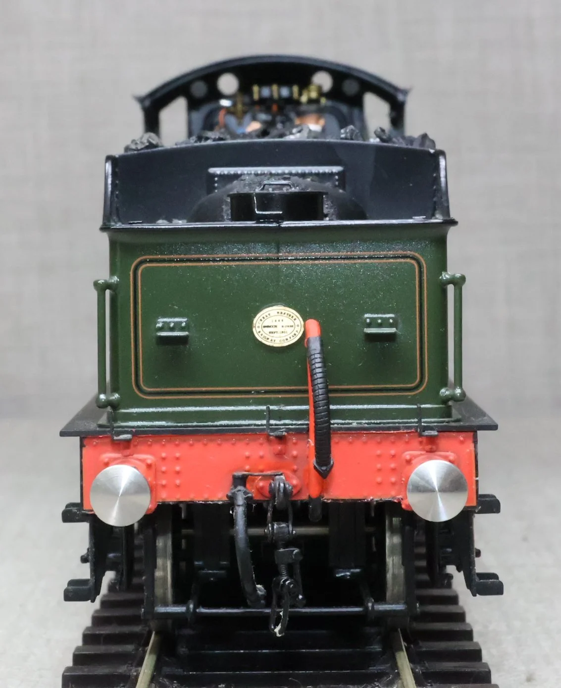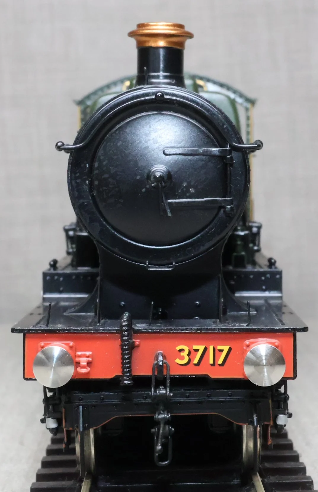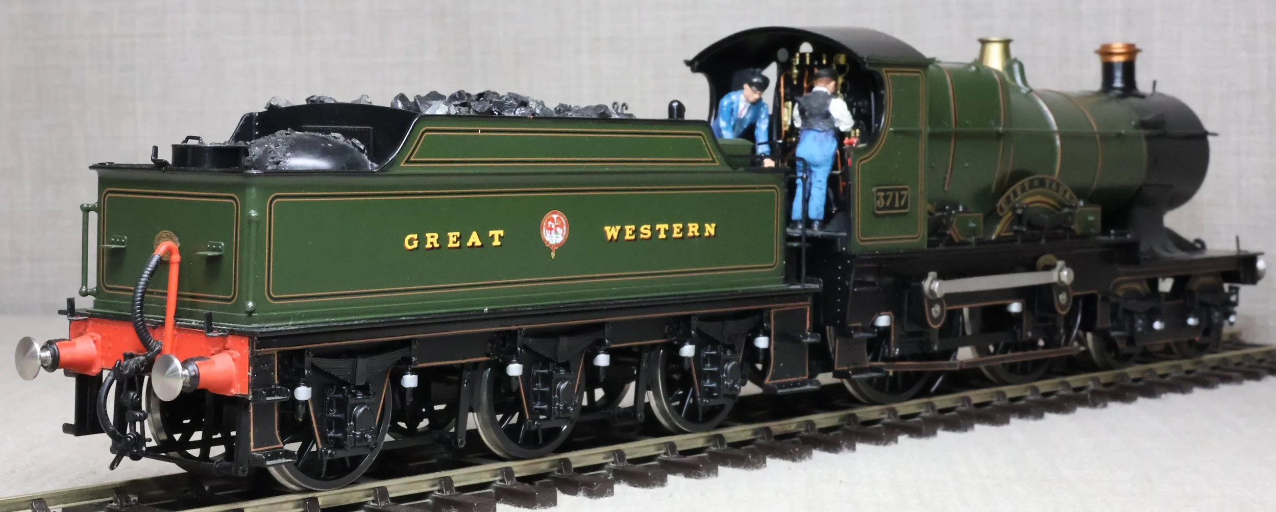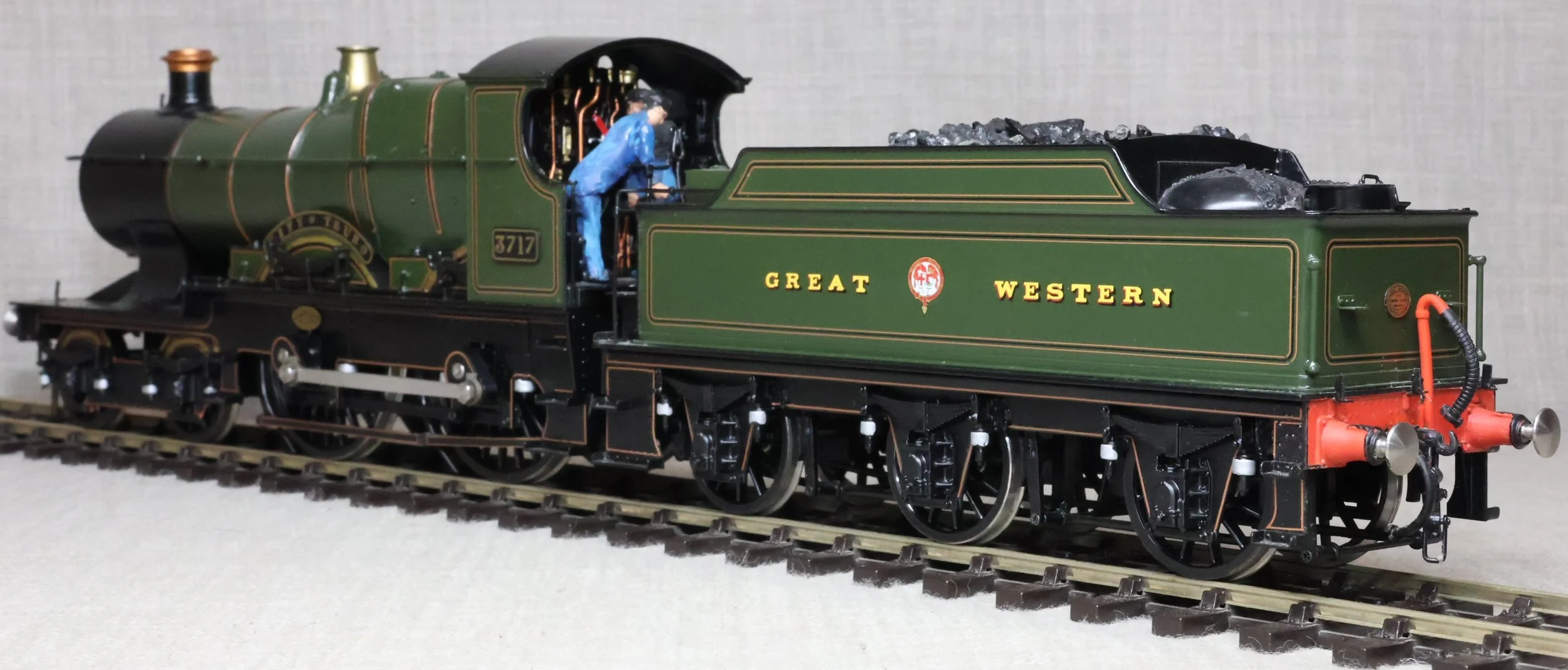 LRGL01. GWR Churchward 'City' Class 4-4-0 and Tender No. 3717 'City of Truro'. In GWR lined green with garter crest as running from just prior to World War 1 with black frames. This is a brass model by Sancheng for Finescale Brass and is fitted with working inside motion, compensation on the leading driving axle and all tender axles, and with excellent cab detail. Crew and coal have been added. The model is lightly used and is supplied in its original inner and outer boxes. This is one of the final 'City' models produced by Sancheng and the type of box (produced for the final batch of models) is an indication that the paintwork is a factory finish done in Korea. The prototype to Churchward’s design entered service as No. 3440 from Swindon Works in 1903. It was renumbered to No. 3717 in 1912 and was retired for preservation in 1931, thus having a far greater life in preservation than it did in service. SOLD.