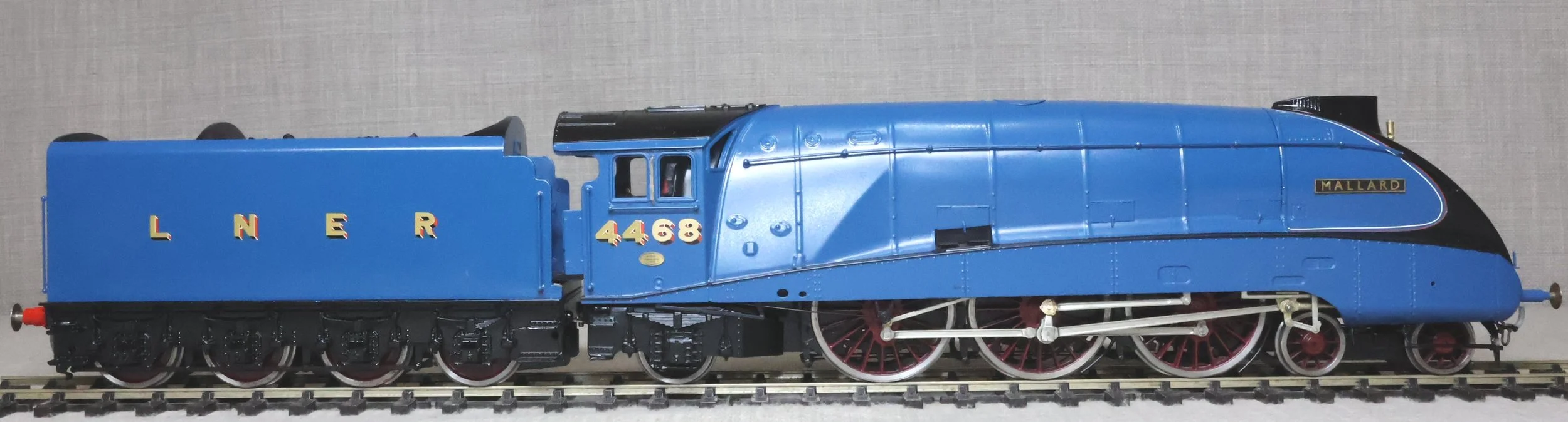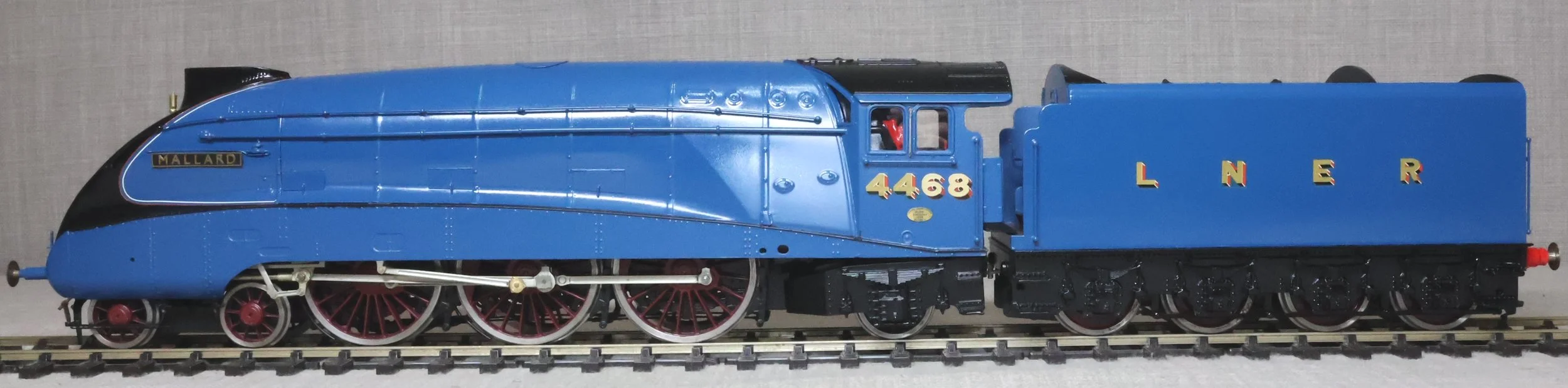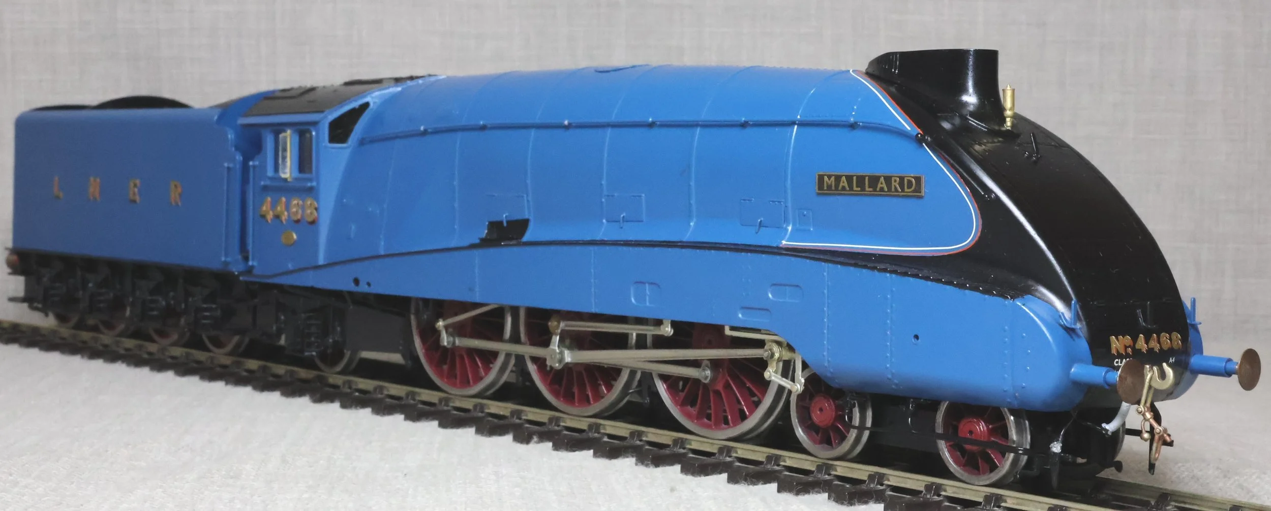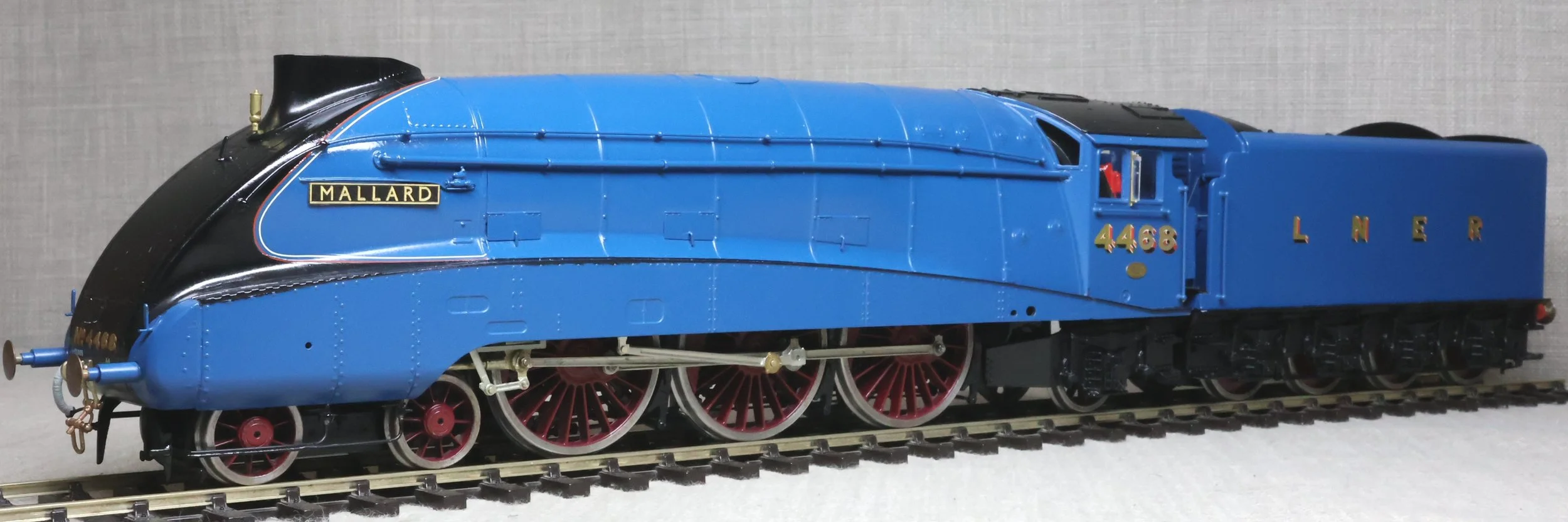 LRGL03. LNER Gresley Class A4 4-6-2 Pacific and Tender No. 4468 'Mallard'. Fully valanced as running pre-war, paired with a streamlined non-corridor tender, and in lined LNER blue livery. This is factory built in whitemetal and brass by DJH from their own kit and fitted with Slaters wheels, a multi-stage gearbox (not sure of the motor type), and with excellent cab detail. The model is lightly used and is supplied in its original DJH box. However this box is too long for posting via Royal Mail so shipping (UK and International) must be by DHL at cost price. The prototype was into service from Doncaster Works to Doncaster shed in March 1938 as No. 4468 becoming LNER No. 22 in the 1946 renumbering scheme and subsequently BR No. 60022 in 1949. On 3rd July 1938 'Mallard' achieved and still retains the world speed record for steam locomotives at 126 mph between Little Bytham and Essendine stations on the East Coast main line. It was withdrawn from Kings Cross for preservation in the National Collection in April 1963. It ran with a streamlined non-corridor tender from new until March 1948. RESERVED.