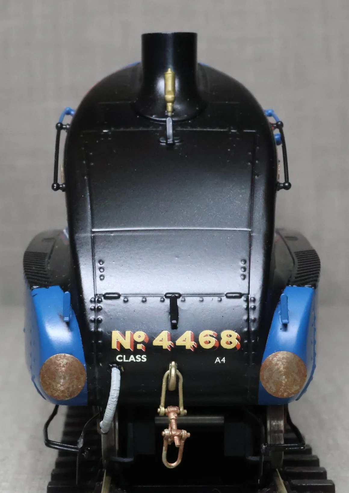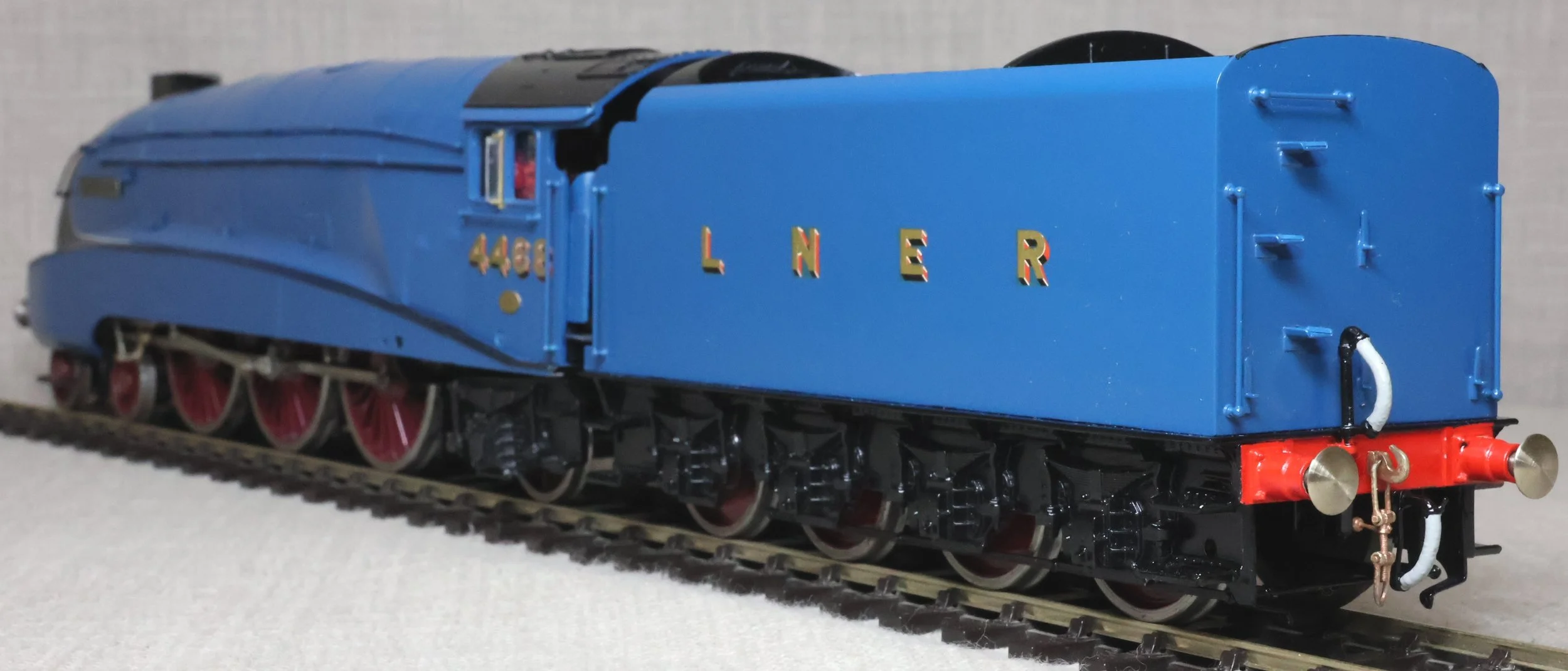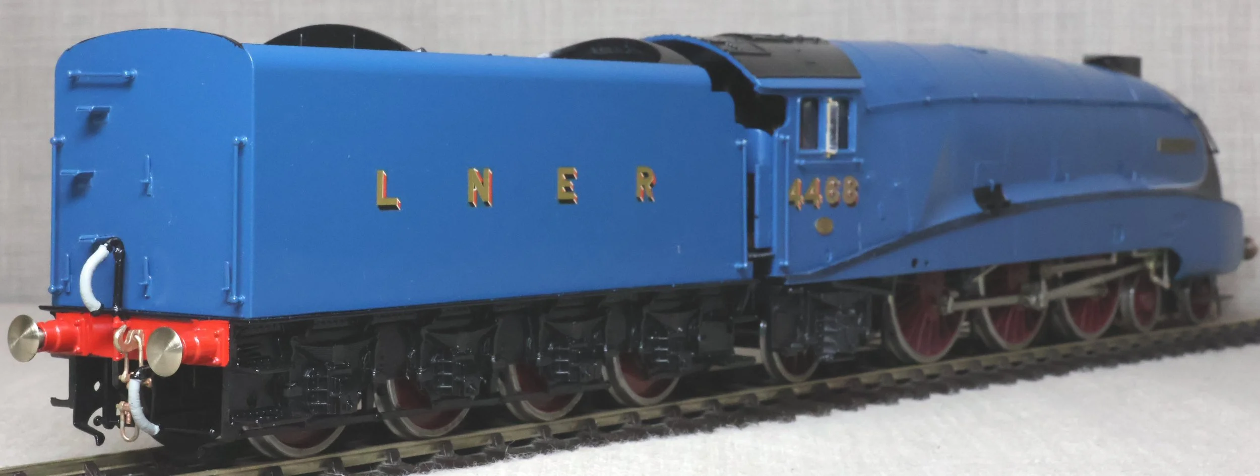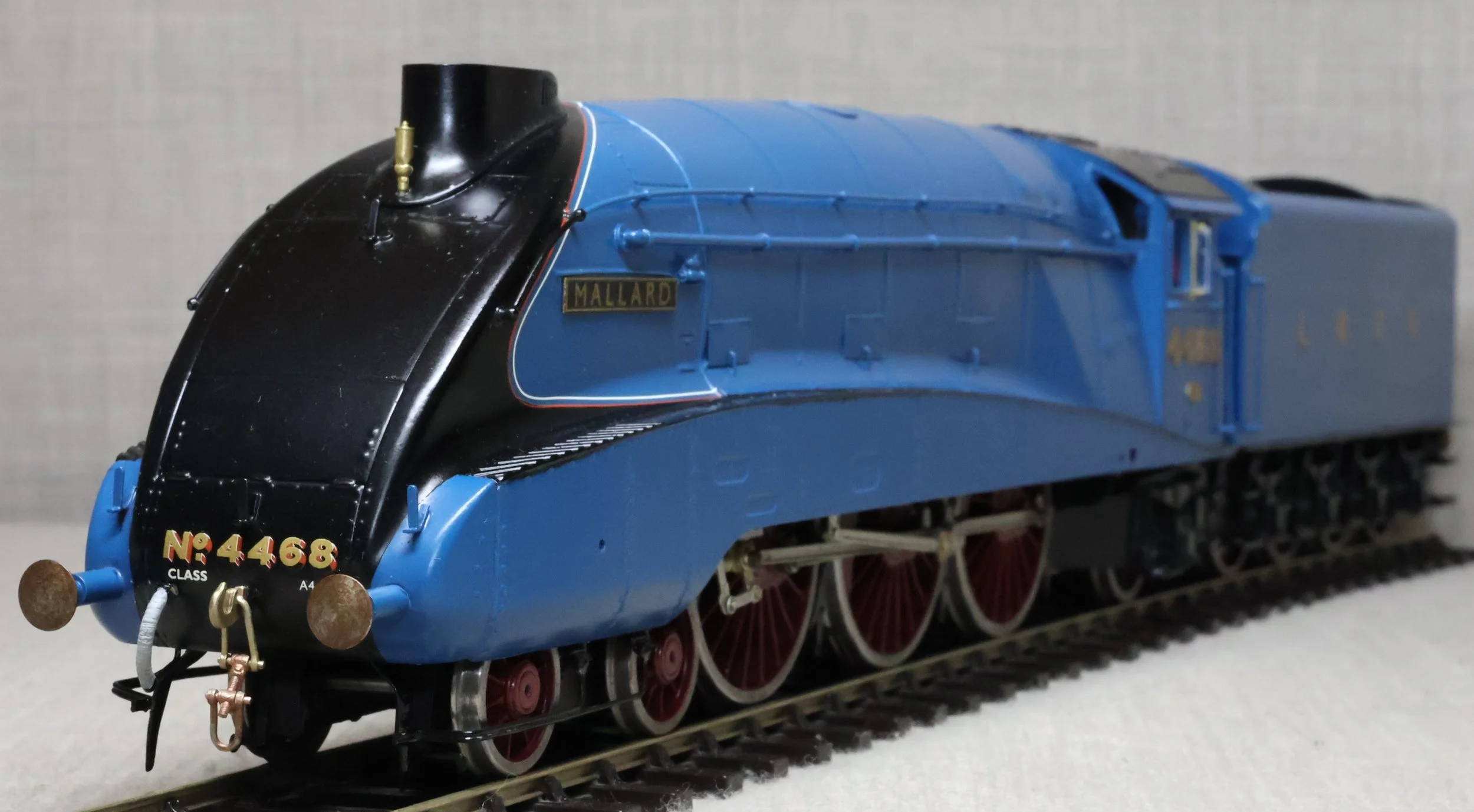 LRGL03. LNER Gresley Class A4 4-6-2 Pacific and Tender No. 4468 'Mallard'. Fully valanced as running pre-war, paired with a streamlined non-corridor tender, and in lined LNER blue livery. This is factory built in whitemetal and brass by DJH from their own kit and fitted with Slaters wheels, a multi-stage gearbox (not sure of the motor type), and with excellent cab detail. The model is lightly used and is supplied in its original DJH box. However this box is too long for posting via Royal Mail so shipping (UK and International) must be by DHL at cost price. The prototype was into service from Doncaster Works to Doncaster shed in March 1938 as No. 4468 becoming LNER No. 22 in the 1946 renumbering scheme and subsequently BR No. 60022 in 1949. On 3rd July 1938 'Mallard' achieved and still retains the world speed record for steam locomotives at 126 mph between Little Bytham and Essendine stations on the East Coast main line. It was withdrawn from Kings Cross for preservation in the National Collection in April 1963. It ran with a streamlined non-corridor tender from new until March 1948. RESERVED.