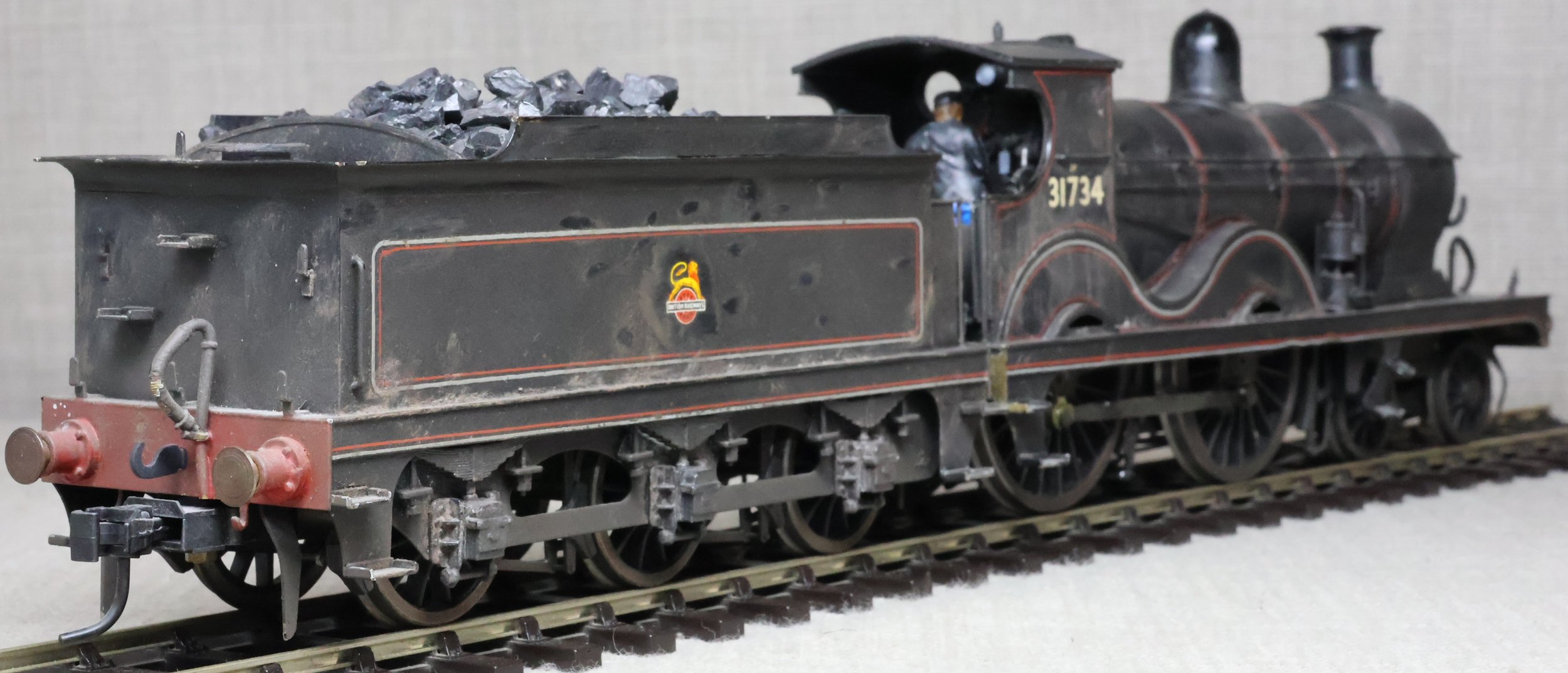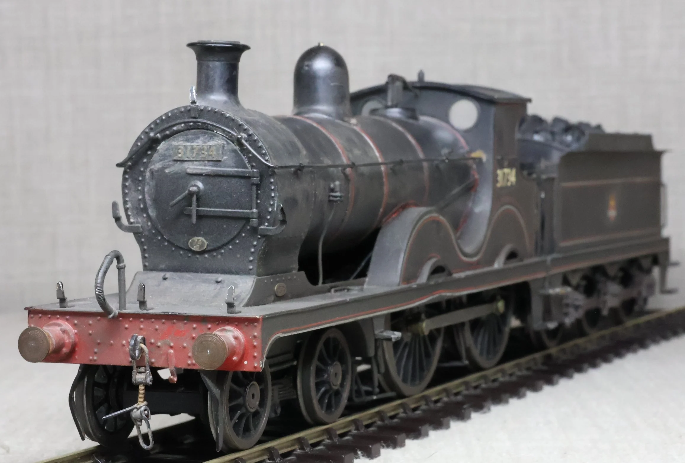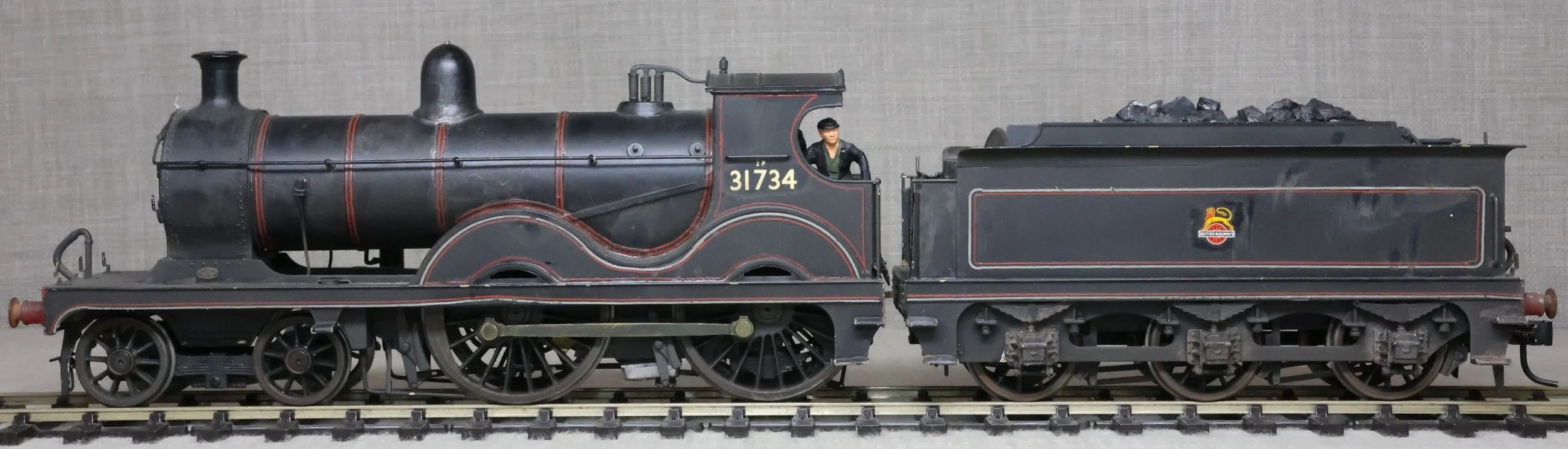 LRH07. BR ex-Southern Rly ex-SE&CR Wainwright 'D' Class 4-4-0 & Tender No. 31734. in lined BR black with early crest, weathered, and shedplate 74D Tonbridge. This looks to be from a Gladiator brass kit and is fitted with a single stage gearbox, MSC 'JH' motor, Slaters wheels, and with good cab detail and crew. This is a used model with extra weight added, a screw coupling on the loco and a Kadee coupling on the tender. It would benefit from light cosmetic refurbishment. The prototype (the D's were known as 'Coppernobs') was into service from Sharp Stewart & Co. in April 1901 as South Eastern & Chatham Railway No. 734, becoming Southern Railway No. 1734 and subsequently BR No. 31734 in 1948. It spent its BR days between Tonbridge and Faversham and was withdrawn from one of these sheds (different sources vary) in October or November 1955. Sister engine No. 737 is preserved as part of the National Collection. £695.