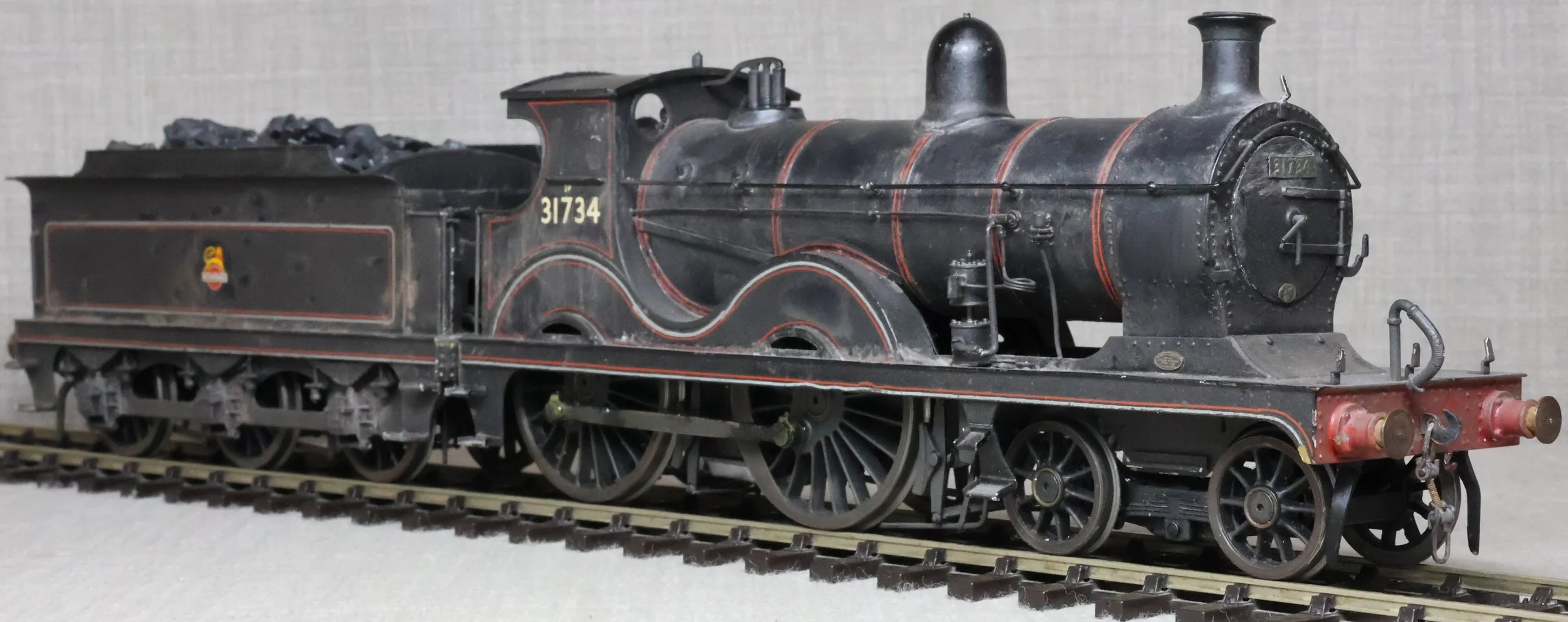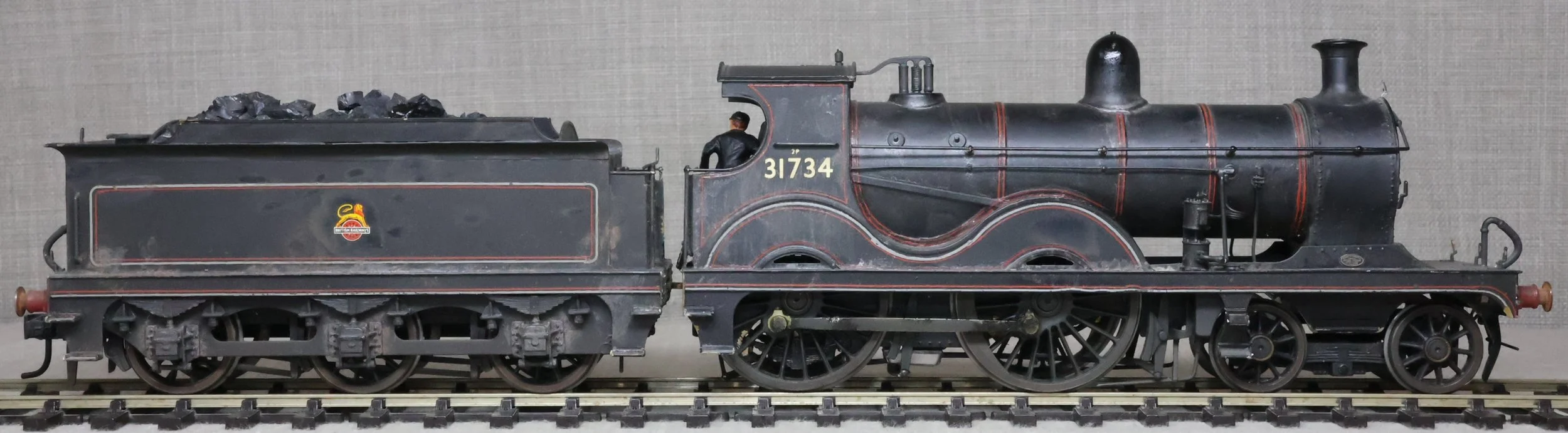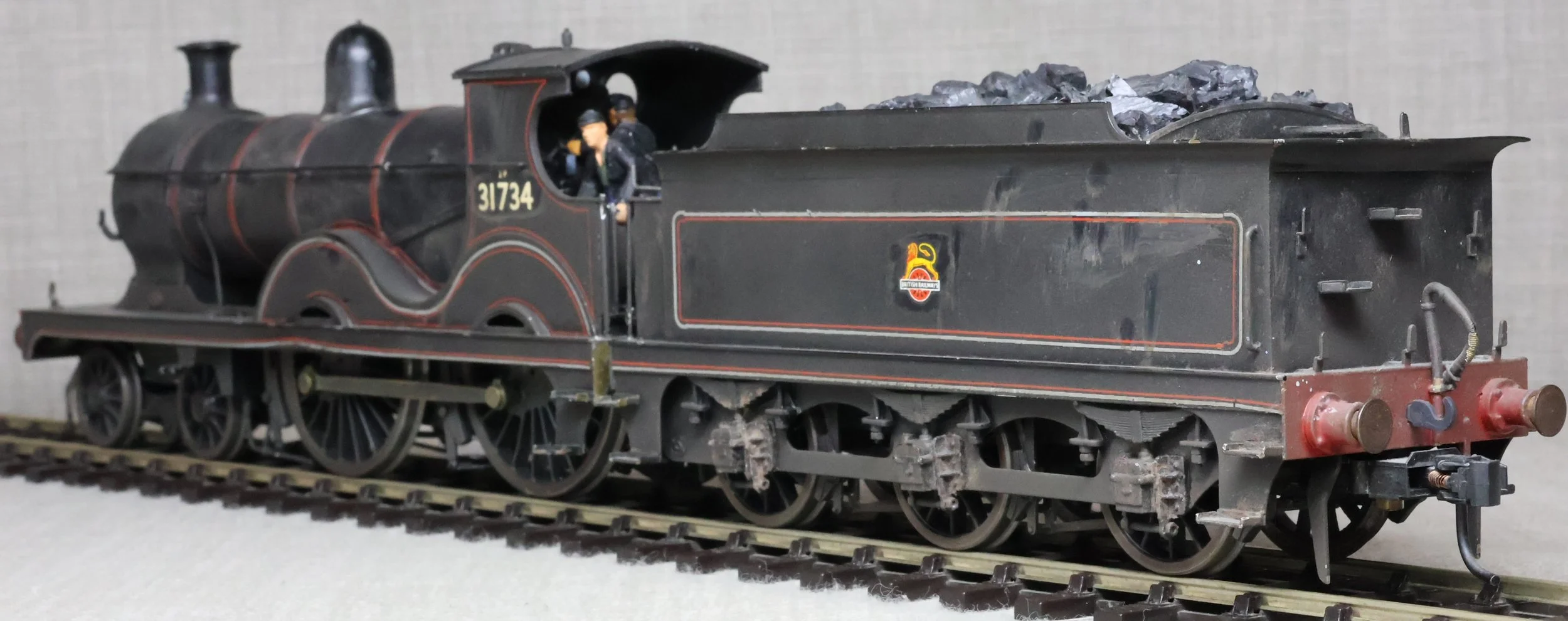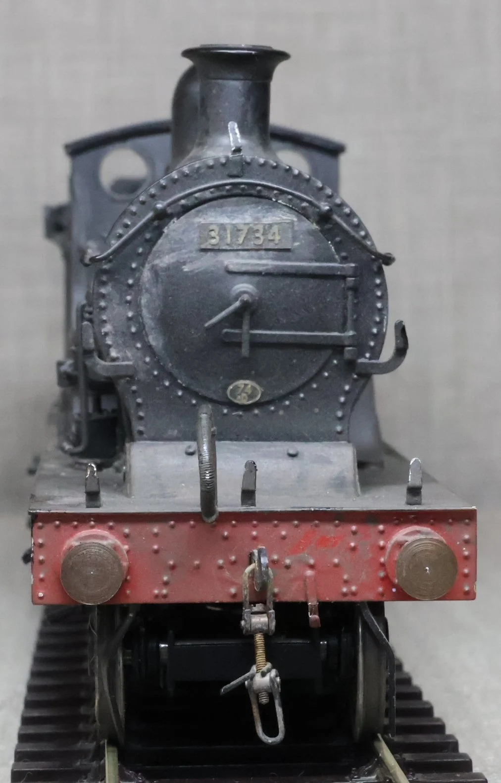 LRH07. BR ex-Southern Rly ex-SE&CR Wainwright 'D' Class 4-4-0 & Tender No. 31734. in lined BR black with early crest, weathered, and shedplate 74D Tonbridge. This looks to be from a Gladiator brass kit and is fitted with a single stage gearbox, MSC 'JH' motor, Slaters wheels, and with good cab detail and crew. This is a used model with extra weight added, a screw coupling on the loco and a Kadee coupling on the tender. It would benefit from light cosmetic refurbishment. The prototype (the D's were known as 'Coppernobs') was into service from Sharp Stewart & Co. in April 1901 as South Eastern & Chatham Railway No. 734, becoming Southern Railway No. 1734 and subsequently BR No. 31734 in 1948. It spent its BR days between Tonbridge and Faversham and was withdrawn from one of these sheds (different sources vary) in October or November 1955. Sister engine No. 737 is preserved as part of the National Collection. £695.