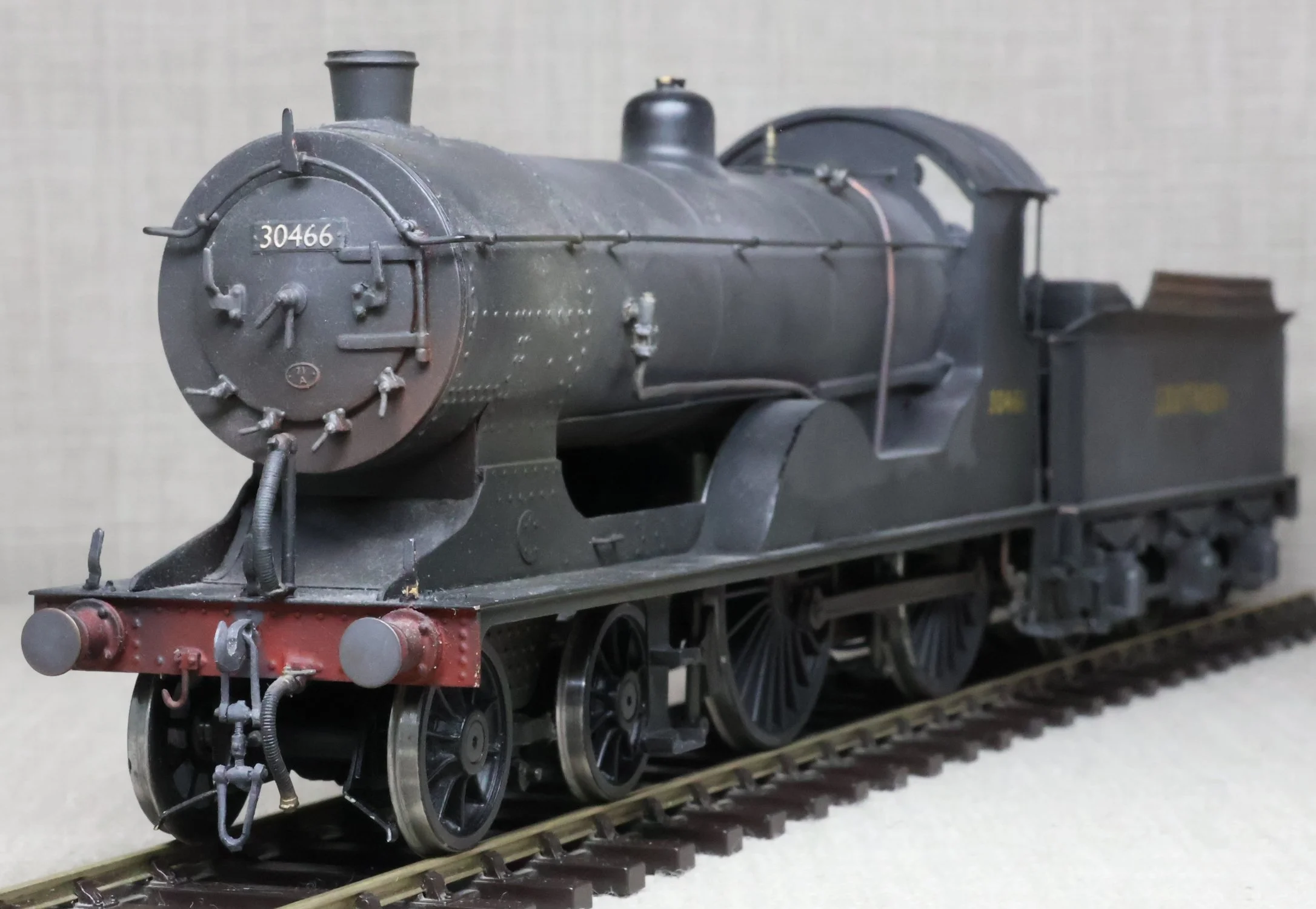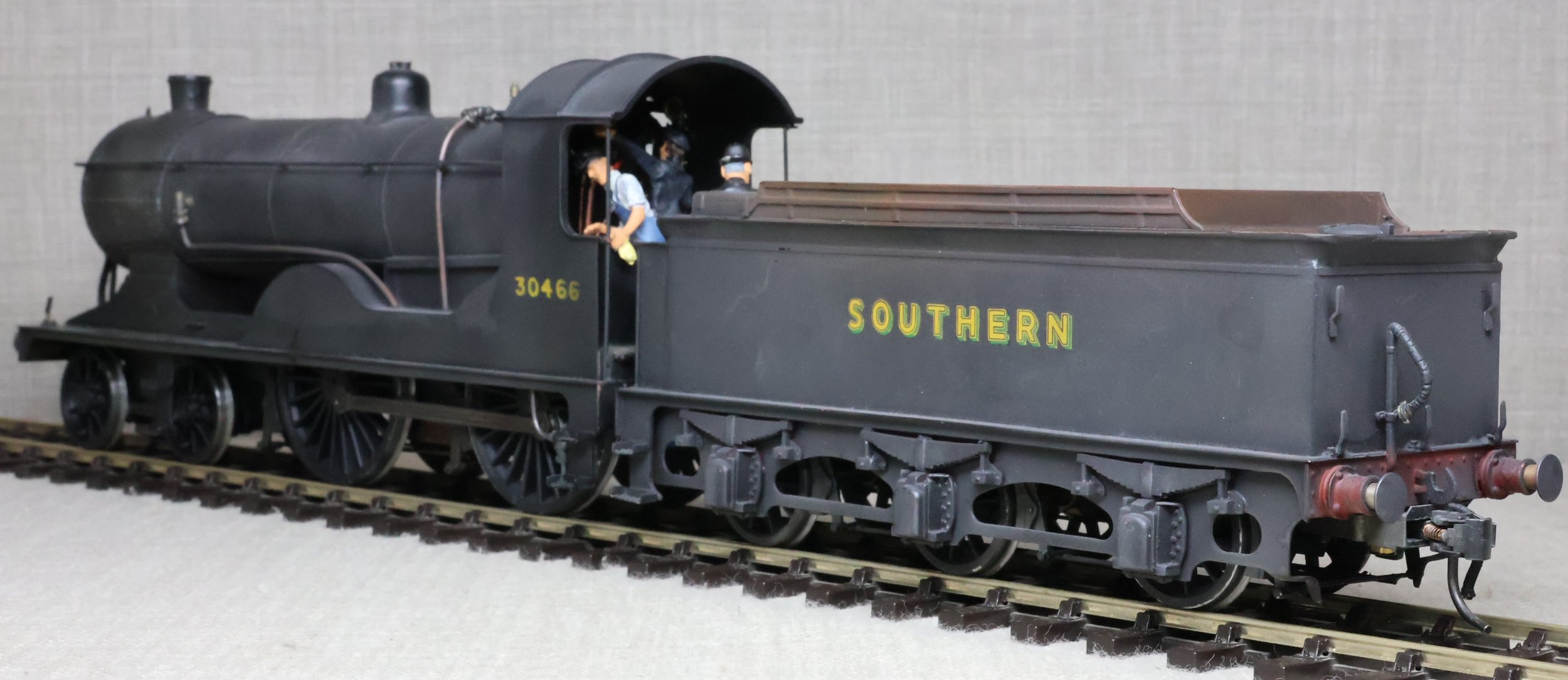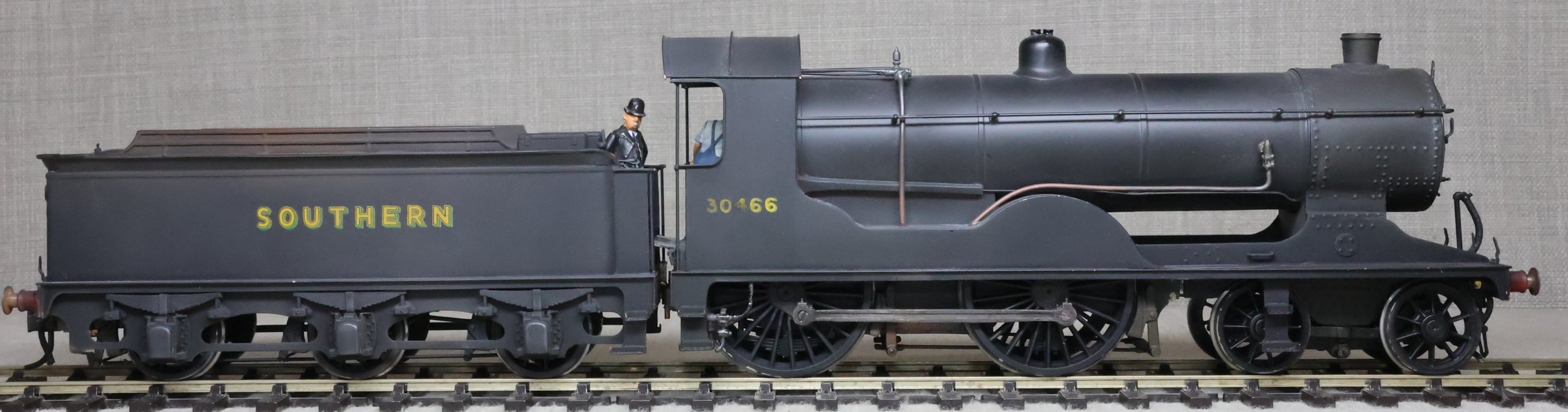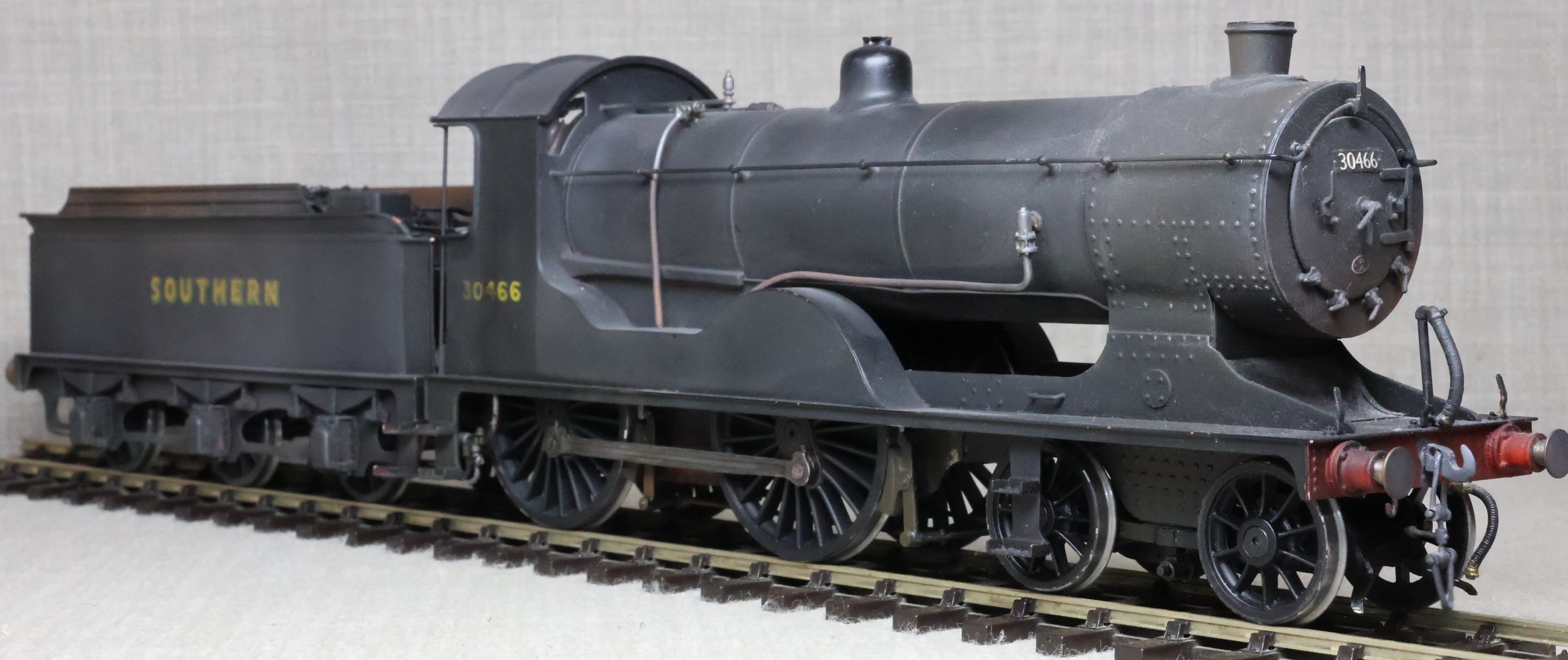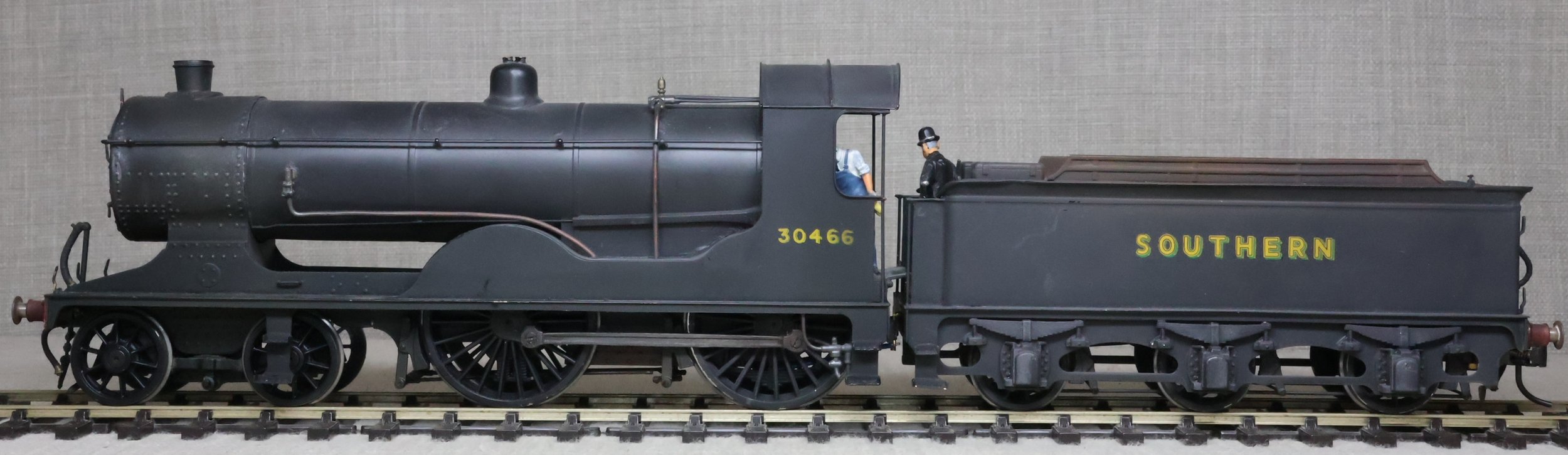LRH08. BR ex-Southern Railway ex-London & South Western Rly Drummond D15 4-4-0 No. 30466. In very early plain BR black with 'sunshine' lettering and still with 'Southern' on the tender (as running circa 1948). This is a brass model from a modified Laurie Griffin kit built by Brian Small and painted by Charlie King. Fitted with an ABC-type multi-stage gearbox, a Canon motor, Slaters wheels, and with very good cab detail and crew including Loco Inspector. This is a used model with a screw coupling on the loco and a Kadee coupling on the tender. Electrical pickups are on the tender and the motor is wired positive to negative (so 'forward' on the conroller is 'reverse' and vice-versa). It also has an unusual arrangement where the front bogie swivel and the main chassis are linked together and both swivel on curves. For this reason, minimum 6ft radius curves are recommended. The prototype was into service from Eastleigh Works as L&SWR No. 466 in July 1912 retaining this number through Southern Railways days to become BR No. 30466 in 1949. It was at Eastleigh at least by January 1948 and was withdrawn from there in October 1952. £795.