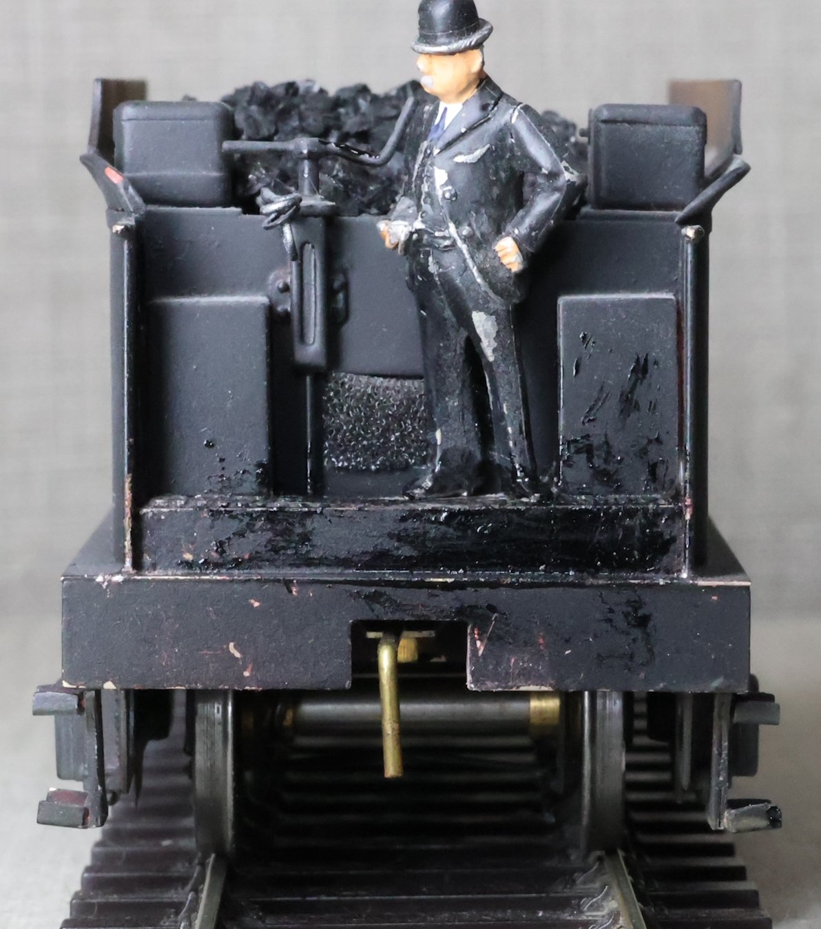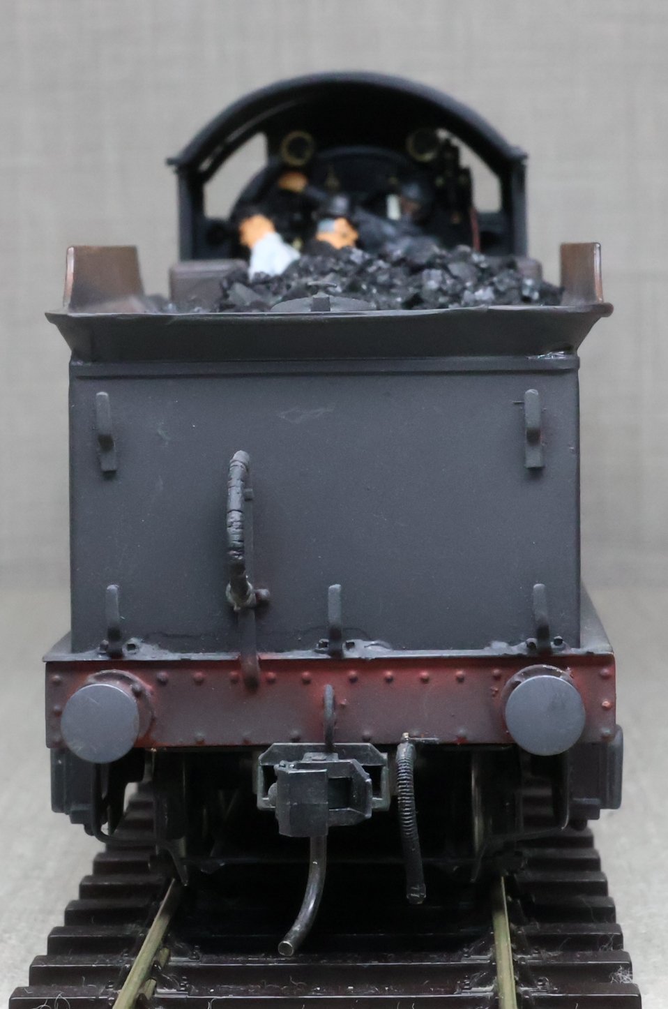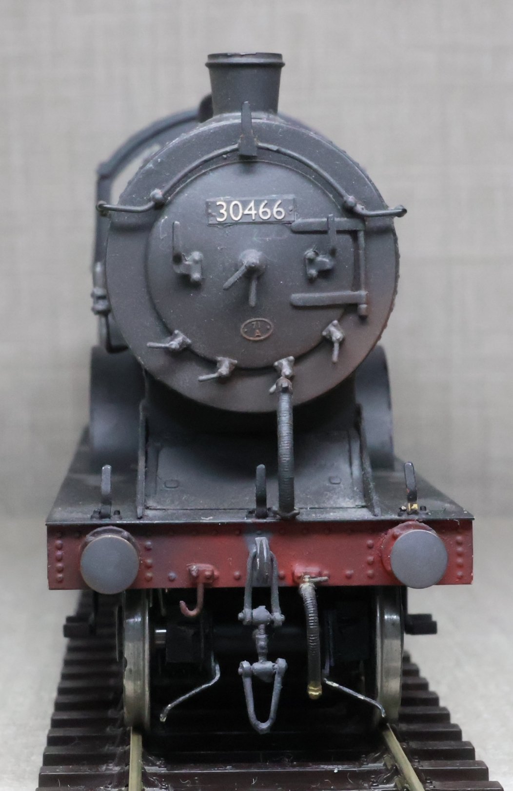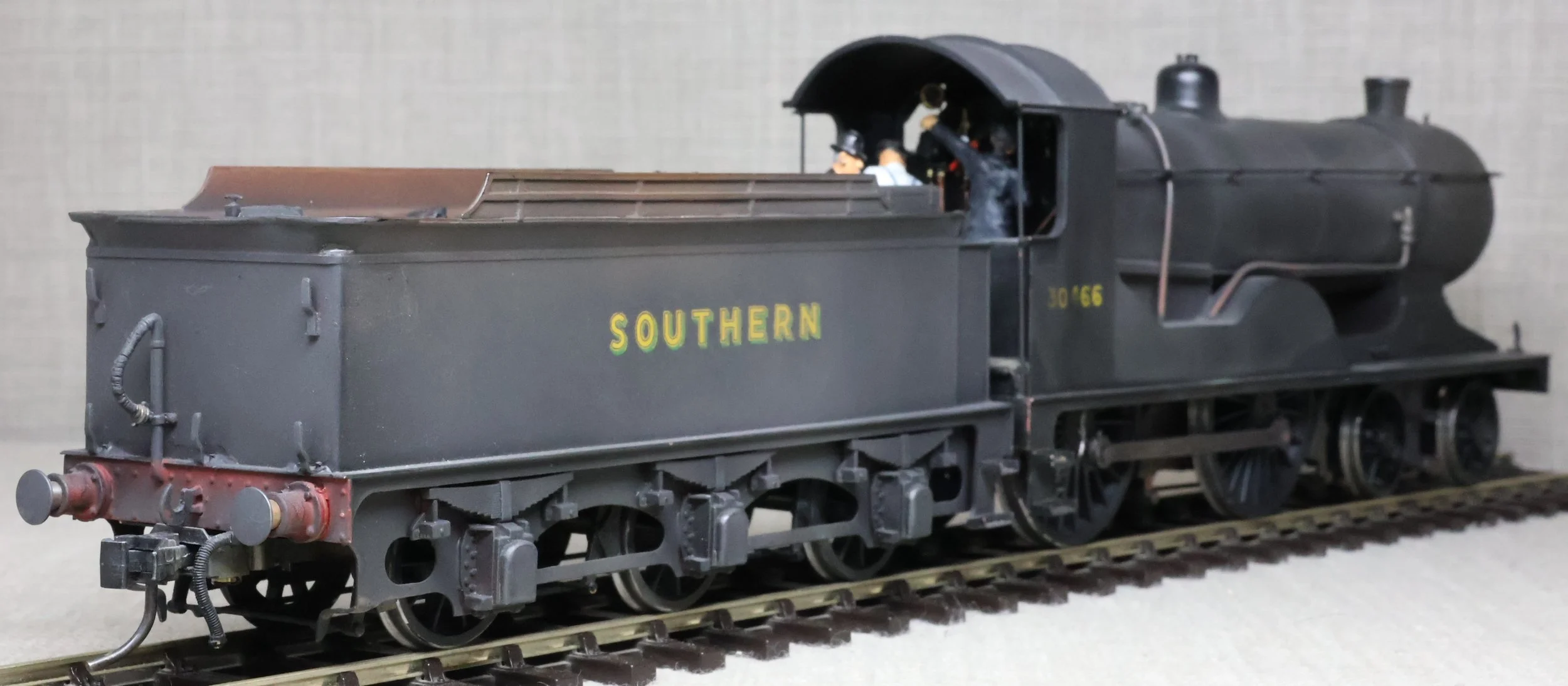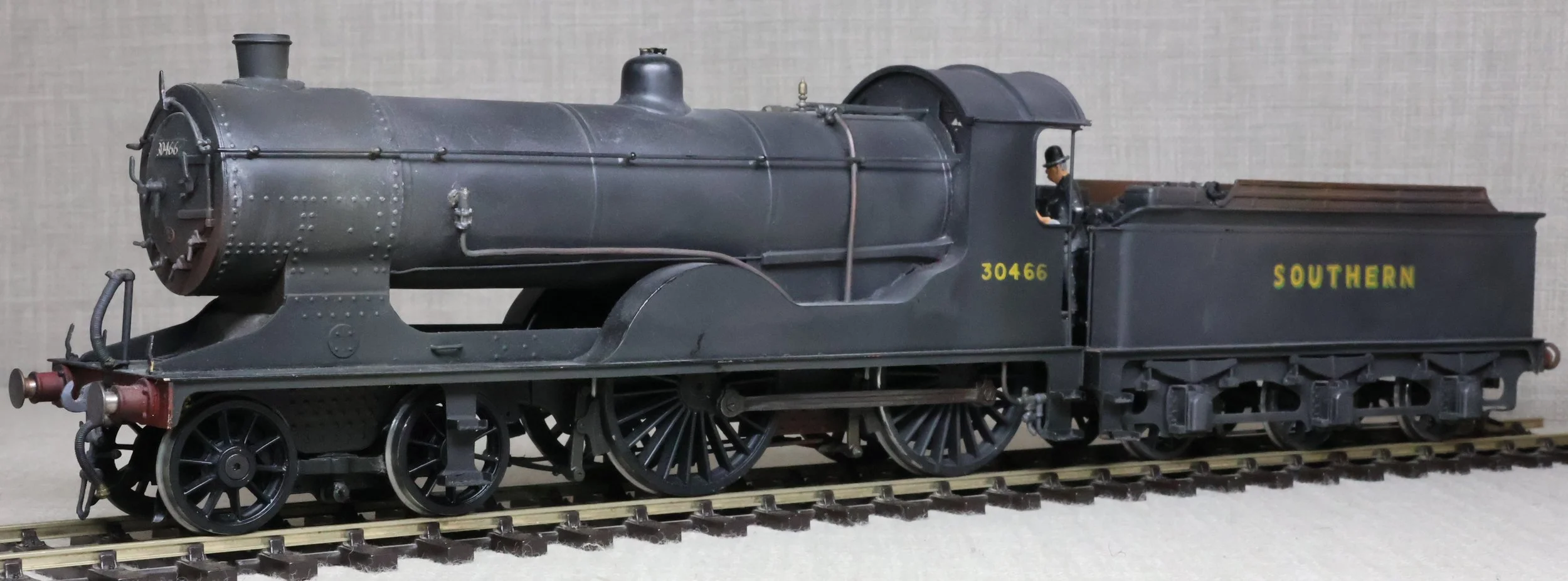 LRH08. BR ex-Southern Railway ex-London & South Western Rly Drummond D15 4-4-0 No. 30466. In very early plain BR black with 'sunshine' lettering and still with 'Southern' on the tender (as running circa 1948). This is a brass model from a modified Laurie Griffin kit built by Brian Small and painted by Charlie King. Fitted with an ABC-type multi-stage gearbox, a Canon motor, Slaters wheels, and with very good cab detail and crew including Loco Inspector. This is a used model with a screw coupling on the loco and a Kadee coupling on the tender. Electrical pickups are on the tender and the motor is wired positive to negative (so 'forward' on the conroller is 'reverse' and vice-versa). It also has an unusual arrangement where the front bogie swivel and the main chassis are linked together and both swivel on curves. For this reason, minimum 6ft radius curves are recommended. The prototype was into service from Eastleigh Works as L&SWR No. 466 in July 1912 retaining this number through Southern Railways days to become BR No. 30466 in 1949. It was at Eastleigh at least by January 1948 and was withdrawn from there in October 1952. £795.