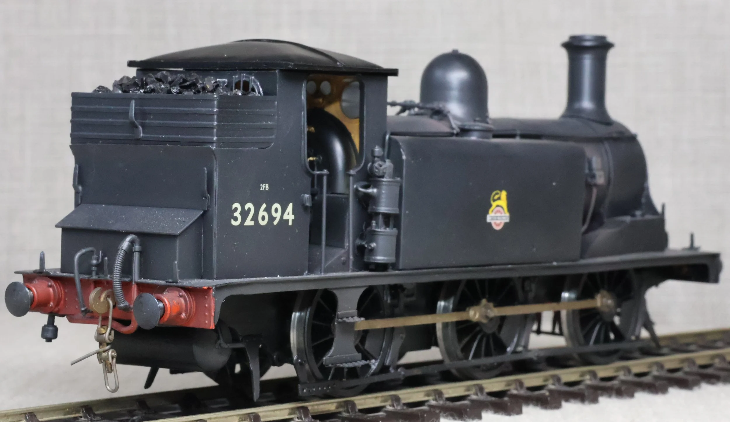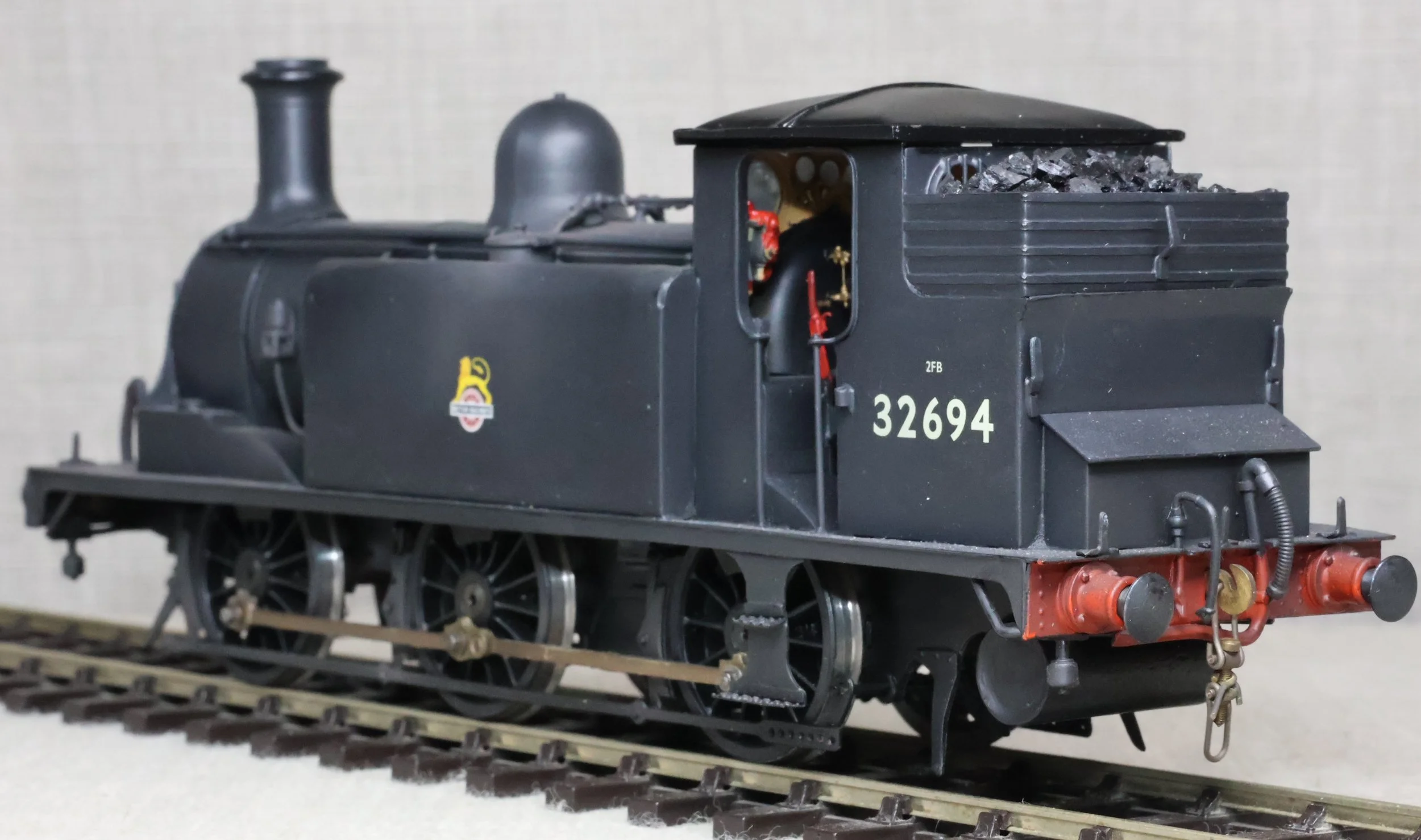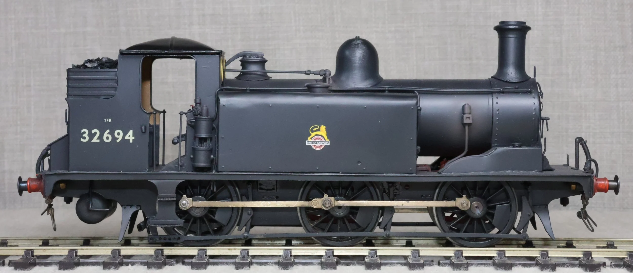 LRS18. BR ex- Southern Railway ex- LB&SCR Stroudley 'E1' Class 0-6-0 Tank Loco No. 32694. In plain BR black with early crest, lightly weathered, and shedplate 71D Fratton (1950 - 1954). This is from a Meteor Models brass kit built by Roger Scanlon and fitted with a Mashima motor, single stage gearbox, Slaters wheels, dummy inside motion, and very good cab detail with removable roof. Additionally fitted with DCC (no sound) using a Zimo chip (address 2694). The model is lightly used and the motor/gearbox is a touch noisy in reverse. The prototype was into service from Brighton Works as early as March 1875. It spent its BR days allocated either to Fratton or Southampton Docks (several allocations to each) and was withdrawn from one of these sheds in July 1961, different sources give different answers, with the final journey being to Eastleigh Works. £495.