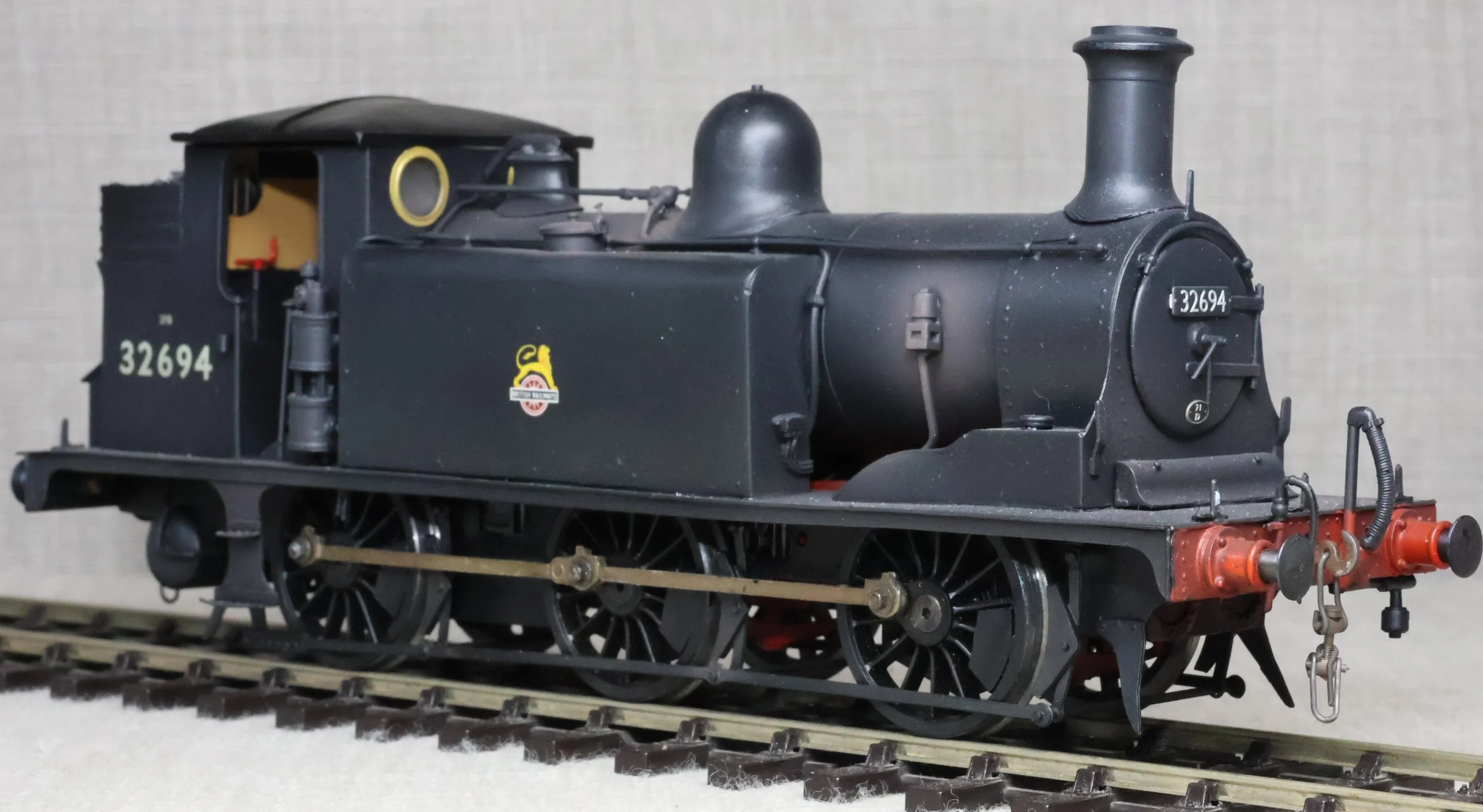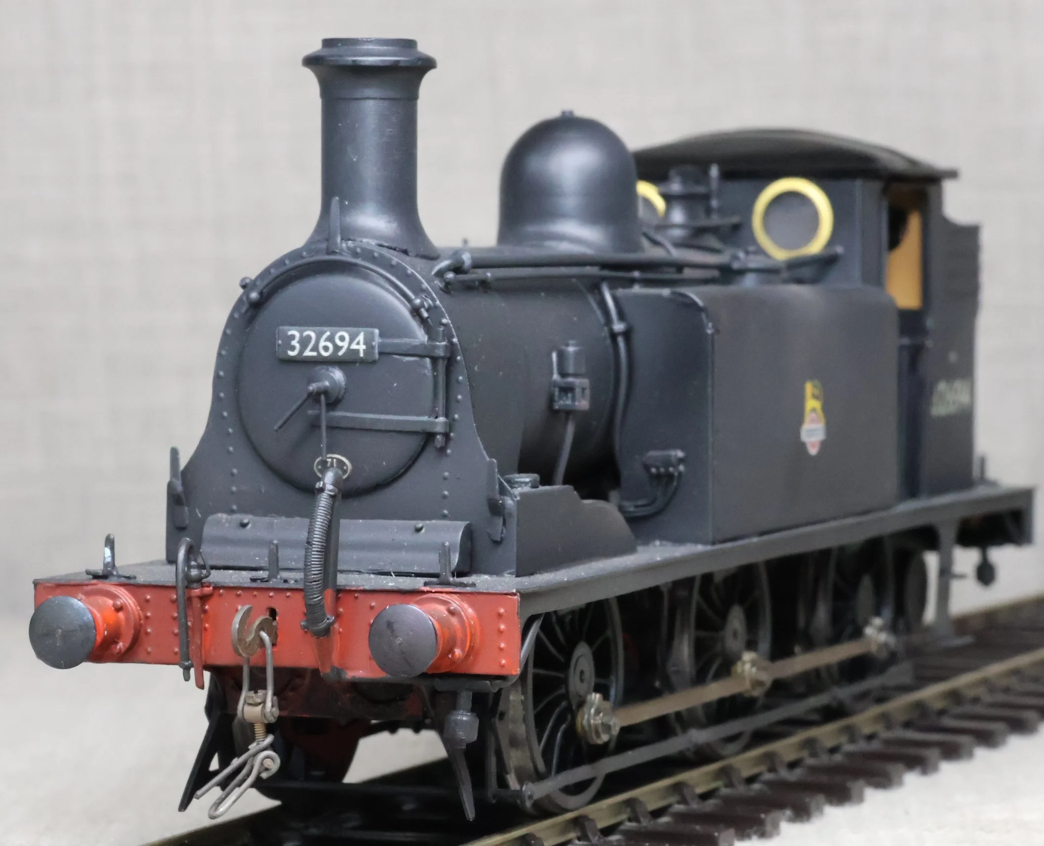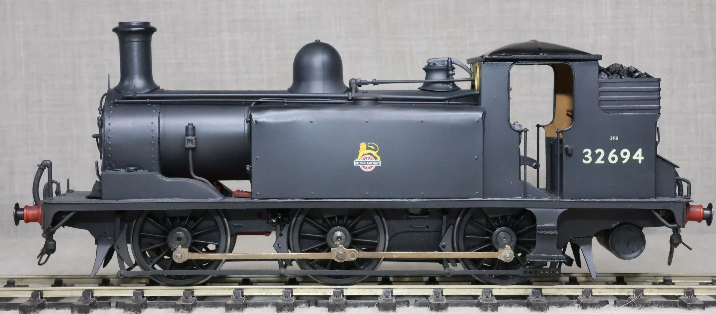 LRS18. BR ex- Southern Railway ex- LB&SCR Stroudley 'E1' Class 0-6-0 Tank Loco No. 32694. In plain BR black with early crest, lightly weathered, and shedplate 71D Fratton (1950 - 1954). This is from a Meteor Models brass kit built by Roger Scanlon and fitted with a Mashima motor, single stage gearbox, Slaters wheels, dummy inside motion, and very good cab detail with removable roof. Additionally fitted with DCC (no sound) using a Zimo chip (address 2694). The model is lightly used and the motor/gearbox is a touch noisy in reverse. The prototype was into service from Brighton Works as early as March 1875. It spent its BR days allocated either to Fratton or Southampton Docks (several allocations to each) and was withdrawn from one of these sheds in July 1961, different sources give different answers, with the final journey being to Eastleigh Works. £495.