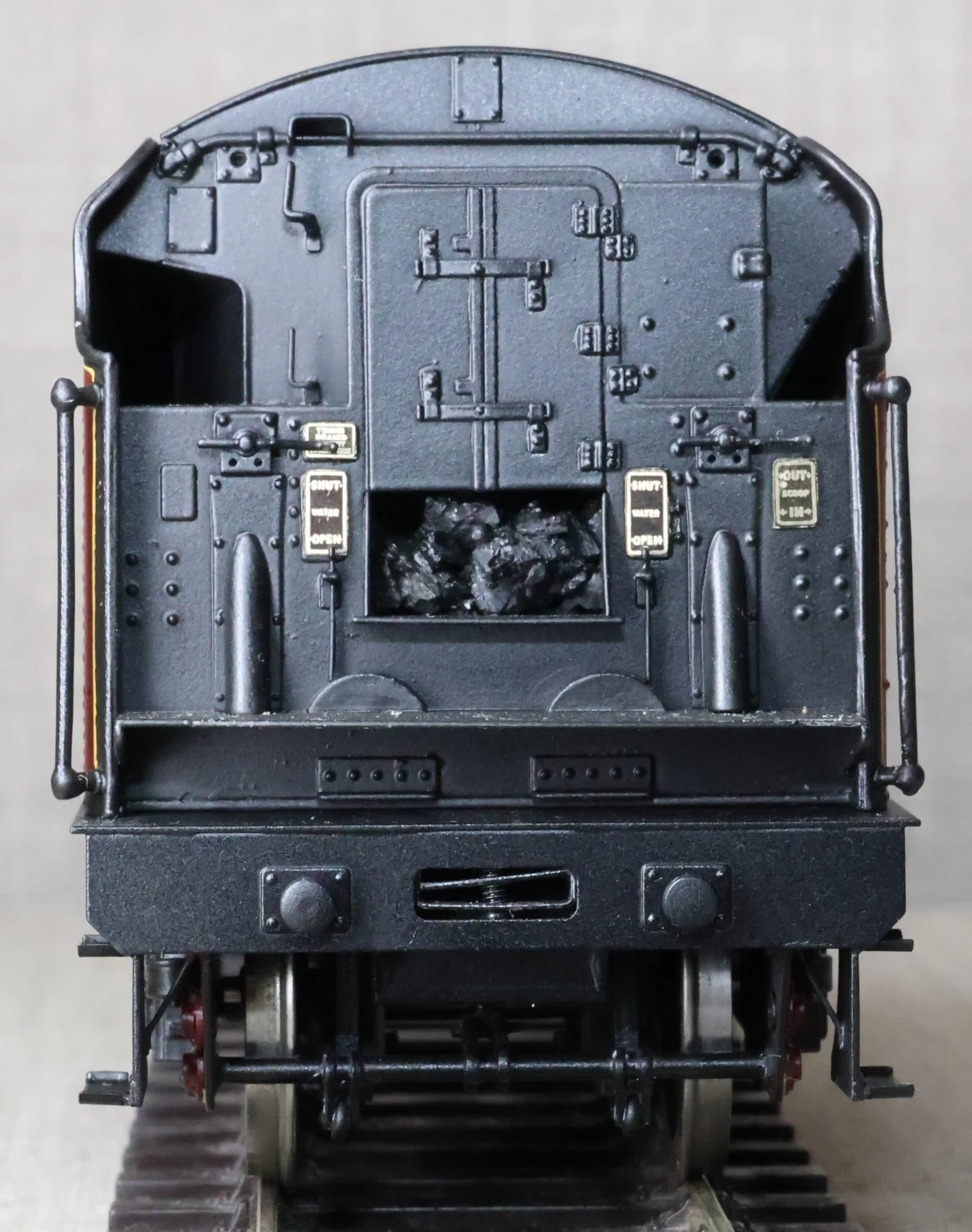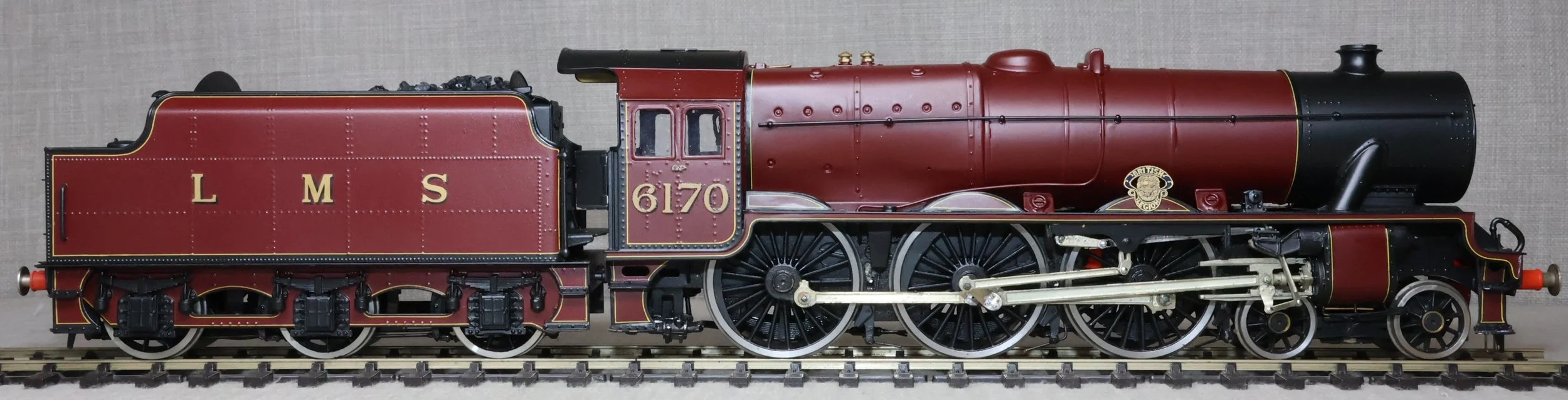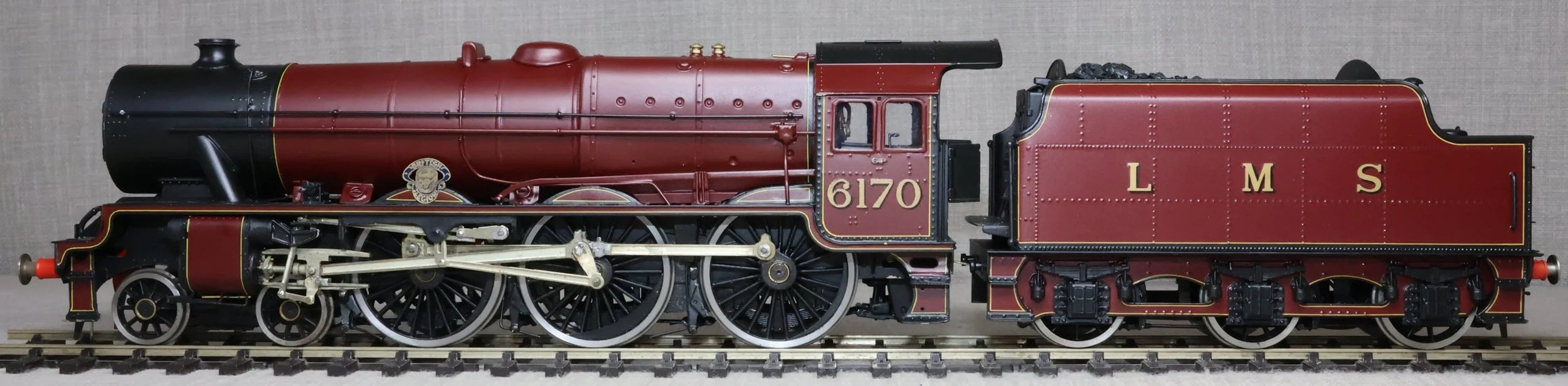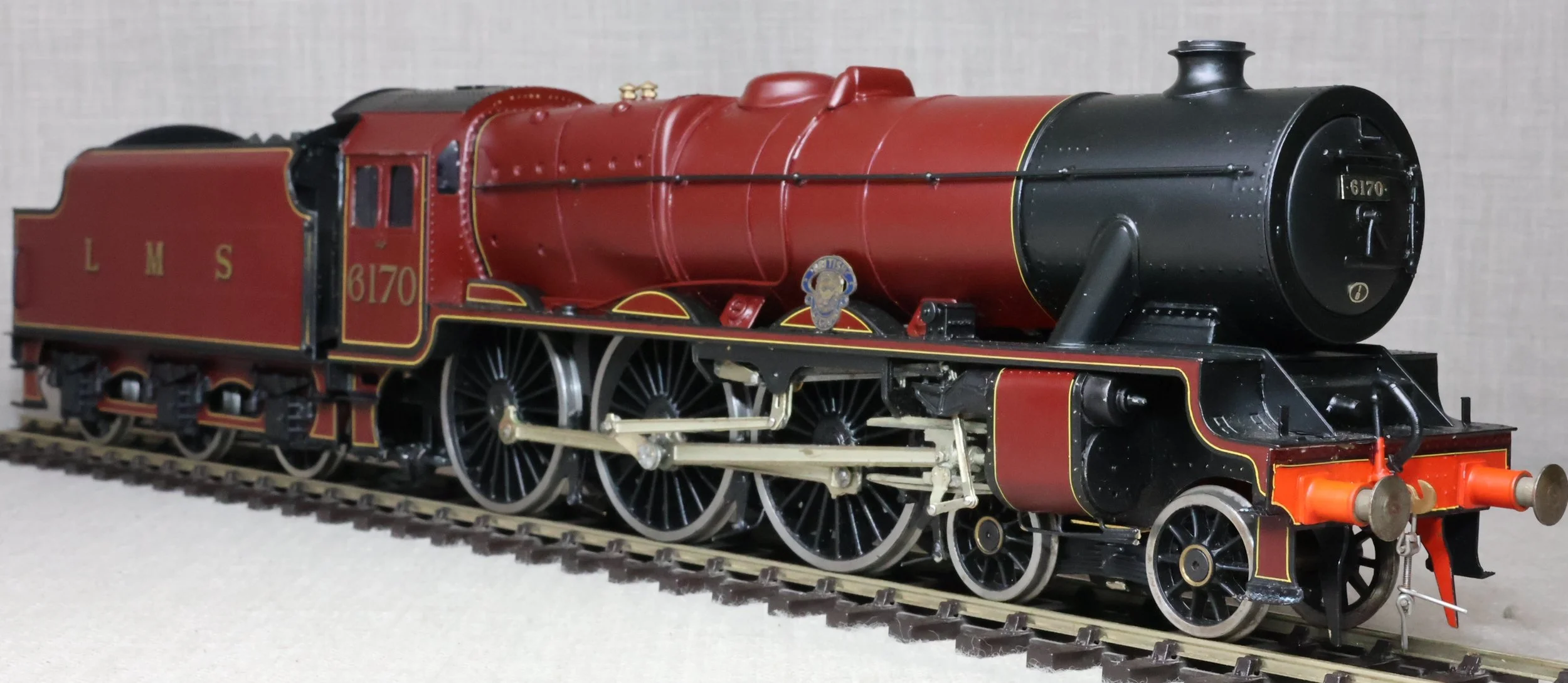 LSL95. LMS Stanier Rebuilt 'Royal Scot' 4-6-0 and Tender No. 6170 'British Legion' as a RESTORATION PROJECT. In lined LMS crimson lake livery with insignia in gold shaded black and with shedplate 1B Camden. The loco is from a Gladiator brass kit built by Graham Varley and is paired with a Sancheng LMS brass tender, both painted by Conrad Cooper (signed). Fitted with an MSC 'JH' motor coupled to a heavy duty multi-stage gearbox, Slaters wheels and with excellent cab detail. The model is lightly used but has the following issues. (1) It is an intermittent runner with one pickup on a rear driving wheel not making proper contact. (2) It is shorting in one possibly two places - one in the vicinity of the rear axle and possibly a front bogie wheel is shorting on the chassis on curves. Sold as a NON-RUNNER as a RESTORATION PROJECT. The prototype was a rebuild of the experimental high pressure loco ‘Fury’, the rebuild carried out by North British Loco Co. at Glasgow in 1935. The LMS added it to the ‘Royal Scot’ class as a matter of convenience as it was not really a ‘Scot’ having a unique and longer boiler which could not be exchanged with other members of the class (which also prolonged its time in works for heavy repairs). LMS engine crews described the extra power from this bigger boiler as being able to pull ‘one coach more than a Scot’. It lasted until December 1962, being withdrawn from Llandudno Junction (having spent only 3 months there, it was really a Crewe loco). RESERVED.